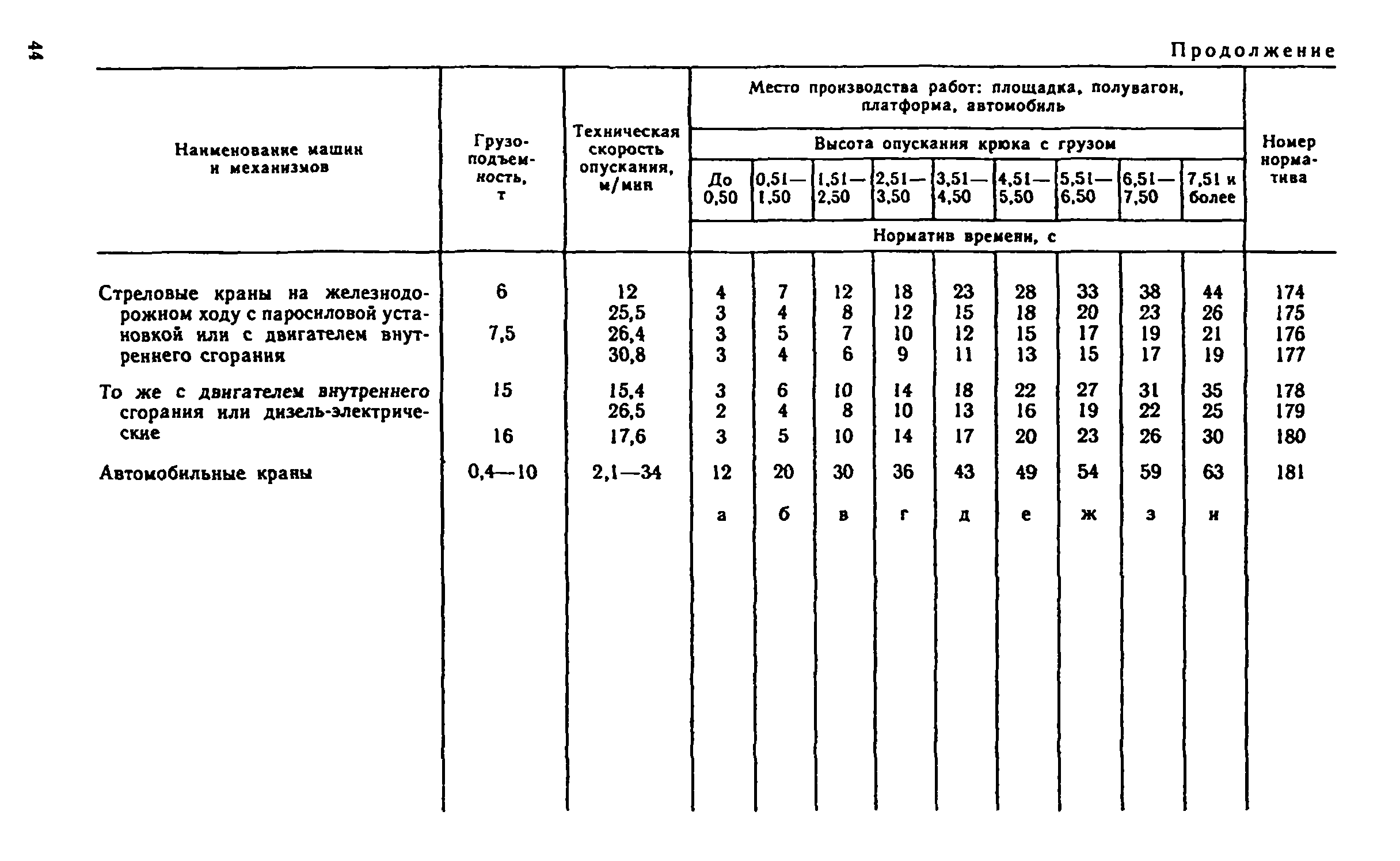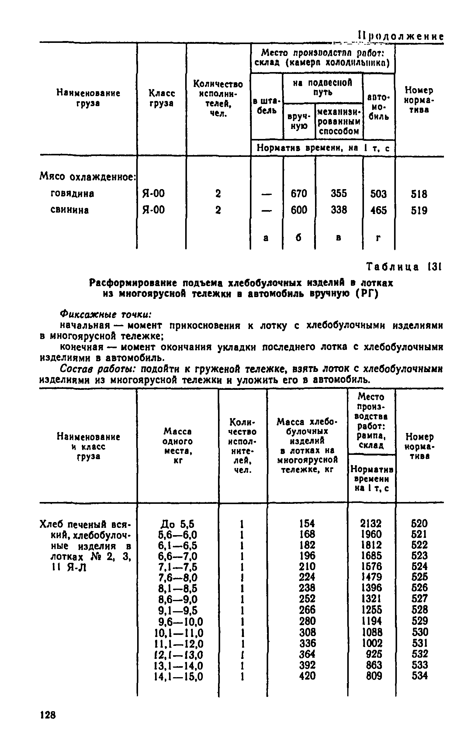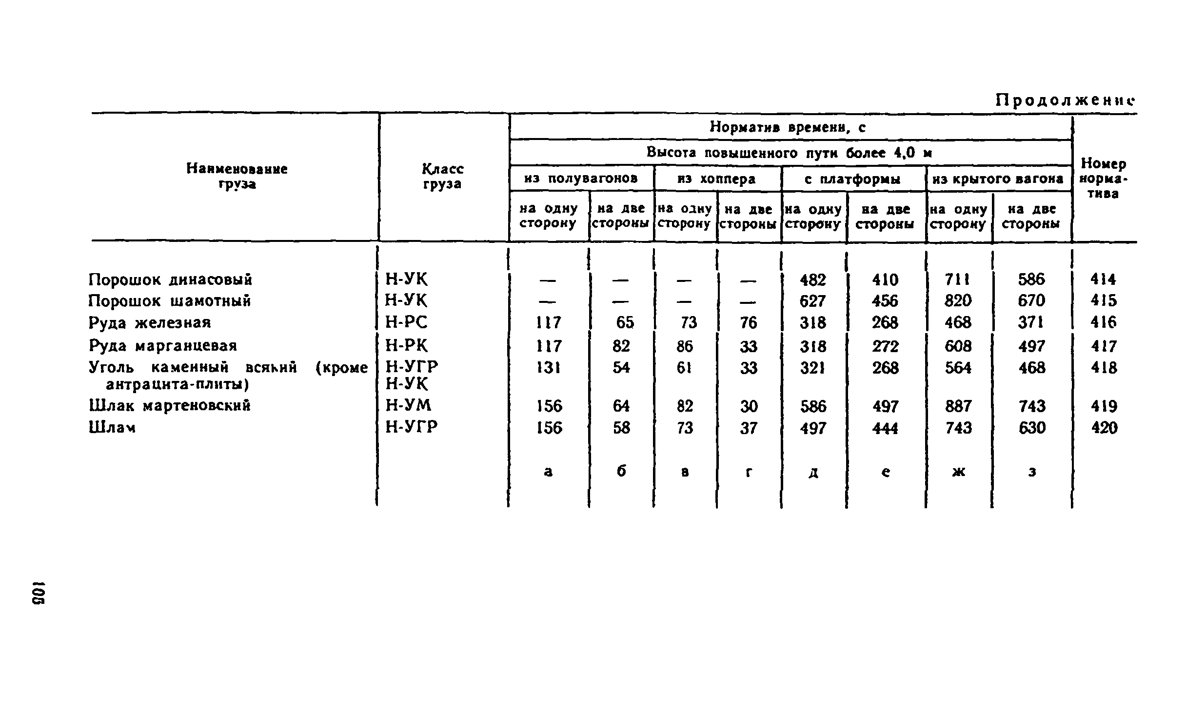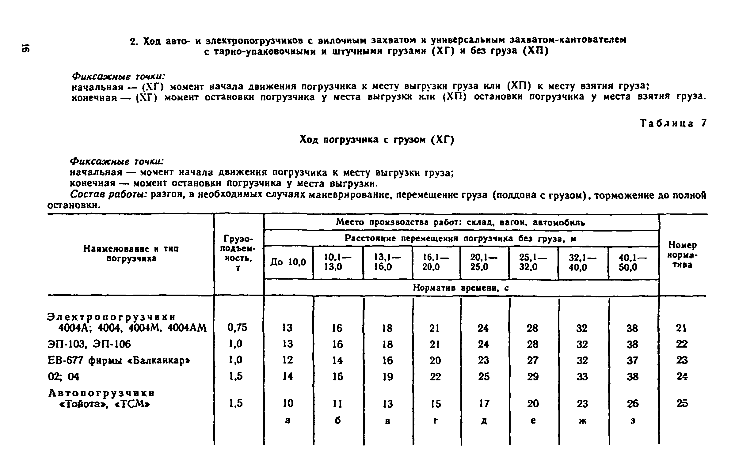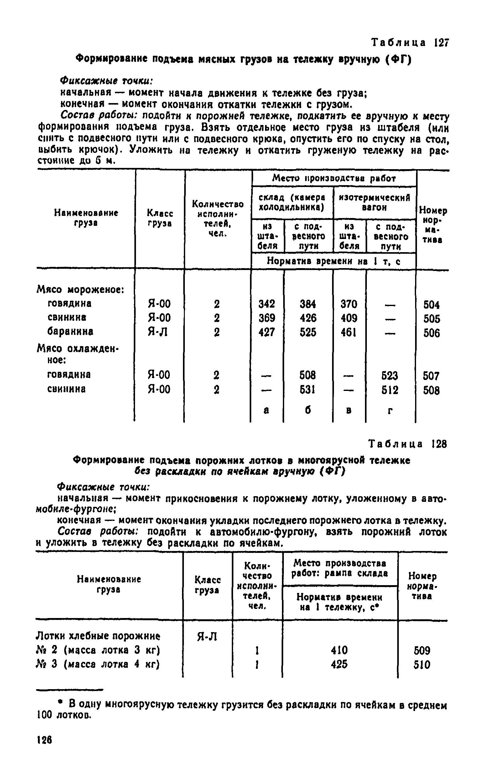 Нормативы времени на погрузочно-разгрузочные работы, выполняемые на железнодорожном, водном и автомобильном транспорте. Часть I. Погрузочно-разгрузочные работы, выполняемые на станциях железных дорог, предприятиях, в организациях, учреждениях отраслей народного хозяйства| Статус: | действует | | Название рус.: | Нормативы времени на погрузочно-разгрузочные работы, выполняемые на железнодорожном, водном и автомобильном транспорте. Часть I. Погрузочно-разгрузочные работы, выполняемые на станциях железных дорог, предприятиях, в организациях, учреждениях отраслей народного хозяйства | | Дата добавления в базу: | 01.09.2013 | | Дата актуализации: | 01.01.2021 | | Область применения: | Нормативы времени предназначены для разработки единых норм выработки и времени на вагонные, автотранспортные и складские погрузочно-разгрузочные работы, а также для разработки местных норм выработки и времени на работы, выполняемые более производительными машинами, механизмами, грузозахватными устройствами при более совершенной организации труда на станциях железных дорог, предприятиях, в организациях и учреждениях отраслей народного хозяйства | | Оглавление: | 1. Общая часть 2. Организация труда 3. Нормативная часть Раздел 1. Нормативы оперативного времени на элементы (комплексы приемов) операций технологического процесса полностью и не полностью механизированных погрузочно-разгрузочных работ А. Тарно-упаковочные и штучные грузы Б. Тяжеловесные грузы, металлы, металлические изделия и лесоматериалы В. Наволочные грузы Раздел II. Нормативы времени на элементы операций технологического процесса погрузочно-разгрузочных работ, выполняемых вручную с применением и без применения простейших приспособлений Раздел III. Нормативы времени на подготовительно-заключительные работы, организационное и техническое обслуживание рабочего места, перерывы, предусмотренные технологией и организацией производственного процесса, перерывы на отдых и личные надобности Раздел IV. Нормативы времени на специальное крепление (раскрепление) грузов на железнодорожном подвижном составе (на платформе или в полувагоне) Раздел V. Примеры расчета комплексных норм выработки и времени по нормативам Приложение 1. Формула расчета высоты укладки грузов в вагоне и их объемов Приложение 2. Классификационный список грузов Приложение 3. Классификационные показатели грузов Приложение 4. Примерный перечень основных погрузочно-разгрузочных машин и механизмов Приложение 5. Примерные схемы укладки груза на поддоны Приложение 6. Коэффициент заполнения грузозахватных устройств навалочными грузами | | Разработан: | ЦБНТ