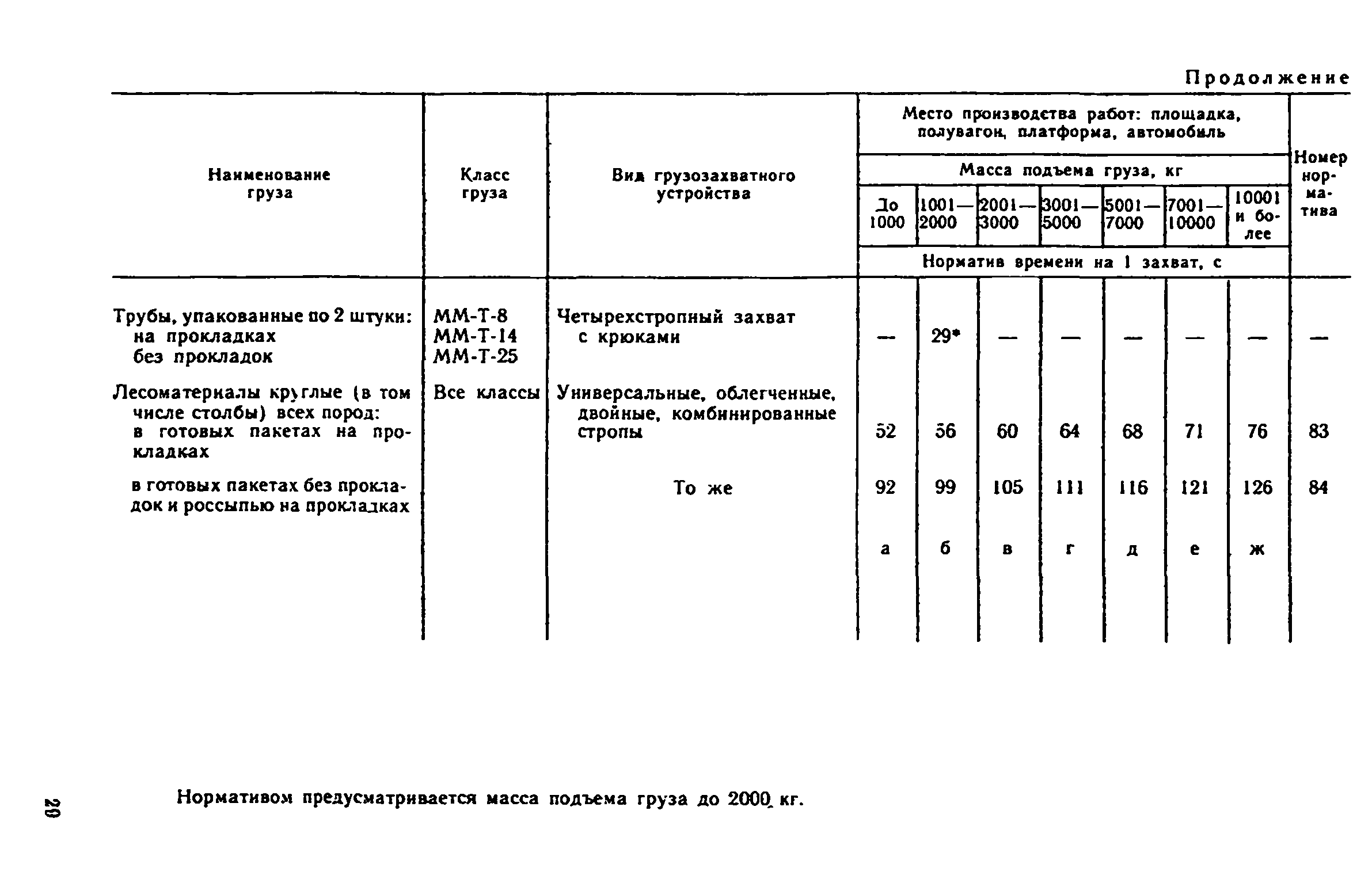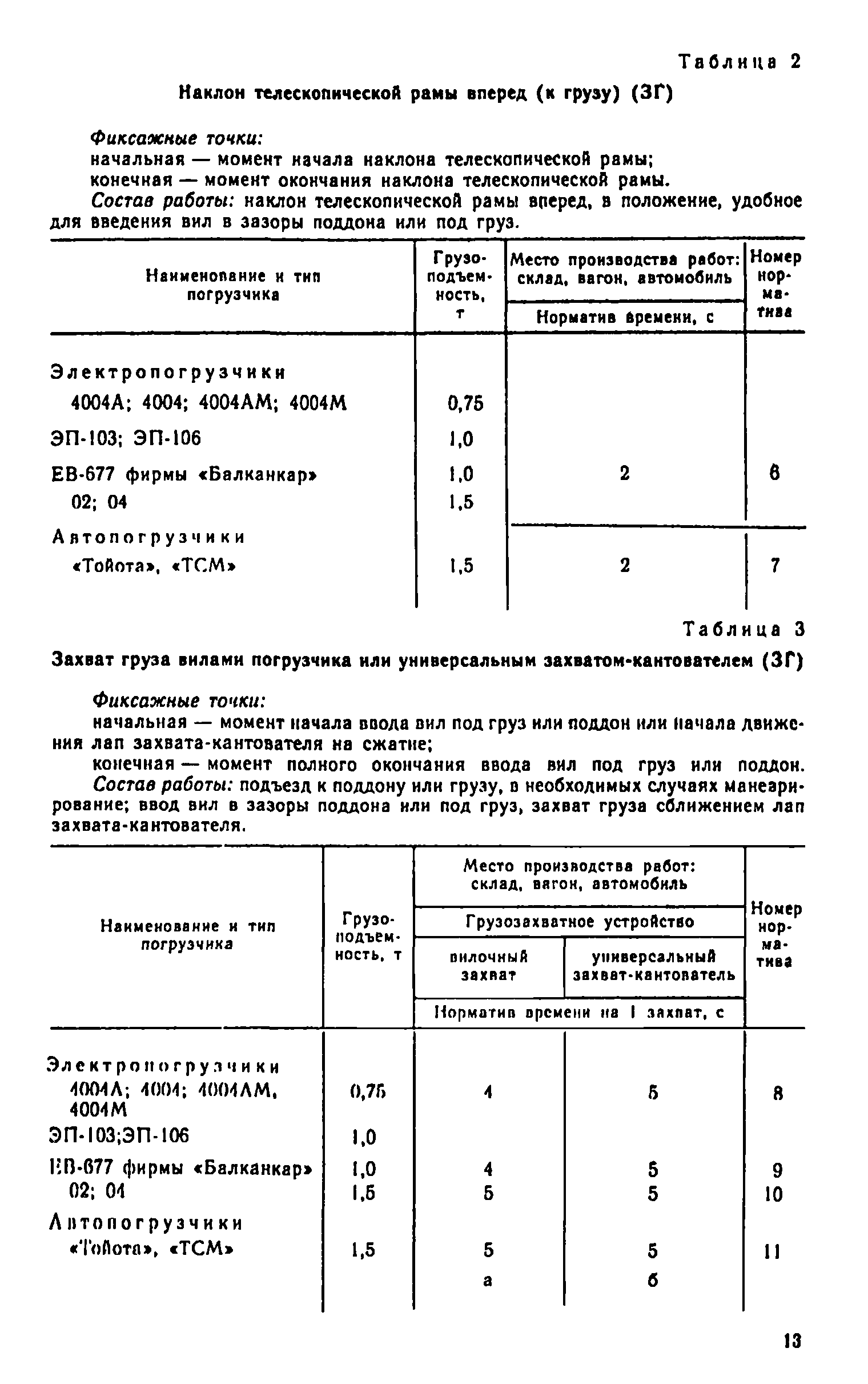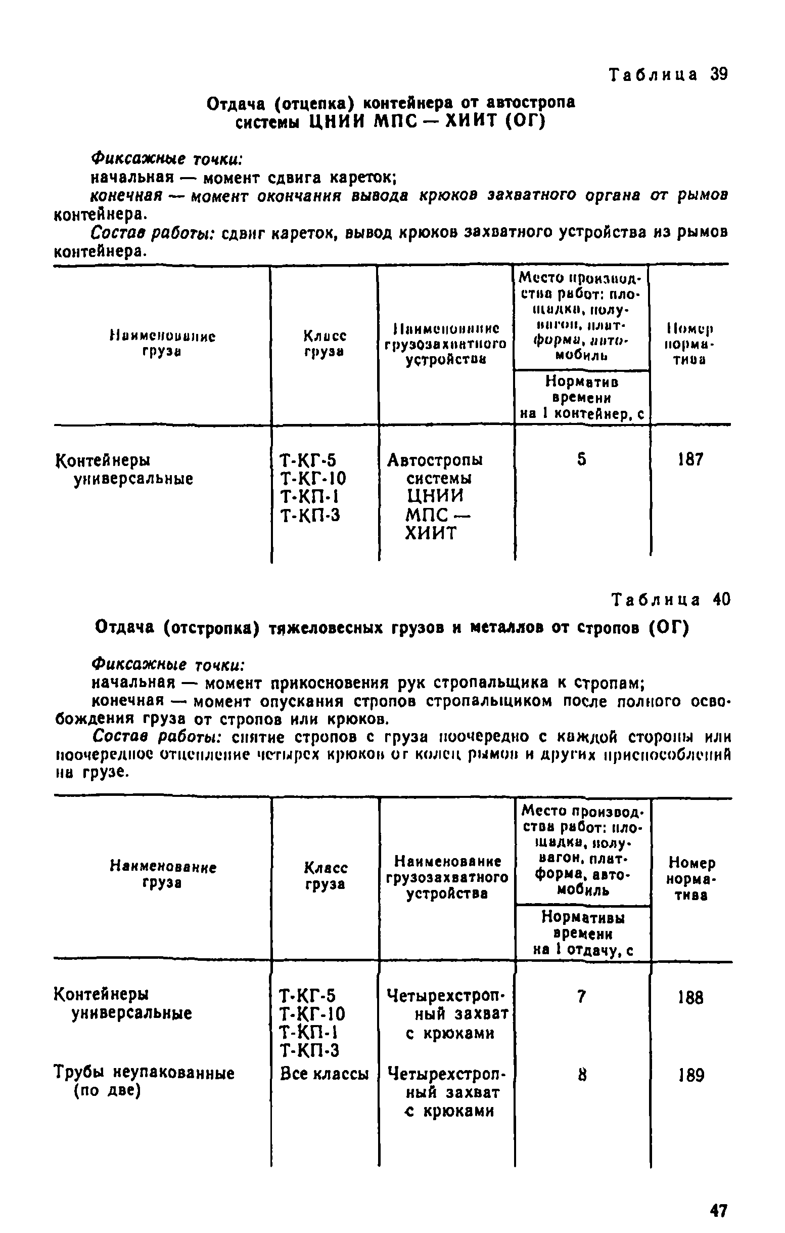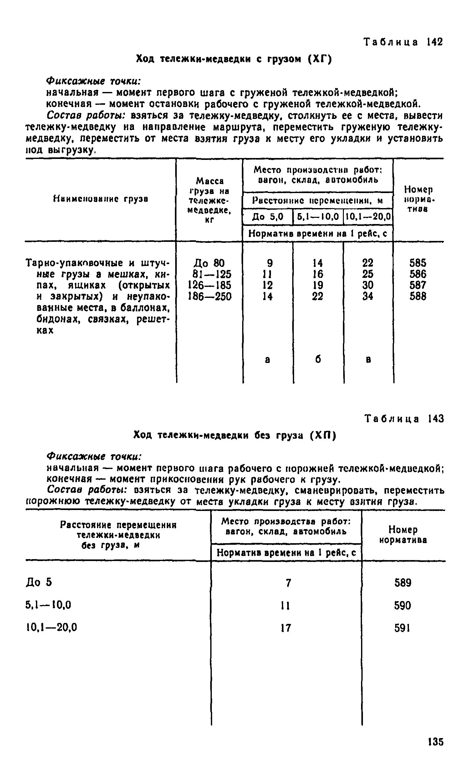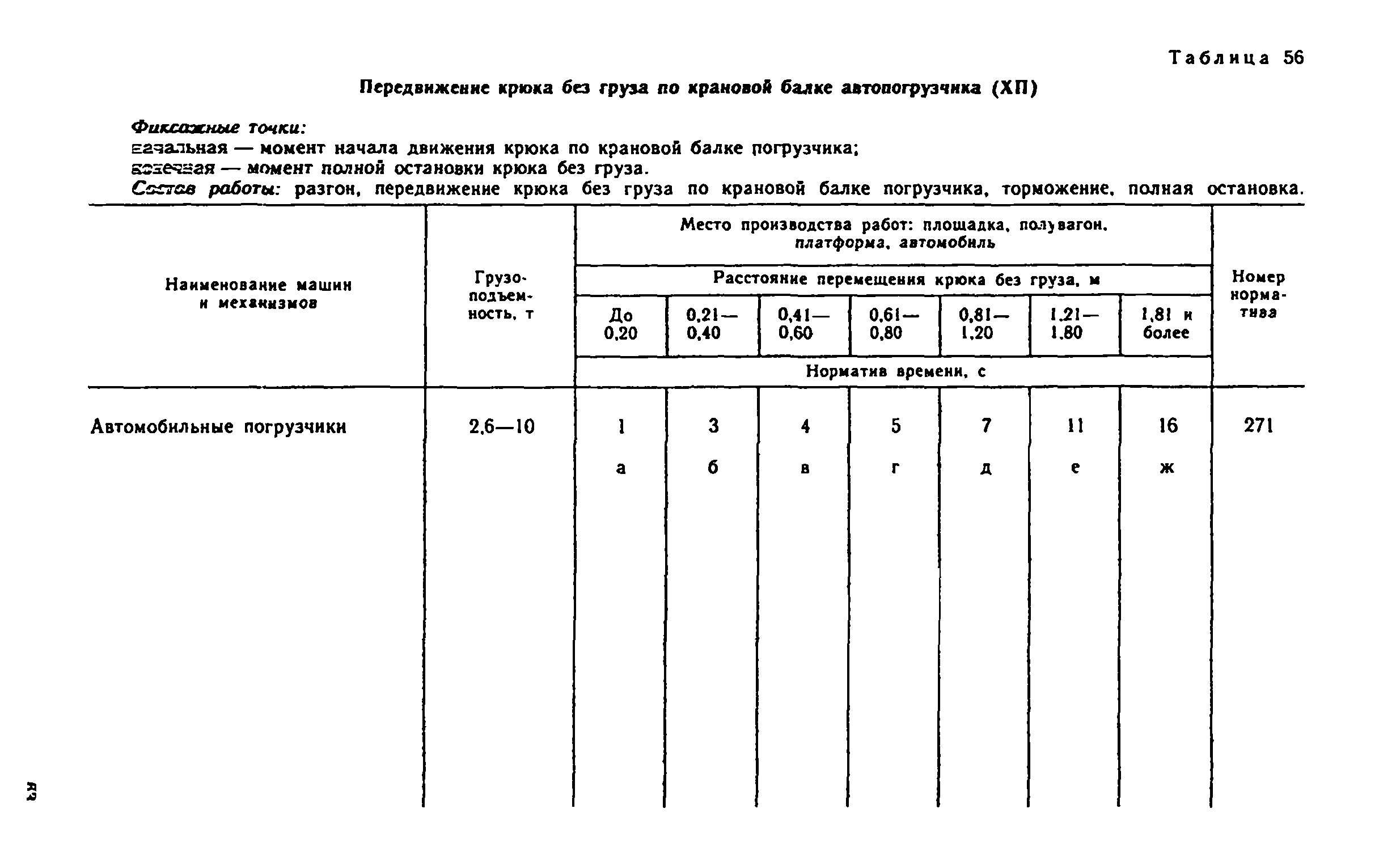 Нормативы времени на погрузочно-разгрузочные работы, выполняемые на железнодорожном, водном и автомобильном транспорте. Часть I. Погрузочно-разгрузочные работы, выполняемые на станциях железных дорог, предприятиях, в организациях, учреждениях отраслей народного хозяйства| Статус: | действует | | Название рус.: | Нормативы времени на погрузочно-разгрузочные работы, выполняемые на железнодорожном, водном и автомобильном транспорте. Часть I. Погрузочно-разгрузочные работы, выполняемые на станциях железных дорог, предприятиях, в организациях, учреждениях отраслей народного хозяйства | | Дата добавления в базу: | 01.09.2013 | | Дата актуализации: | 01.01.2021 | | Область применения: | Нормативы времени предназначены для разработки единых норм выработки и времени на вагонные, автотранспортные и складские погрузочно-разгрузочные работы, а также для разработки местных норм выработки и времени на работы, выполняемые более производительными машинами, механизмами, грузозахватными устройствами при более совершенной организации труда на станциях железных дорог, предприятиях, в организациях и учреждениях отраслей народного хозяйства | | Оглавление: | 1. Общая часть 2. Организация труда 3. Нормативная часть Раздел 1. Нормативы оперативного времени на элементы (комплексы приемов) операций технологического процесса полностью и не полностью механизированных погрузочно-разгрузочных работ А. Тарно-упаковочные и штучные грузы Б. Тяжеловесные грузы, металлы, металлические изделия и лесоматериалы В. Наволочные грузы Раздел II. Нормативы времени на элементы операций технологического процесса погрузочно-разгрузочных работ, выполняемых вручную с применением и без применения простейших приспособлений Раздел III. Нормативы времени на подготовительно-заключительные работы, организационное и техническое обслуживание рабочего места, перерывы, предусмотренные технологией и организацией производственного процесса, перерывы на отдых и личные надобности Раздел IV. Нормативы времени на специальное крепление (раскрепление) грузов на железнодорожном подвижном составе (на платформе или в полувагоне) Раздел V. Примеры расчета комплексных норм выработки и времени по нормативам Приложение 1. Формула расчета высоты укладки грузов в вагоне и их объемов Приложение 2. Классификационный список грузов Приложение 3. Классификационные показатели грузов Приложение 4. Примерный перечень основных погрузочно-разгрузочных машин и механизмов Приложение 5. Примерные схемы укладки груза на поддоны Приложение 6. Коэффициент заполнения грузозахватных устройств навалочными грузами | | Разработан: | ЦБНТ