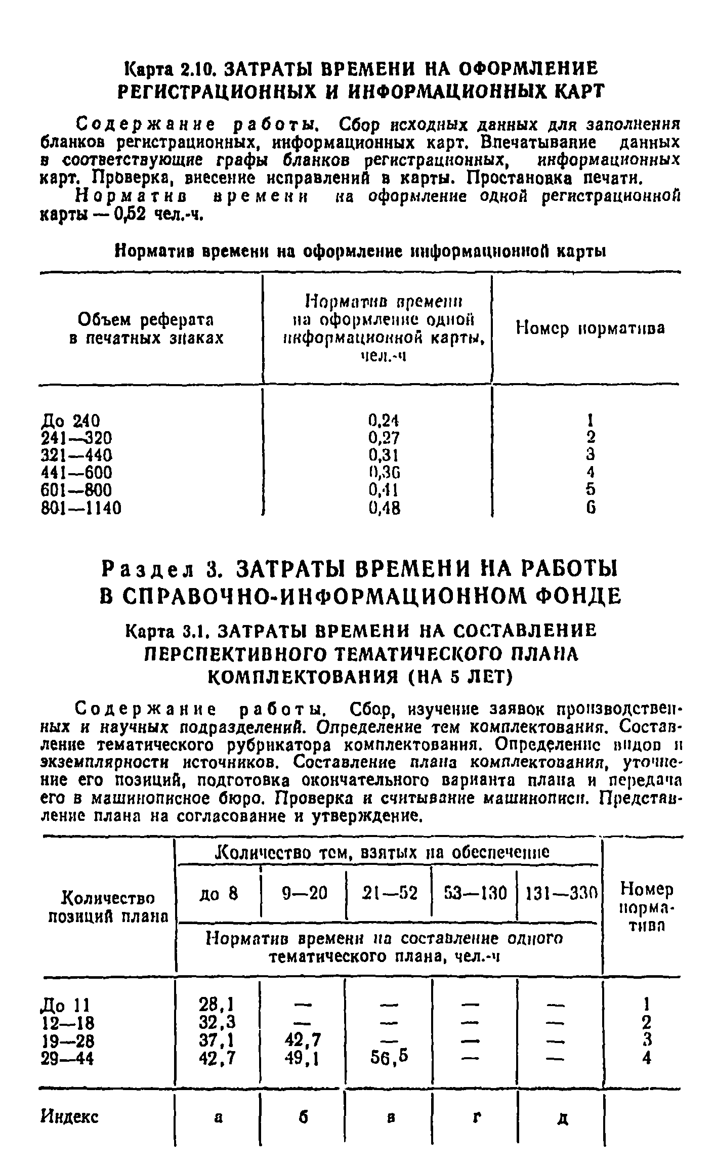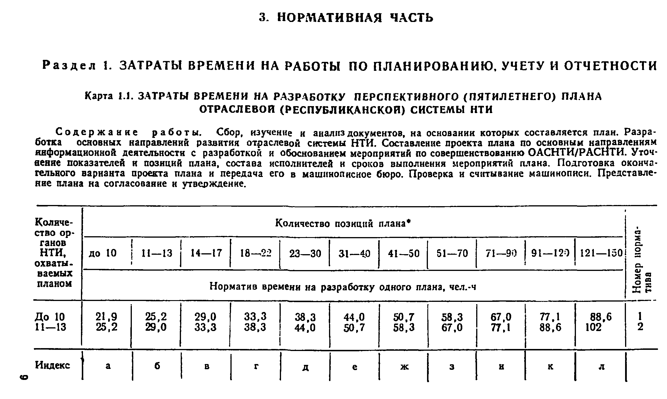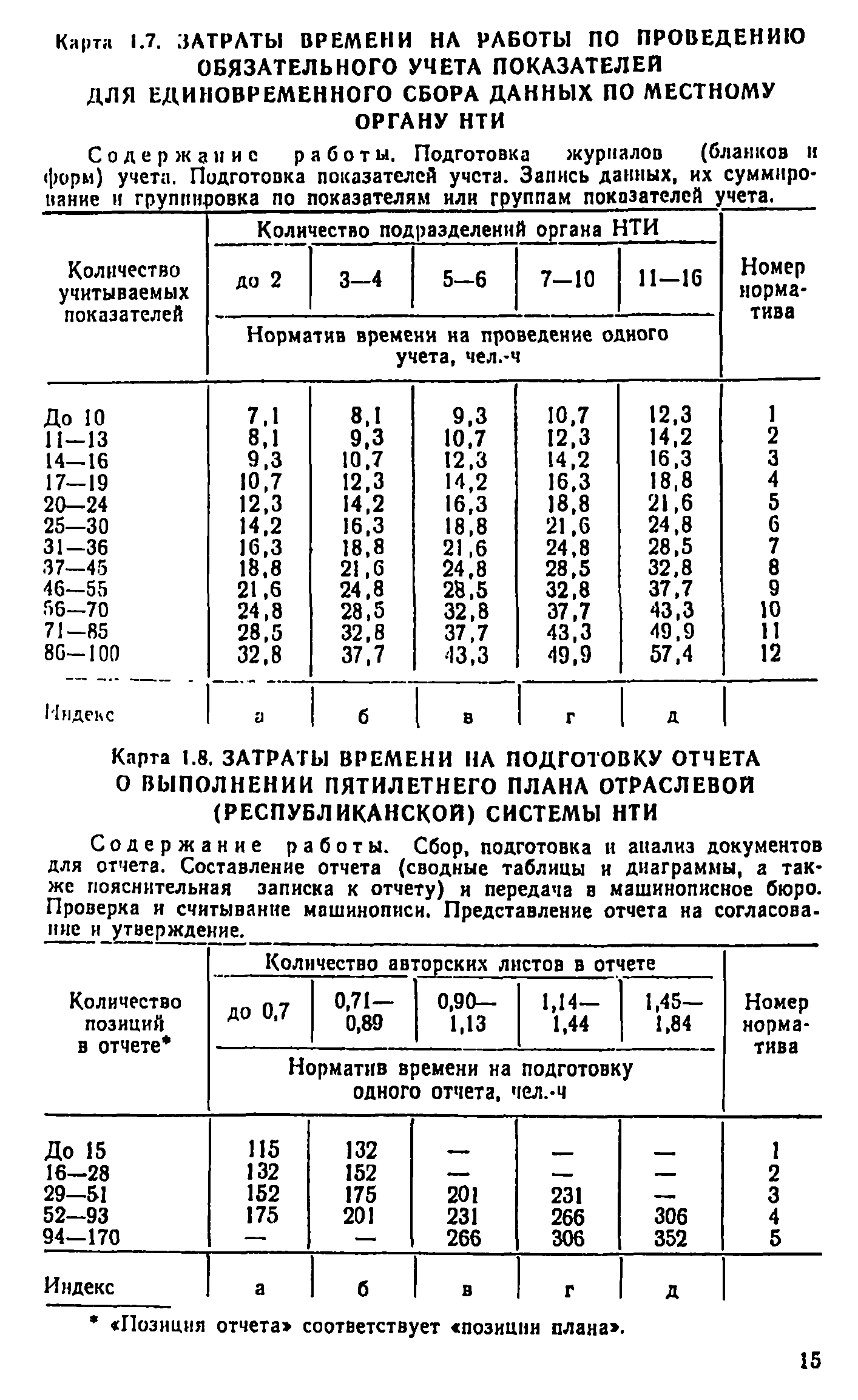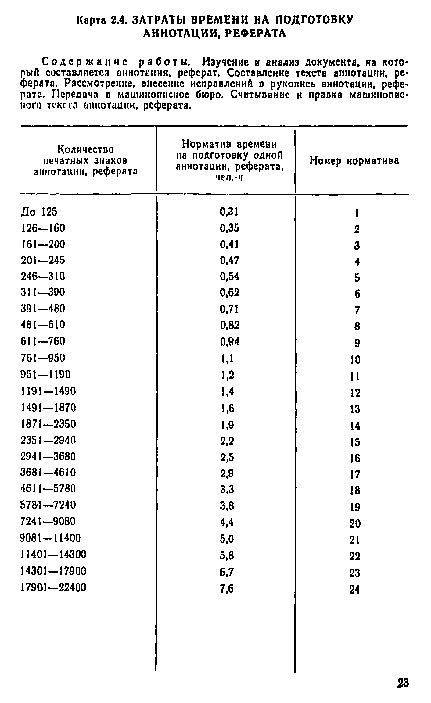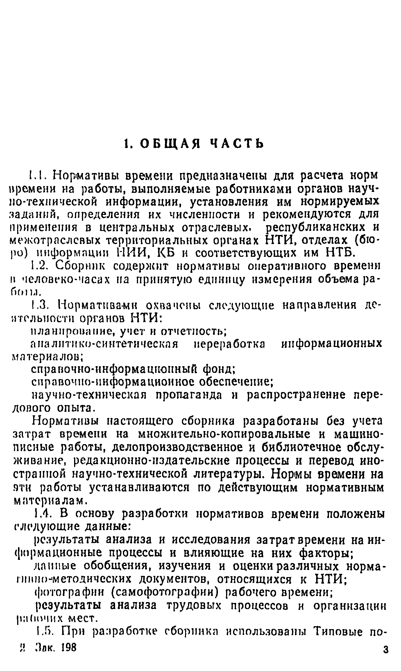 Нормативы времени на работы по научно-технической информации| Статус: | действует | | Название рус.: | Нормативы времени на работы по научно-технической информации | | Дата добавления в базу: | 01.09.2013 | | Дата актуализации: | 01.01.2021 | | Область применения: | Нормативы времени предназначены для расчета норм времени на работы, выполняемые работниками органов научно-технической информации, установления им нормируемых заданий, определения их численности и рекомендуются для применения в центральных отраслевых, республиканских и межотраслевых территориальных органах НТИ, отделах (бюро) информации НИИ, КБ и соответствующих им НТБ | | Оглавление: | 1. Общая часть 2. Организация труда 3. Нормативная часть Раздел 1. Затраты времени на работы по планированию, учету и отчетности Раздел 2. Затраты времени на аналитико-синтетическую переработку информационных материалов Раздел 3. Затраты времени на работы в справочно-информационном фонде Раздел 4. Затраты времени на работы по справочно-информационному обеспечению Раздел 5. Затраты времени на работы по научно-технической пропаганде и распространению передового опыта | | Разработан: | ЦБНТ