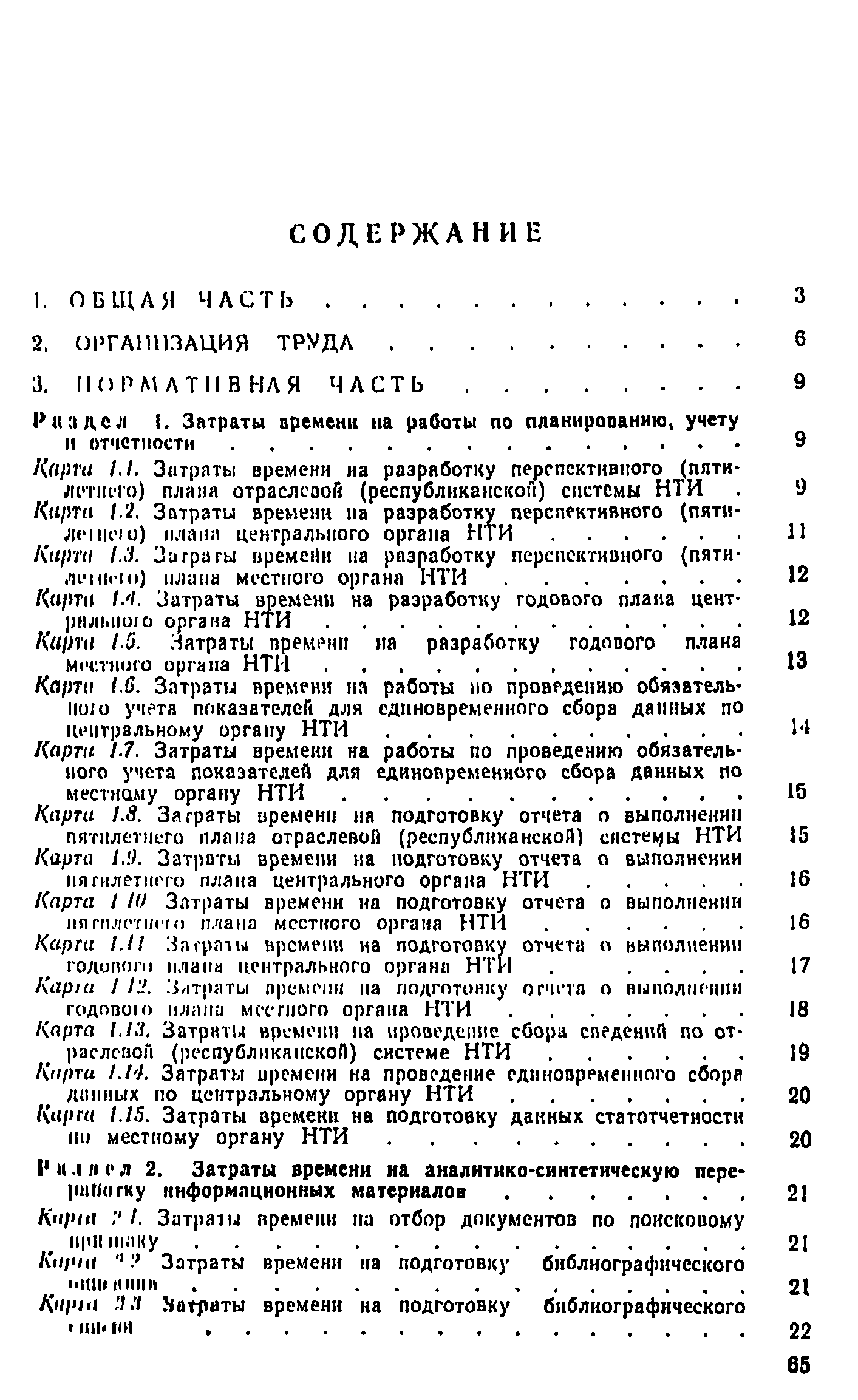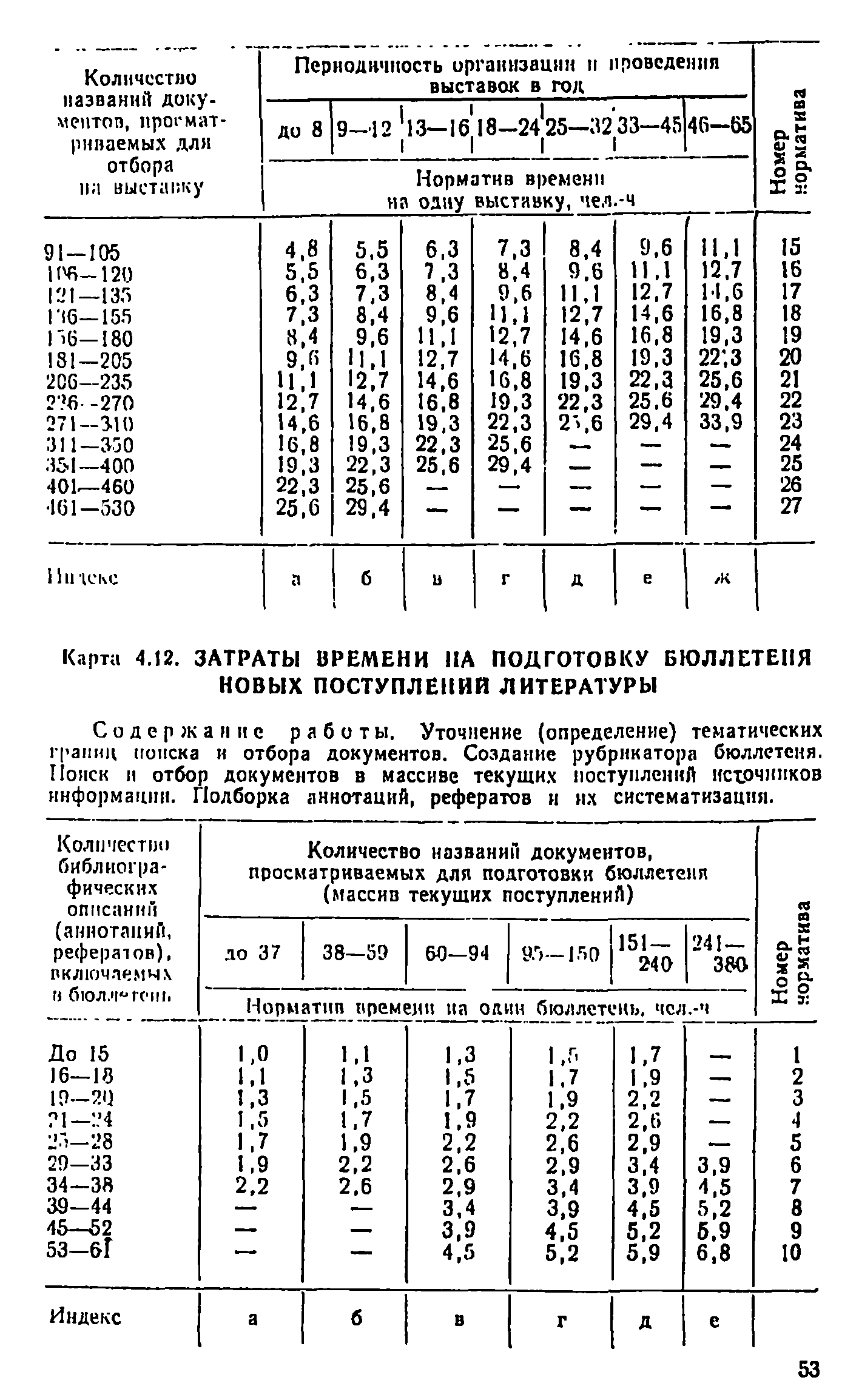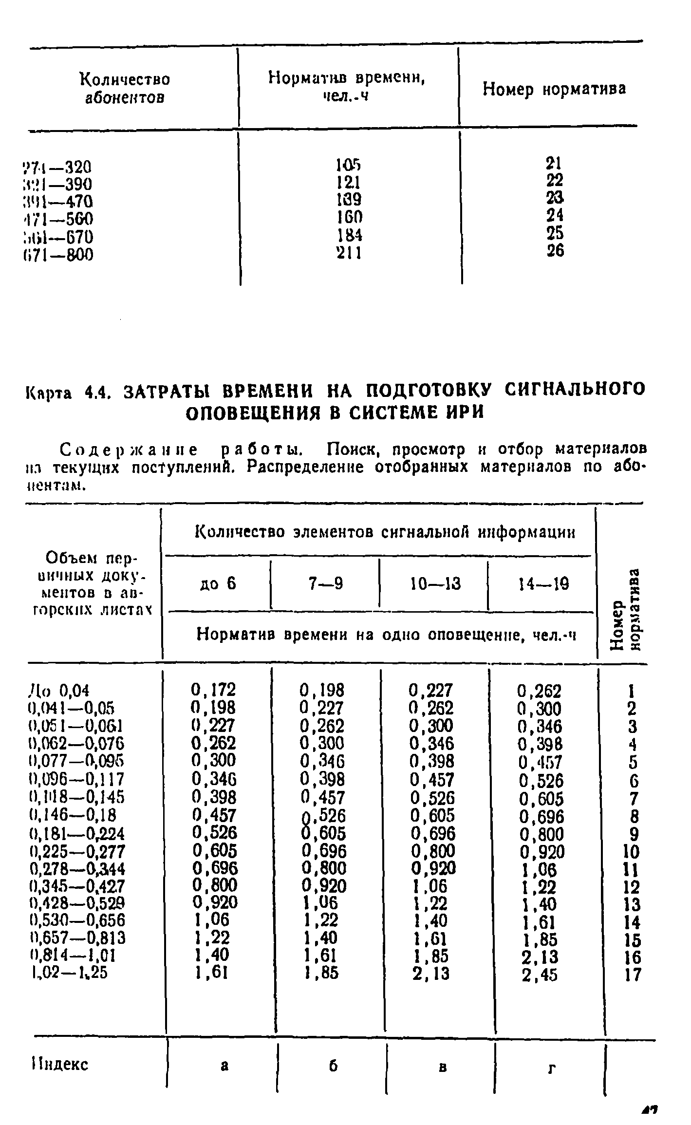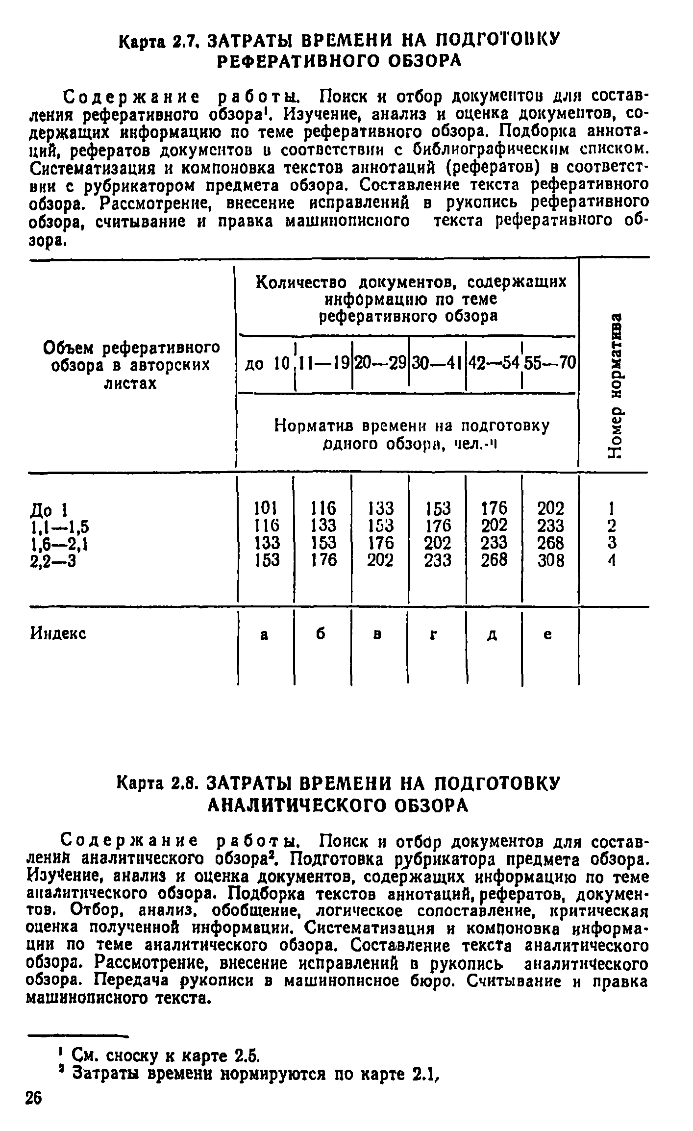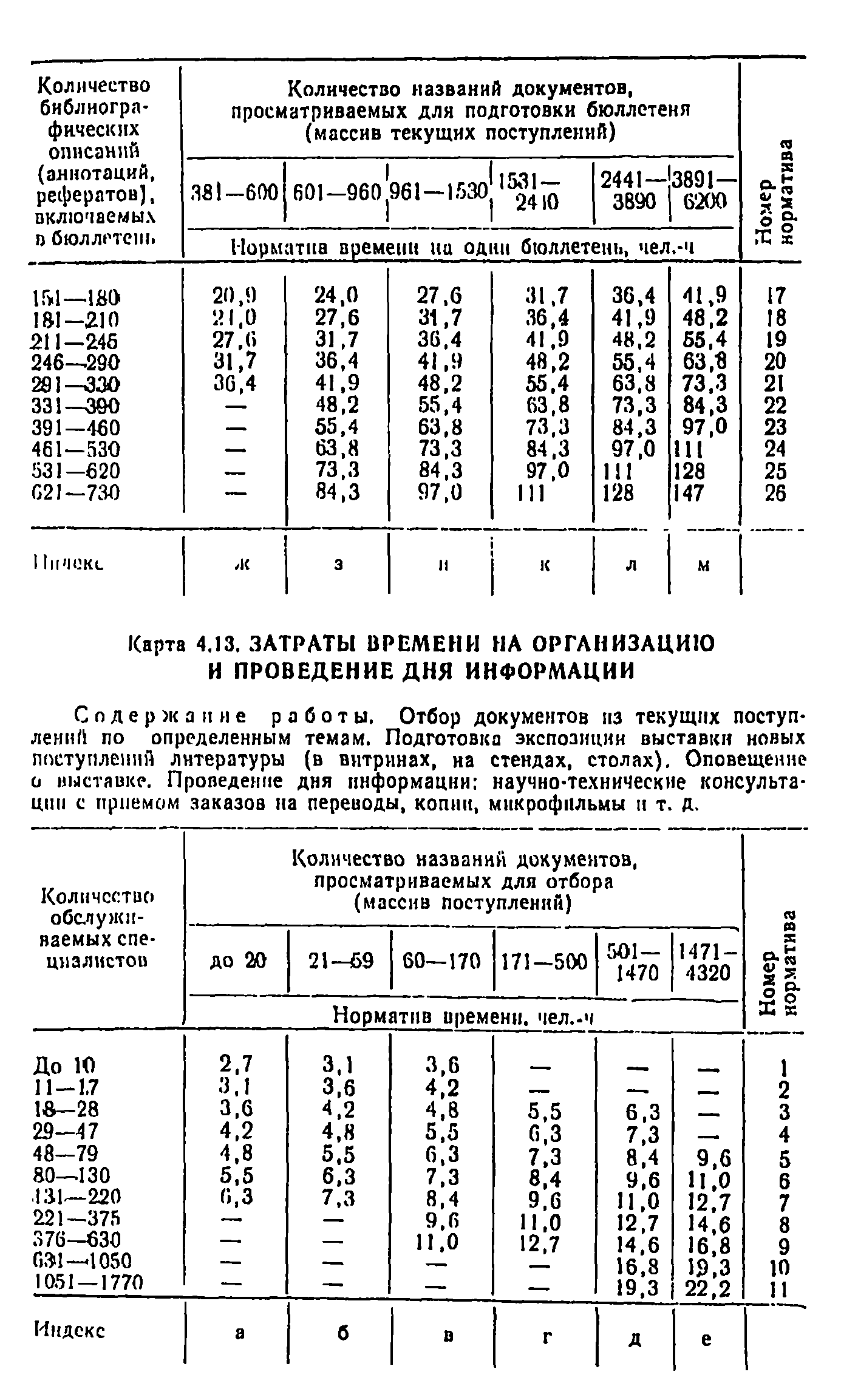 Нормативы времени на работы по научно-технической информации| Статус: | действует | | Название рус.: | Нормативы времени на работы по научно-технической информации | | Дата добавления в базу: | 01.09.2013 | | Дата актуализации: | 01.01.2021 | | Область применения: | Нормативы времени предназначены для расчета норм времени на работы, выполняемые работниками органов научно-технической информации, установления им нормируемых заданий, определения их численности и рекомендуются для применения в центральных отраслевых, республиканских и межотраслевых территориальных органах НТИ, отделах (бюро) информации НИИ, КБ и соответствующих им НТБ | | Оглавление: | 1. Общая часть 2. Организация труда 3. Нормативная часть Раздел 1. Затраты времени на работы по планированию, учету и отчетности Раздел 2. Затраты времени на аналитико-синтетическую переработку информационных материалов Раздел 3. Затраты времени на работы в справочно-информационном фонде Раздел 4. Затраты времени на работы по справочно-информационному обеспечению Раздел 5. Затраты времени на работы по научно-технической пропаганде и распространению передового опыта | | Разработан: | ЦБНТ