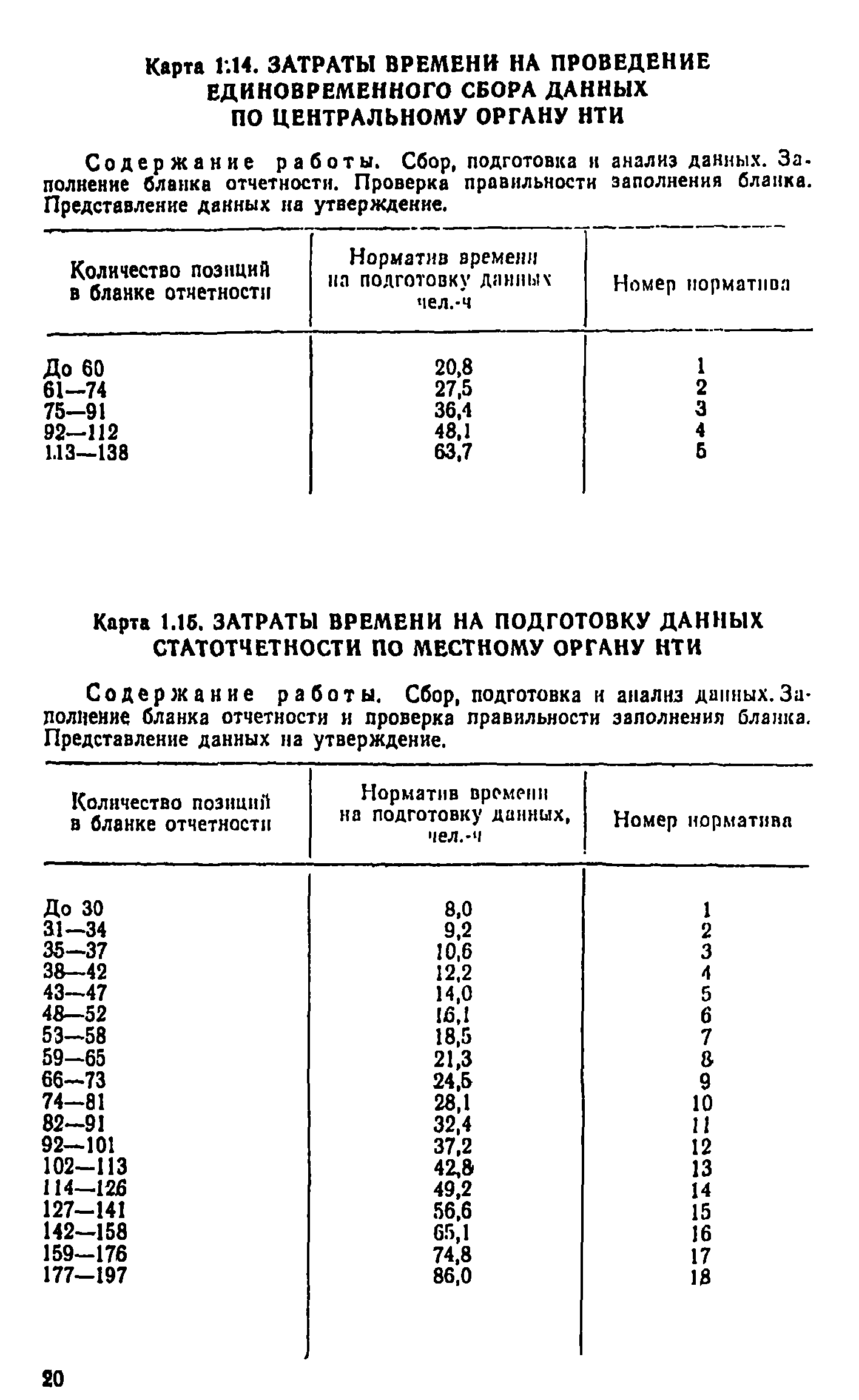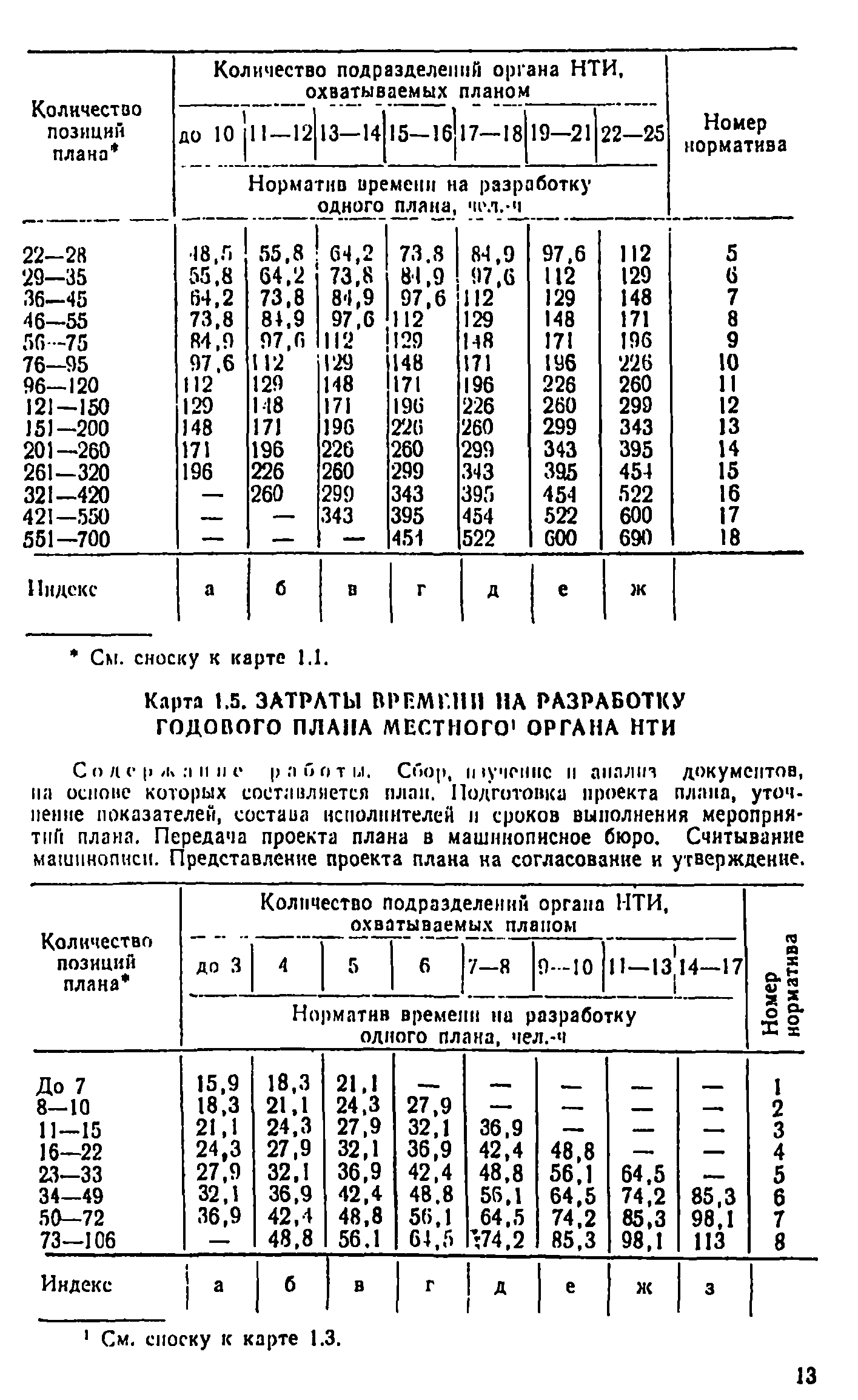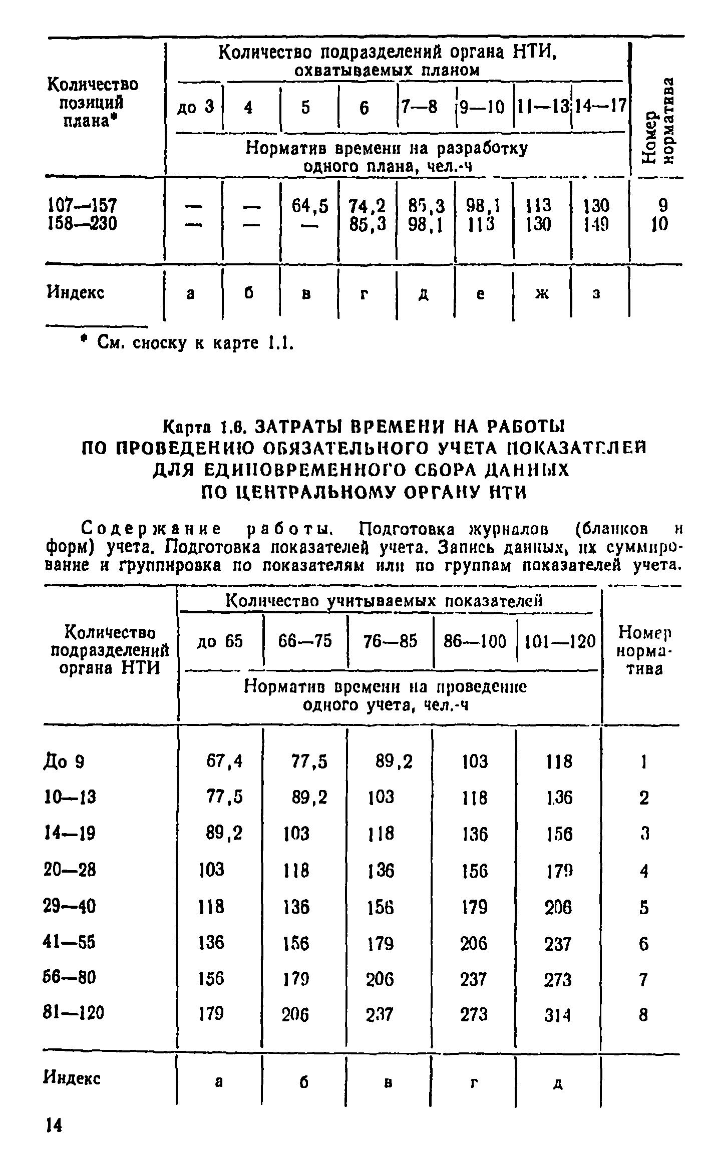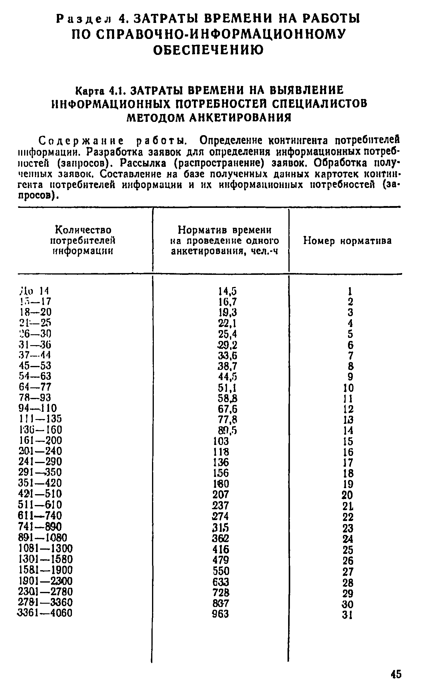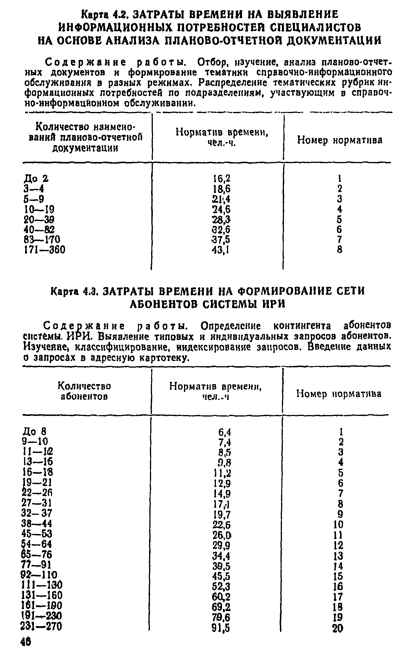Нормативы времени на работы по научно-технической информации| Статус: | действует | | Название рус.: | Нормативы времени на работы по научно-технической информации | | Дата добавления в базу: | 01.09.2013 | | Дата актуализации: | 01.01.2021 | | Область применения: | Нормативы времени предназначены для расчета норм времени на работы, выполняемые работниками органов научно-технической информации, установления им нормируемых заданий, определения их численности и рекомендуются для применения в центральных отраслевых, республиканских и межотраслевых территориальных органах НТИ, отделах (бюро) информации НИИ, КБ и соответствующих им НТБ | | Оглавление: | 1. Общая часть 2. Организация труда 3. Нормативная часть Раздел 1. Затраты времени на работы по планированию, учету и отчетности Раздел 2. Затраты времени на аналитико-синтетическую переработку информационных материалов Раздел 3. Затраты времени на работы в справочно-информационном фонде Раздел 4. Затраты времени на работы по справочно-информационному обеспечению Раздел 5. Затраты времени на работы по научно-технической пропаганде и распространению передового опыта | | Разработан: | ЦБНТ