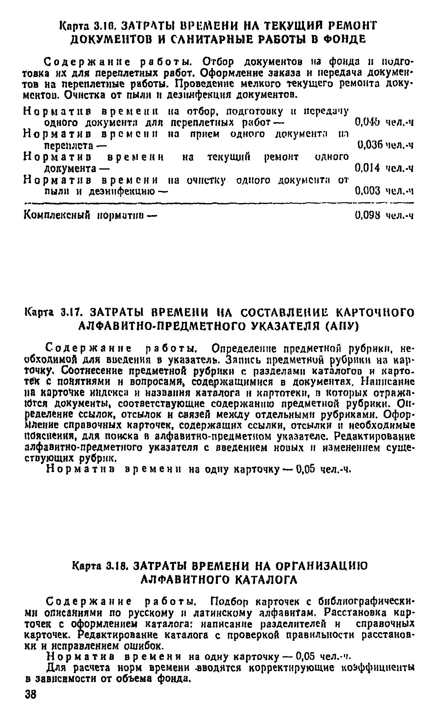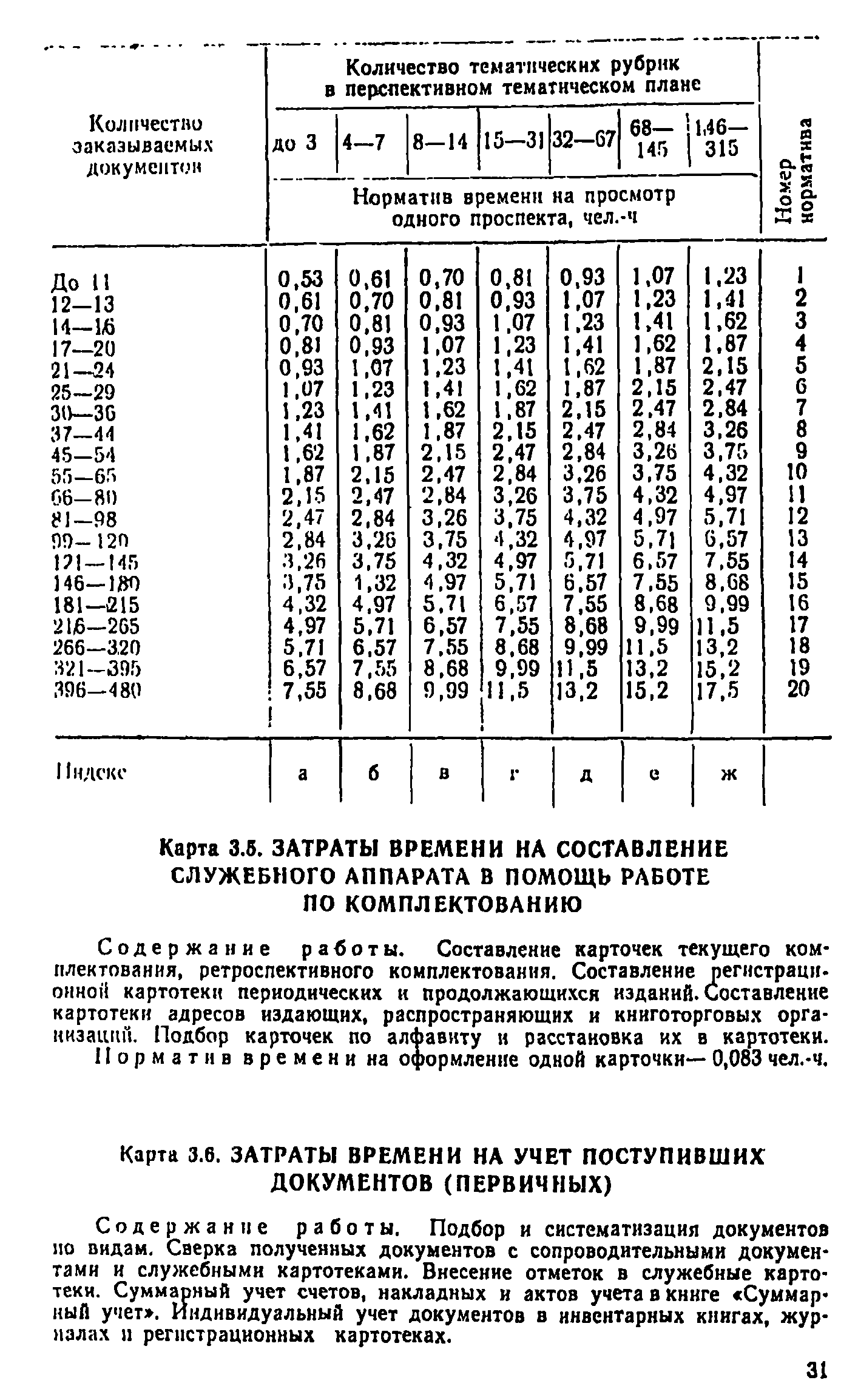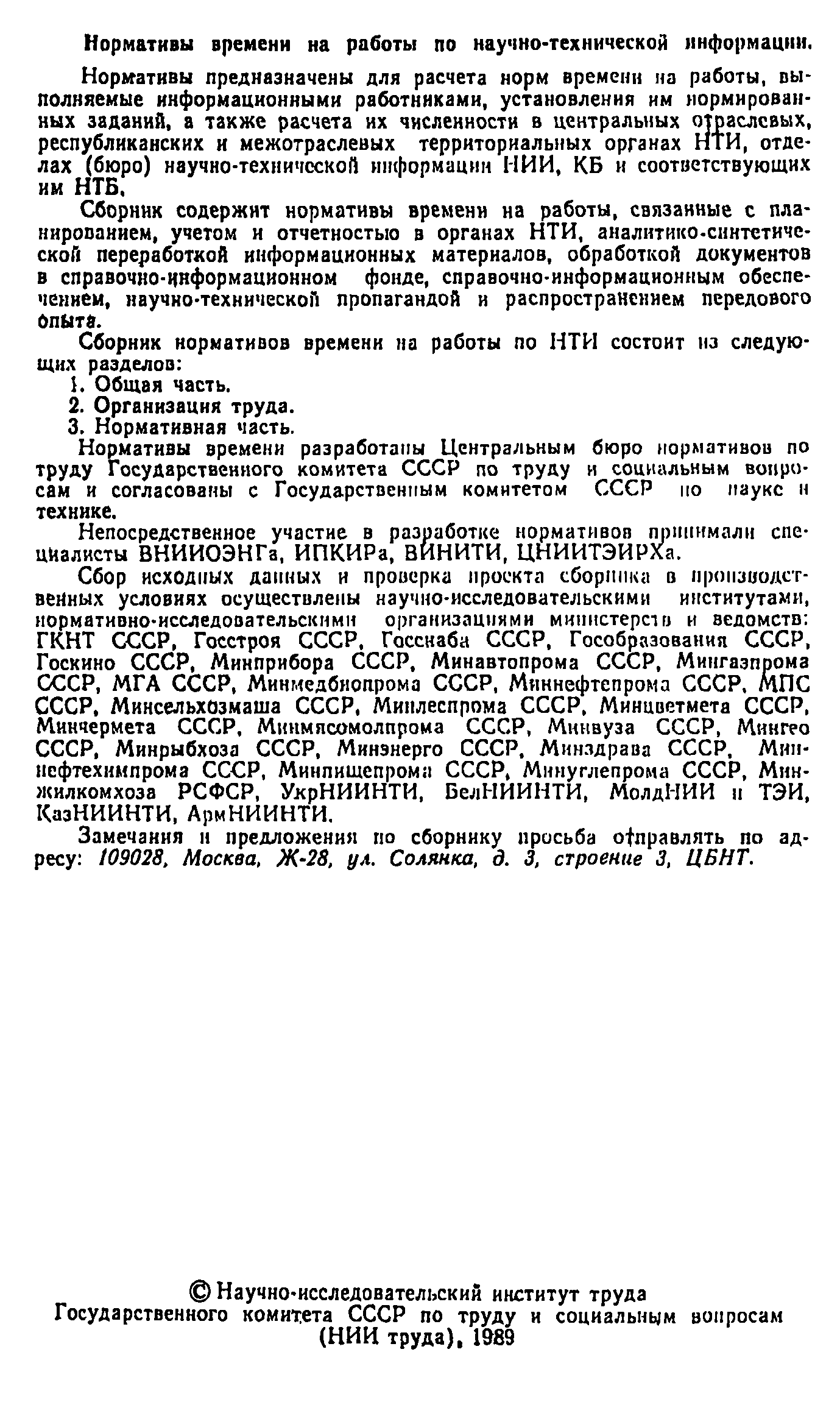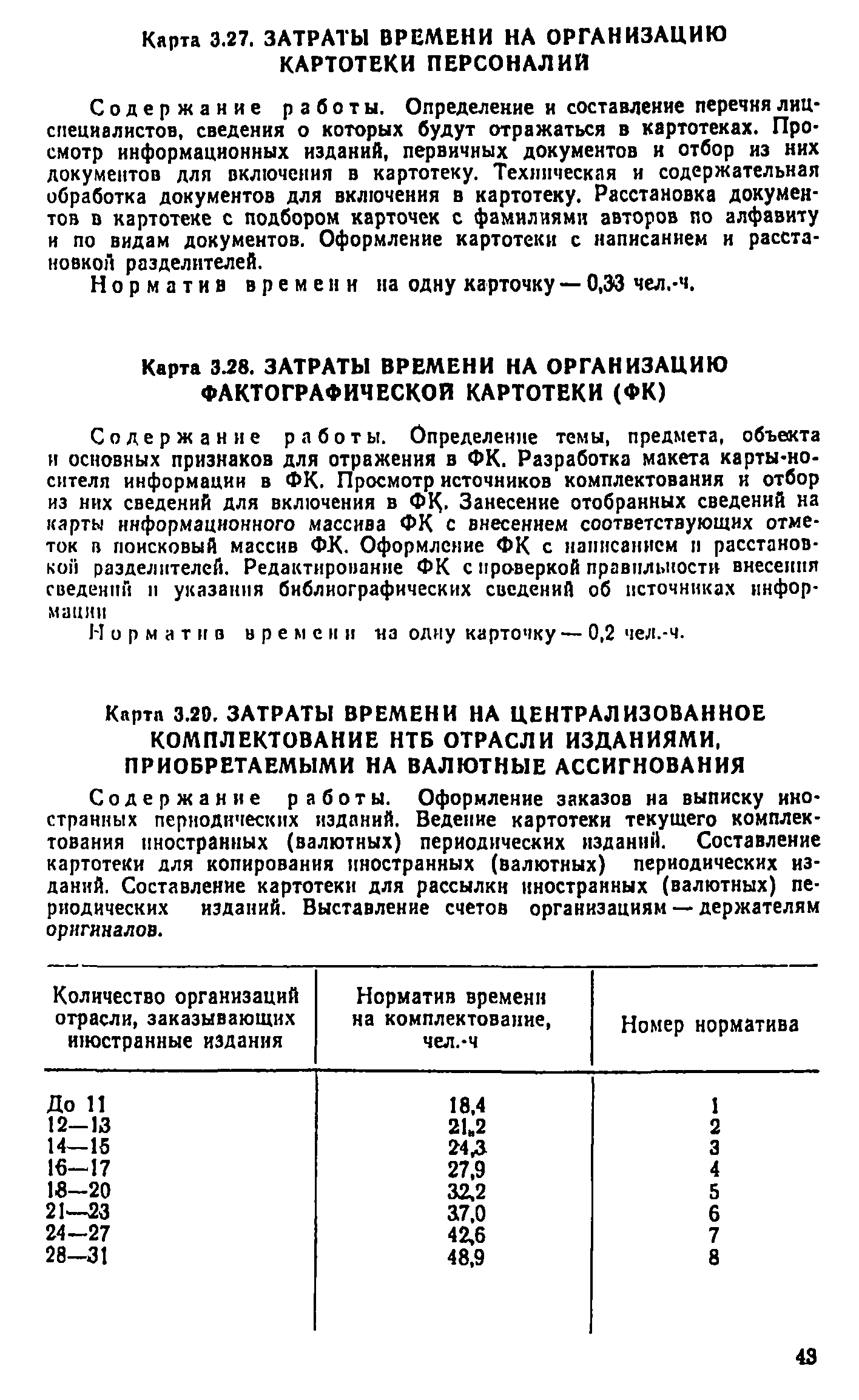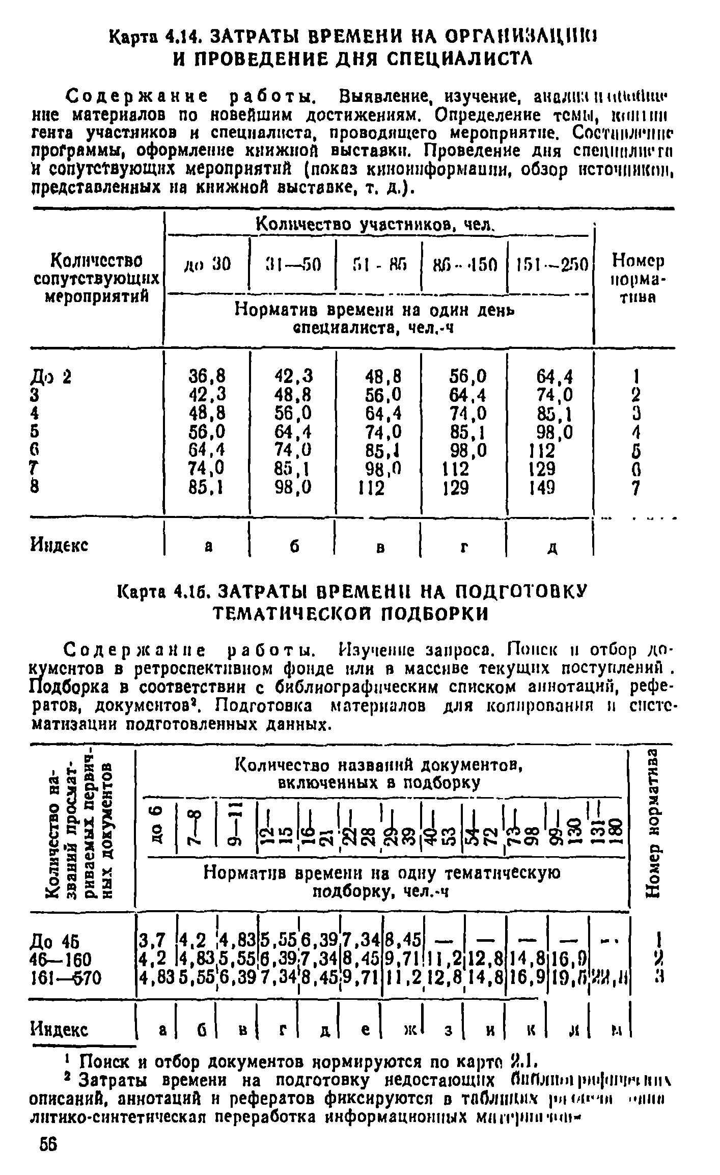 Нормативы времени на работы по научно-технической информации| Статус: | действует | | Название рус.: | Нормативы времени на работы по научно-технической информации | | Дата добавления в базу: | 01.09.2013 | | Дата актуализации: | 01.01.2021 | | Область применения: | Нормативы времени предназначены для расчета норм времени на работы, выполняемые работниками органов научно-технической информации, установления им нормируемых заданий, определения их численности и рекомендуются для применения в центральных отраслевых, республиканских и межотраслевых территориальных органах НТИ, отделах (бюро) информации НИИ, КБ и соответствующих им НТБ | | Оглавление: | 1. Общая часть 2. Организация труда 3. Нормативная часть Раздел 1. Затраты времени на работы по планированию, учету и отчетности Раздел 2. Затраты времени на аналитико-синтетическую переработку информационных материалов Раздел 3. Затраты времени на работы в справочно-информационном фонде Раздел 4. Затраты времени на работы по справочно-информационному обеспечению Раздел 5. Затраты времени на работы по научно-технической пропаганде и распространению передового опыта | | Разработан: | ЦБНТ