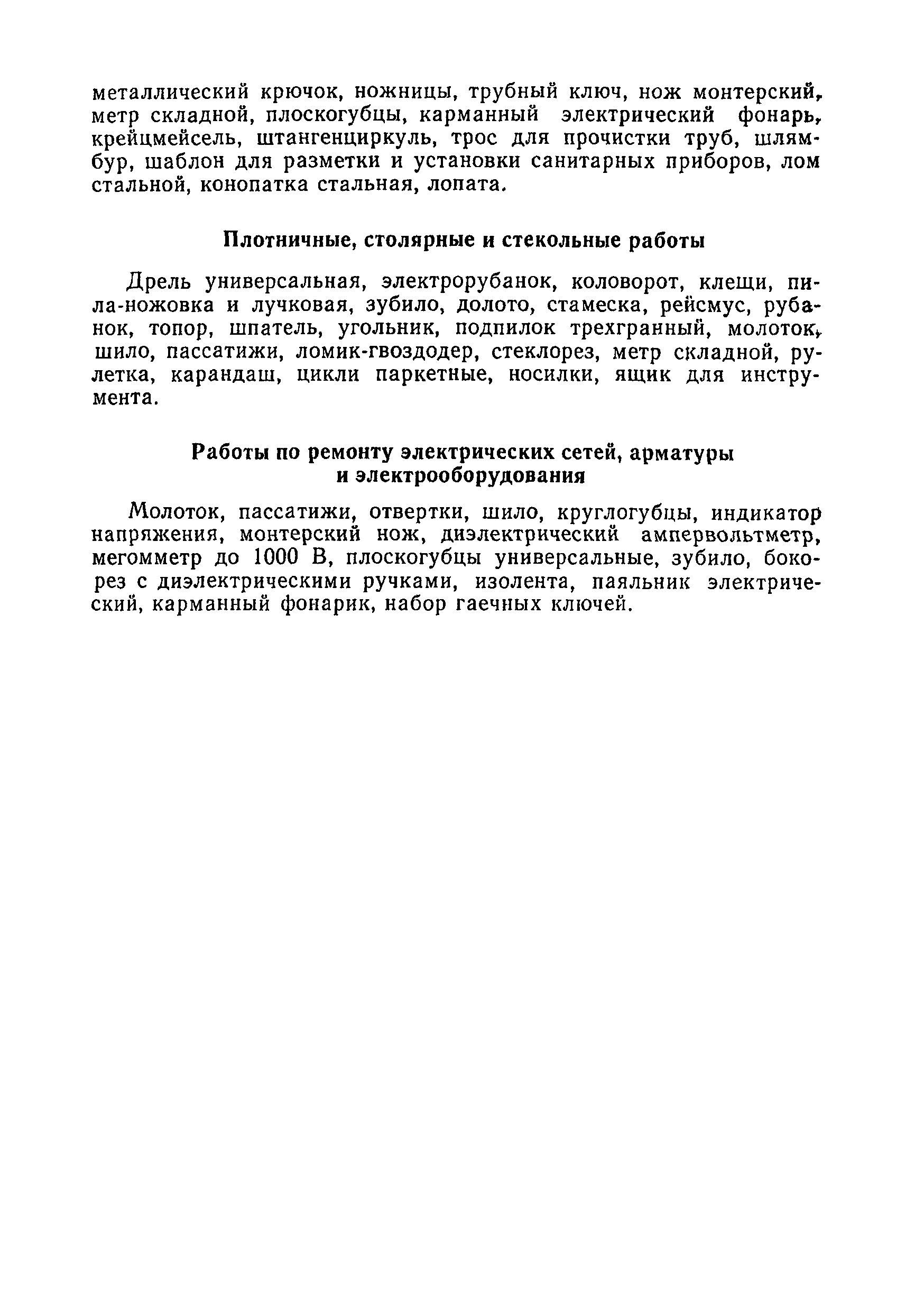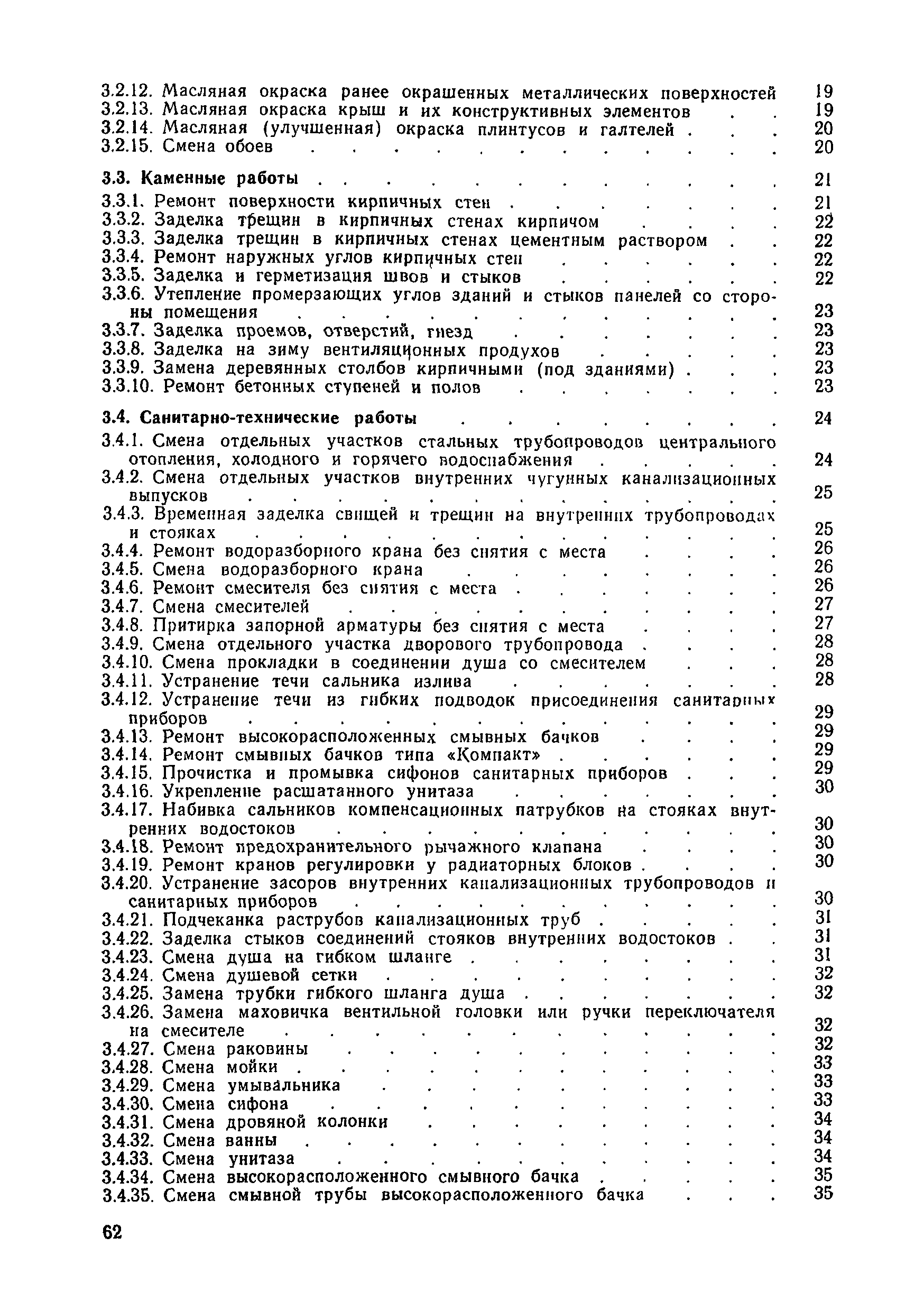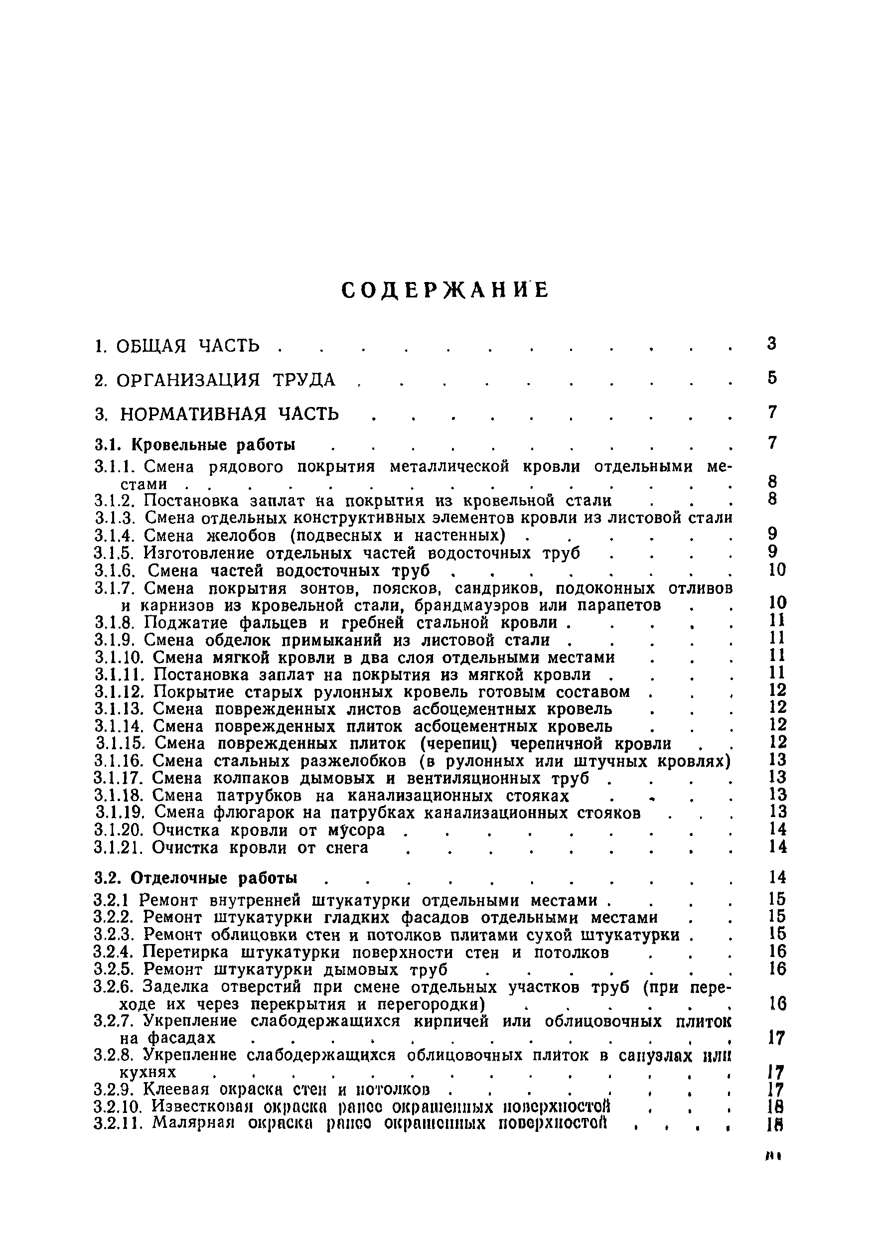 | Оглавление: | 1. Общая часть 2. Организация труда 3. Нормативная часть 3.1 Кровельные работы 3.2 Отделочные работы 3.3 Каменные работы 3.4 Санитарно-технические работы 3.5 Плотничные, столярные и стекольные работы 3.6 Работы по ремонту электрических сетей и электрооборудования 3.7 Технический осмотр жилищного фонда Приложение. Перечень основных инструментов и приспособлений (по видам работ) |