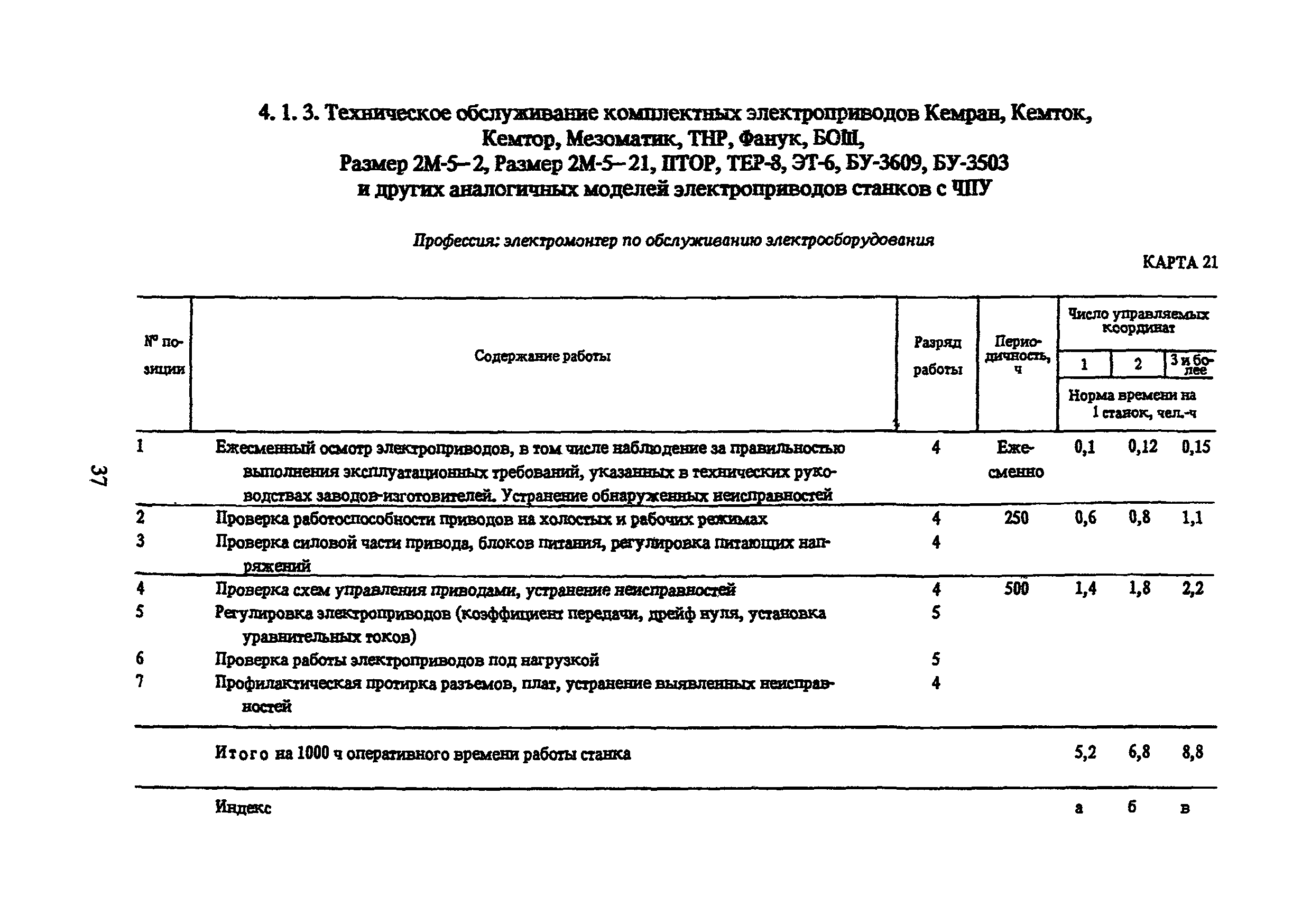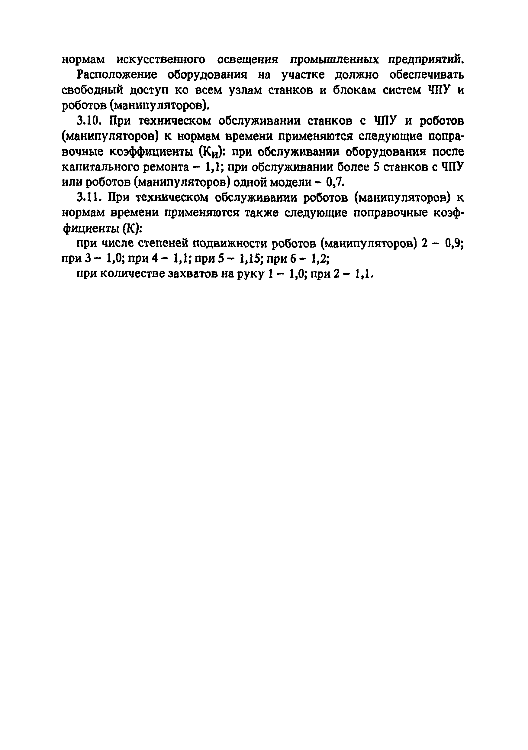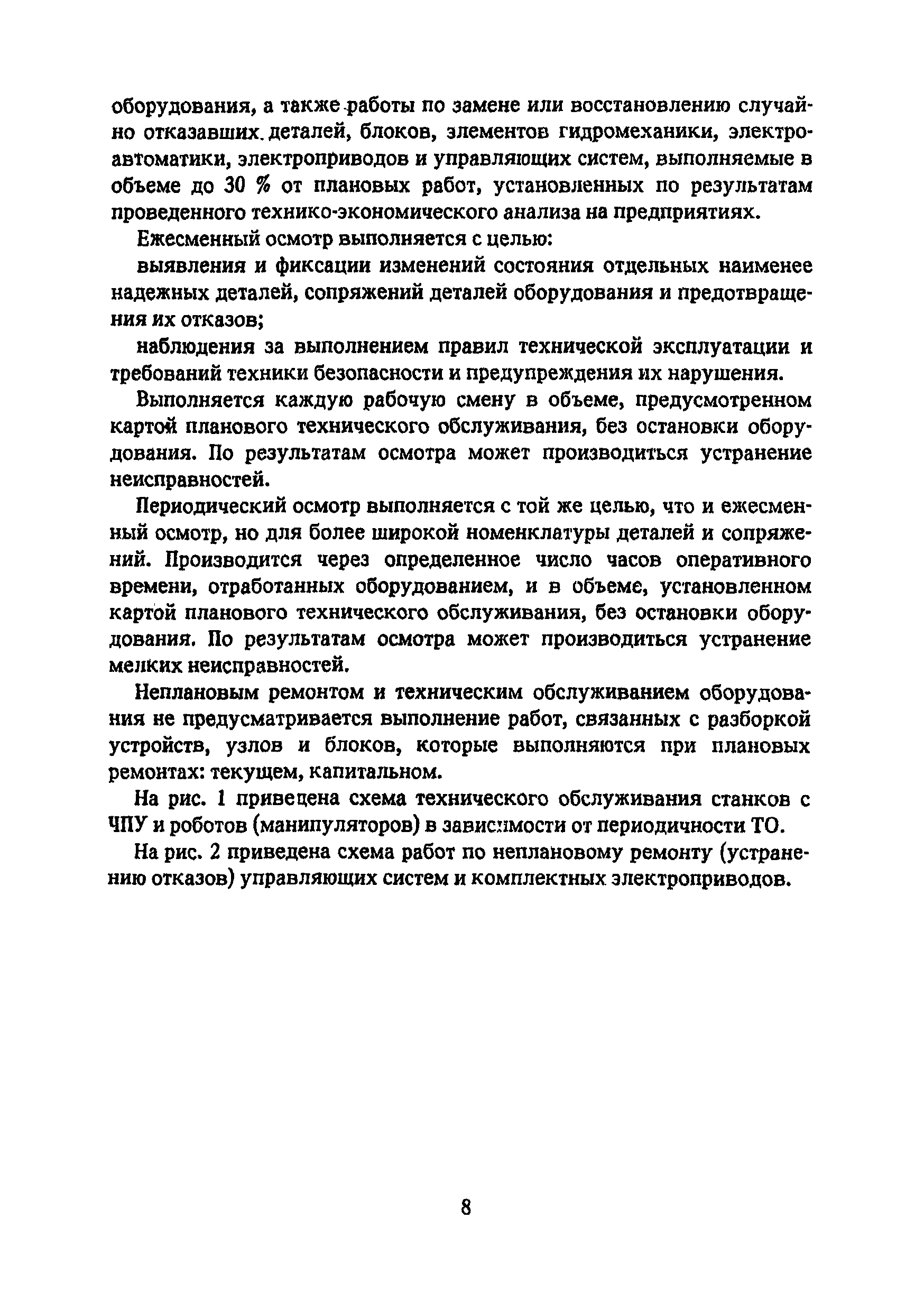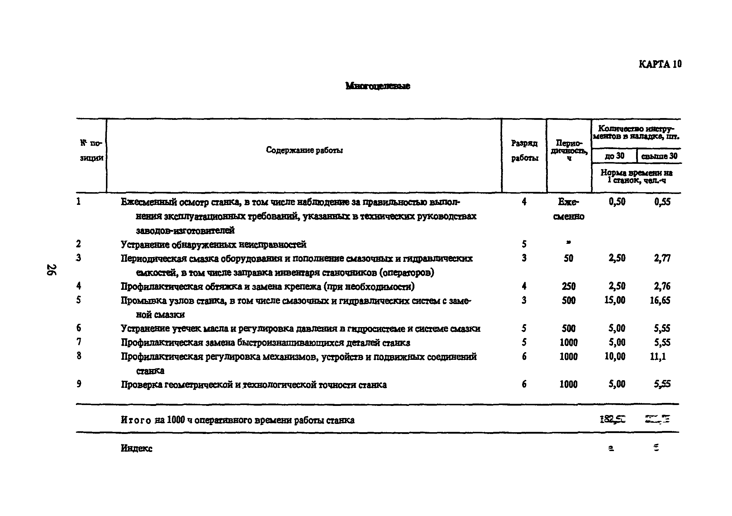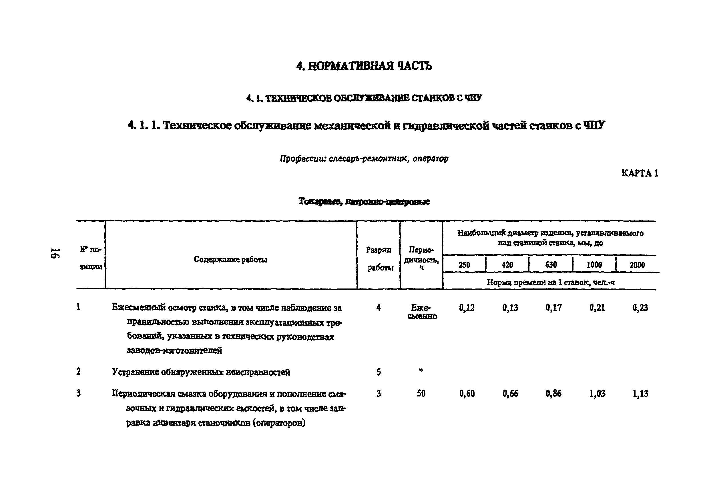 Типовые нормы времени по техническому обслуживанию станков с числовым программным управлением и роботов (манипуляторов)| Статус: | не установлен срок действия | | Название рус.: | Типовые нормы времени по техническому обслуживанию станков с числовым программным управлением и роботов (манипуляторов) | | Дата добавления в базу: | 01.10.2014 | | Дата актуализации: | 01.01.2021 | | Область применения: | Типовые нормы времени на техническое обслуживание станков с числовым программным управлением (ЧПУ) и роботов (манипуляторов) предназначены для нормирования труда слесарей-ремонтников, электромонтеров по обслуживанию электрооборудования, слесарей по контрольно-измерительным приборам и автоматике, наладчиков контрольно-измерительных приборов и автоматики, инженеров-электроников, операторов, занятых техническим обслуживанием универсальных и многоцелевых станков с ЧПУ и роботов (манипуляторов) на предприятиях отраслей народного хозяйства независимо от их ведомственной подчиненности. | | Оглавление: | 1. Общая часть 2. Характеристика применяемого оборудования и технология работы 3. Организация труда 4. Нормативная часты 4.1. Техническое обслуживание станков с ЧПУ 4.1.1. Техническое обслуживание механической и гидравлической частей станков с ЧПУ Карта 1. Токарные патронно-центровые Карта 2. Токарно-карусельные Карта 3. Лоботокарные Карта 4. Токарно-револьверные Карта 5. Горизонтально-расточные Карта 6. Координатно-расточные Карта 7. Сверлильные Карта 8. Фрезерные Карта 9. Круглошлифовальные Карта 10. Многоцелевые 4.1.2. Техническое обслуживание электротехнической части станков с ЧПУ Карта 11. Токарные, патронно-центровые Карта 12. Токарно-карусельные Карта 13. Лоботокарные Карта 14. Токарно-револьверные Карта 15. Горизонтально-расточные Карта 16. Координатно-расточные Карта 17. Сверлильные Карта 18. Фрезерные Карта 19. Круглошлифовальные Карта 20. Многоцелевые 4.1.3. Техническое обслуживание комплектных электроприводов, карта 21 4.1.4. Техническое обслуживание управляющих систем станков с ЧПУ, карта 22 4.1.5. Неплановый ремонт (устранение отказов) управляющих систем и комплектных электроприводов станков с ЧПУ, карта 23 4.2. Техническое обслуживание роботов (манипуляторов) 4.2.1. Техническое обслуживание механической, гидравлической и пневматической частей, карта 24 4.2.2. Техническое обслуживание электротехнической части роботов (манипуляторов), карта 25 4.2.3. Техническое обслуживание комплектных электроприводов, карта 26 4.2.4. Техническое обслуживание управляющих систем, карта 27 4.2.5. Неплановый ремонт (устранение отказов) управляющих систем и комплектных электроприводов, карта 28 Приложение. Таблица станков с числовым программным управлением | | Разработан: | ЦБНТ Рязанский филиал института Оргстанкинпром