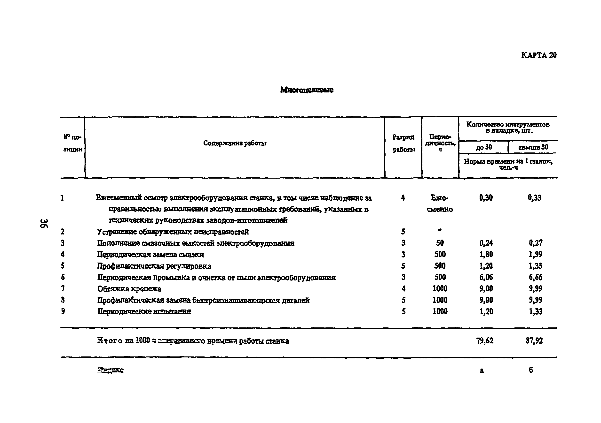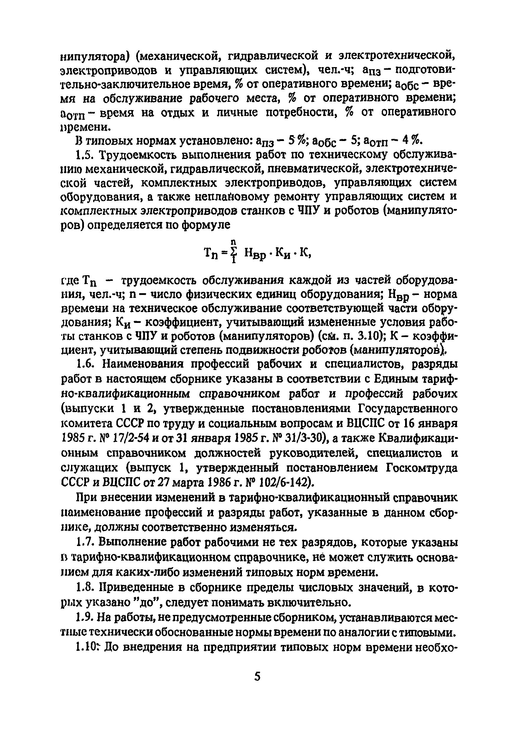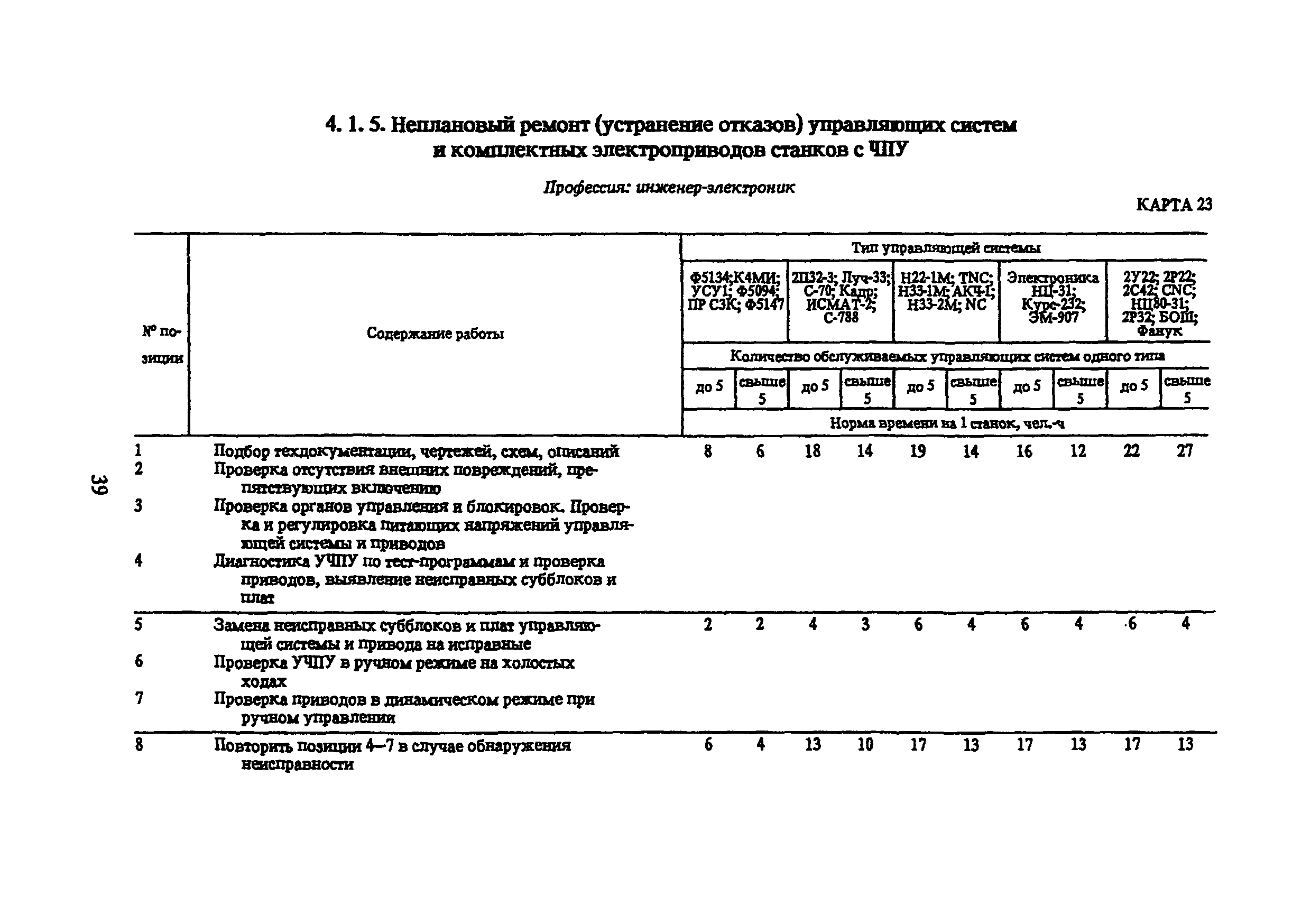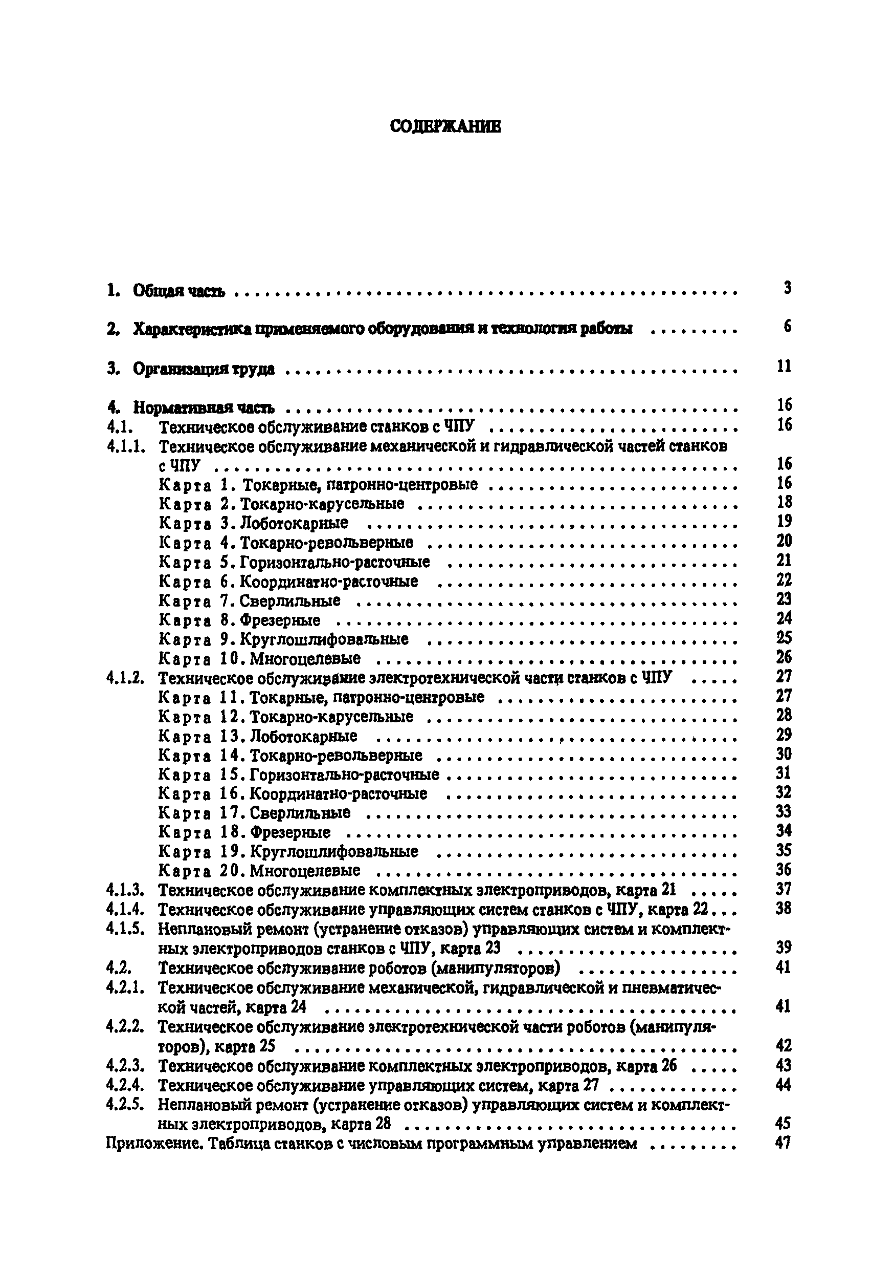 Типовые нормы времени по техническому обслуживанию станков с числовым программным управлением и роботов (манипуляторов)| Статус: | не установлен срок действия | | Название рус.: | Типовые нормы времени по техническому обслуживанию станков с числовым программным управлением и роботов (манипуляторов) | | Дата добавления в базу: | 01.10.2014 | | Дата актуализации: | 01.01.2021 | | Область применения: | Типовые нормы времени на техническое обслуживание станков с числовым программным управлением (ЧПУ) и роботов (манипуляторов) предназначены для нормирования труда слесарей-ремонтников, электромонтеров по обслуживанию электрооборудования, слесарей по контрольно-измерительным приборам и автоматике, наладчиков контрольно-измерительных приборов и автоматики, инженеров-электроников, операторов, занятых техническим обслуживанием универсальных и многоцелевых станков с ЧПУ и роботов (манипуляторов) на предприятиях отраслей народного хозяйства независимо от их ведомственной подчиненности. | | Оглавление: | 1. Общая часть 2. Характеристика применяемого оборудования и технология работы 3. Организация труда 4. Нормативная часты 4.1. Техническое обслуживание станков с ЧПУ 4.1.1. Техническое обслуживание механической и гидравлической частей станков с ЧПУ Карта 1. Токарные патронно-центровые Карта 2. Токарно-карусельные Карта 3. Лоботокарные Карта 4. Токарно-револьверные Карта 5. Горизонтально-расточные Карта 6. Координатно-расточные Карта 7. Сверлильные Карта 8. Фрезерные Карта 9. Круглошлифовальные Карта 10. Многоцелевые 4.1.2. Техническое обслуживание электротехнической части станков с ЧПУ Карта 11. Токарные, патронно-центровые Карта 12. Токарно-карусельные Карта 13. Лоботокарные Карта 14. Токарно-револьверные Карта 15. Горизонтально-расточные Карта 16. Координатно-расточные Карта 17. Сверлильные Карта 18. Фрезерные Карта 19. Круглошлифовальные Карта 20. Многоцелевые 4.1.3. Техническое обслуживание комплектных электроприводов, карта 21 4.1.4. Техническое обслуживание управляющих систем станков с ЧПУ, карта 22 4.1.5. Неплановый ремонт (устранение отказов) управляющих систем и комплектных электроприводов станков с ЧПУ, карта 23 4.2. Техническое обслуживание роботов (манипуляторов) 4.2.1. Техническое обслуживание механической, гидравлической и пневматической частей, карта 24 4.2.2. Техническое обслуживание электротехнической части роботов (манипуляторов), карта 25 4.2.3. Техническое обслуживание комплектных электроприводов, карта 26 4.2.4. Техническое обслуживание управляющих систем, карта 27 4.2.5. Неплановый ремонт (устранение отказов) управляющих систем и комплектных электроприводов, карта 28 Приложение. Таблица станков с числовым программным управлением | | Разработан: | ЦБНТ Рязанский филиал института Оргстанкинпром