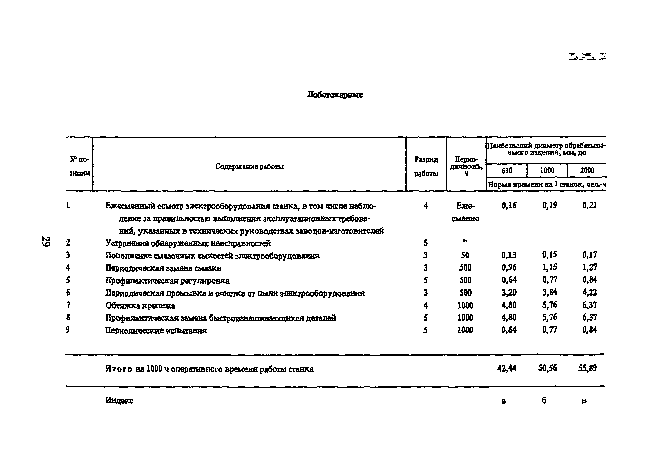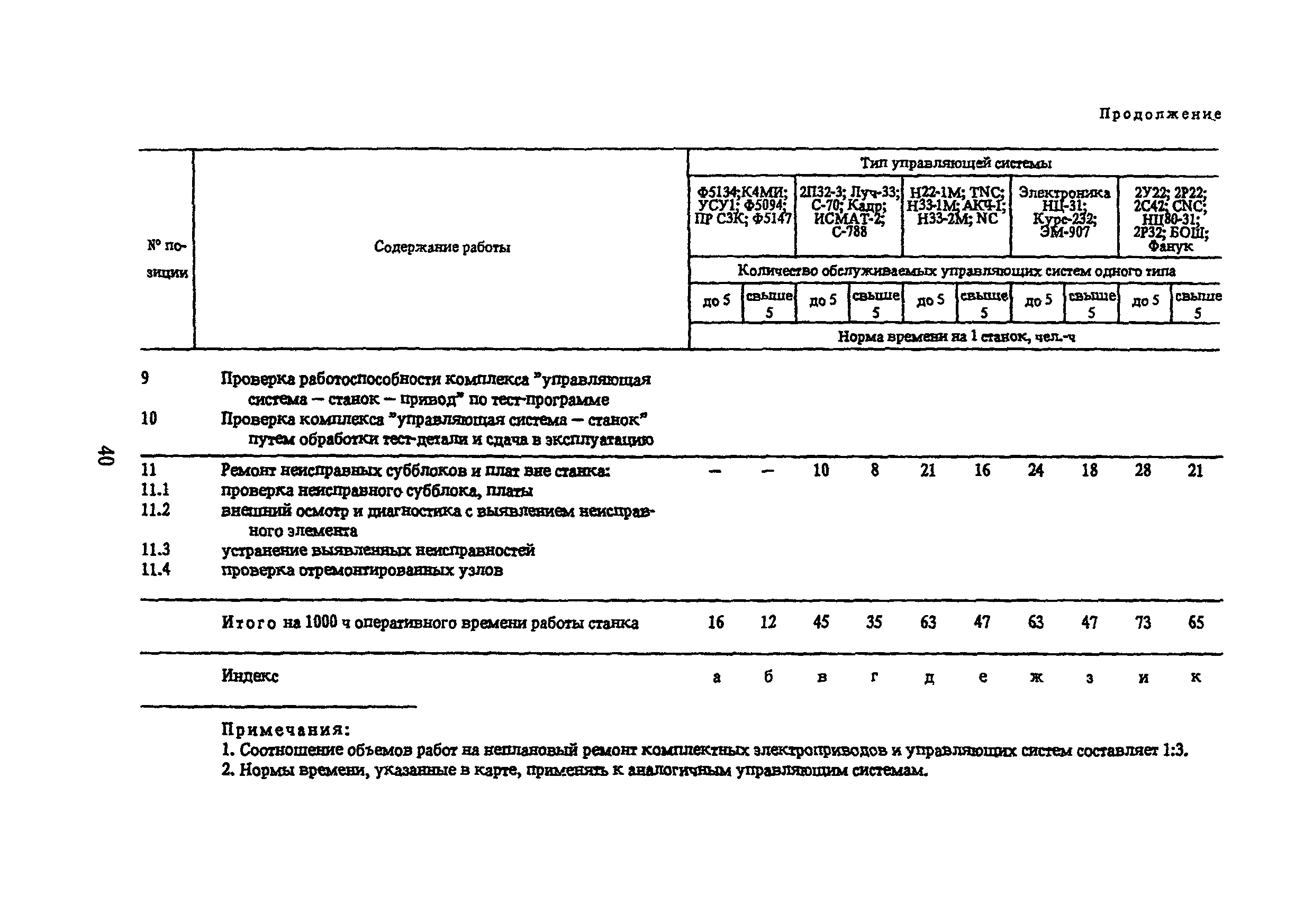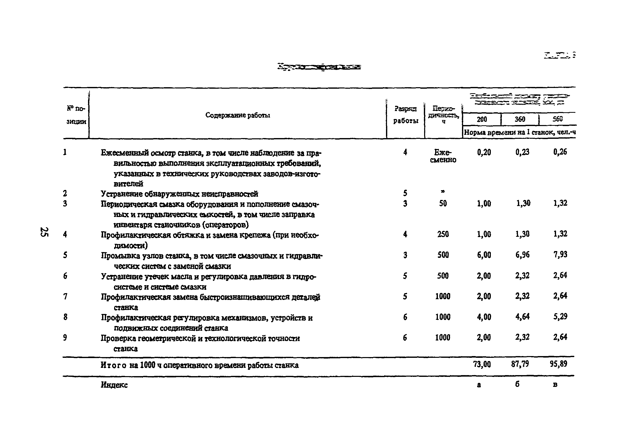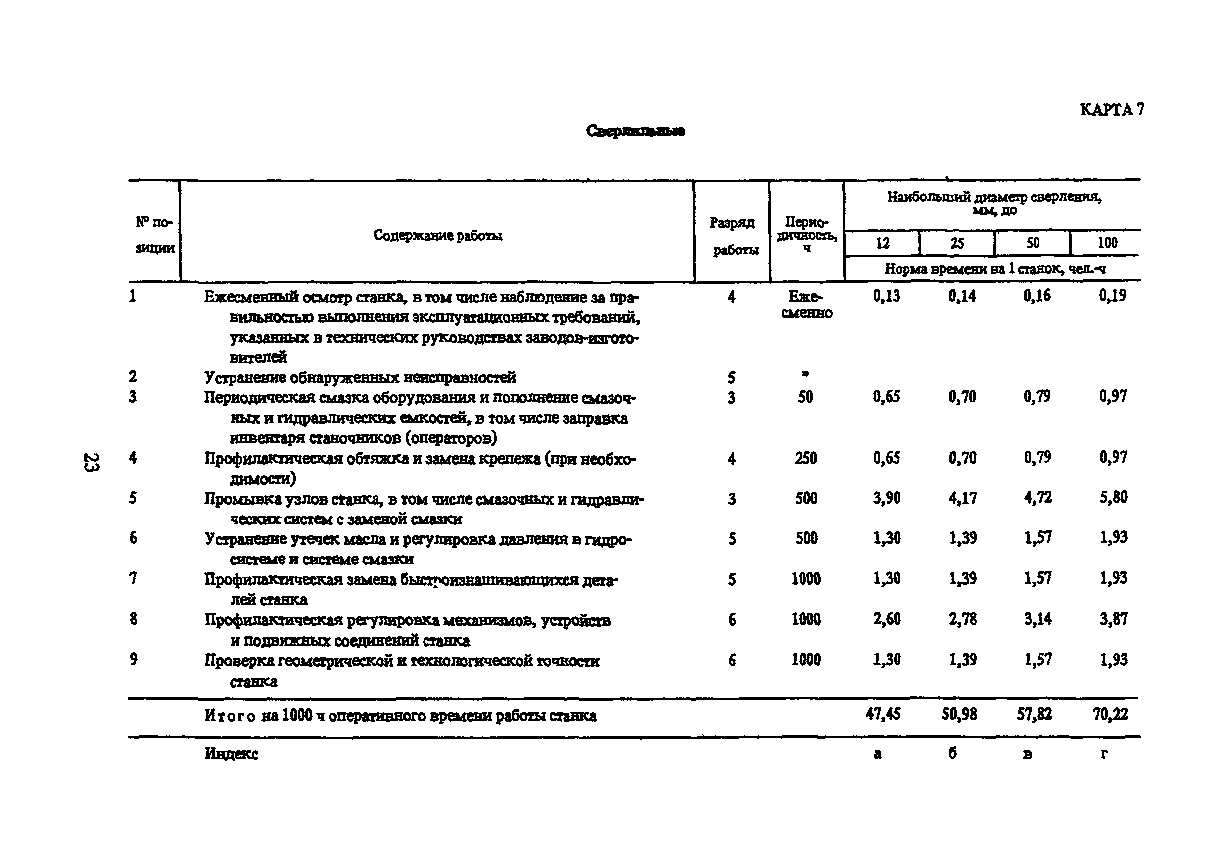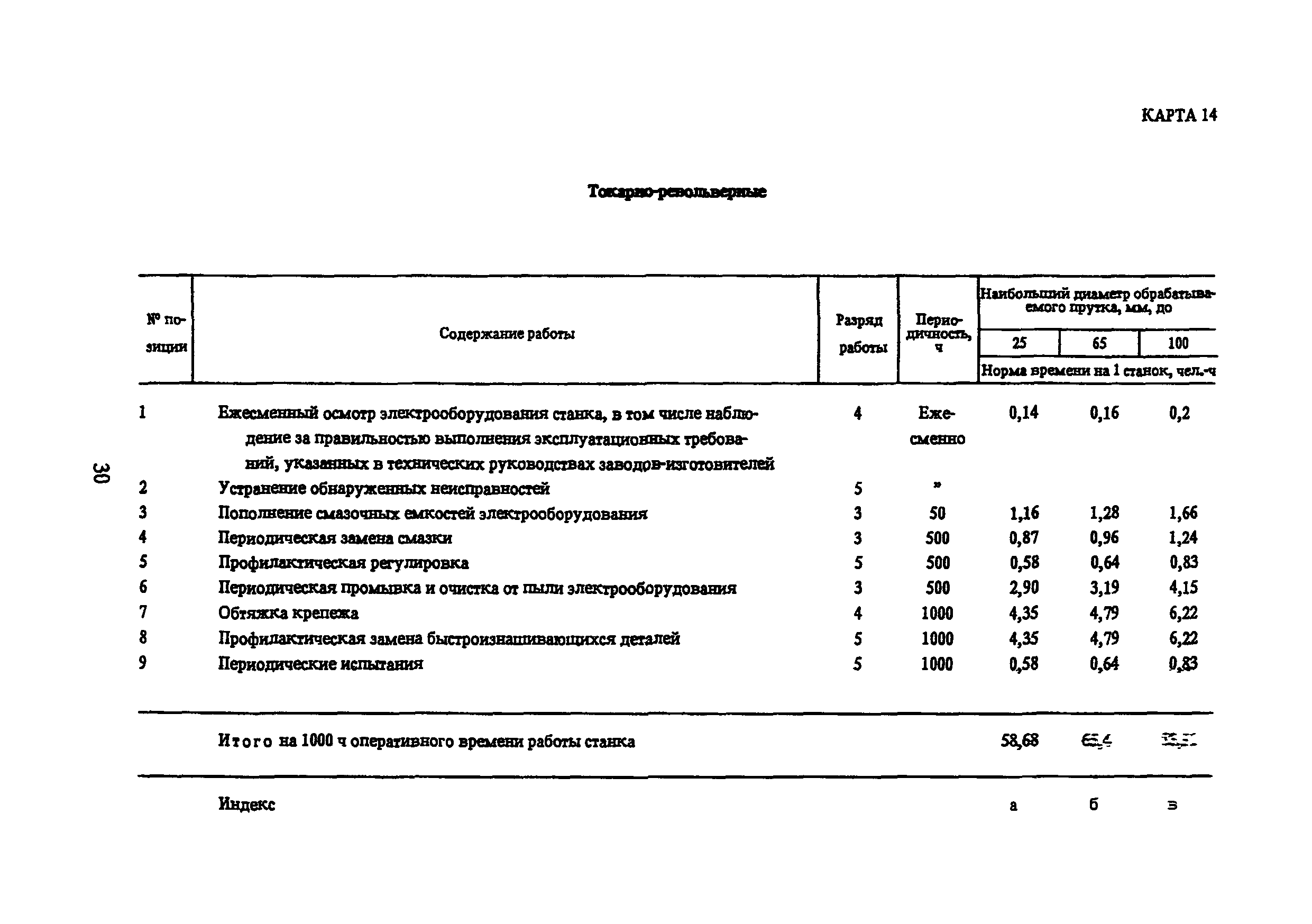 Типовые нормы времени по техническому обслуживанию станков с числовым программным управлением и роботов (манипуляторов)| Статус: | не установлен срок действия | | Название рус.: | Типовые нормы времени по техническому обслуживанию станков с числовым программным управлением и роботов (манипуляторов) | | Дата добавления в базу: | 01.10.2014 | | Дата актуализации: | 01.01.2021 | | Область применения: | Типовые нормы времени на техническое обслуживание станков с числовым программным управлением (ЧПУ) и роботов (манипуляторов) предназначены для нормирования труда слесарей-ремонтников, электромонтеров по обслуживанию электрооборудования, слесарей по контрольно-измерительным приборам и автоматике, наладчиков контрольно-измерительных приборов и автоматики, инженеров-электроников, операторов, занятых техническим обслуживанием универсальных и многоцелевых станков с ЧПУ и роботов (манипуляторов) на предприятиях отраслей народного хозяйства независимо от их ведомственной подчиненности. | | Оглавление: | 1. Общая часть 2. Характеристика применяемого оборудования и технология работы 3. Организация труда 4. Нормативная часты 4.1. Техническое обслуживание станков с ЧПУ 4.1.1. Техническое обслуживание механической и гидравлической частей станков с ЧПУ Карта 1. Токарные патронно-центровые Карта 2. Токарно-карусельные Карта 3. Лоботокарные Карта 4. Токарно-револьверные Карта 5. Горизонтально-расточные Карта 6. Координатно-расточные Карта 7. Сверлильные Карта 8. Фрезерные Карта 9. Круглошлифовальные Карта 10. Многоцелевые 4.1.2. Техническое обслуживание электротехнической части станков с ЧПУ Карта 11. Токарные, патронно-центровые Карта 12. Токарно-карусельные Карта 13. Лоботокарные Карта 14. Токарно-револьверные Карта 15. Горизонтально-расточные Карта 16. Координатно-расточные Карта 17. Сверлильные Карта 18. Фрезерные Карта 19. Круглошлифовальные Карта 20. Многоцелевые 4.1.3. Техническое обслуживание комплектных электроприводов, карта 21 4.1.4. Техническое обслуживание управляющих систем станков с ЧПУ, карта 22 4.1.5. Неплановый ремонт (устранение отказов) управляющих систем и комплектных электроприводов станков с ЧПУ, карта 23 4.2. Техническое обслуживание роботов (манипуляторов) 4.2.1. Техническое обслуживание механической, гидравлической и пневматической частей, карта 24 4.2.2. Техническое обслуживание электротехнической части роботов (манипуляторов), карта 25 4.2.3. Техническое обслуживание комплектных электроприводов, карта 26 4.2.4. Техническое обслуживание управляющих систем, карта 27 4.2.5. Неплановый ремонт (устранение отказов) управляющих систем и комплектных электроприводов, карта 28 Приложение. Таблица станков с числовым программным управлением | | Разработан: | ЦБНТ Рязанский филиал института Оргстанкинпром