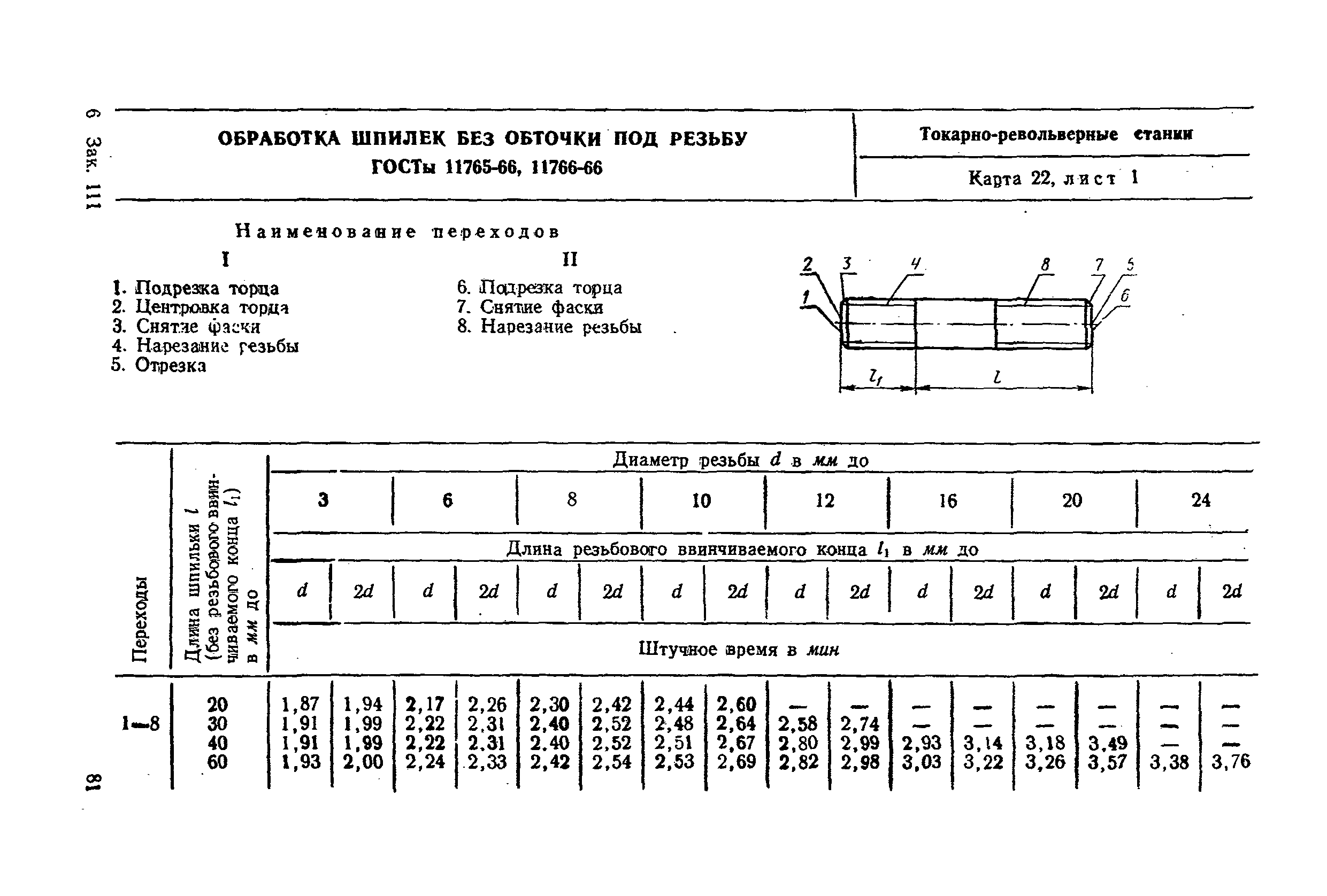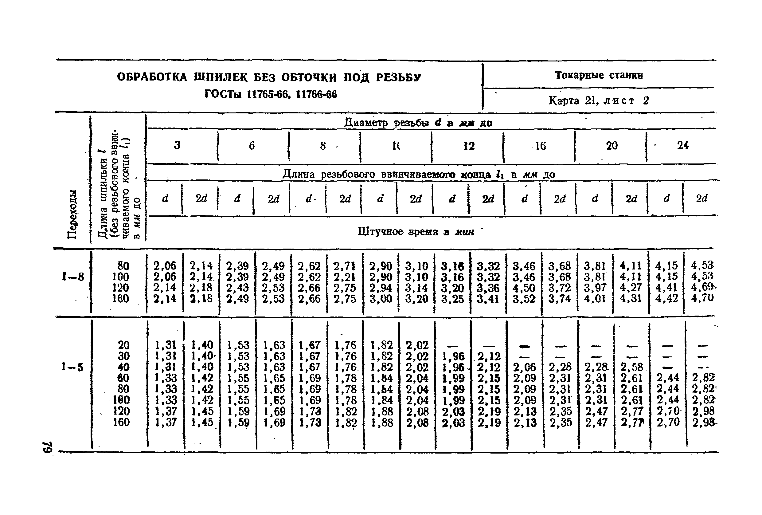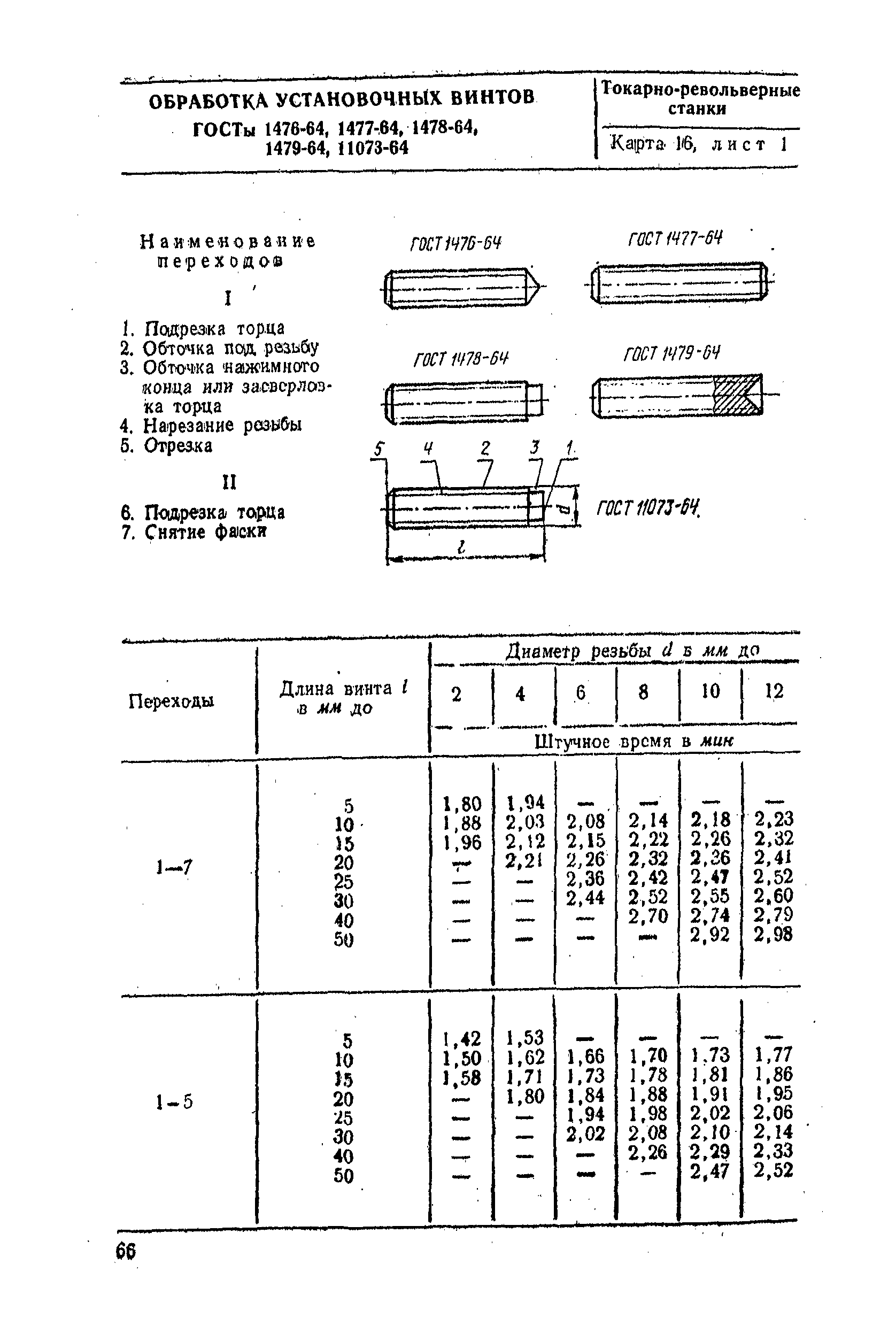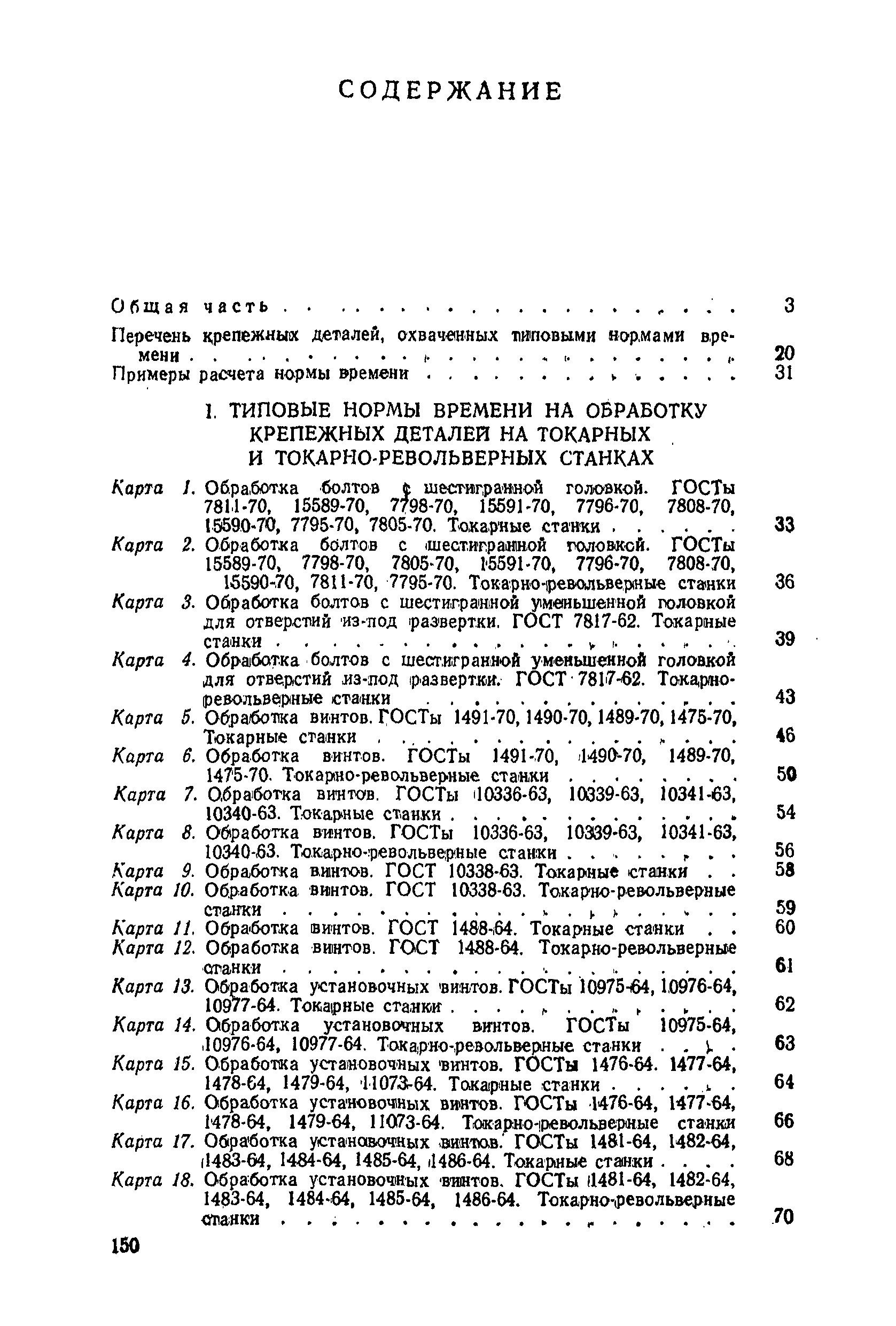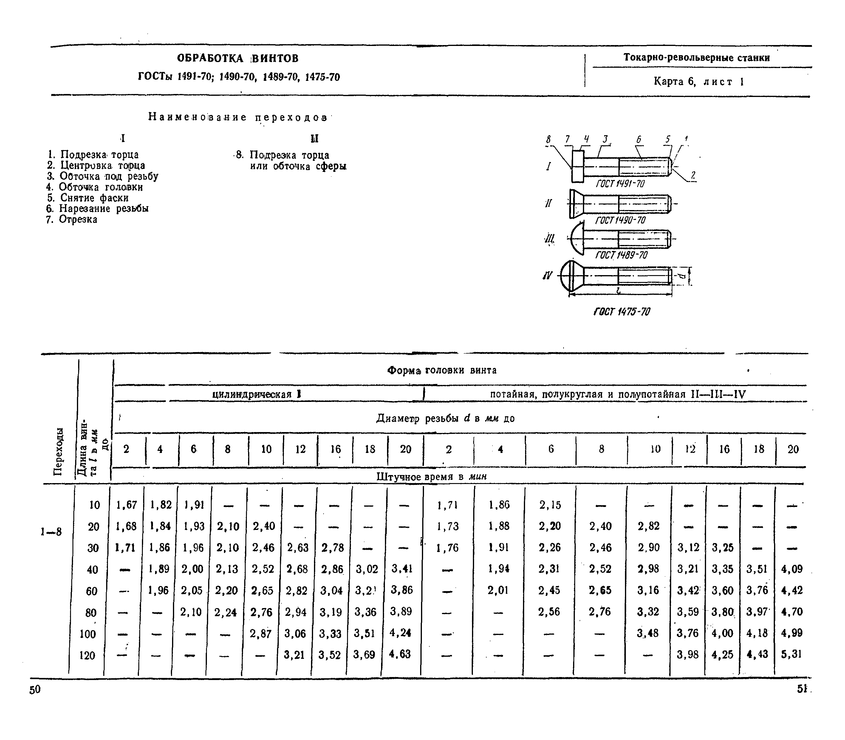 | Оглавление: | 1. Общая часть Перечень крепежных деталей, охваченных типовыми нормами времени Примеры расчета нормы времени 1. Типовые нормы времени на обработку крепежных деталей на токарных и токарно-револьверных станках 2. Типовые нормы времени на обработку крепежных деталей на одношпиндельных токарных автоматах 3. Типовые нормы времени на обработку крепежных деталей на фрезерных, сверлильных, шлифовальных и других станках 4. Подготовительно-заключительное время Приложение 1. Режимы резания для сталей (приближенные значения) Приложение 2. Пример заполнения инструкционно-эксплуатационной карты для выбора режимов резания |