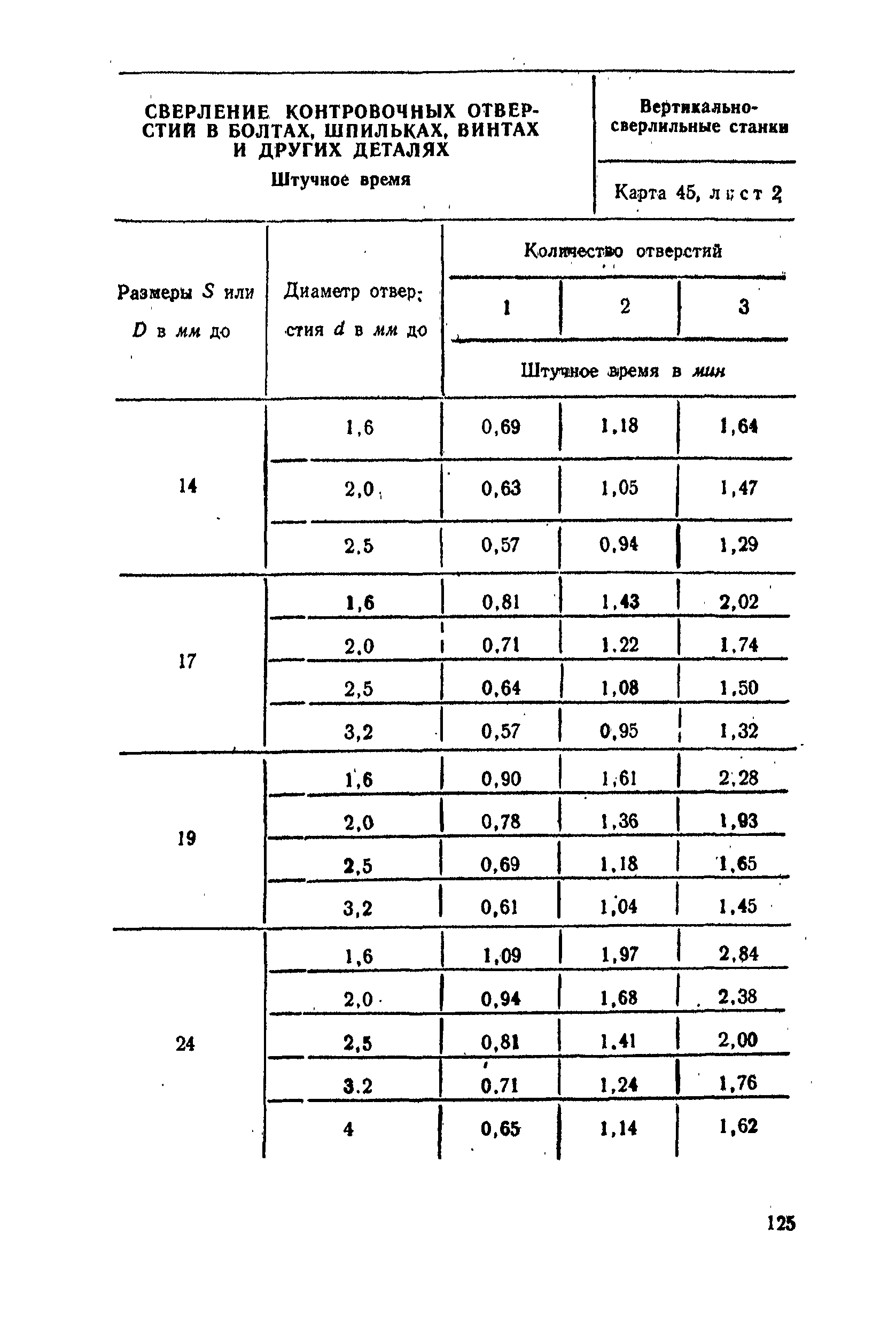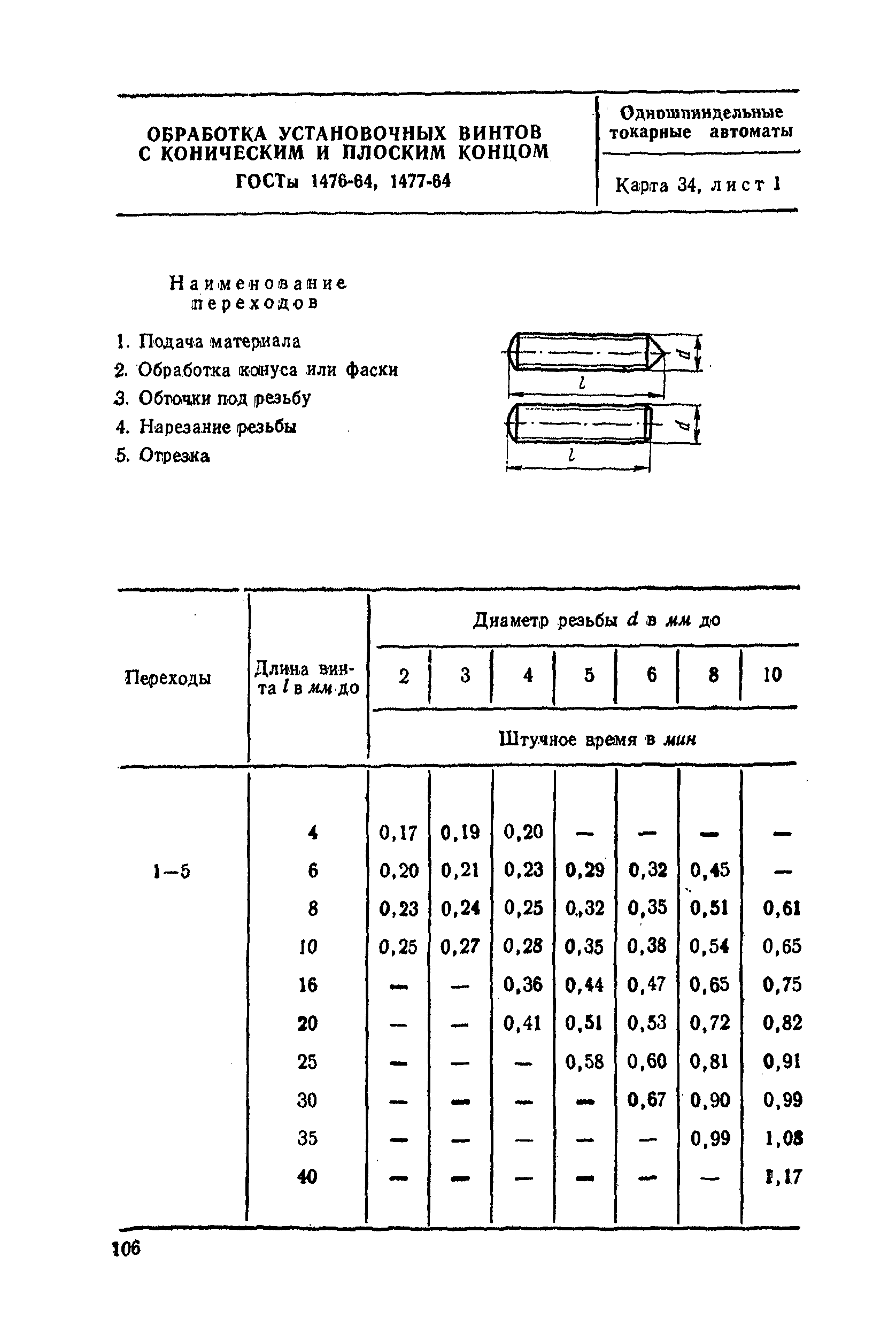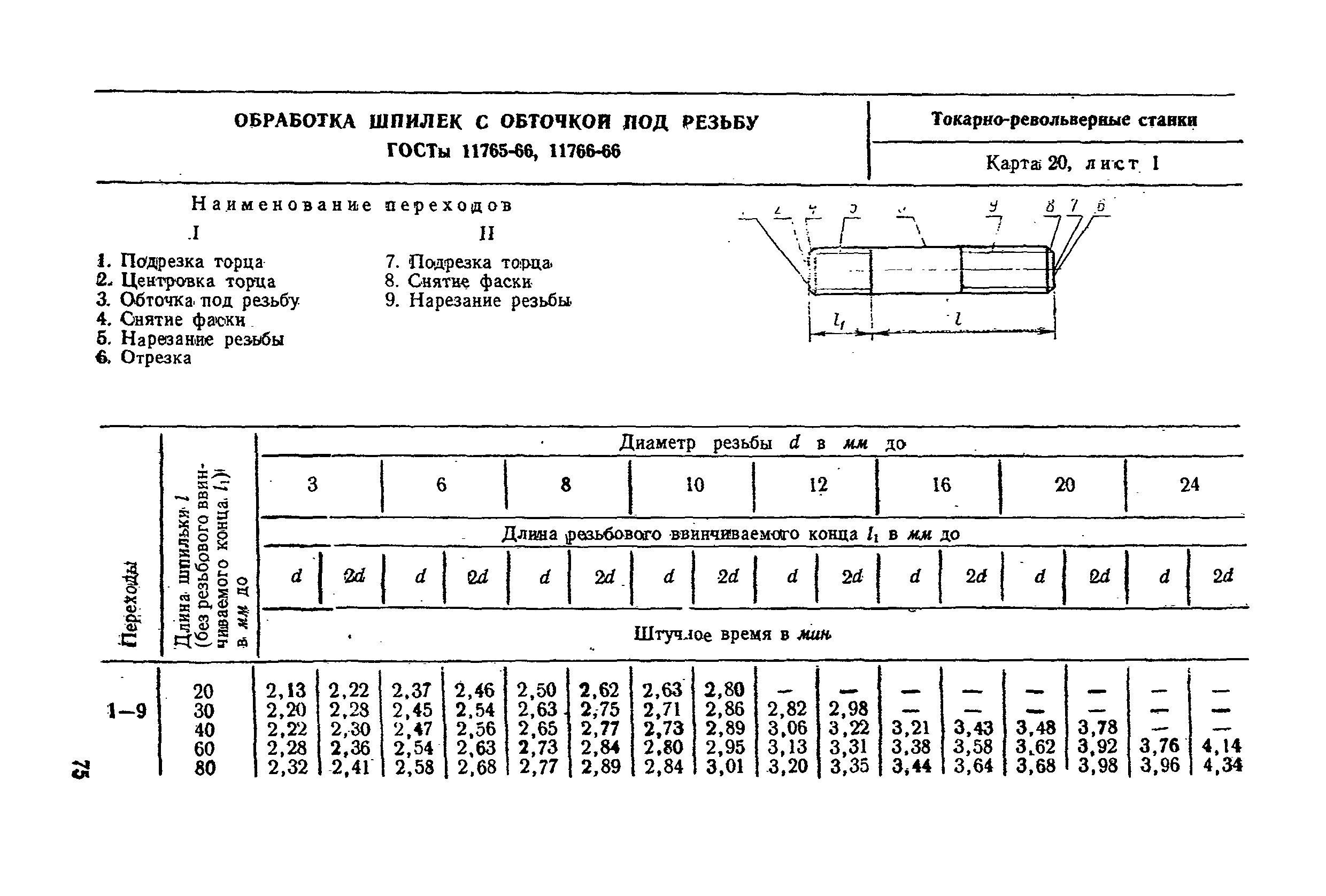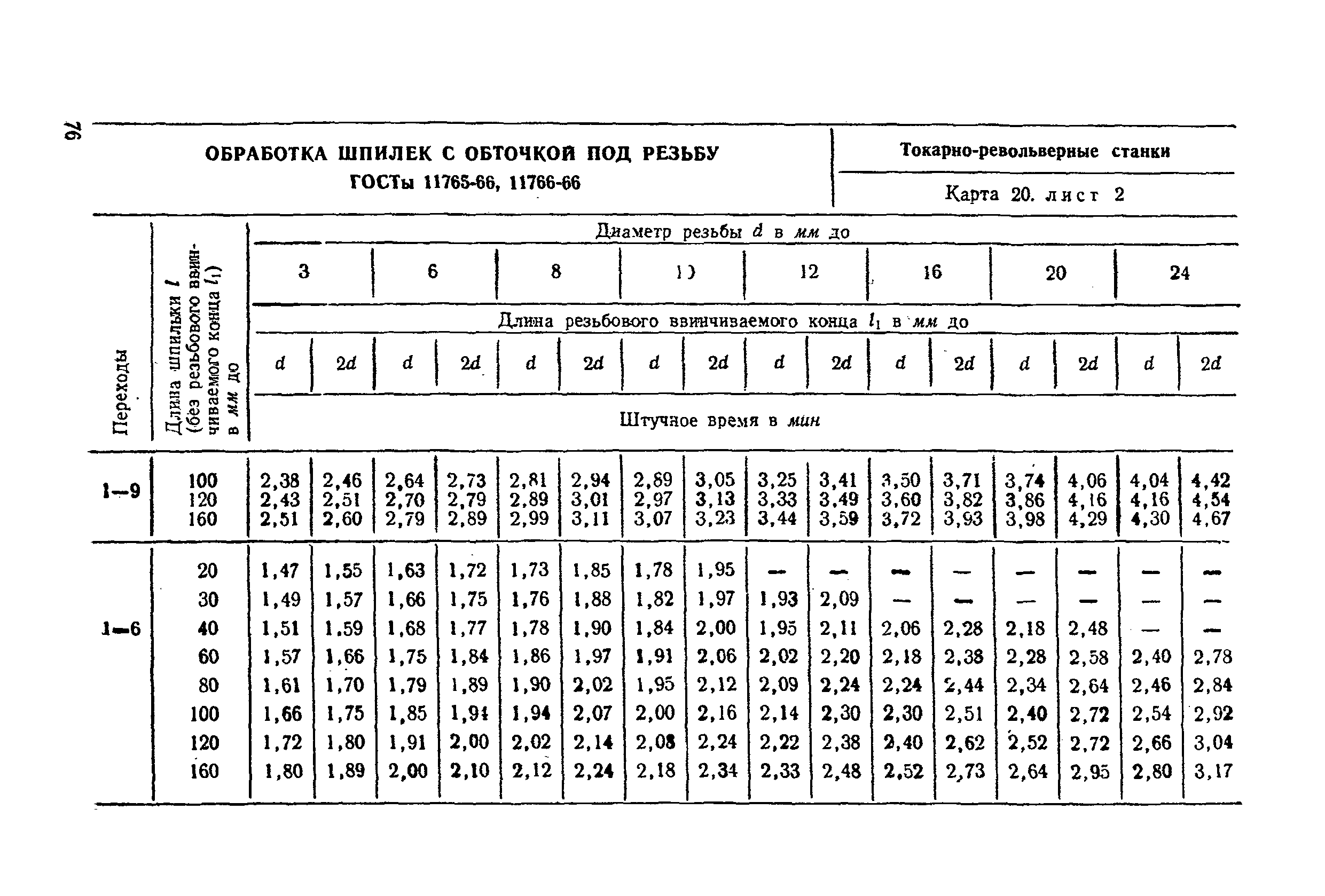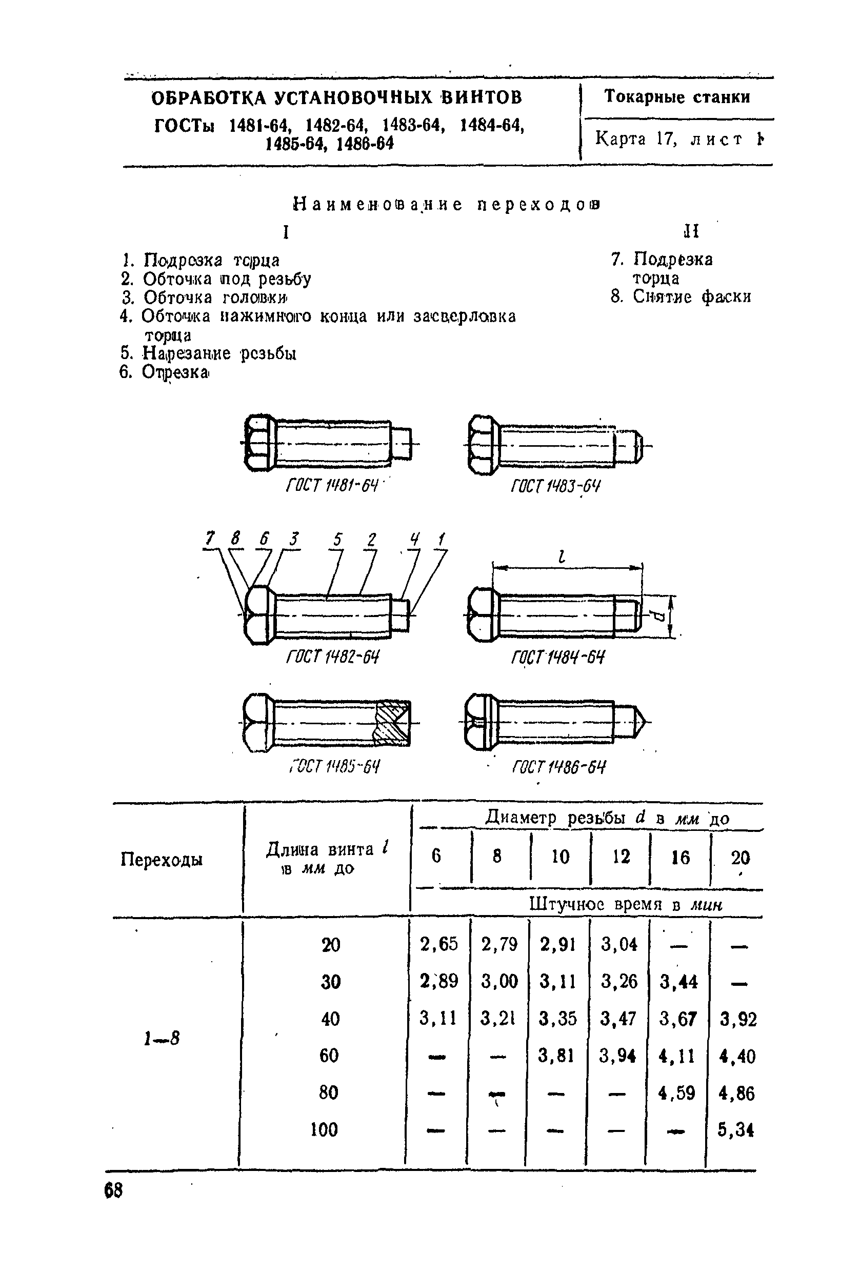| Оглавление: | 1. Общая часть Перечень крепежных деталей, охваченных типовыми нормами времени Примеры расчета нормы времени 1. Типовые нормы времени на обработку крепежных деталей на токарных и токарно-револьверных станках 2. Типовые нормы времени на обработку крепежных деталей на одношпиндельных токарных автоматах 3. Типовые нормы времени на обработку крепежных деталей на фрезерных, сверлильных, шлифовальных и других станках 4. Подготовительно-заключительное время Приложение 1. Режимы резания для сталей (приближенные значения) Приложение 2. Пример заполнения инструкционно-эксплуатационной карты для выбора режимов резания |