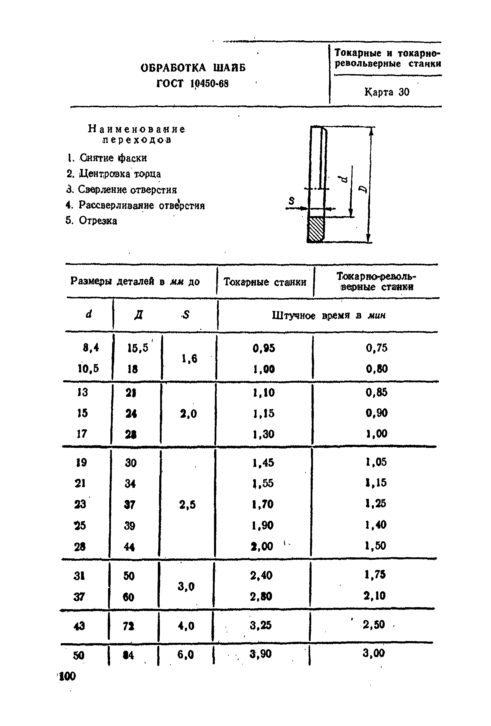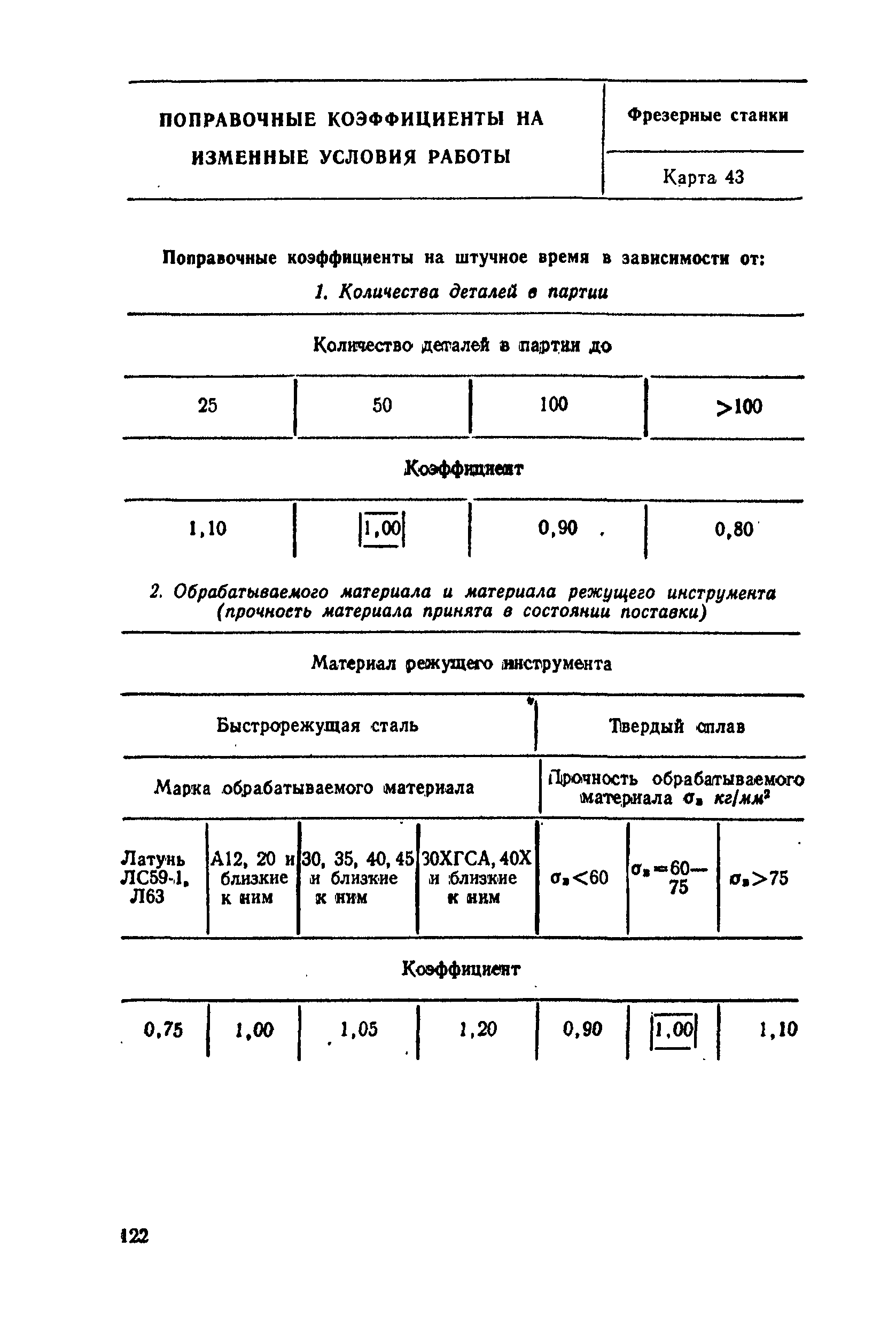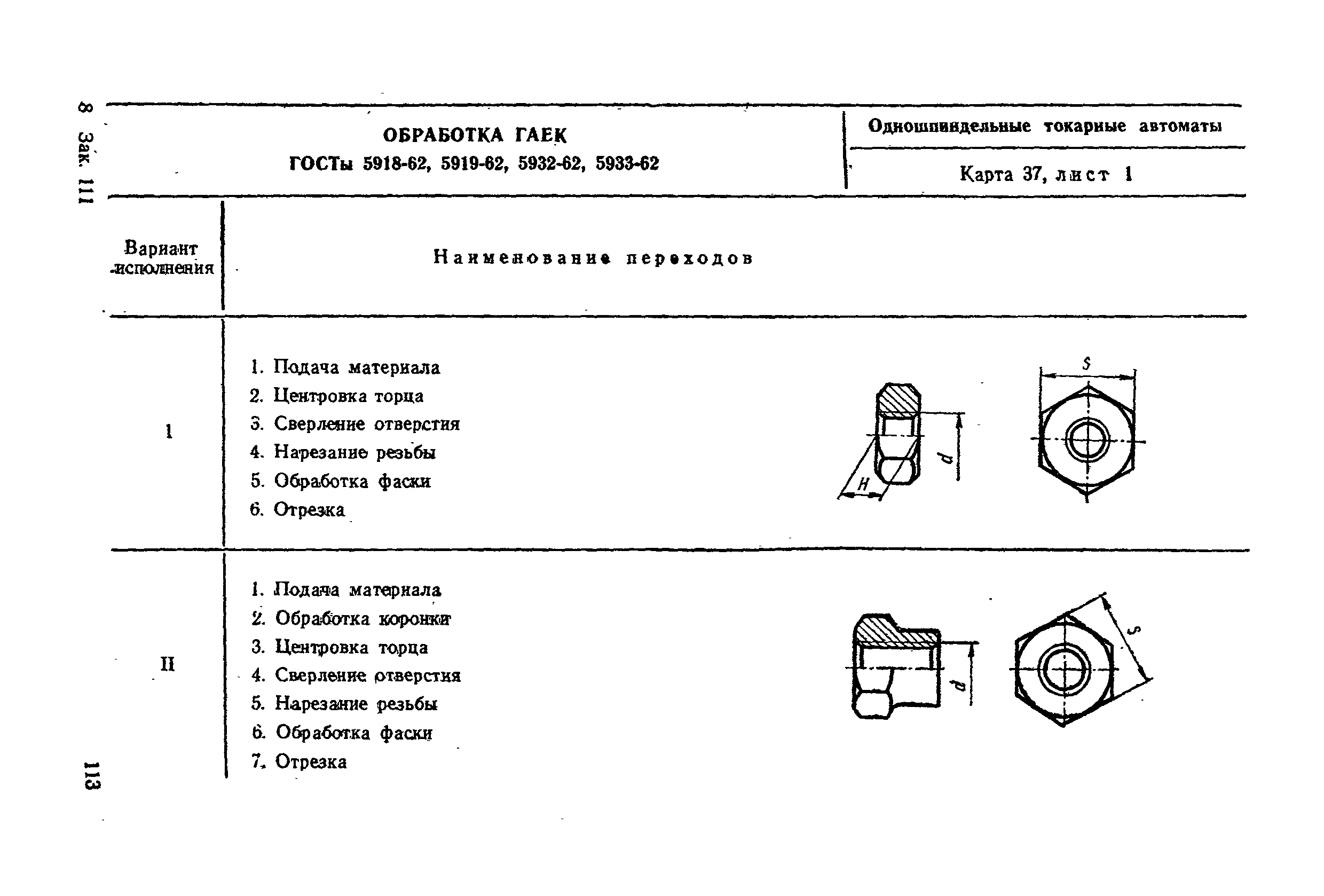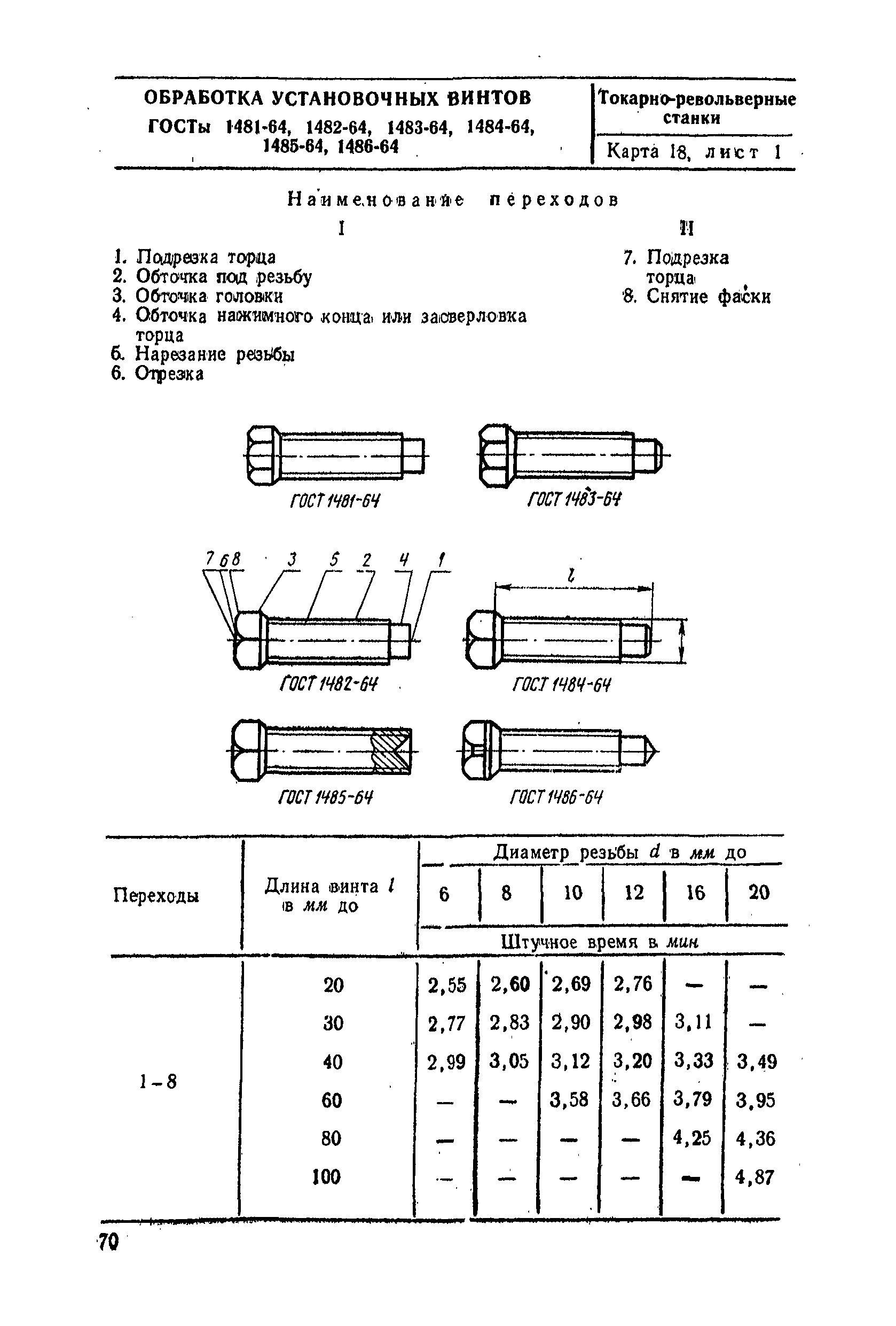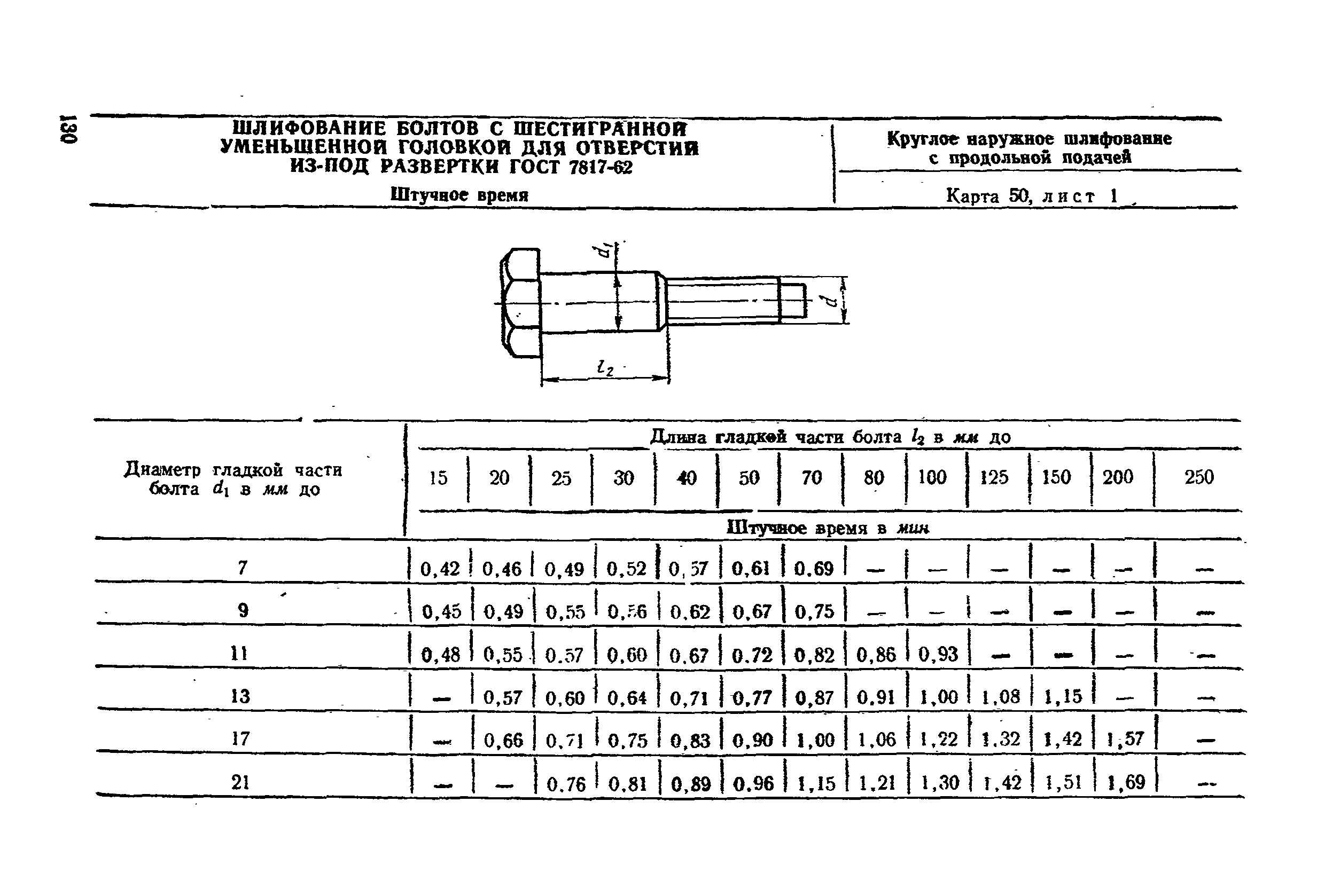| Оглавление: | 1. Общая часть Перечень крепежных деталей, охваченных типовыми нормами времени Примеры расчета нормы времени 1. Типовые нормы времени на обработку крепежных деталей на токарных и токарно-револьверных станках 2. Типовые нормы времени на обработку крепежных деталей на одношпиндельных токарных автоматах 3. Типовые нормы времени на обработку крепежных деталей на фрезерных, сверлильных, шлифовальных и других станках 4. Подготовительно-заключительное время Приложение 1. Режимы резания для сталей (приближенные значения) Приложение 2. Пример заполнения инструкционно-эксплуатационной карты для выбора режимов резания |