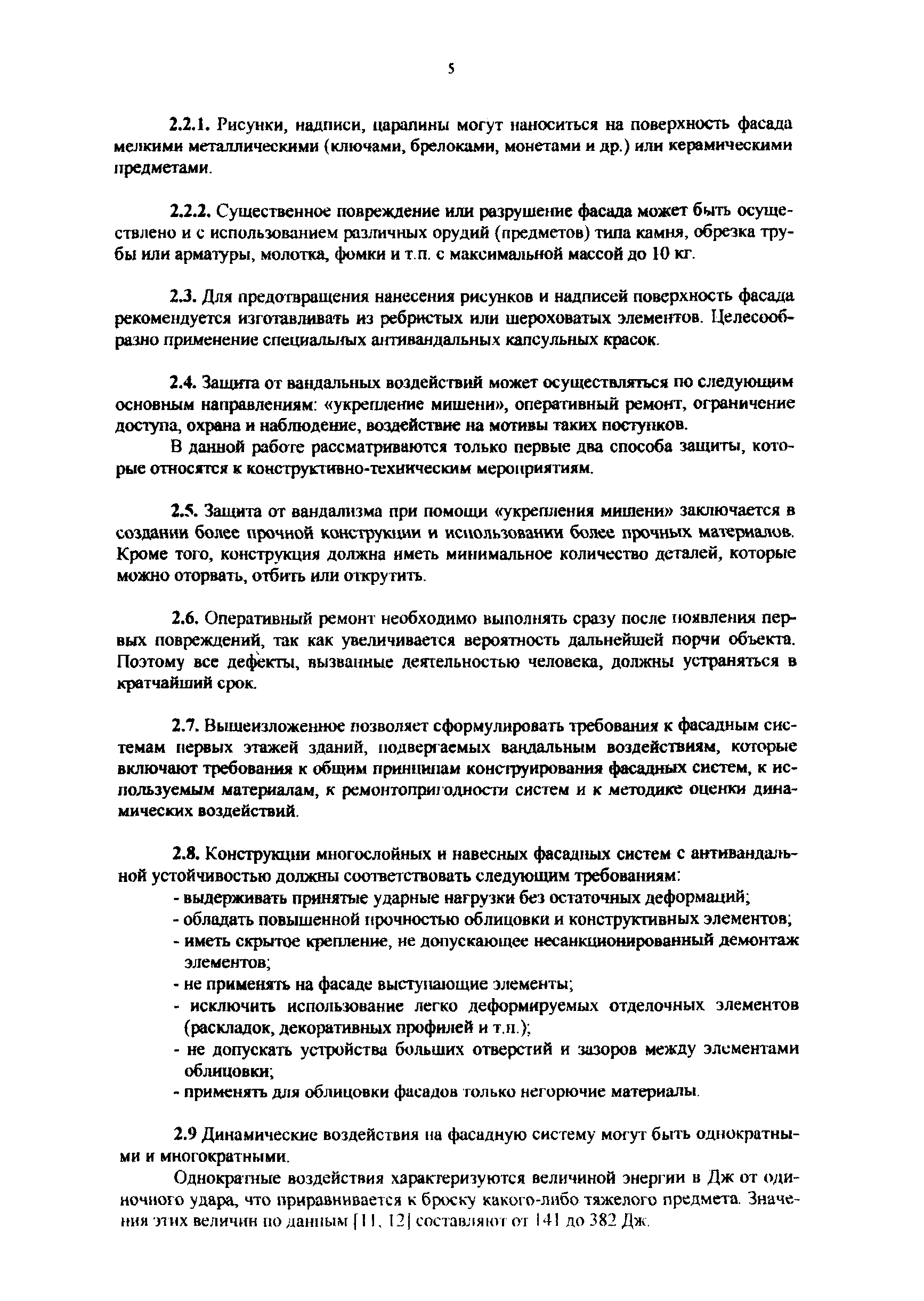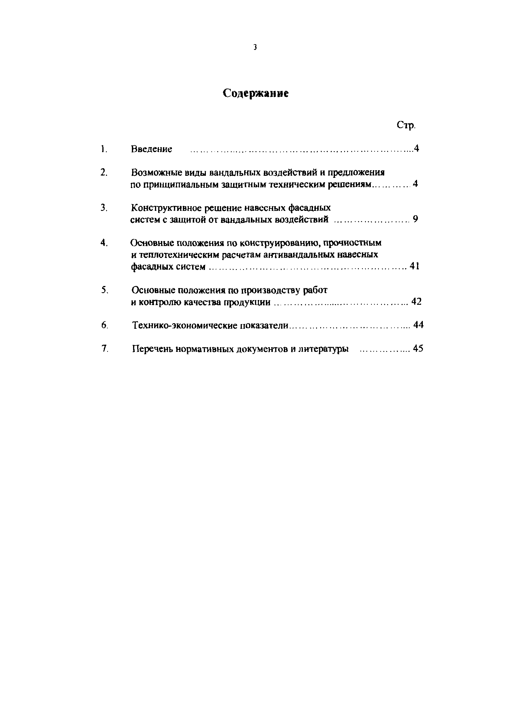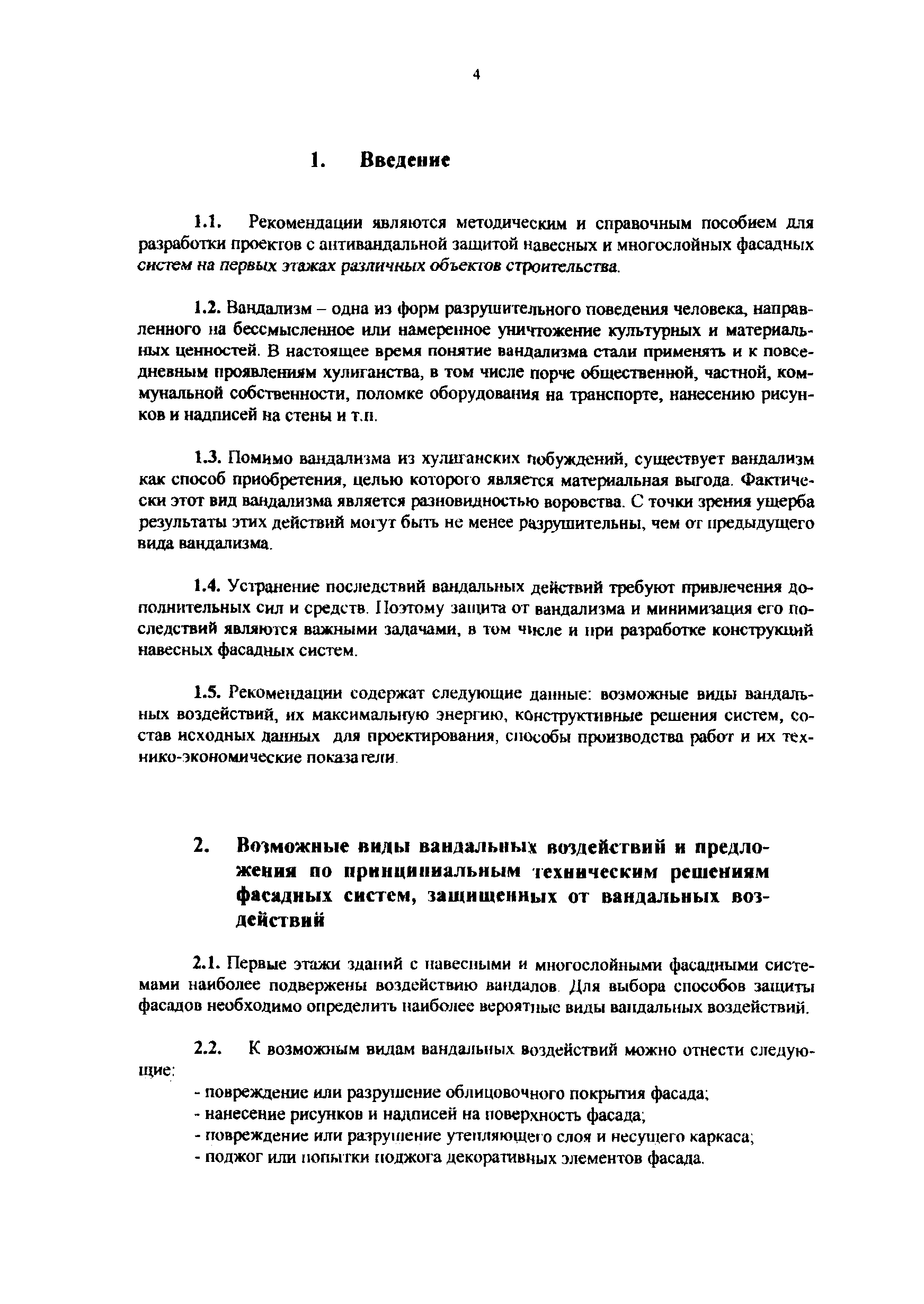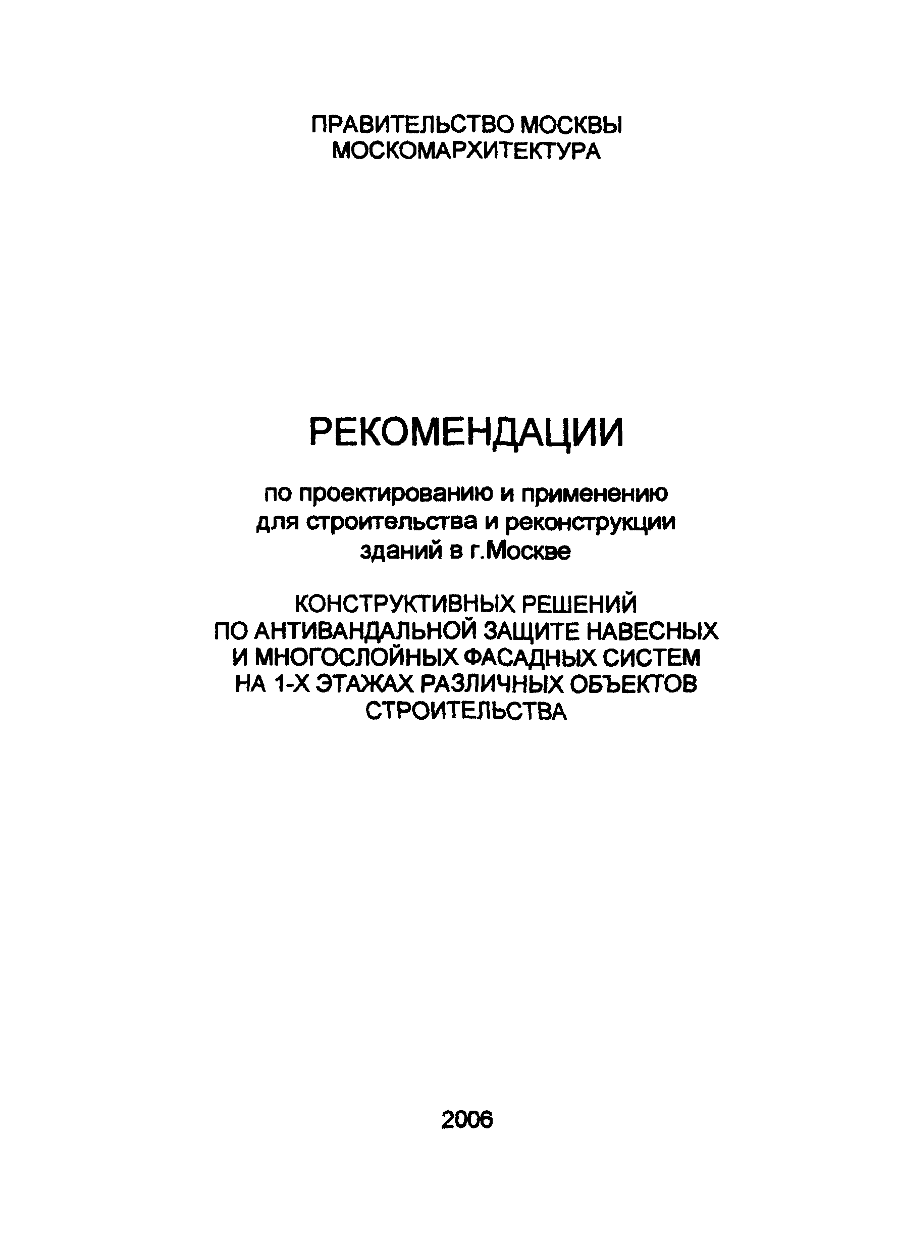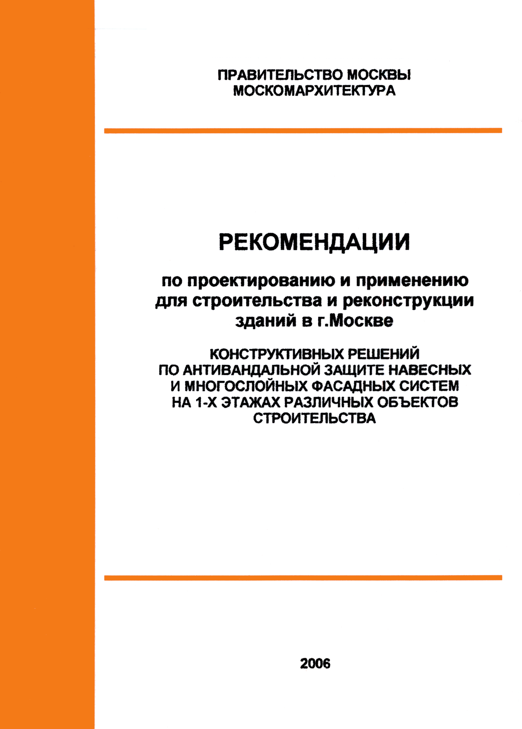 | Оглавление: | 1. Введение 2. Возможные виды вандальных воздействий и предложения по принципиальным защитным техническим решениям 3. Конструктивное решение навесных фасадных систем с защитой от вандальных воздействий 4. Основные положения по конструированию, прочностным и теплотехническим расчетам антивандальных навесных фасадных систем 5. Основные положения по производству работ и контролю качества продукции 6. Технико-экономические показатели 7. Перечень нормативных документов и литературы |