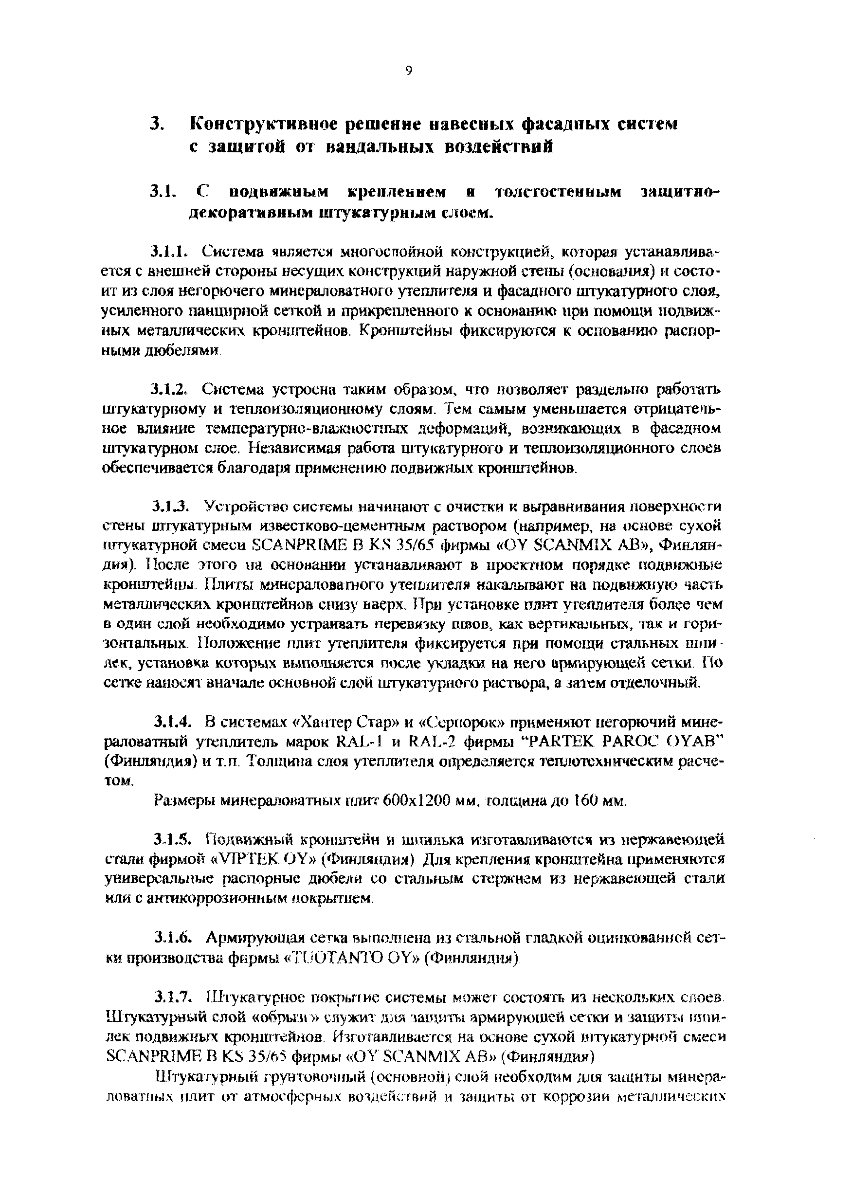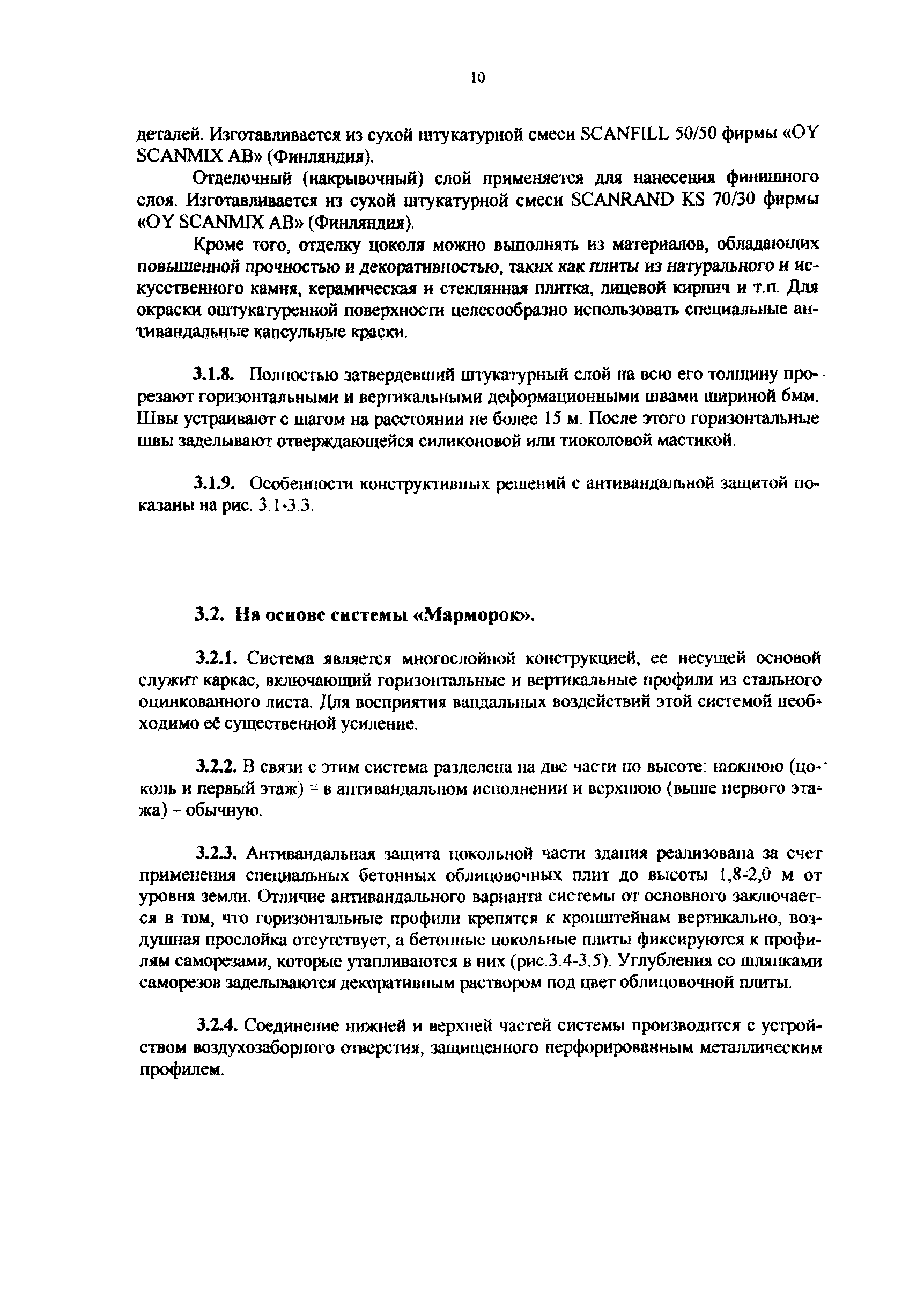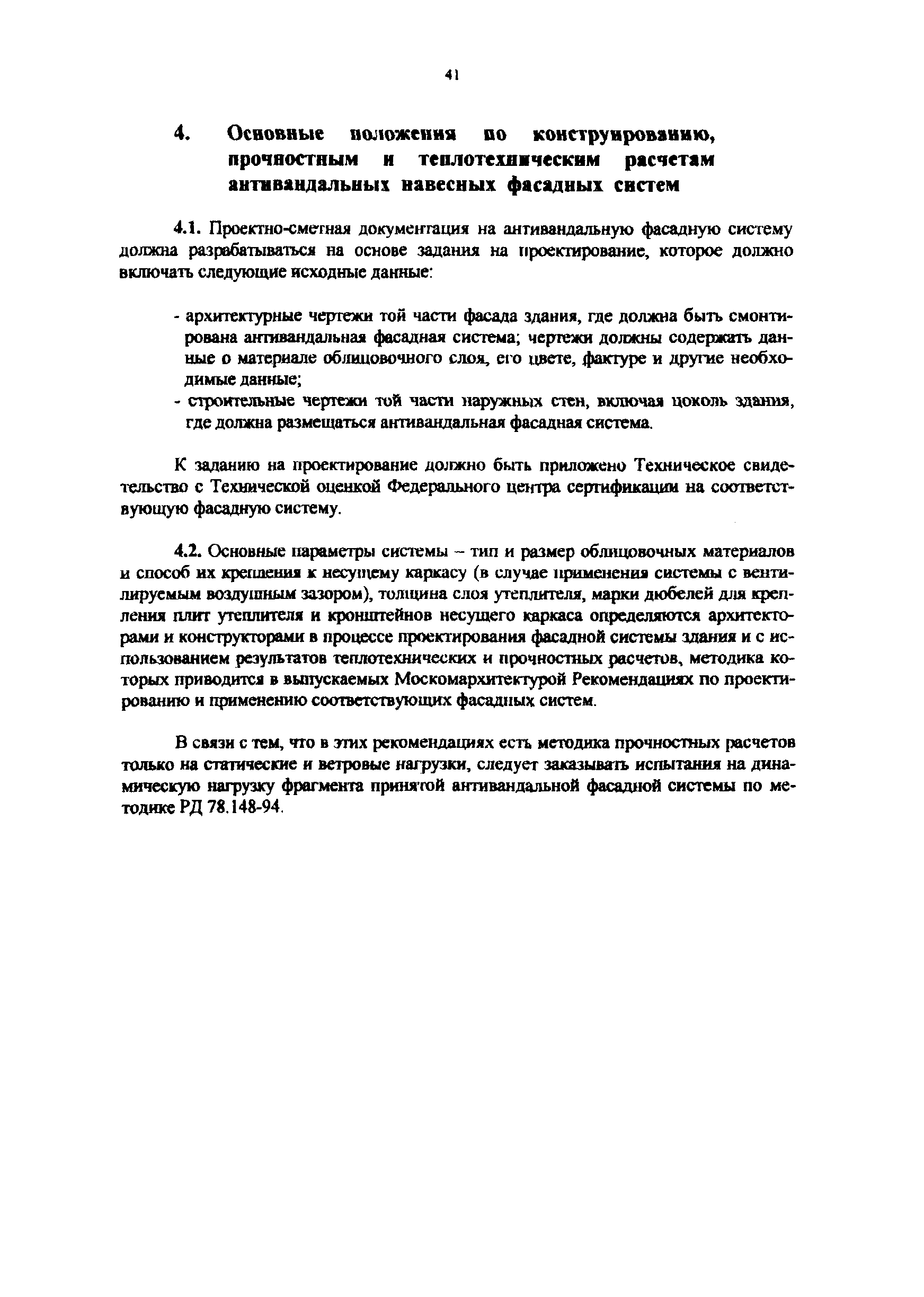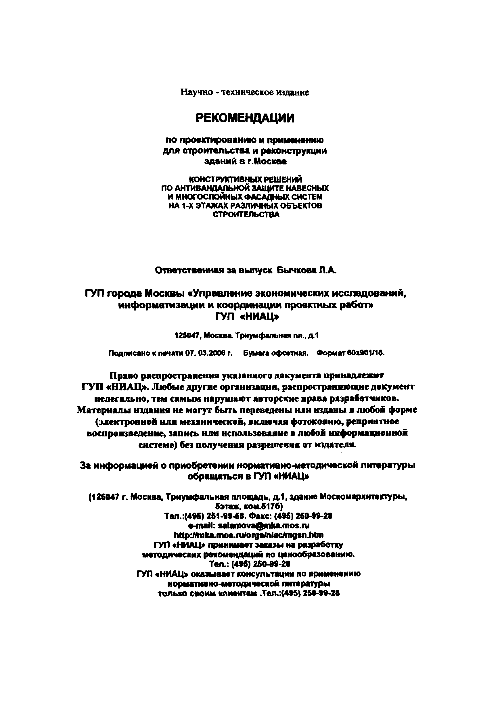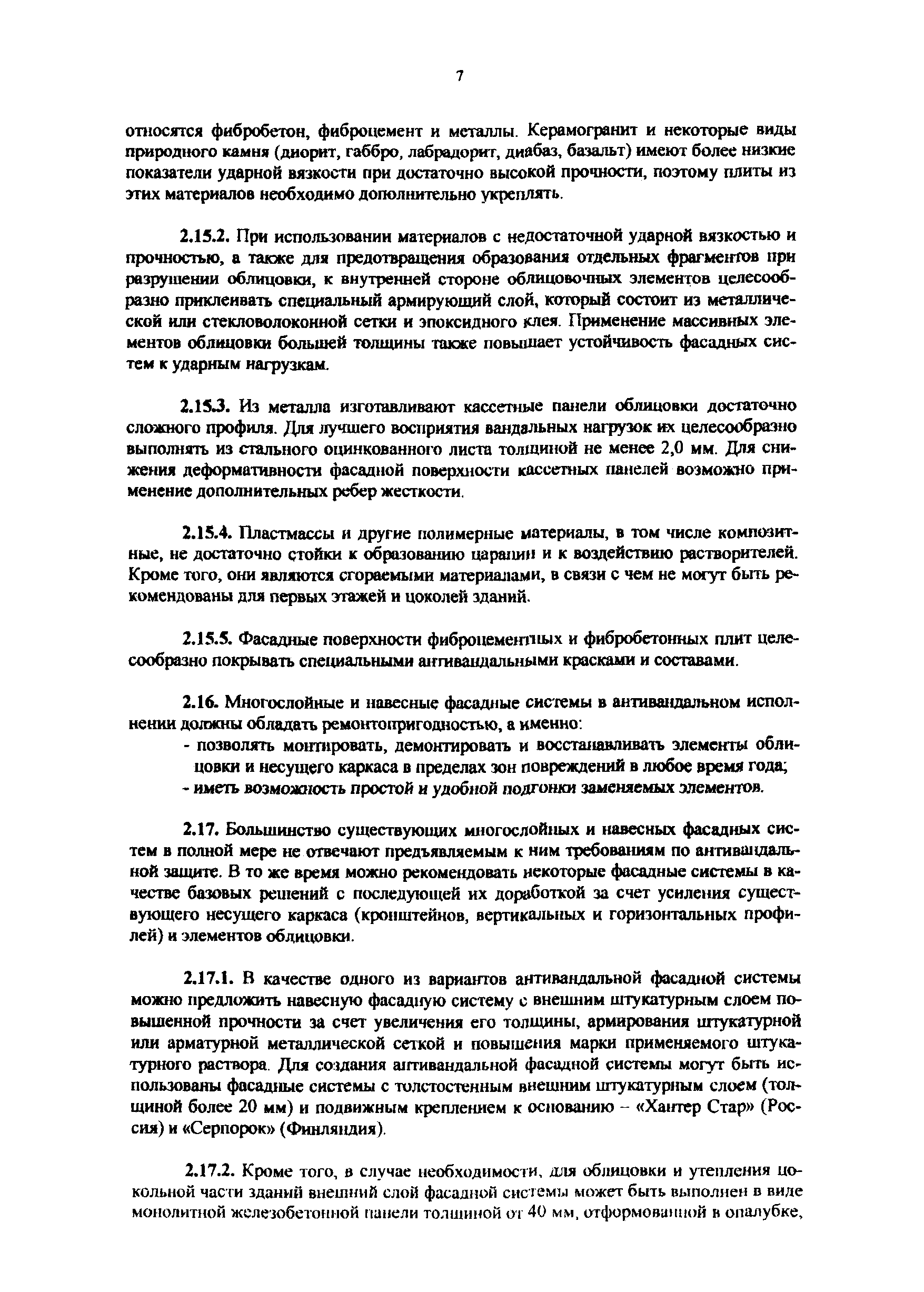 | Оглавление: | 1. Введение 2. Возможные виды вандальных воздействий и предложения по принципиальным защитным техническим решениям 3. Конструктивное решение навесных фасадных систем с защитой от вандальных воздействий 4. Основные положения по конструированию, прочностным и теплотехническим расчетам антивандальных навесных фасадных систем 5. Основные положения по производству работ и контролю качества продукции 6. Технико-экономические показатели 7. Перечень нормативных документов и литературы |
