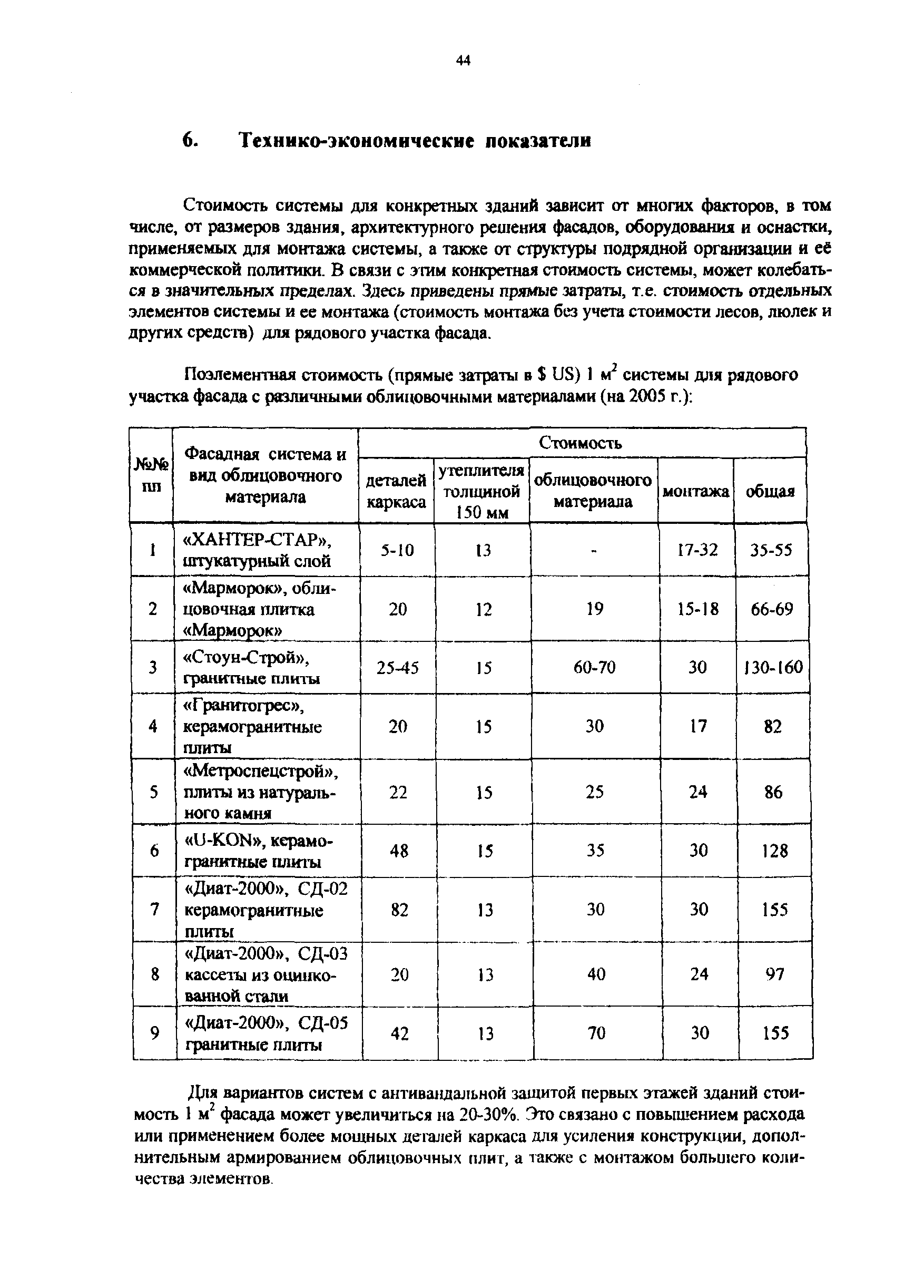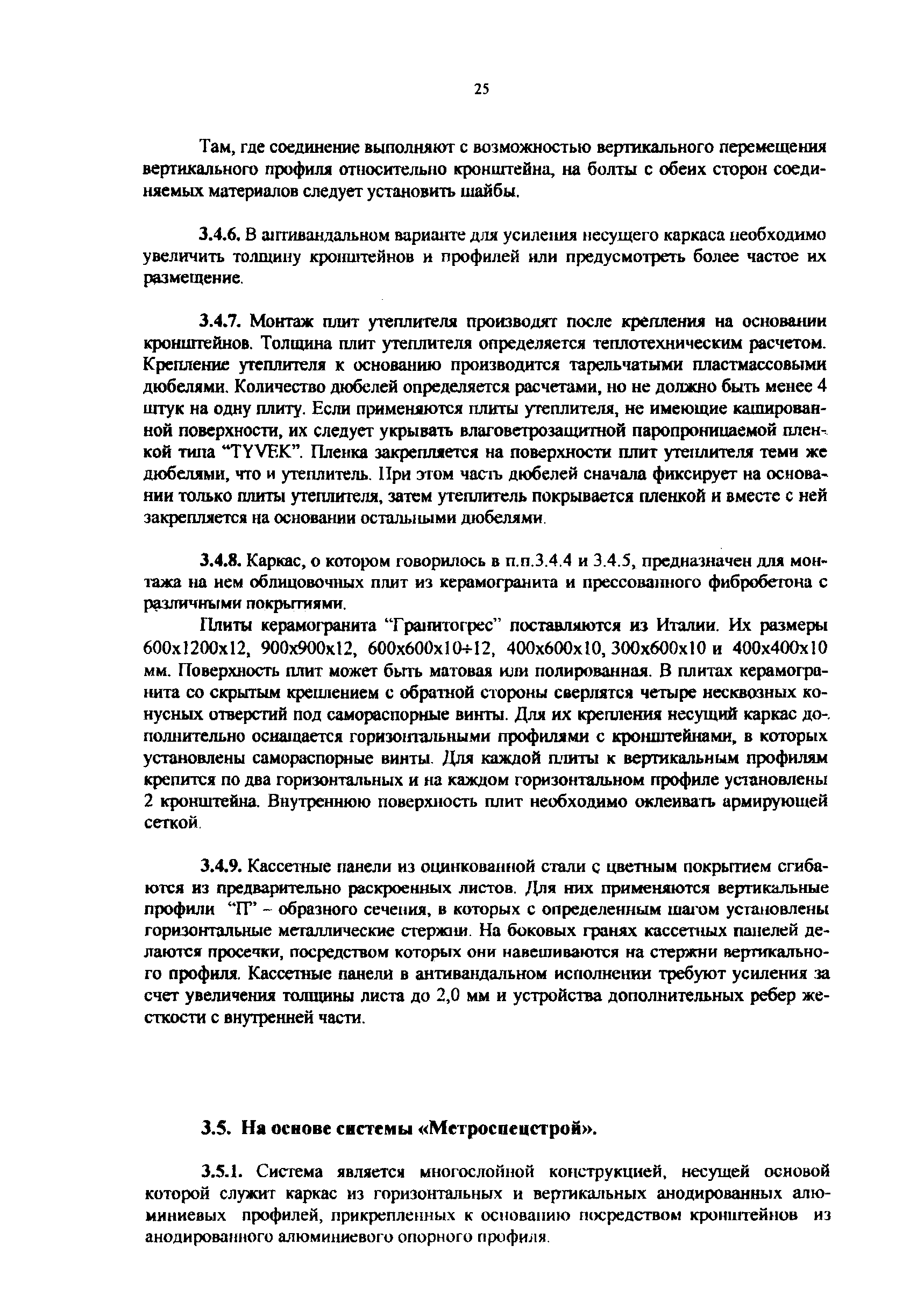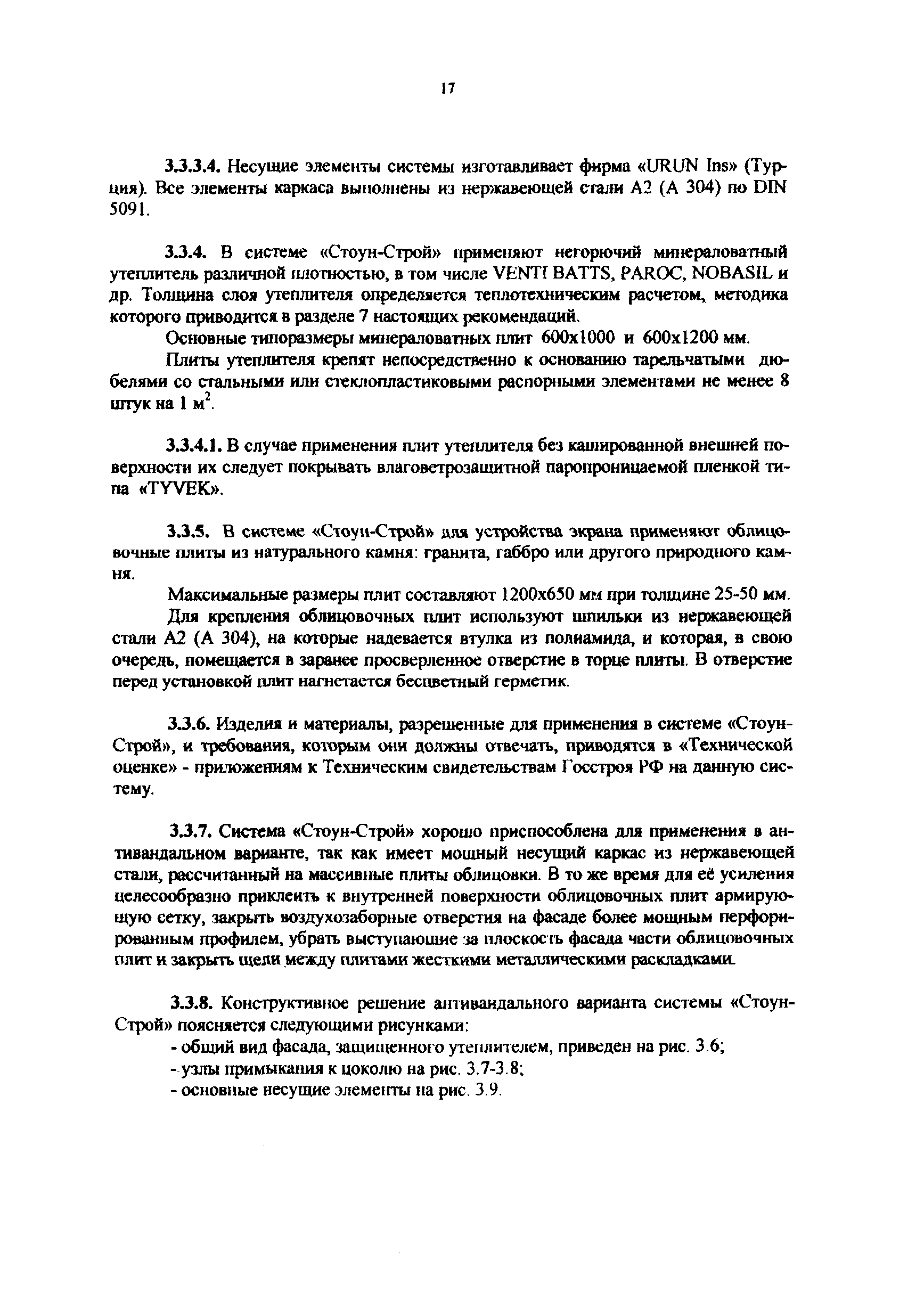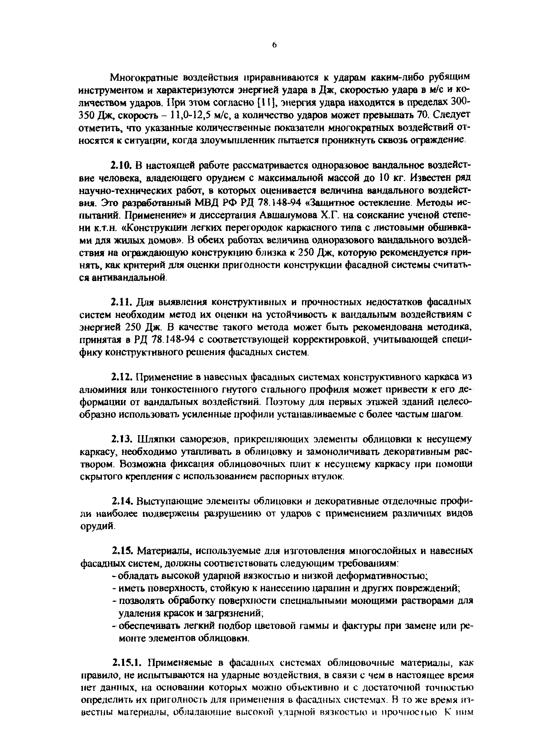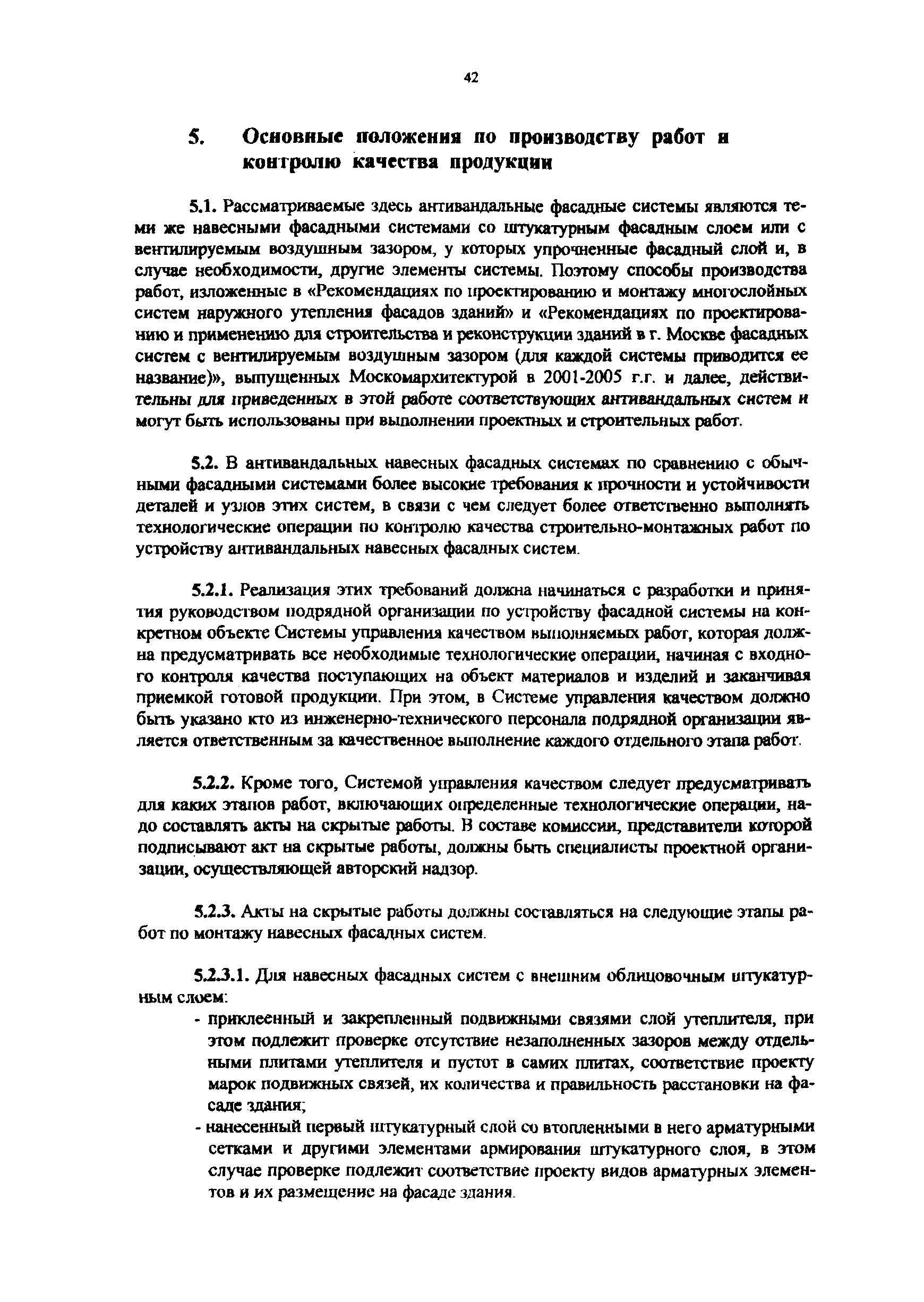 | Оглавление: | 1. Введение 2. Возможные виды вандальных воздействий и предложения по принципиальным защитным техническим решениям 3. Конструктивное решение навесных фасадных систем с защитой от вандальных воздействий 4. Основные положения по конструированию, прочностным и теплотехническим расчетам антивандальных навесных фасадных систем 5. Основные положения по производству работ и контролю качества продукции 6. Технико-экономические показатели 7. Перечень нормативных документов и литературы |
