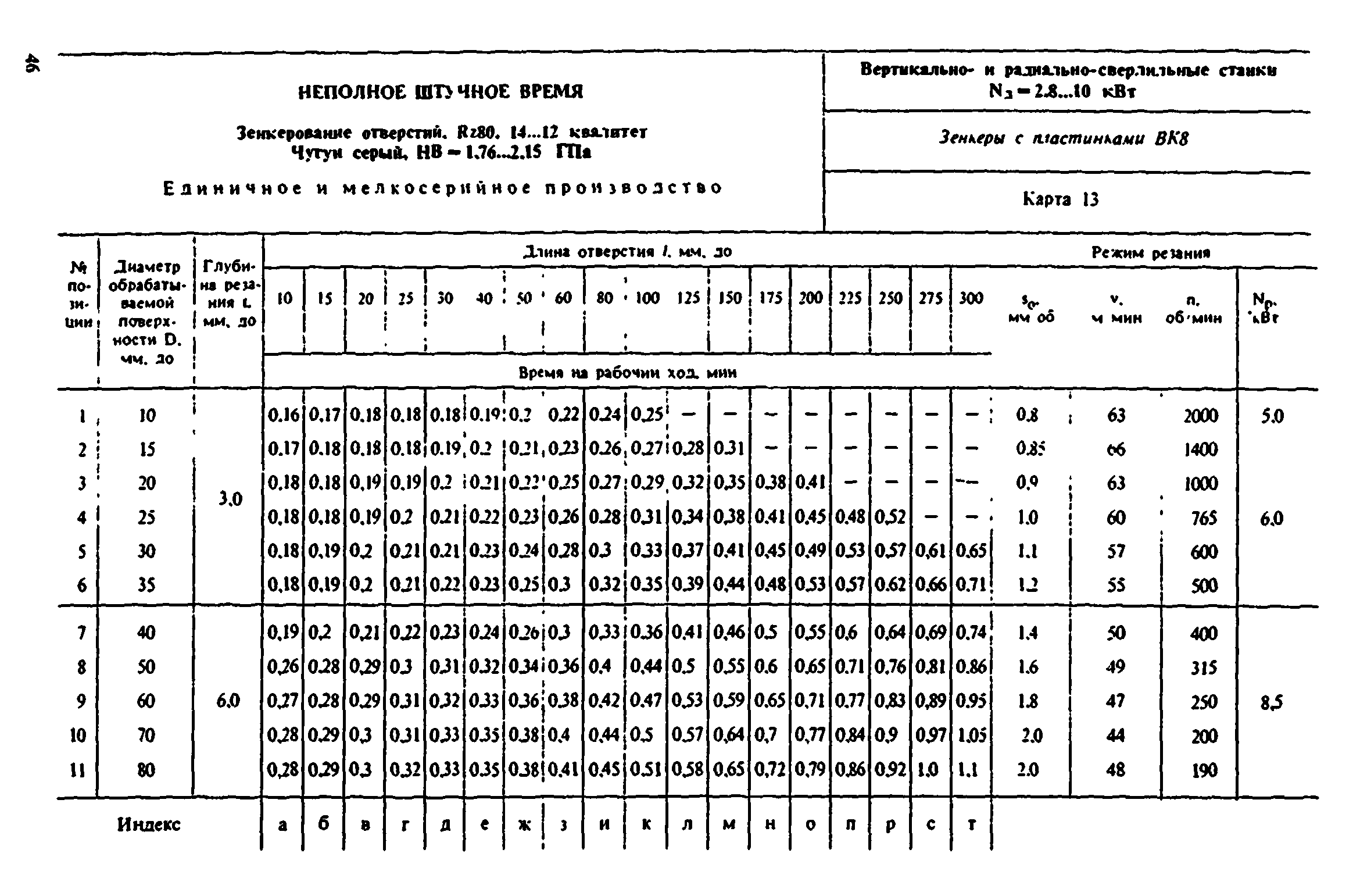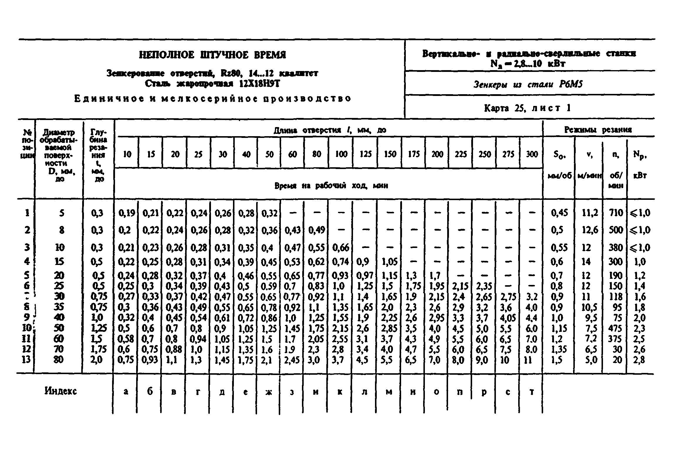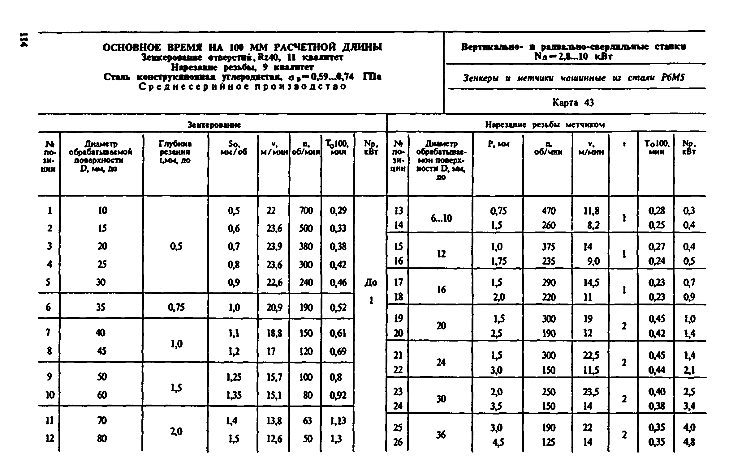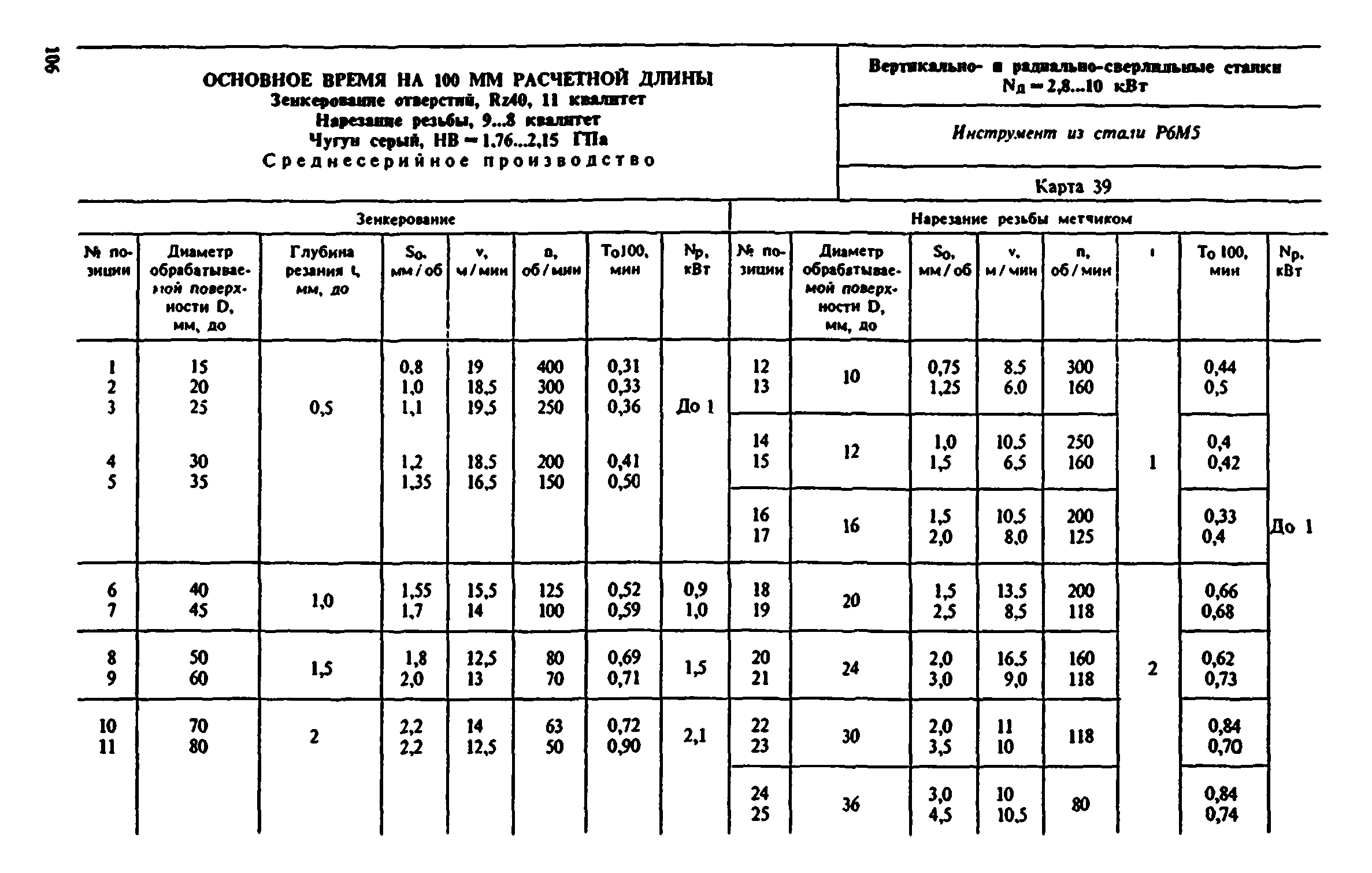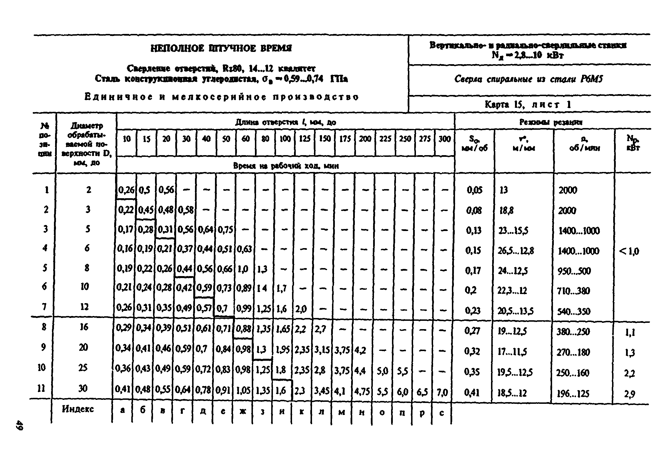 Общемашиностроительные укрупненные нормативы времени на работы, выполняемые на металлорежущих станках. Единичное, мелкосерийное и среднесерийное производство. Часть III. Сверлильные станки| Статус: | действует | | Название рус.: | Общемашиностроительные укрупненные нормативы времени на работы, выполняемые на металлорежущих станках. Единичное, мелкосерийное и среднесерийное производство. Часть III. Сверлильные станки | | Дата добавления в базу: | 01.09.2013 | | Дата актуализации: | 01.01.2021 | | Область применения: | Сборник содержит нормативы подготовительно-заключительного времени, времени на установку и снятие детали, укрупненные нормативы неполного штучного времени на рабочий ход для условий единичного и мелкосерийного производства и нормативы времени на обработку единицы длины поверхности для участков со среднесерийным типом производства на работы, выполняемые на вертикально- и радиально-сверлильных станках. | | Оглавление: | 1. Общая часть 2. Характеристика применяемого оборудования и технология работы 3. Организация труда 4. Нормативная часть Карты Приложения | | Разработан: | ЦПКТБ Системпроект