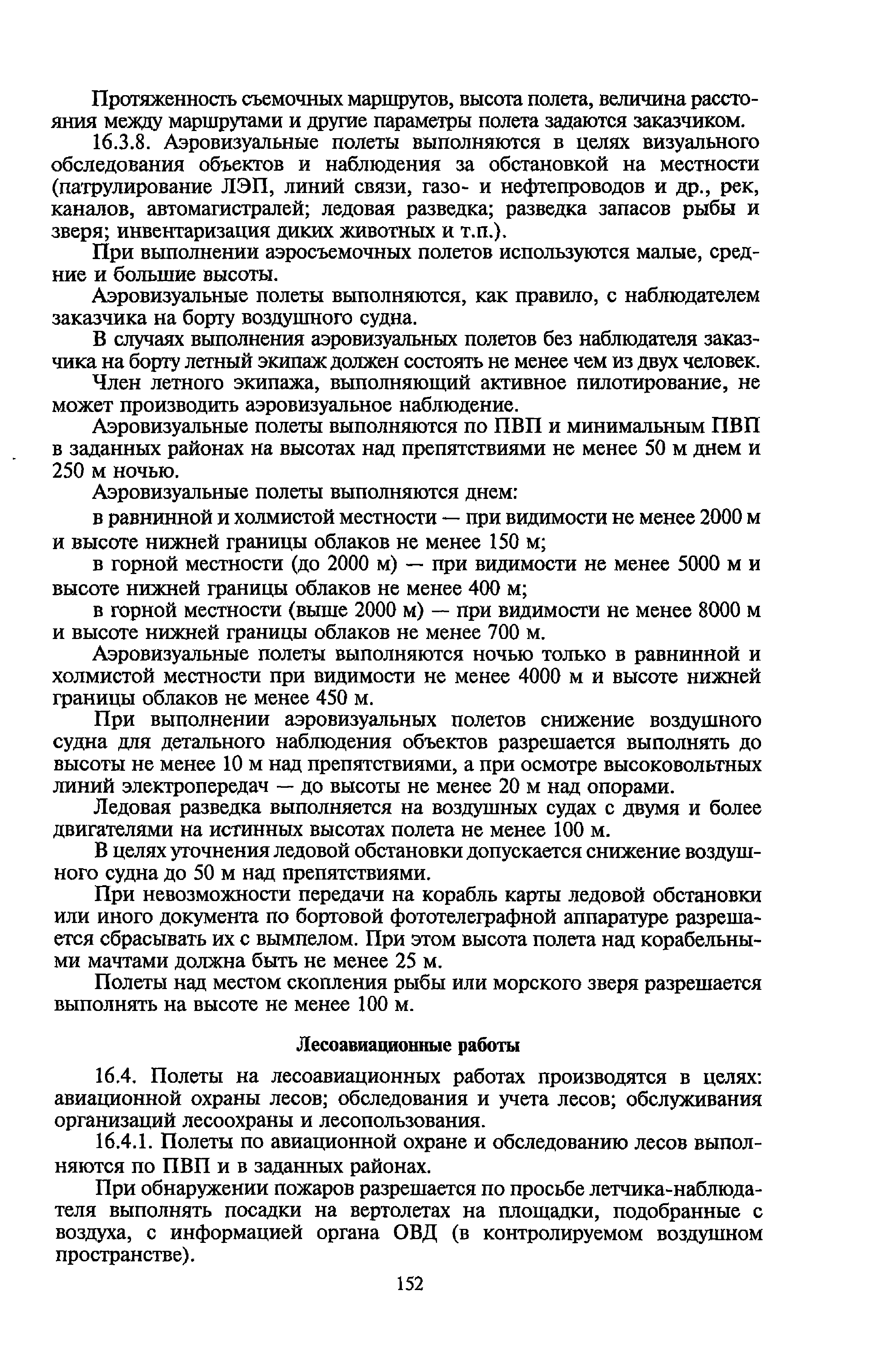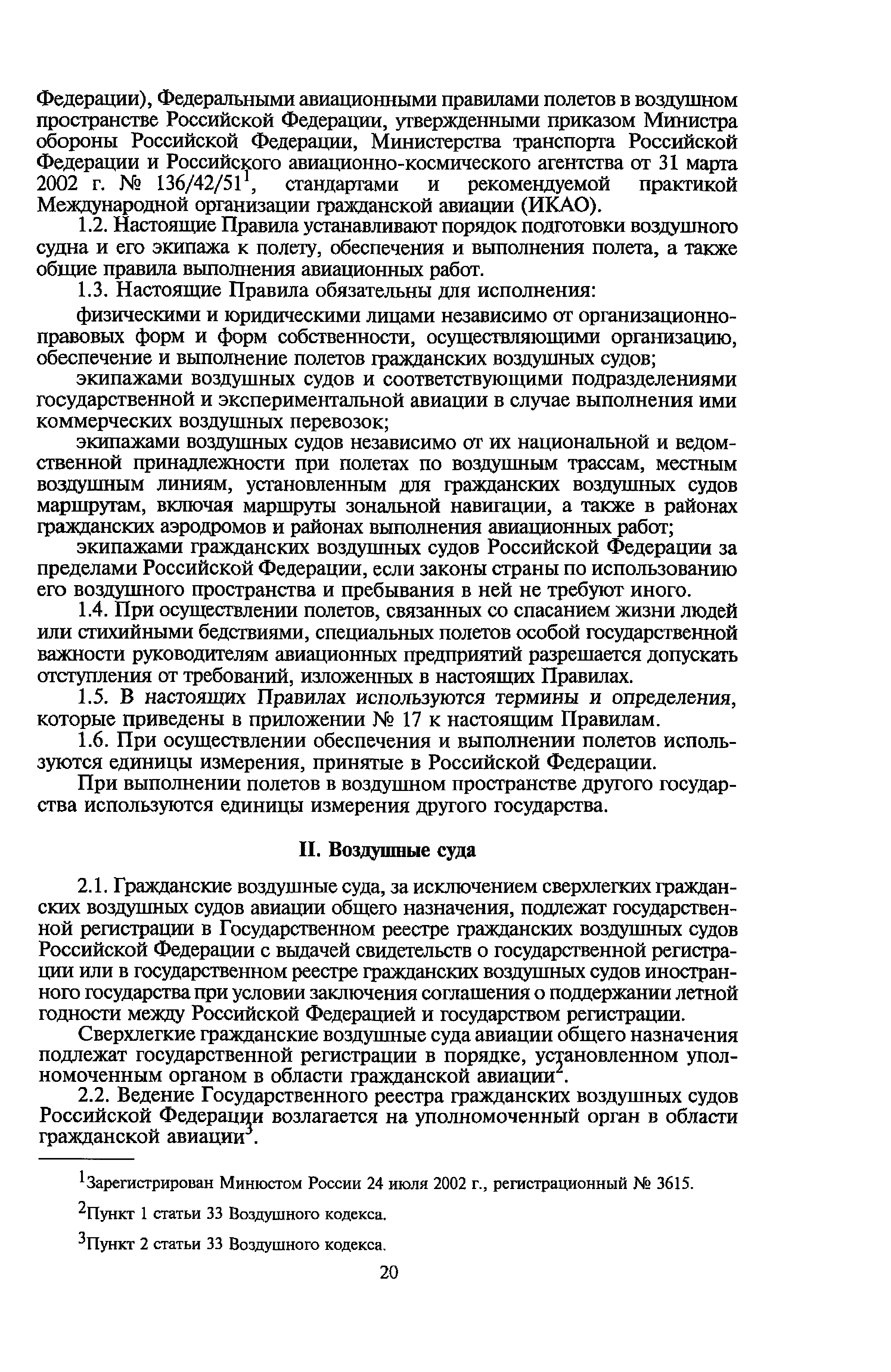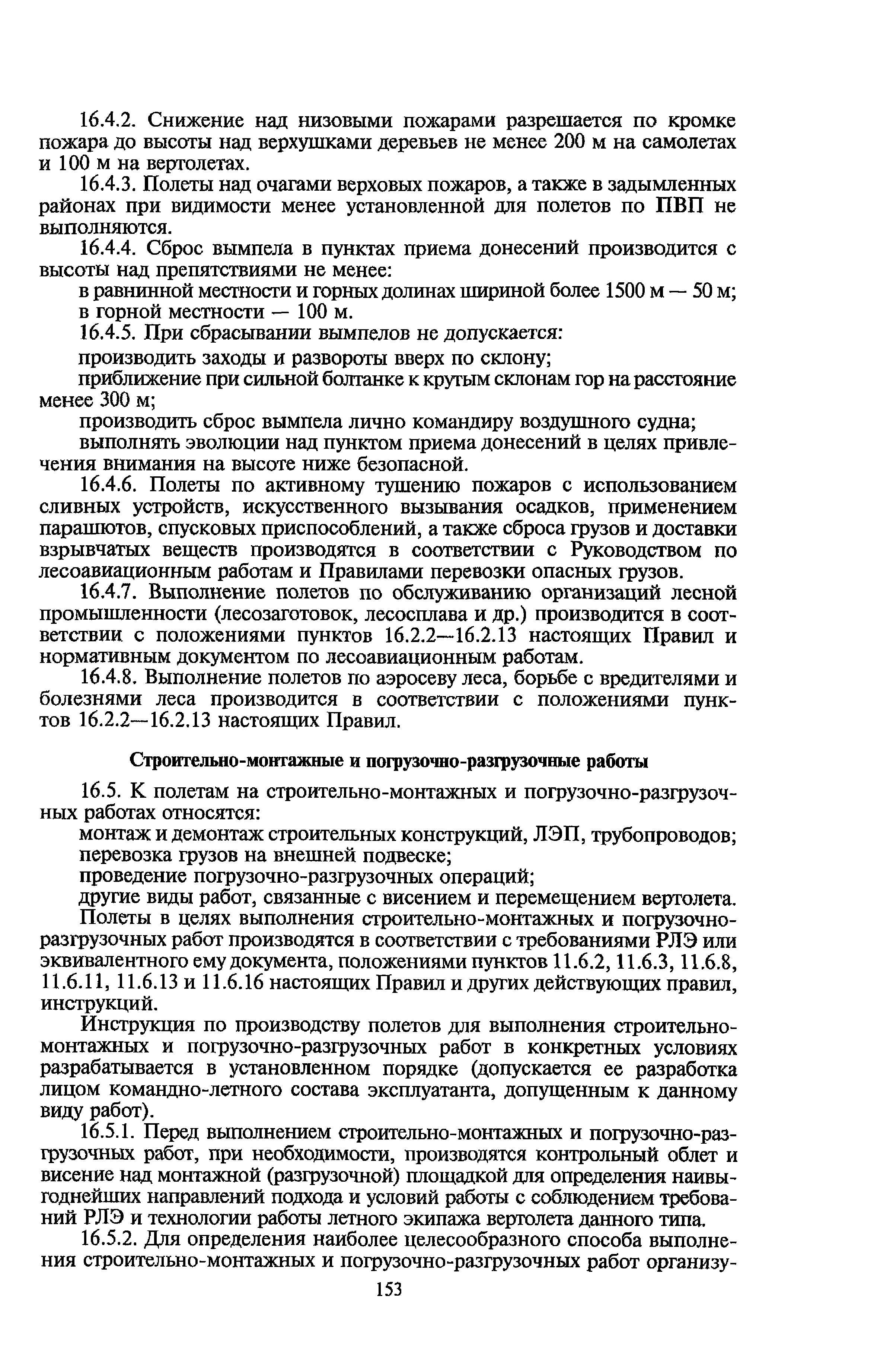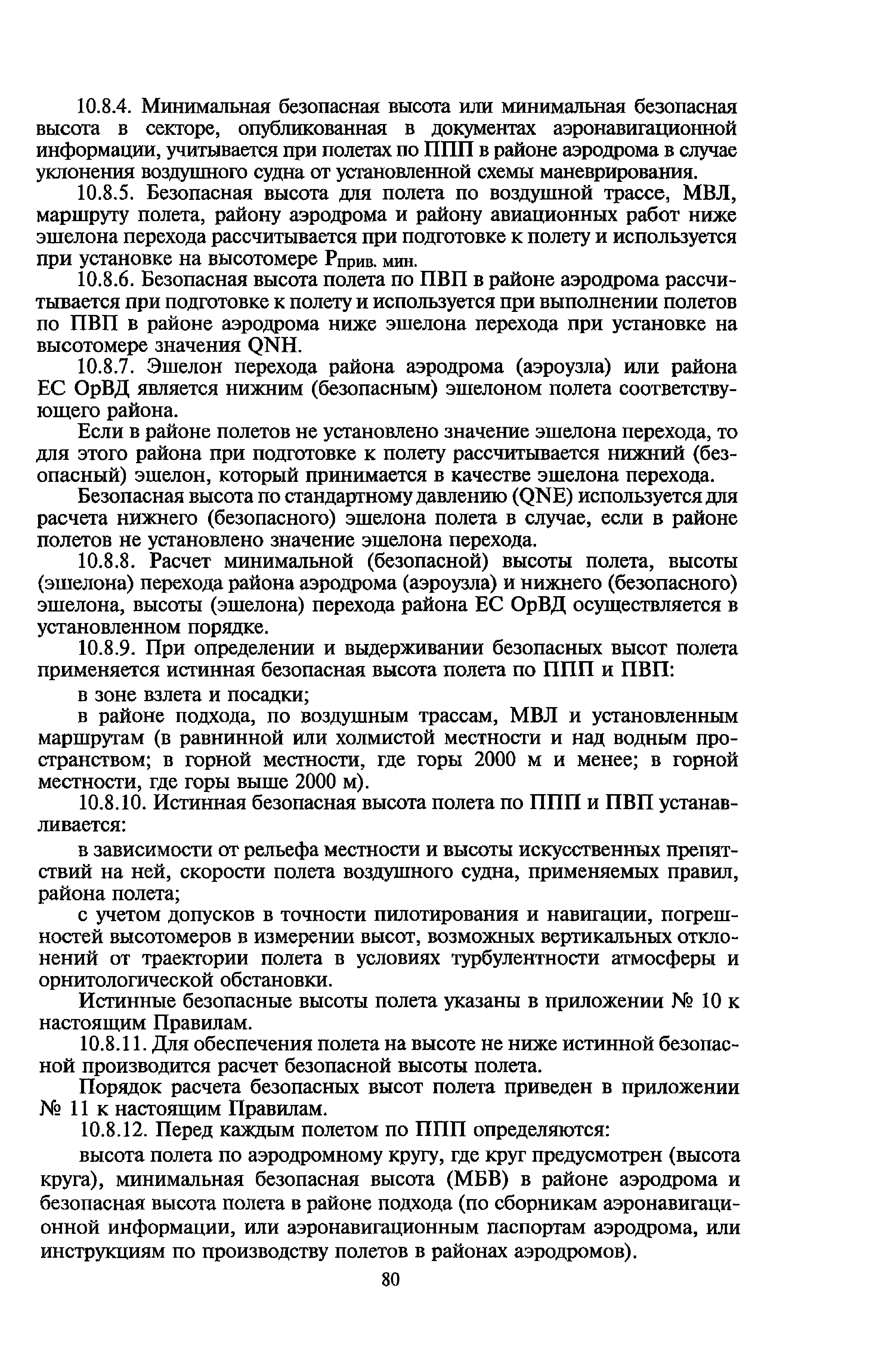 | Область применения: | Правила устанавливают порядок подготовки воздушного судна и его экипажа к полету, обеспечения и выполнения полета, а также общие правила выполнения авиационных работ. Правила обязательны для исполнения: физическими и юридическими лицами независимо от организационно-правовых форм и форм собственности, осуществляющими организацию, обеспечение и выполнение полетов гражданских воздушных судов; экипажами воздушных судов и соответствующими подразделениями государственной и экспериментальной авиации в случае выполнения ими коммерческих воздушных перевозок; экипажами воздушных судов независимо от их национальной и ведомственной принадлежности при полетах по воздушным трассам, местным воздушным линиям, установленным для гражданских воздушных судов маршрутам, включая маршруты зональной навигации, а также в районах гражданских аэродромов и районах выполнения авиационных работ; экипажами гражданских воздушных судов Российской Федерации за пределами Российской Федерации, если законы страны по использованию его воздушного пространства и пребывания в ней не требуют иного. При осуществлении полетов, связанных со спасанием жизни людей или стихийными бедствиями, специальных полетов особой государственной важности руководителям авиационных предприятий разрешается допускать отступления от требований, изложенных в настоящих Правилах. |