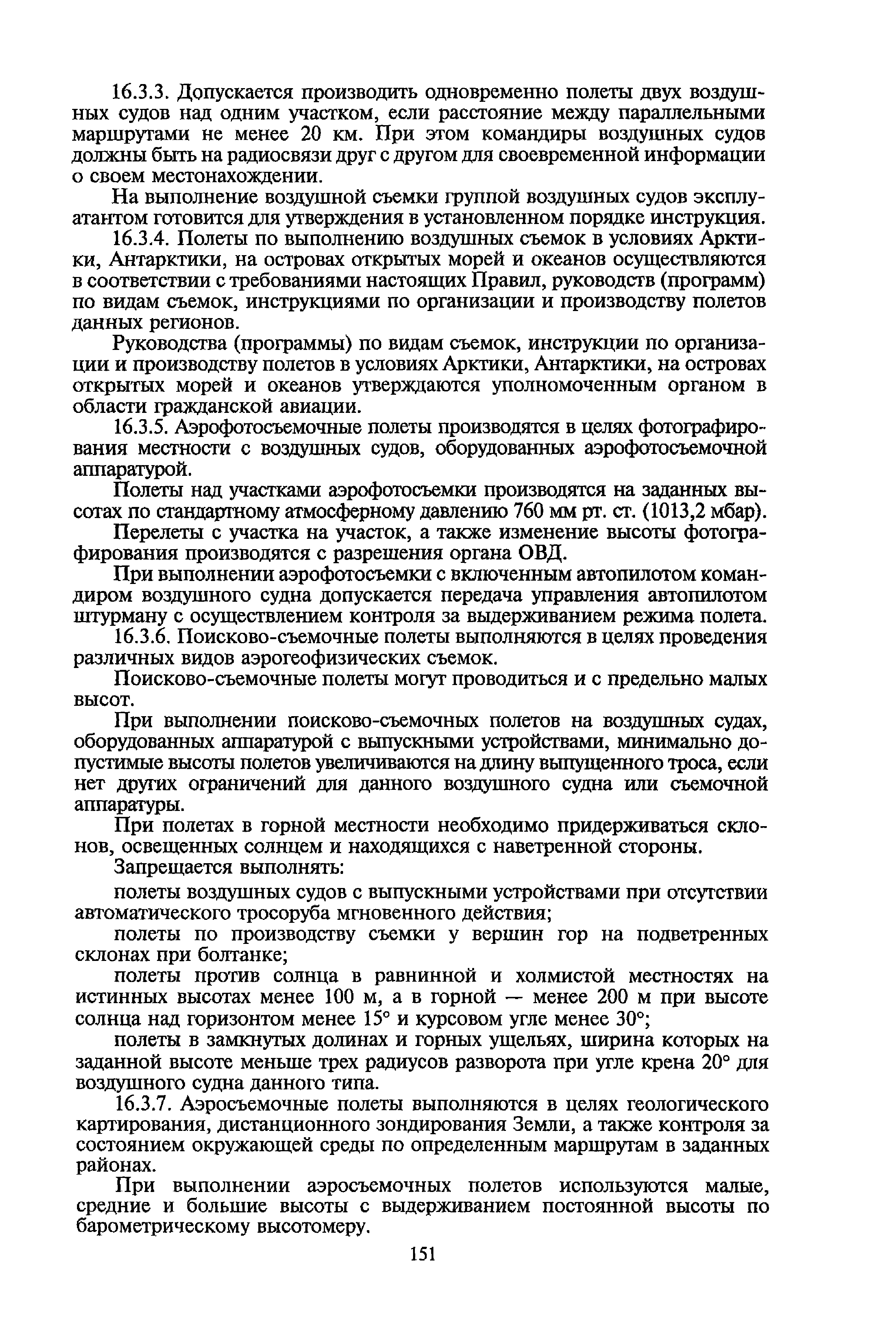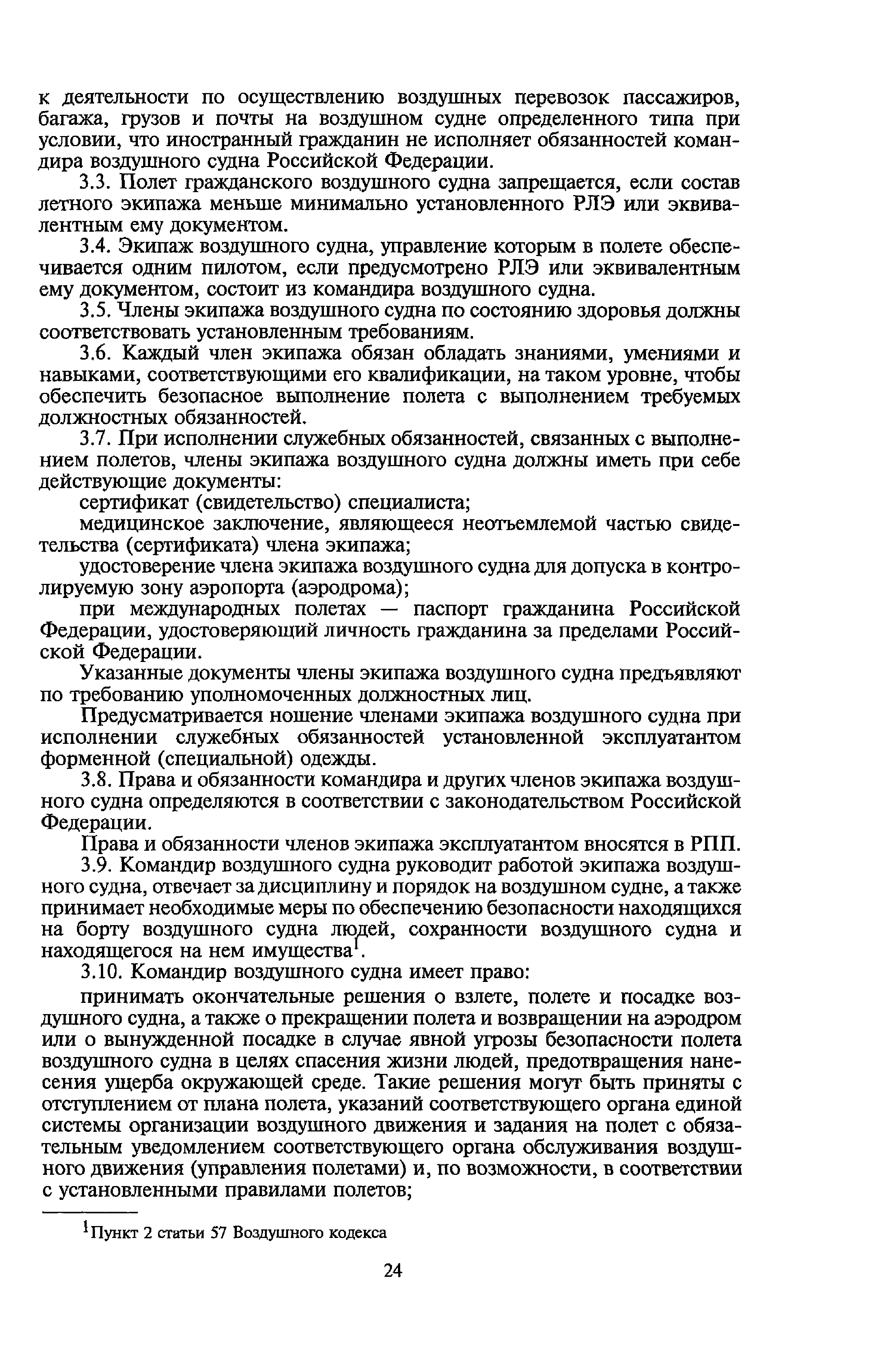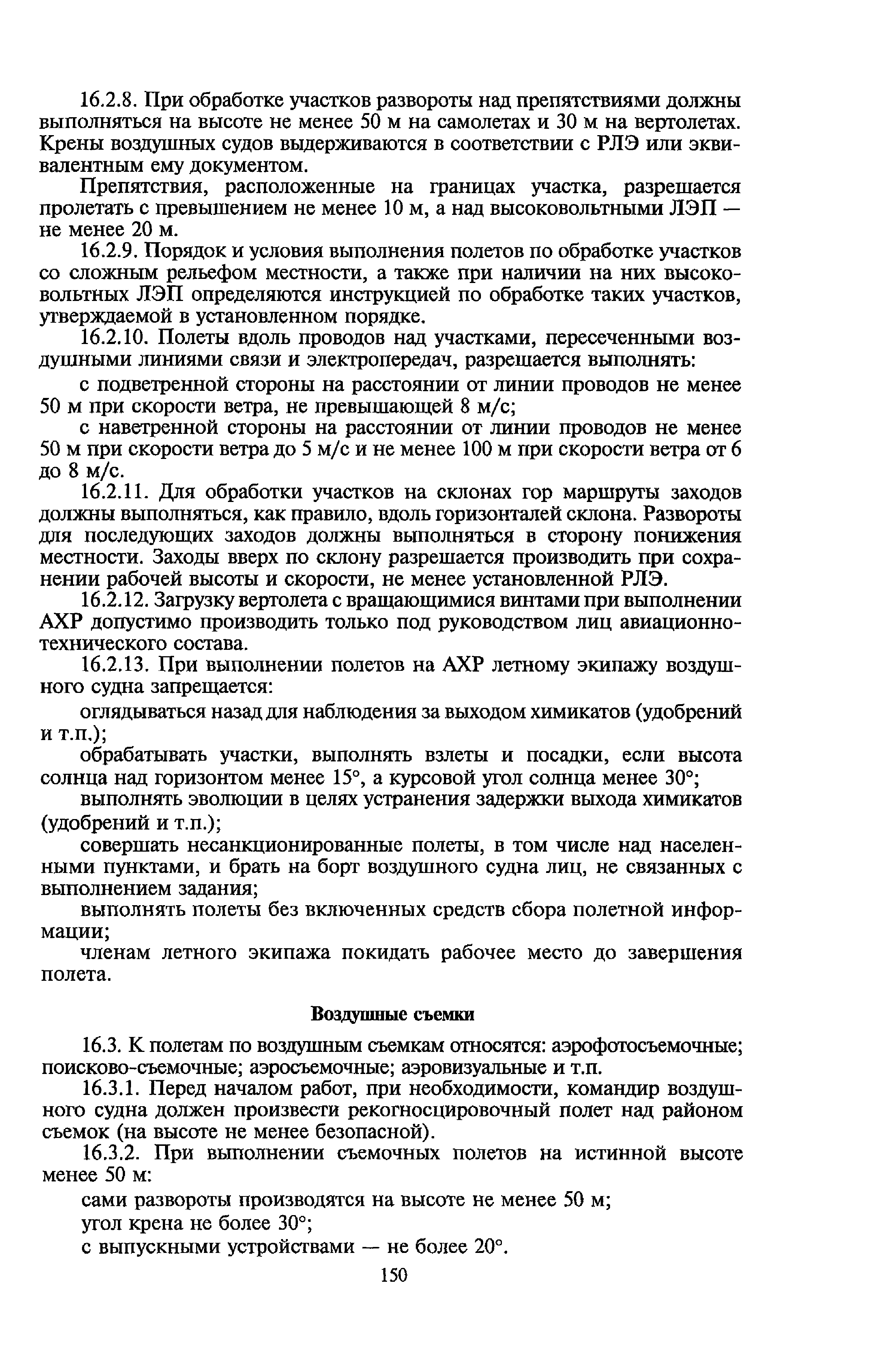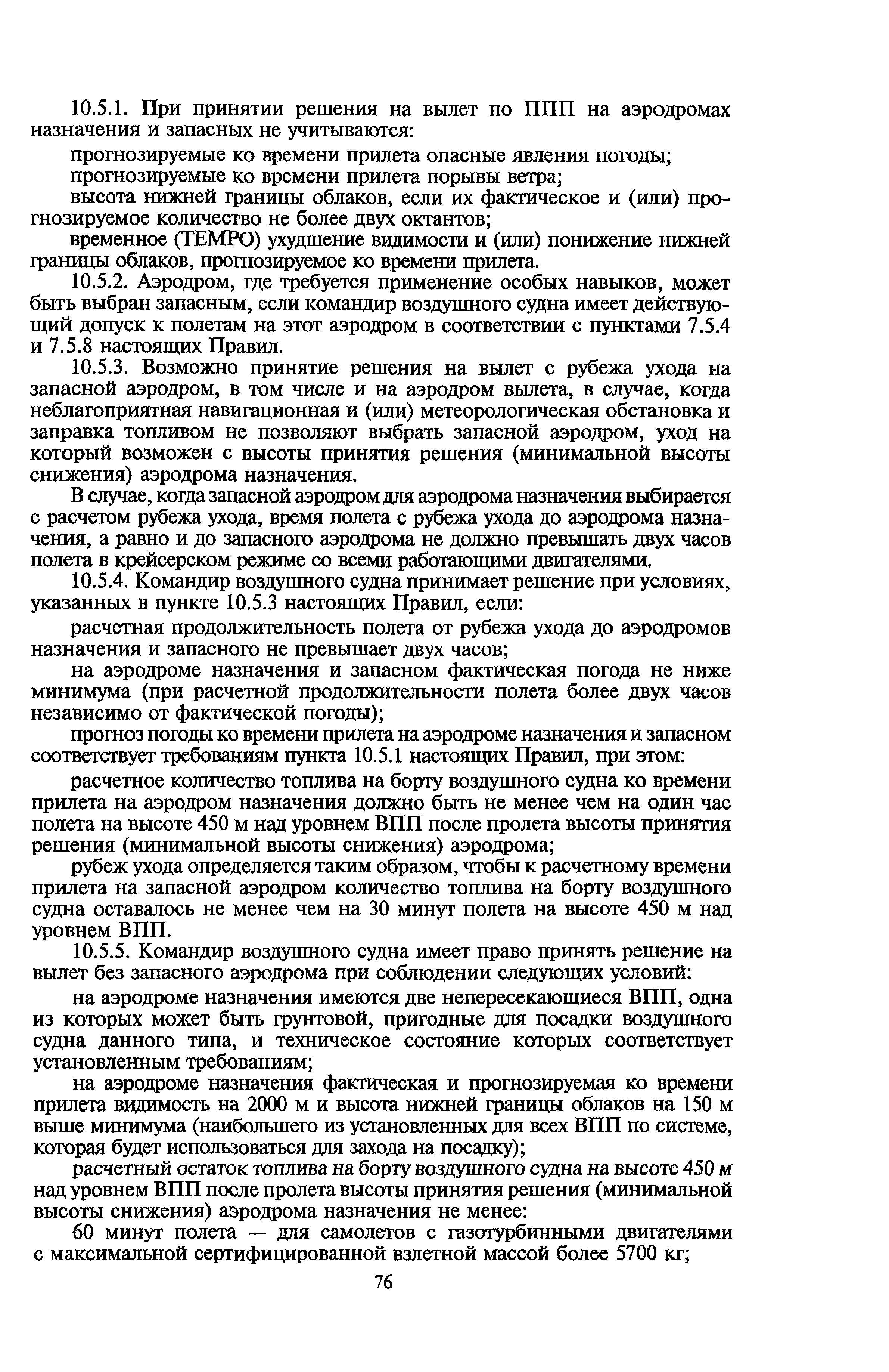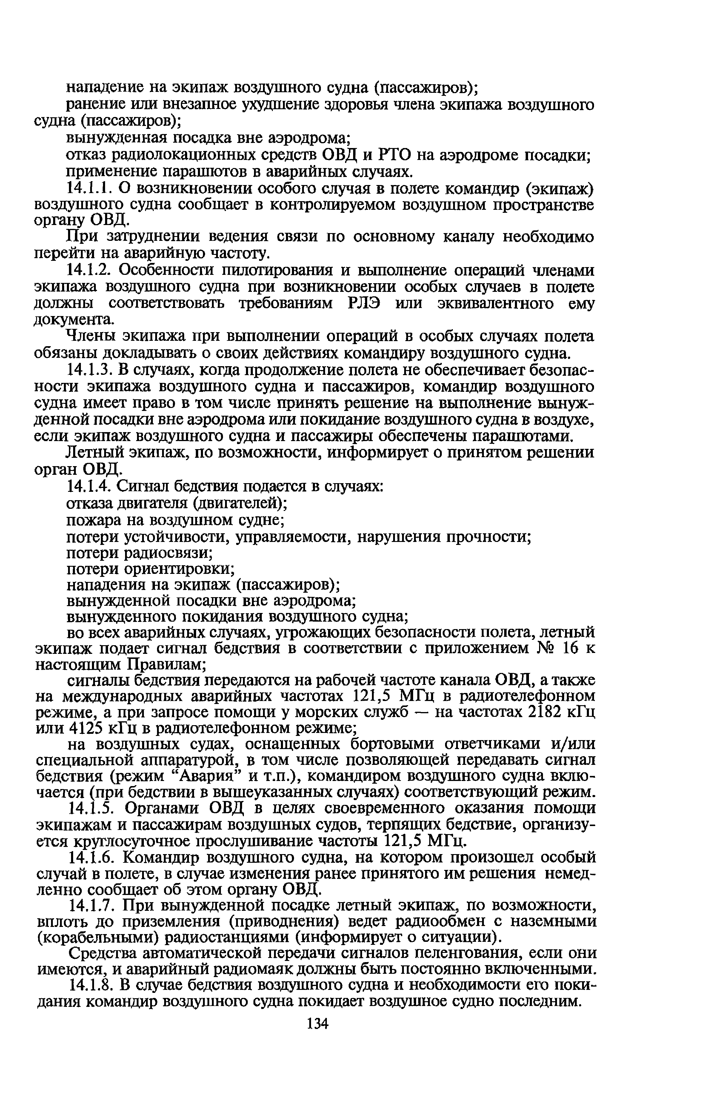| Область применения: | Правила устанавливают порядок подготовки воздушного судна и его экипажа к полету, обеспечения и выполнения полета, а также общие правила выполнения авиационных работ. Правила обязательны для исполнения: физическими и юридическими лицами независимо от организационно-правовых форм и форм собственности, осуществляющими организацию, обеспечение и выполнение полетов гражданских воздушных судов; экипажами воздушных судов и соответствующими подразделениями государственной и экспериментальной авиации в случае выполнения ими коммерческих воздушных перевозок; экипажами воздушных судов независимо от их национальной и ведомственной принадлежности при полетах по воздушным трассам, местным воздушным линиям, установленным для гражданских воздушных судов маршрутам, включая маршруты зональной навигации, а также в районах гражданских аэродромов и районах выполнения авиационных работ; экипажами гражданских воздушных судов Российской Федерации за пределами Российской Федерации, если законы страны по использованию его воздушного пространства и пребывания в ней не требуют иного. При осуществлении полетов, связанных со спасанием жизни людей или стихийными бедствиями, специальных полетов особой государственной важности руководителям авиационных предприятий разрешается допускать отступления от требований, изложенных в настоящих Правилах. |