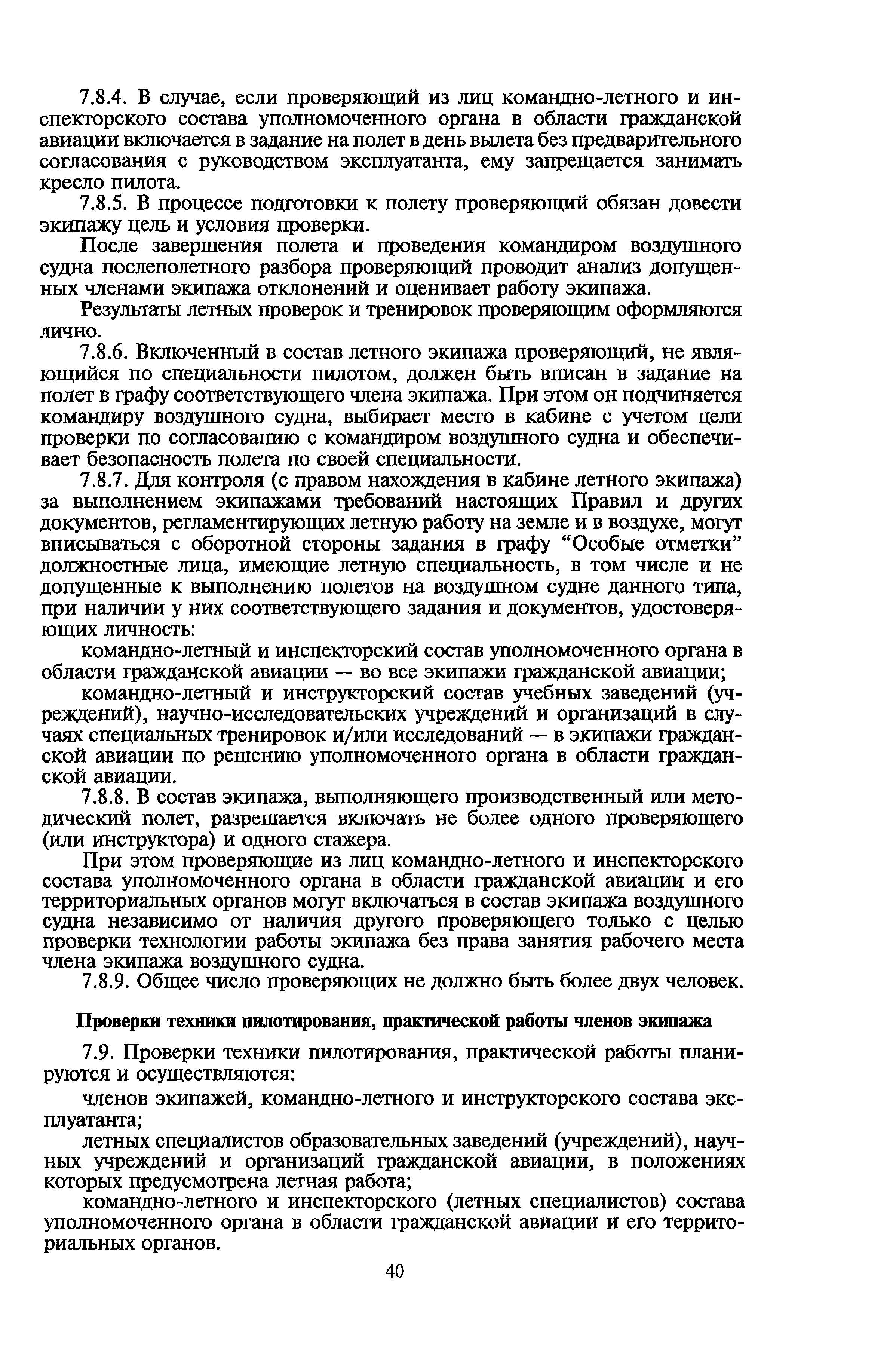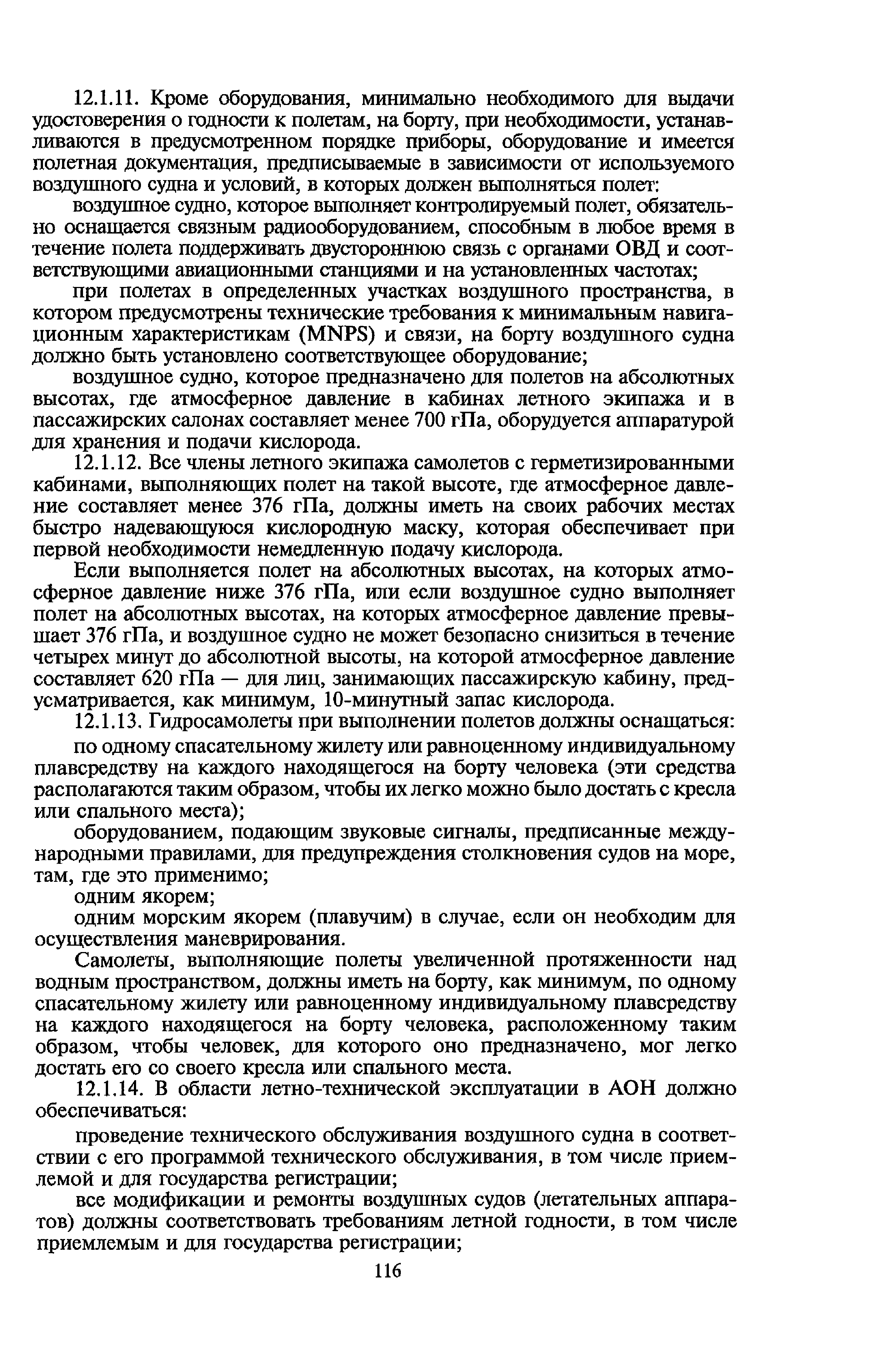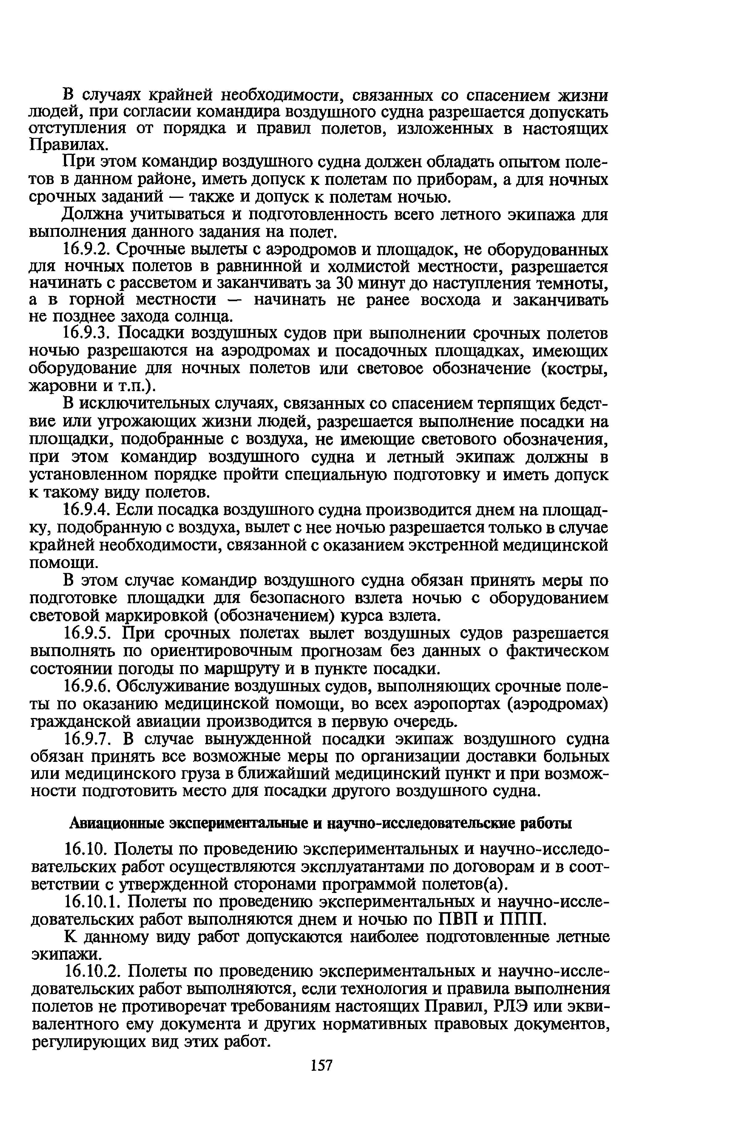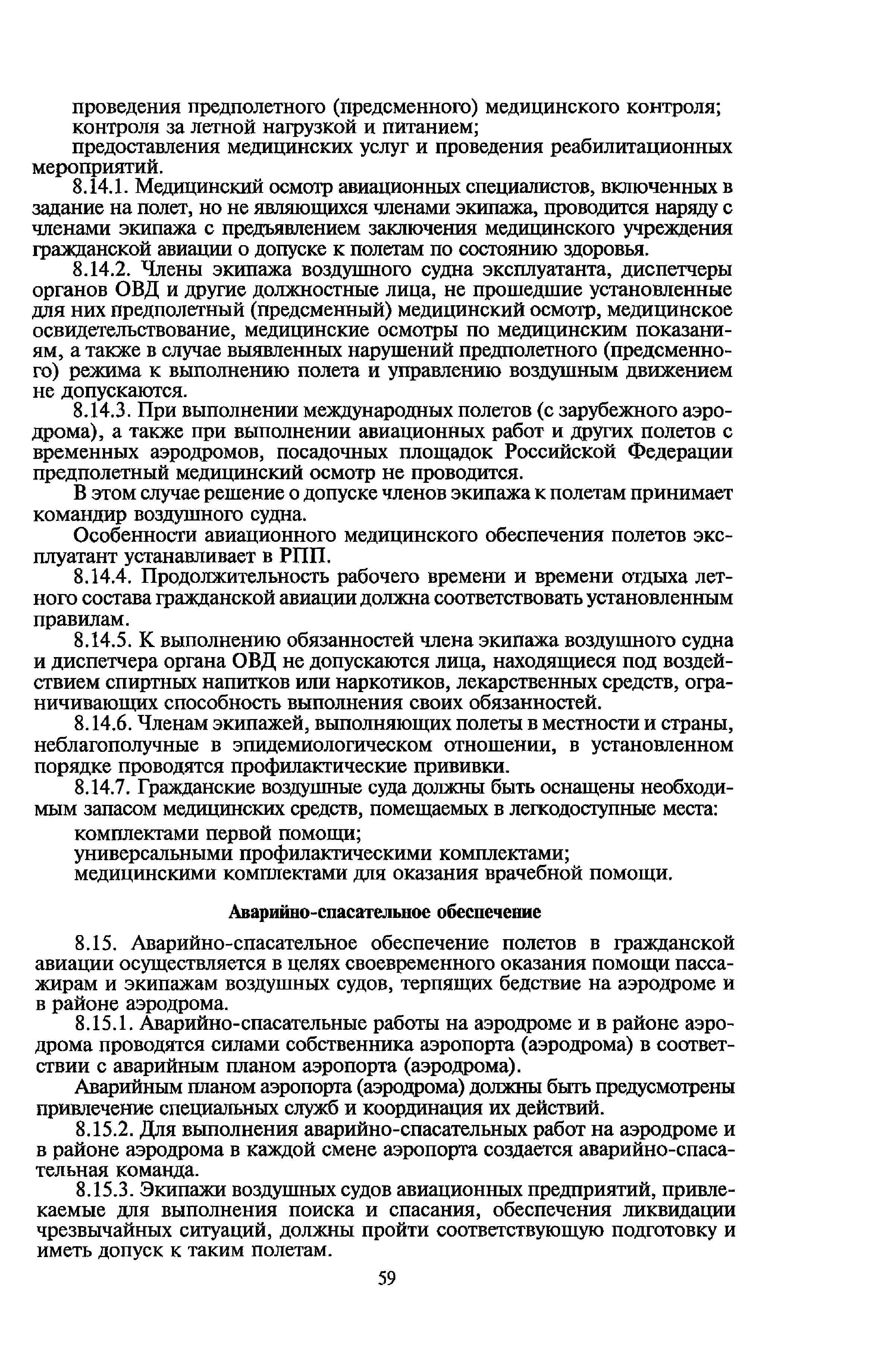 | Область применения: | Правила устанавливают порядок подготовки воздушного судна и его экипажа к полету, обеспечения и выполнения полета, а также общие правила выполнения авиационных работ. Правила обязательны для исполнения: физическими и юридическими лицами независимо от организационно-правовых форм и форм собственности, осуществляющими организацию, обеспечение и выполнение полетов гражданских воздушных судов; экипажами воздушных судов и соответствующими подразделениями государственной и экспериментальной авиации в случае выполнения ими коммерческих воздушных перевозок; экипажами воздушных судов независимо от их национальной и ведомственной принадлежности при полетах по воздушным трассам, местным воздушным линиям, установленным для гражданских воздушных судов маршрутам, включая маршруты зональной навигации, а также в районах гражданских аэродромов и районах выполнения авиационных работ; экипажами гражданских воздушных судов Российской Федерации за пределами Российской Федерации, если законы страны по использованию его воздушного пространства и пребывания в ней не требуют иного. При осуществлении полетов, связанных со спасанием жизни людей или стихийными бедствиями, специальных полетов особой государственной важности руководителям авиационных предприятий разрешается допускать отступления от требований, изложенных в настоящих Правилах. |