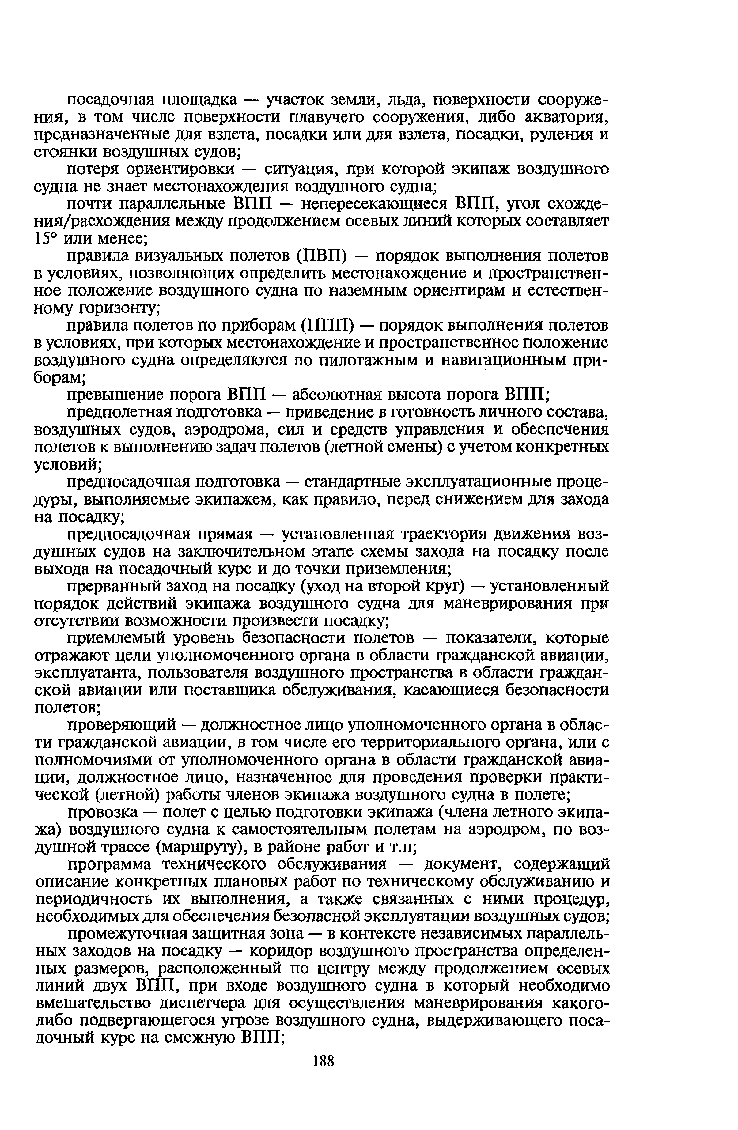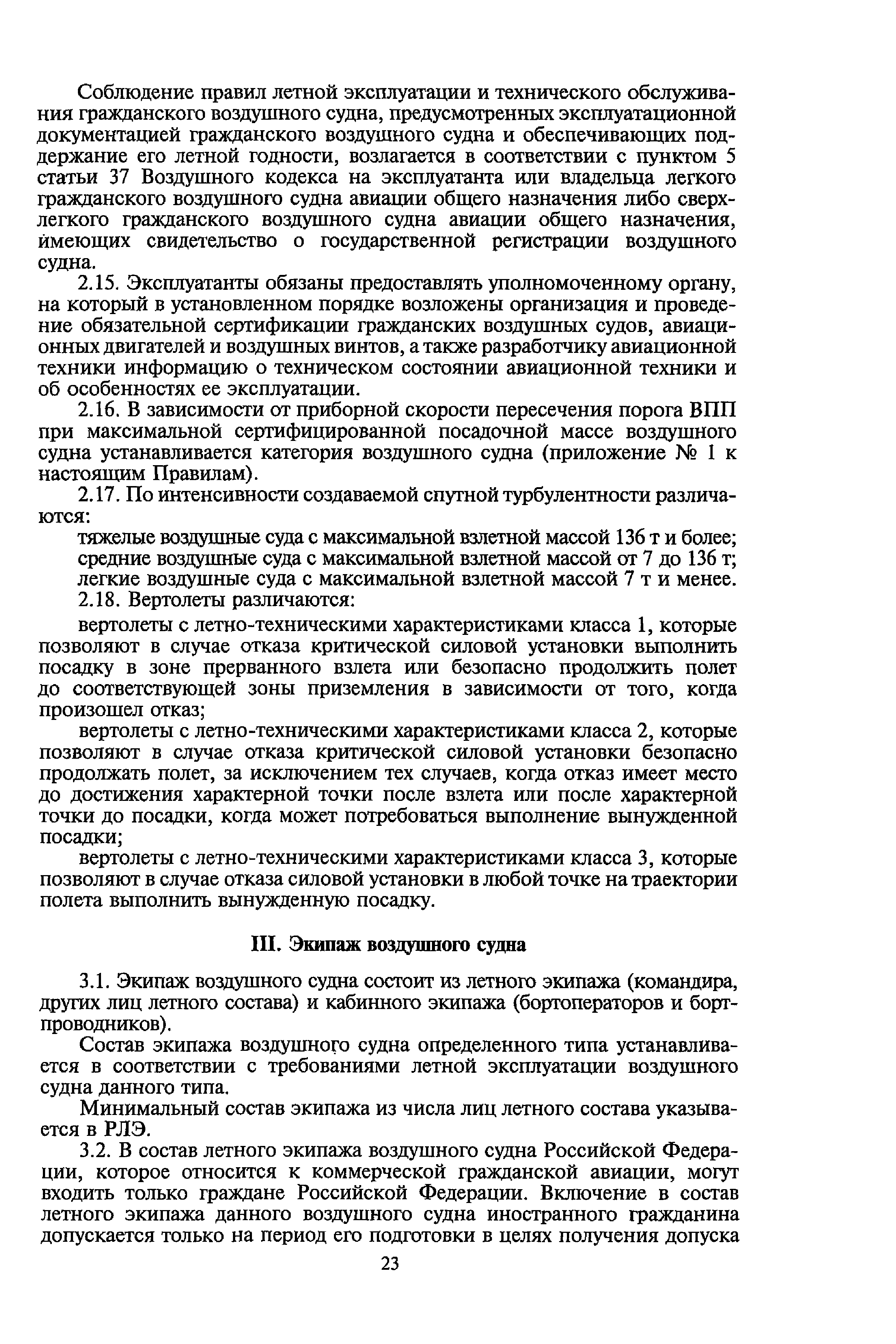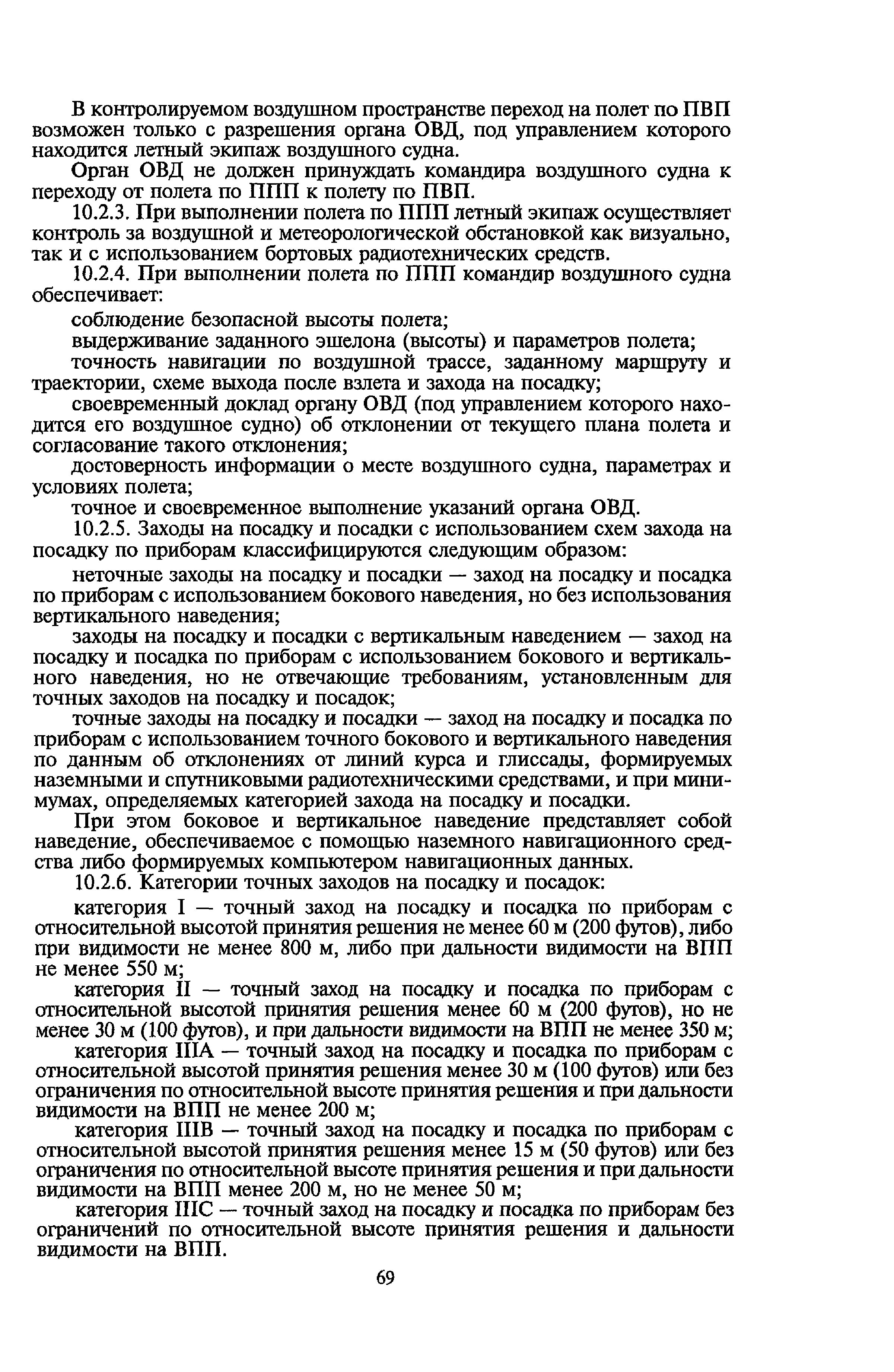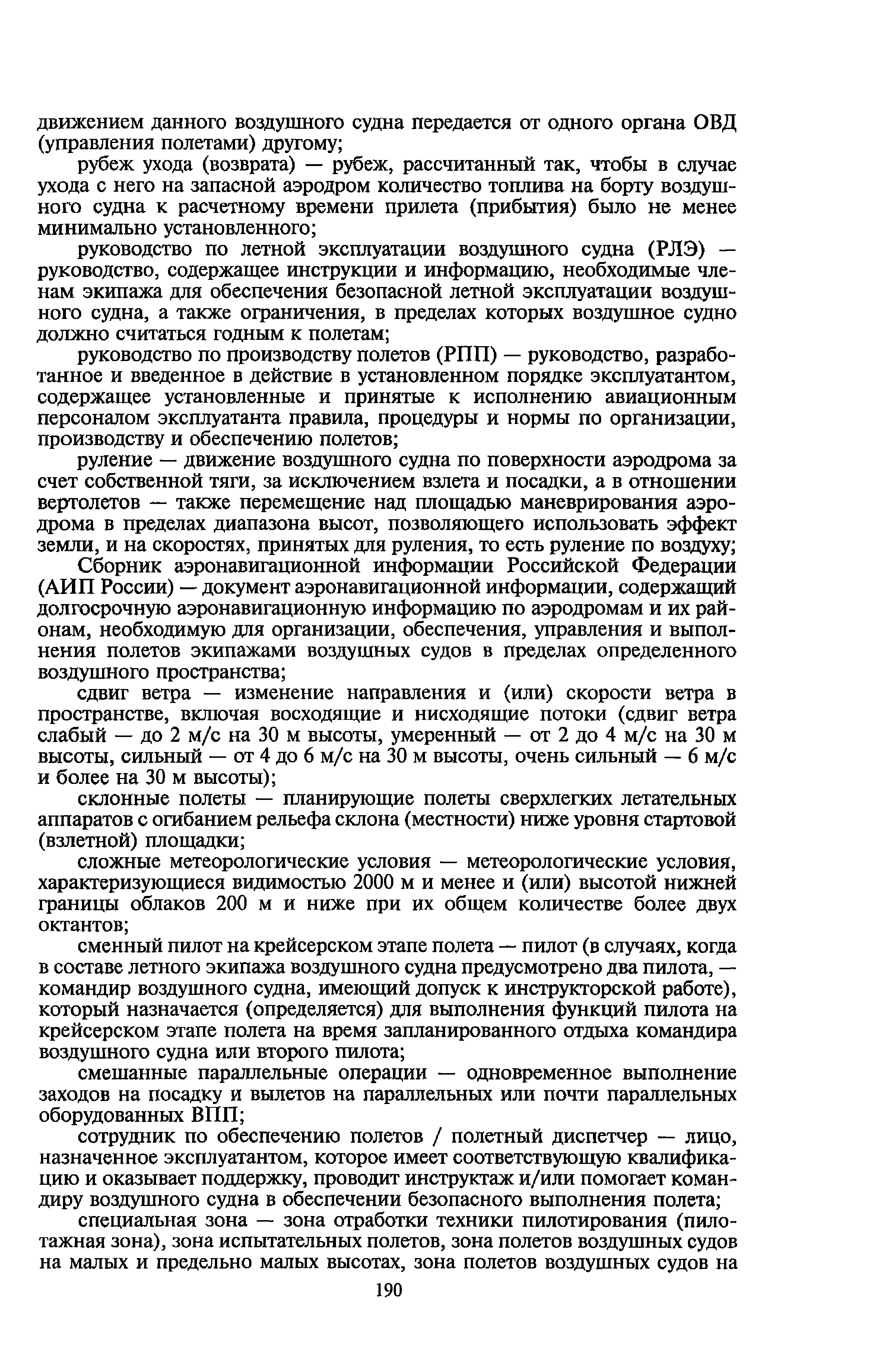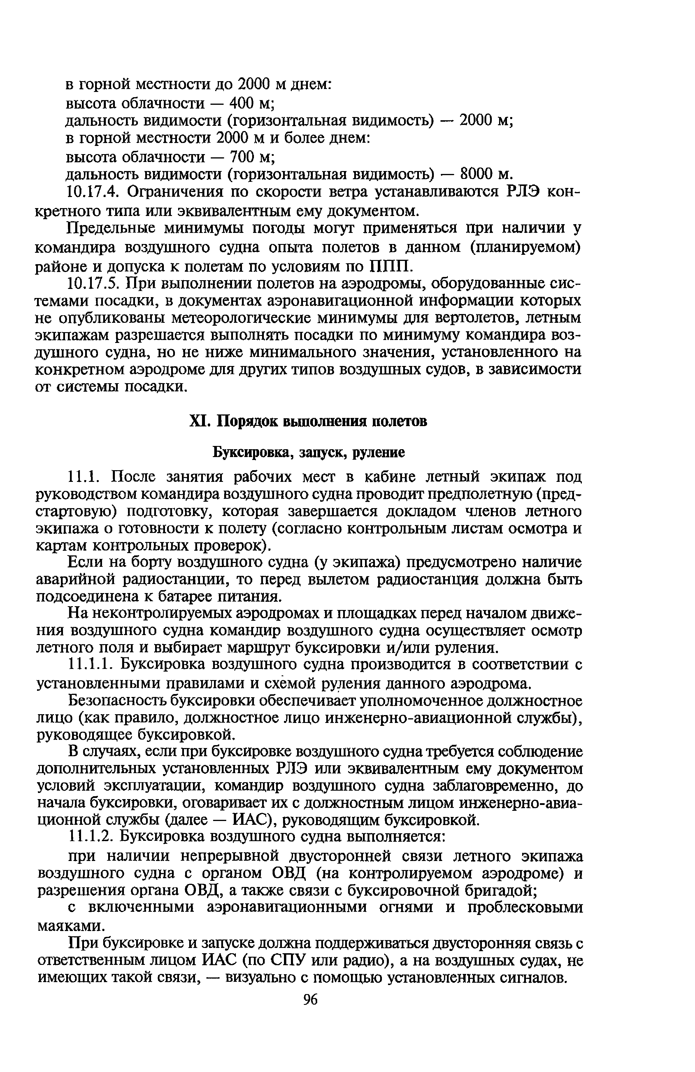 | Оглавление: | I. Общие положения II. Воздушные суда III. Экипаж воздушного судна IV. Аэродромы, аэропорты, вертодромы и посадочные площадки V. Классификация полетов в гражданской авиации VI. Минимумы Эксплуатационные минимумы аэродрома (вертодрома) Минимум командира воздушного судна Минимум вида авиационных работ VII. Организация летной работы Планирование летной работы Летно-методическая работа Профессиональная подготовка членов экипажей воздушных судов Допуск летного состава к полетам Формирование экипажей воздушных судов Предварительная и предполетная подготовка членов летных экипажей Полеты с проверяющими в составе экипажа воздушного судна Проверки техники пилотирования, практической работы членов экипажа Разборы полетов Контроль полетов, анализ летной работы и безопасности полетов VIII. Обеспечение полетов Аэронавигационное обслуживание полетов воздушных судов Навигационное (штурманское) обеспечение полетов Метеорологическое обеспечение полетов Инженерно-авиационное обеспечение Аэродромное обеспечение Авиатопливообеспечение Светотехническое обеспечение Радиотехническое обеспечение Орнитологическое обеспечение Организационное обеспечение перевозок, авиационных работ Организационное обеспечение полетов Обеспечение авиационной безопасности Авиационное медицинское обеспечение Аварийно-спасательное обеспечение IX. Воздушное пространство Российской Федерации. Организация и обслуживание (управление) воздушного движения в Российской Федерации Разрешительный и уведомительный порядок использования воздушного пространства Обслуживание (управление) воздушного движения X. Правила полетов Правила полетов по приборам Правила визуальных полетов, включая полеты по минимальным условиям ПВП Общие правила вылета, прилета воздушных судов и определение запасного аэродрома Особенности принятия решения на вылет и прилет по ППП Особенности принятия решения на вылет и прилет по ПВП Правила установки шкалы давления барометрического высотомера Правила определения и выдерживания безопасных высот полета Правила вертикального эшелонирования Правила продольного эшелонирования Правила бокового эшелонирования Правила изменения эшелона (высоты) полета и пересечения воздушной трассы, МВЛ и маршрута полета Правила полетов по воздушным трассам, МВЛ и установленным маршрутам Правила определения минимального количества топлива на полет и аэронавигационного запаса топлива Особенности полетов в воздушном пространстве приграничной полосы Российской Федерации и при пересечении государственной границы Российской Федерации Особенности производства полетов в районе аэродрома (аэроузла) и на контролируемых аэродромах Особенности в правилах выполнения особо важных и специальных рейсов (полетов) на вертолетах XI. Порядок выполнения полетов Буксировка, запуск, руление Взлет Набор высоты Выполнение полетов по воздушным трассам, МВЛ и маршрутам Снижение, заход на посадку и посадка Полеты на вертолетах Полеты на гидросамолетах Учебные и тренировочные полеты Полеты по перегонке воздушных судов, в том числе при групповых перелетах Испытательные, исследовательские и контрольные полеты (облеты) XII. Особенности организации и выполнения полетов в авиации общего назначения Общие правила выполнения полетов сверхлегк