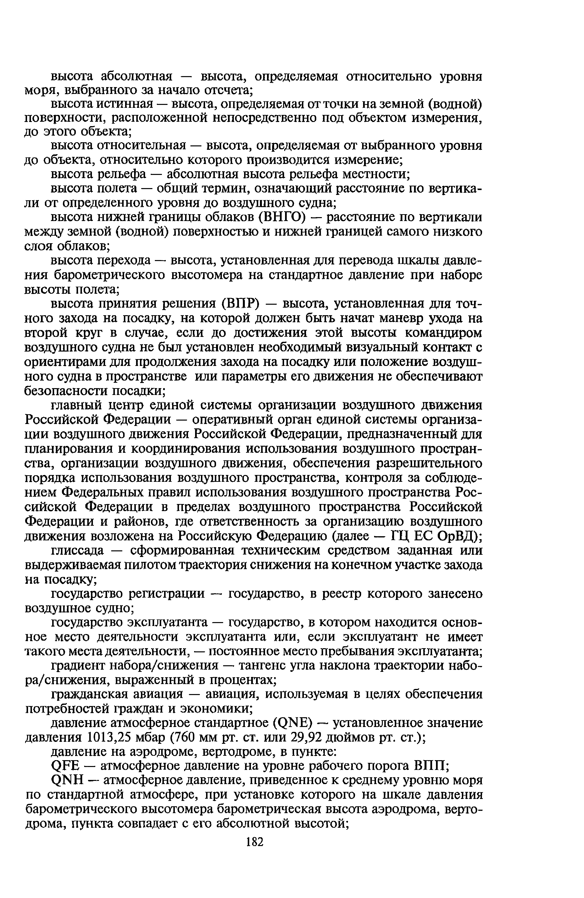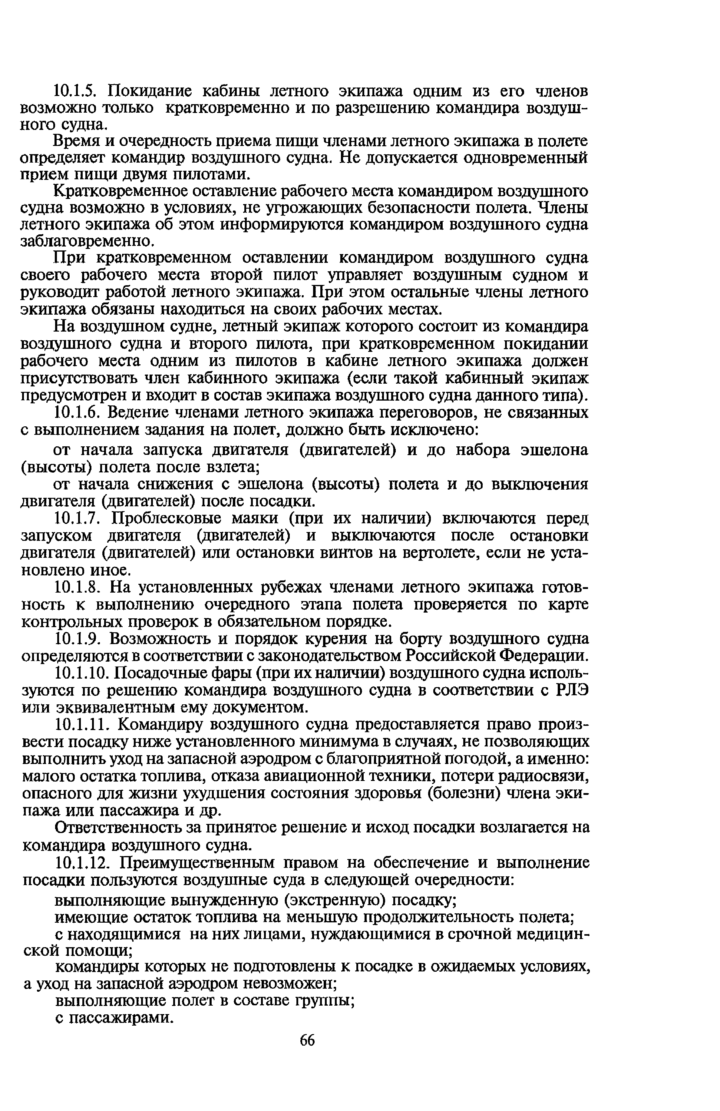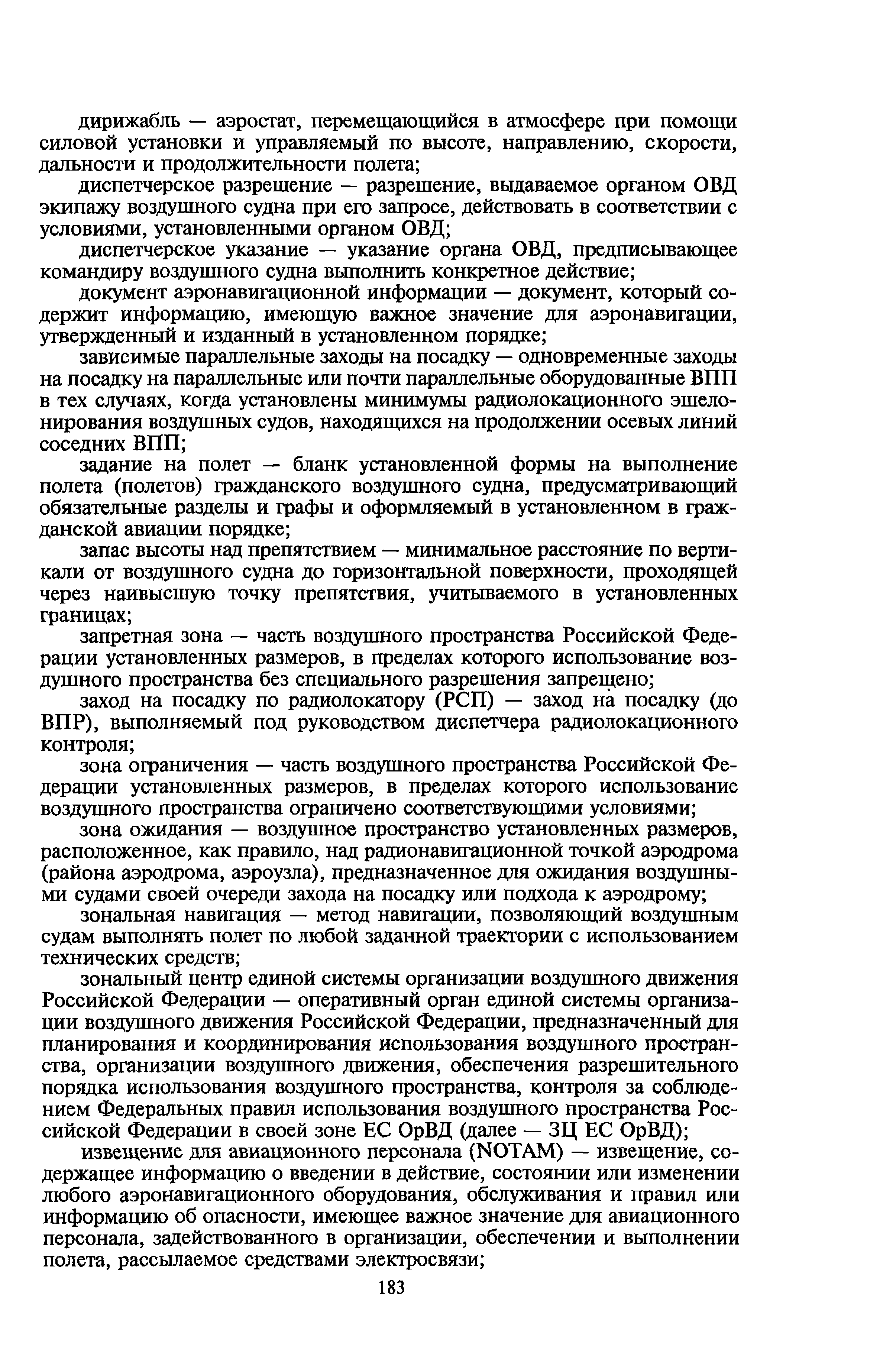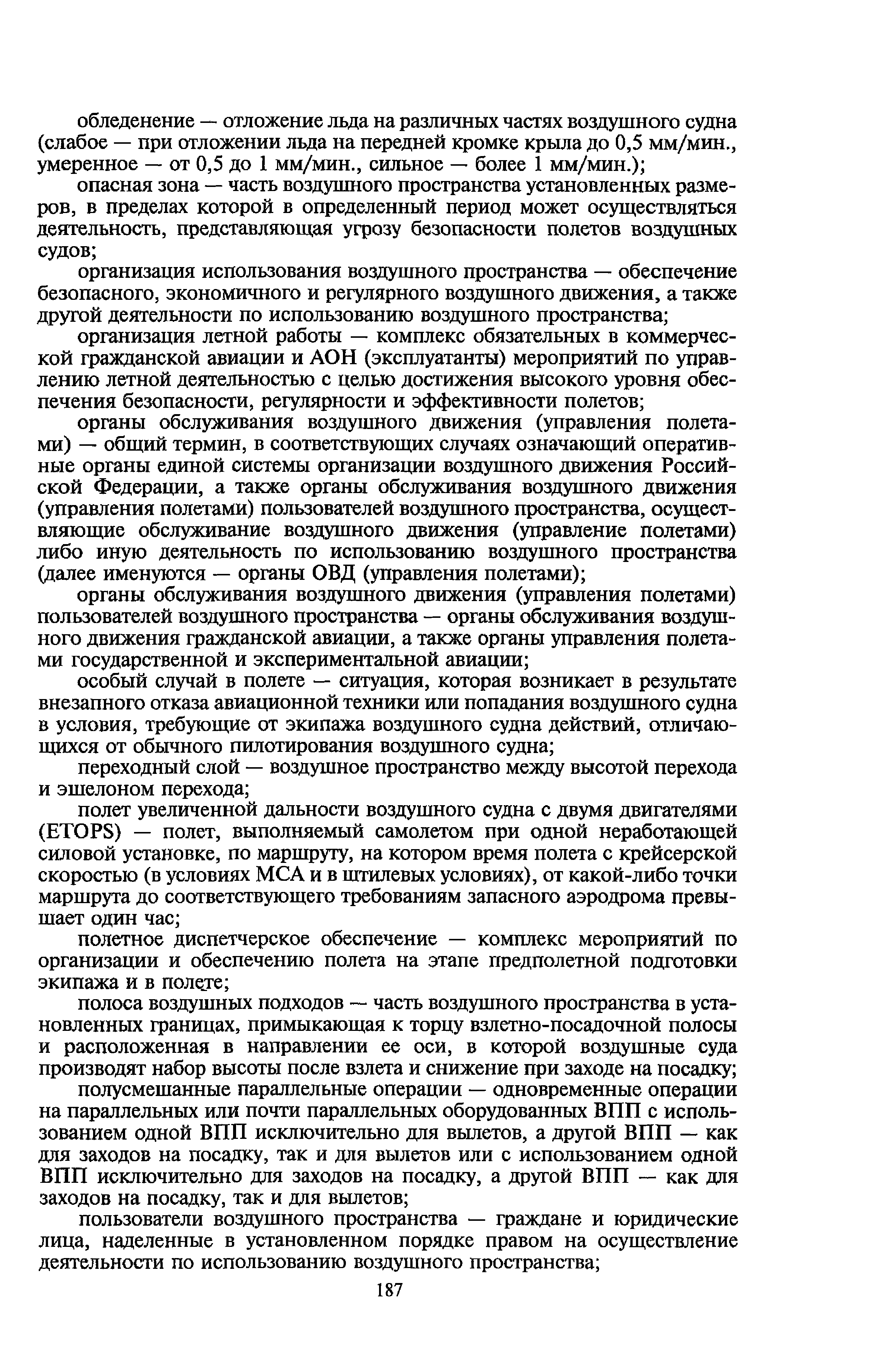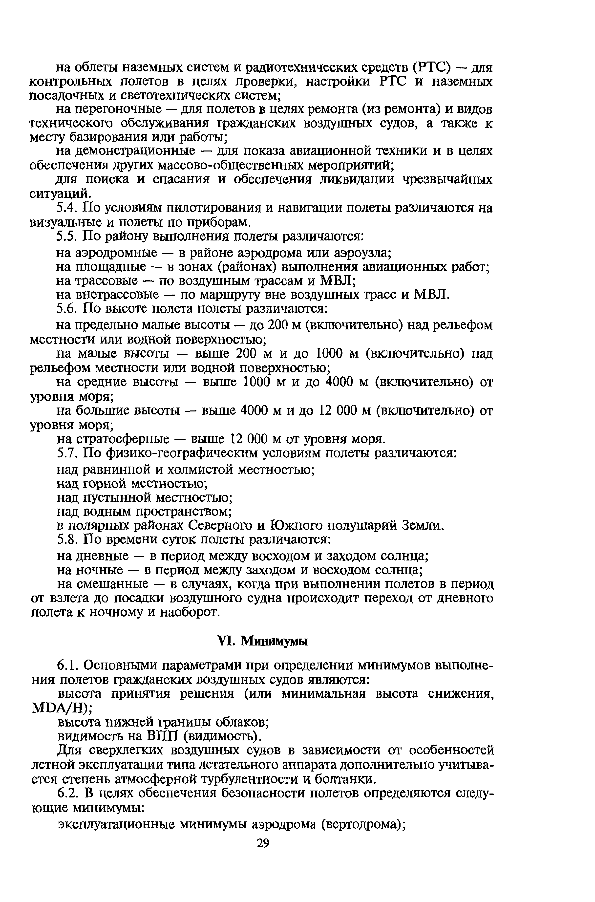 | Оглавление: | I. Общие положения II. Воздушные суда III. Экипаж воздушного судна IV. Аэродромы, аэропорты, вертодромы и посадочные площадки V. Классификация полетов в гражданской авиации VI. Минимумы Эксплуатационные минимумы аэродрома (вертодрома) Минимум командира воздушного судна Минимум вида авиационных работ VII. Организация летной работы Планирование летной работы Летно-методическая работа Профессиональная подготовка членов экипажей воздушных судов Допуск летного состава к полетам Формирование экипажей воздушных судов Предварительная и предполетная подготовка членов летных экипажей Полеты с проверяющими в составе экипажа воздушного судна Проверки техники пилотирования, практической работы членов экипажа Разборы полетов Контроль полетов, анализ летной работы и безопасности полетов VIII. Обеспечение полетов Аэронавигационное обслуживание полетов воздушных судов Навигационное (штурманское) обеспечение полетов Метеорологическое обеспечение полетов Инженерно-авиационное обеспечение Аэродромное обеспечение Авиатопливообеспечение Светотехническое обеспечение Радиотехническое обеспечение Орнитологическое обеспечение Организационное обеспечение перевозок, авиационных работ Организационное обеспечение полетов Обеспечение авиационной безопасности Авиационное медицинское обеспечение Аварийно-спасательное обеспечение IX. Воздушное пространство Российской Федерации. Организация и обслуживание (управление) воздушного движения в Российской Федерации Разрешительный и уведомительный порядок использования воздушного пространства Обслуживание (управление) воздушного движения X. Правила полетов Правила полетов по приборам Правила визуальных полетов, включая полеты по минимальным условиям ПВП Общие правила вылета, прилета воздушных судов и определение запасного аэродрома Особенности принятия решения на вылет и прилет по ППП Особенности принятия решения на вылет и прилет по ПВП Правила установки шкалы давления барометрического высотомера Правила определения и выдерживания безопасных высот полета Правила вертикального эшелонирования Правила продольного эшелонирования Правила бокового эшелонирования Правила изменения эшелона (высоты) полета и пересечения воздушной трассы, МВЛ и маршрута полета Правила полетов по воздушным трассам, МВЛ и установленным маршрутам Правила определения минимального количества топлива на полет и аэронавигационного запаса топлива Особенности полетов в воздушном пространстве приграничной полосы Российской Федерации и при пересечении государственной границы Российской Федерации Особенности производства полетов в районе аэродрома (аэроузла) и на контролируемых аэродромах Особенности в правилах выполнения особо важных и специальных рейсов (полетов) на вертолетах XI. Порядок выполнения полетов Буксировка, запуск, руление Взлет Набор высоты Выполнение полетов по воздушным трассам, МВЛ и маршрутам Снижение, заход на посадку и посадка Полеты на вертолетах Полеты на гидросамолетах Учебные и тренировочные полеты Полеты по перегонке воздушных судов, в том числе при групповых перелетах Испытательные, исследовательские и контрольные полеты (облеты) XII. Особенности организации и выполнения полетов в авиации общего назначения Общие правила выполнения полетов сверхлегк