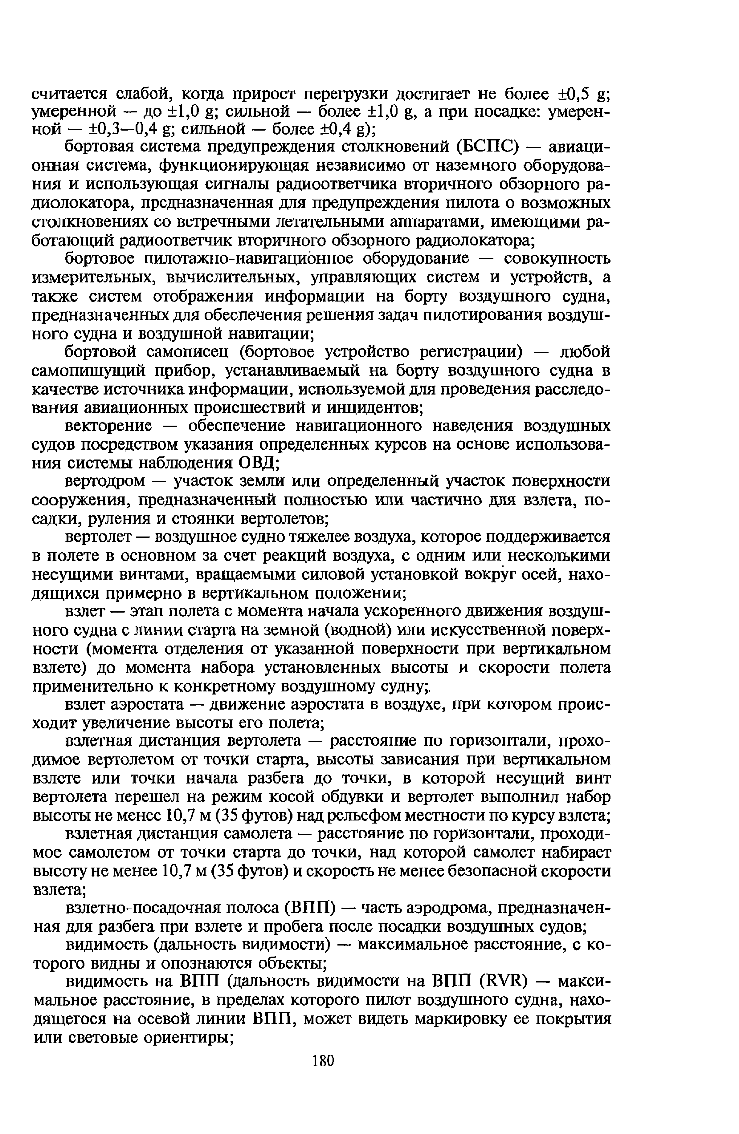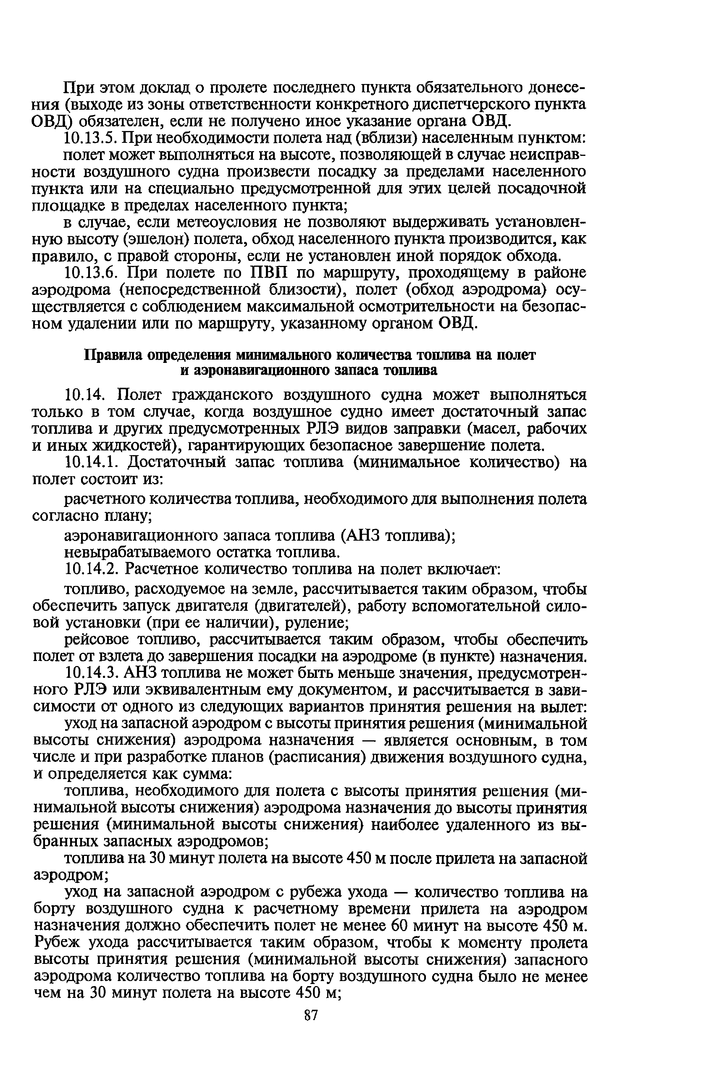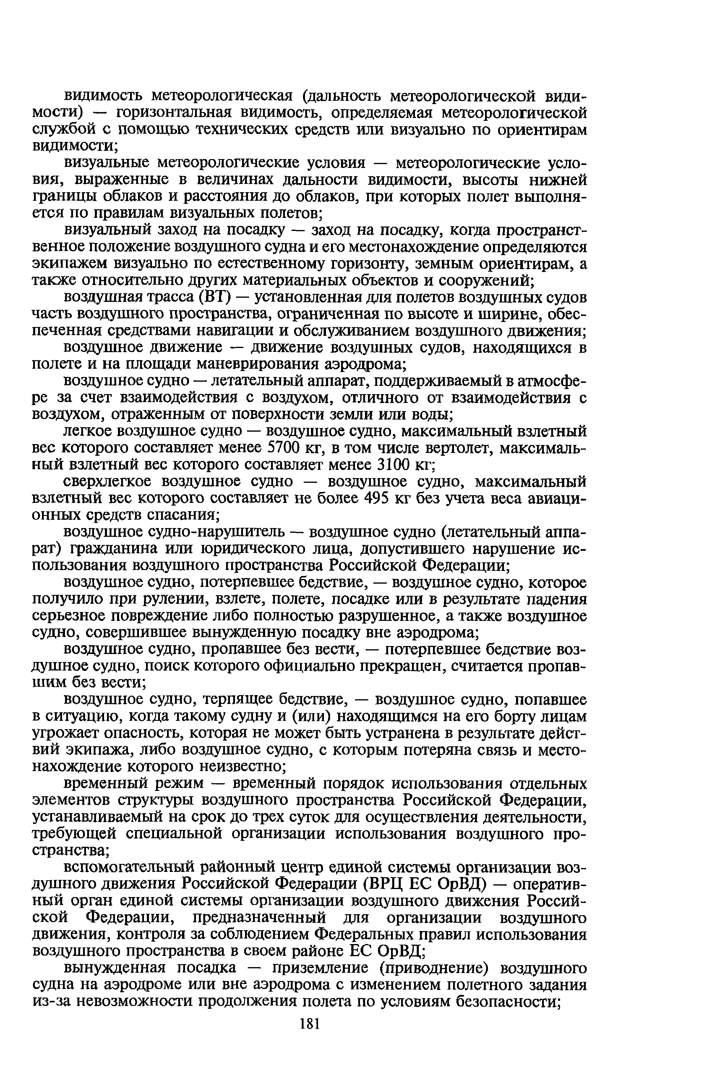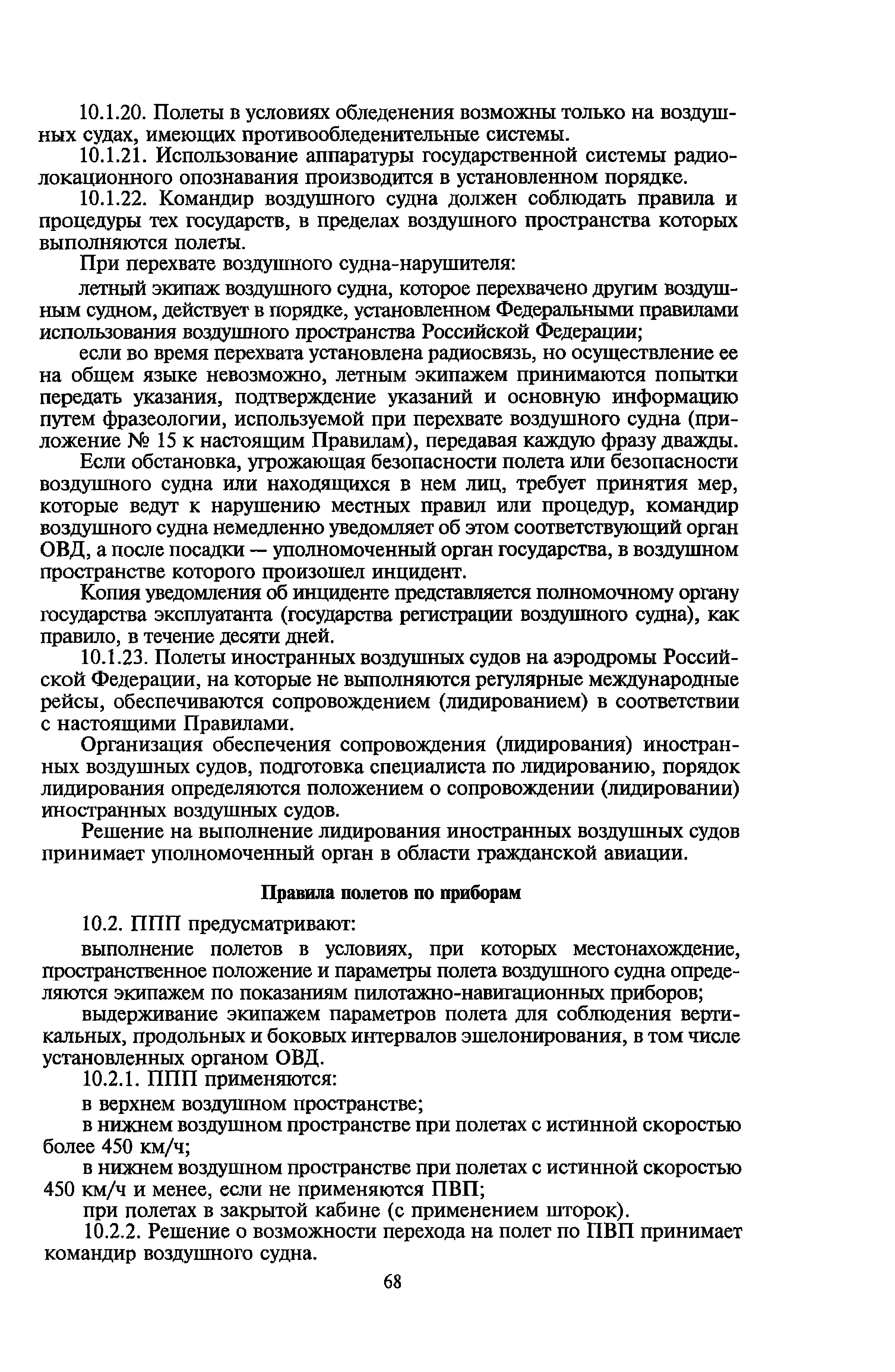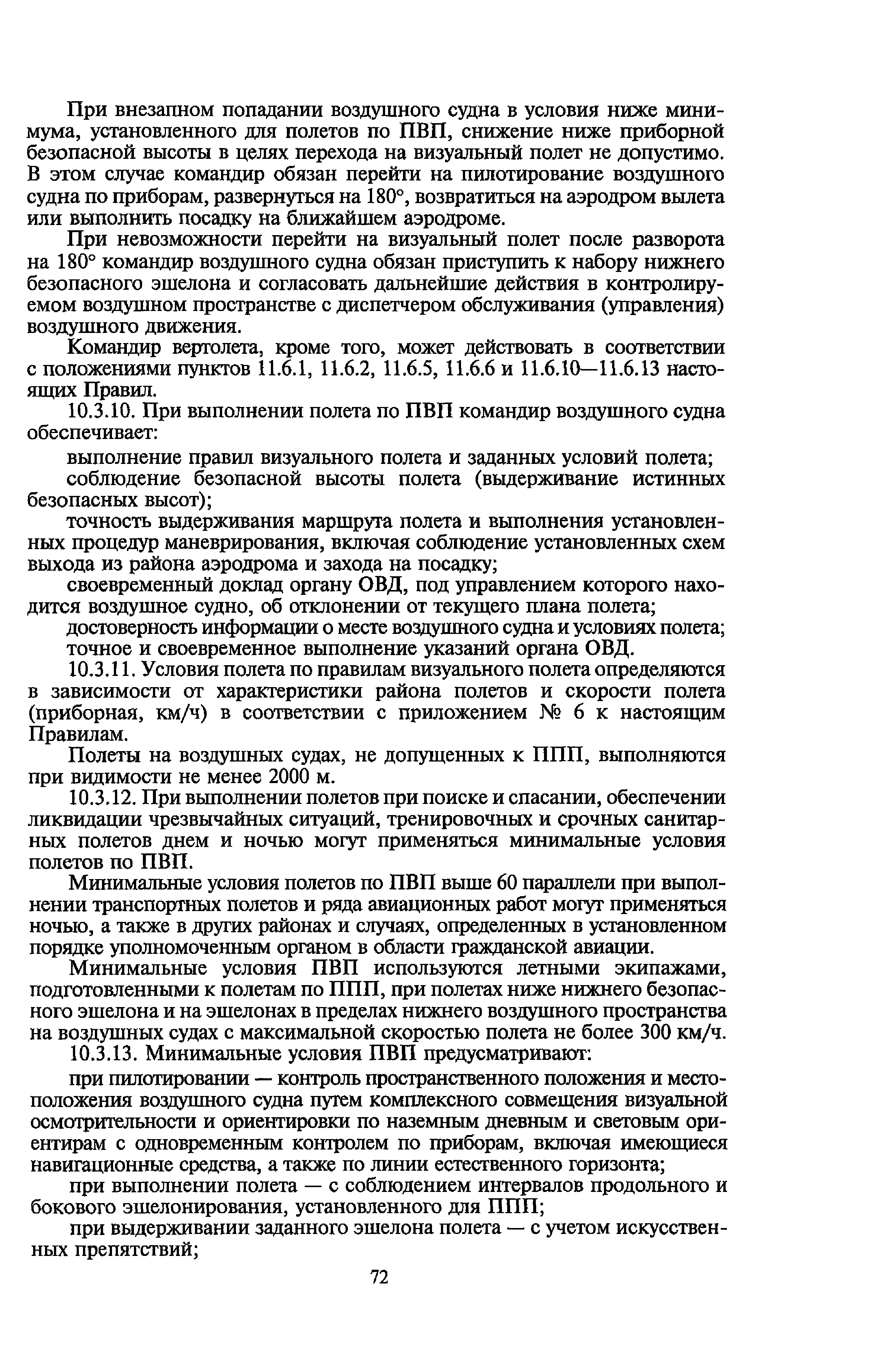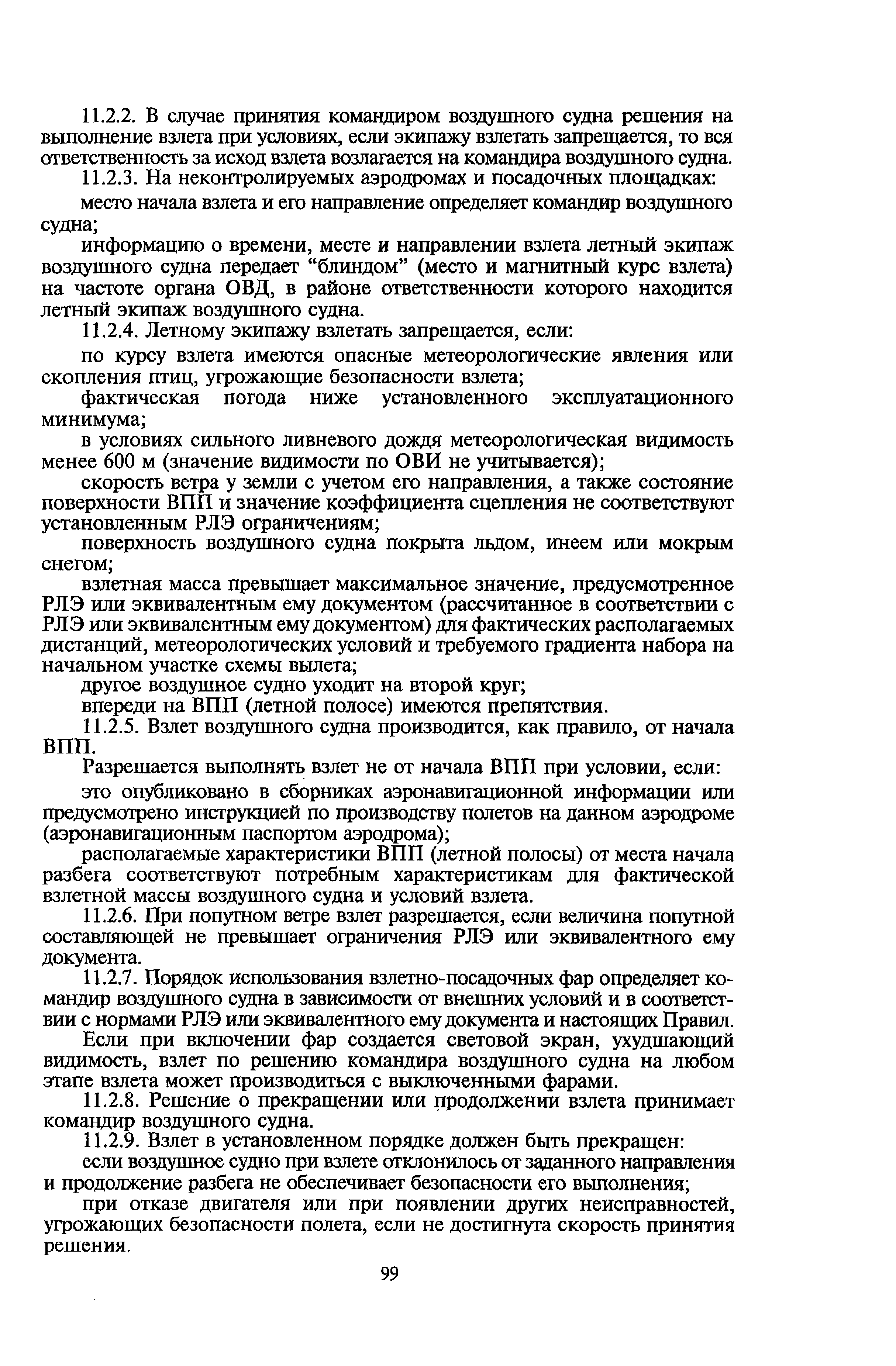 | Оглавление: | I. Общие положения II. Воздушные суда III. Экипаж воздушного судна IV. Аэродромы, аэропорты, вертодромы и посадочные площадки V. Классификация полетов в гражданской авиации VI. Минимумы Эксплуатационные минимумы аэродрома (вертодрома) Минимум командира воздушного судна Минимум вида авиационных работ VII. Организация летной работы Планирование летной работы Летно-методическая работа Профессиональная подготовка членов экипажей воздушных судов Допуск летного состава к полетам Формирование экипажей воздушных судов Предварительная и предполетная подготовка членов летных экипажей Полеты с проверяющими в составе экипажа воздушного судна Проверки техники пилотирования, практической работы членов экипажа Разборы полетов Контроль полетов, анализ летной работы и безопасности полетов VIII. Обеспечение полетов Аэронавигационное обслуживание полетов воздушных судов Навигационное (штурманское) обеспечение полетов Метеорологическое обеспечение полетов Инженерно-авиационное обеспечение Аэродромное обеспечение Авиатопливообеспечение Светотехническое обеспечение Радиотехническое обеспечение Орнитологическое обеспечение Организационное обеспечение перевозок, авиационных работ Организационное обеспечение полетов Обеспечение авиационной безопасности Авиационное медицинское обеспечение Аварийно-спасательное обеспечение IX. Воздушное пространство Российской Федерации. Организация и обслуживание (управление) воздушного движения в Российской Федерации Разрешительный и уведомительный порядок использования воздушного пространства Обслуживание (управление) воздушного движения X. Правила полетов Правила полетов по приборам Правила визуальных полетов, включая полеты по минимальным условиям ПВП Общие правила вылета, прилета воздушных судов и определение запасного аэродрома Особенности принятия решения на вылет и прилет по ППП Особенности принятия решения на вылет и прилет по ПВП Правила установки шкалы давления барометрического высотомера Правила определения и выдерживания безопасных высот полета Правила вертикального эшелонирования Правила продольного эшелонирования Правила бокового эшелонирования Правила изменения эшелона (высоты) полета и пересечения воздушной трассы, МВЛ и маршрута полета Правила полетов по воздушным трассам, МВЛ и установленным маршрутам Правила определения минимального количества топлива на полет и аэронавигационного запаса топлива Особенности полетов в воздушном пространстве приграничной полосы Российской Федерации и при пересечении государственной границы Российской Федерации Особенности производства полетов в районе аэродрома (аэроузла) и на контролируемых аэродромах Особенности в правилах выполнения особо важных и специальных рейсов (полетов) на вертолетах XI. Порядок выполнения полетов Буксировка, запуск, руление Взлет Набор высоты Выполнение полетов по воздушным трассам, МВЛ и маршрутам Снижение, заход на посадку и посадка Полеты на вертолетах Полеты на гидросамолетах Учебные и тренировочные полеты Полеты по перегонке воздушных судов, в том числе при групповых перелетах Испытательные, исследовательские и контрольные полеты (облеты) XII. Особенности организации и выполнения полетов в авиации общего назначения Общие правила выполнения полетов сверхлегк