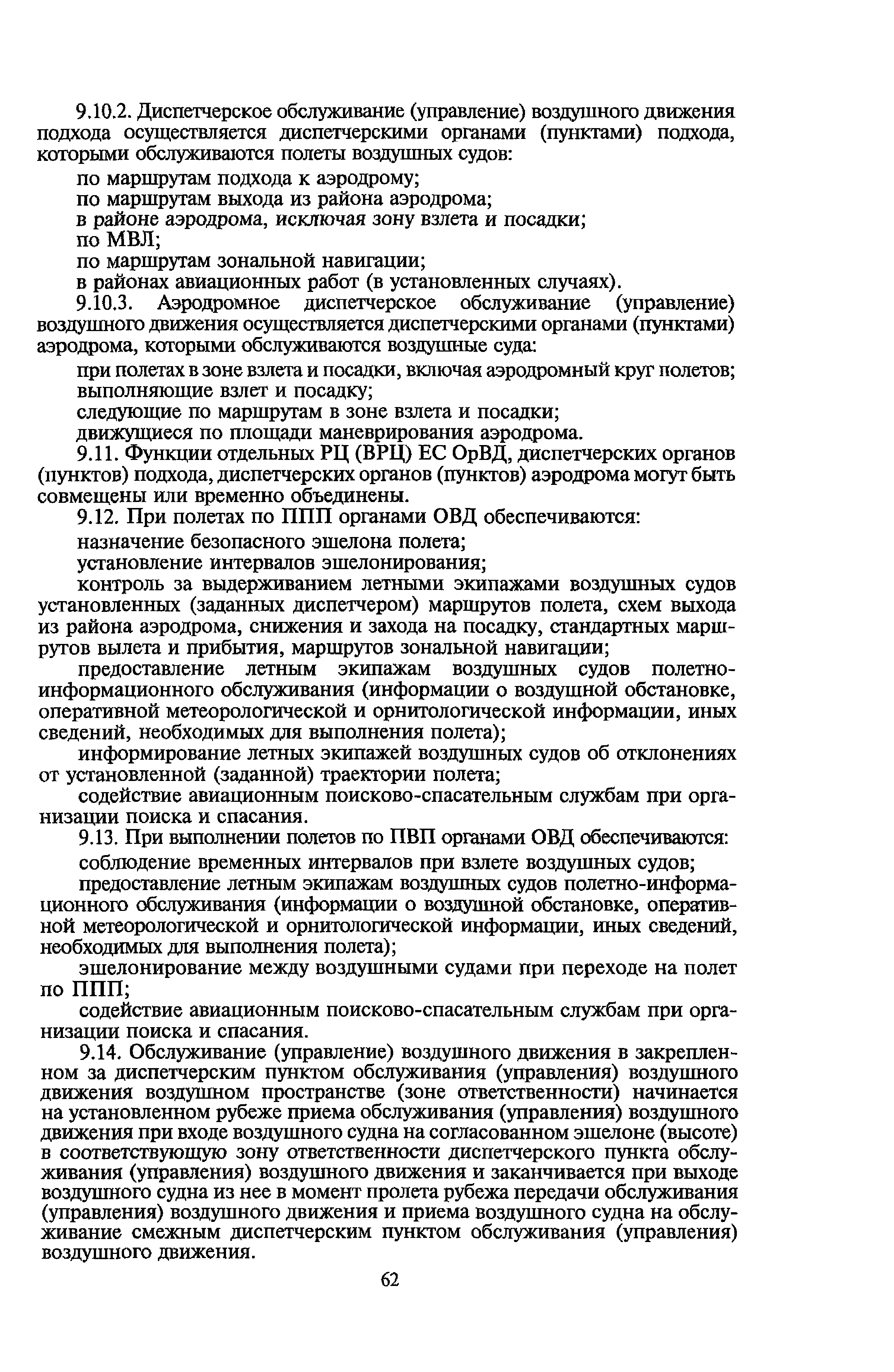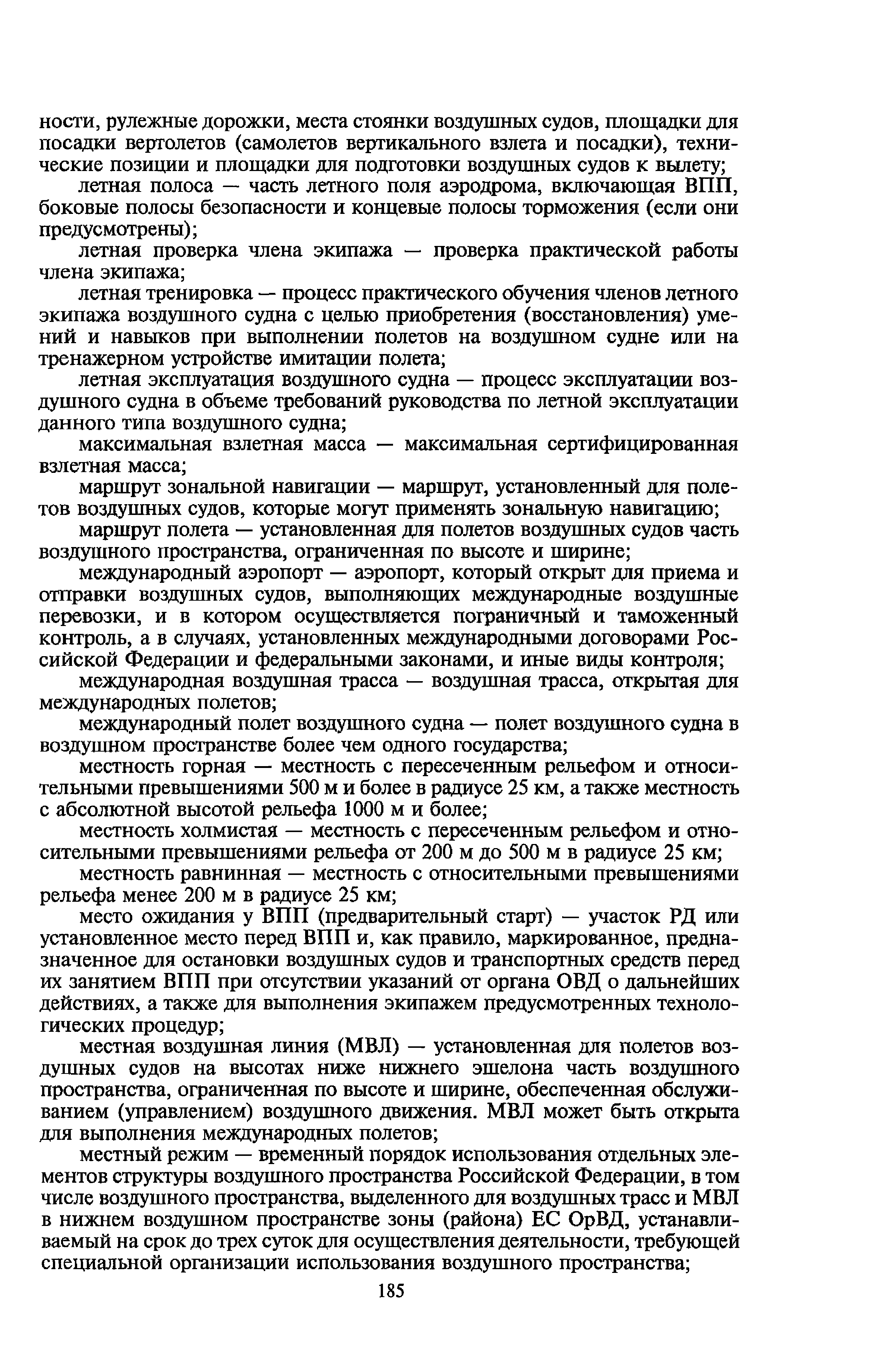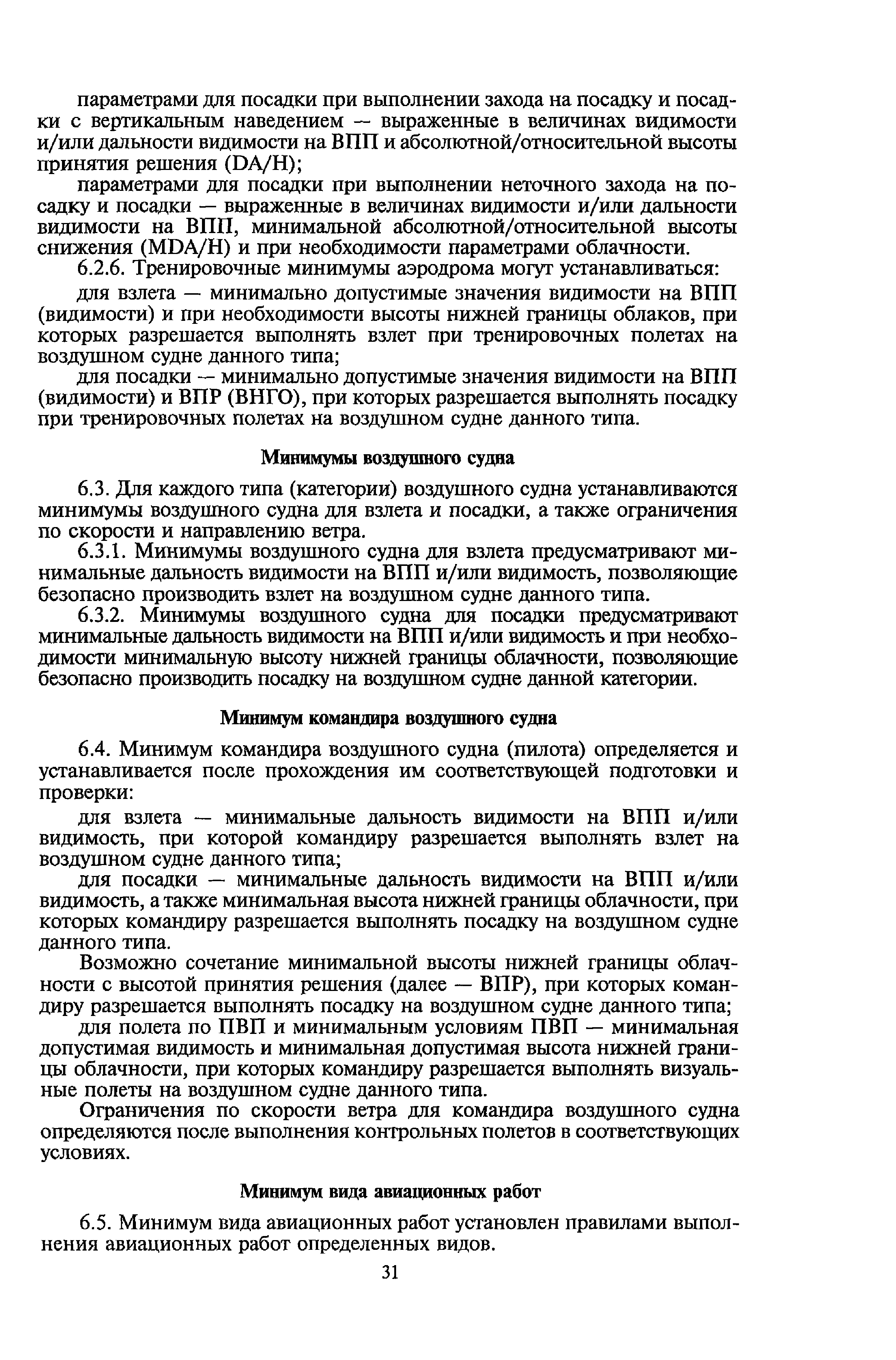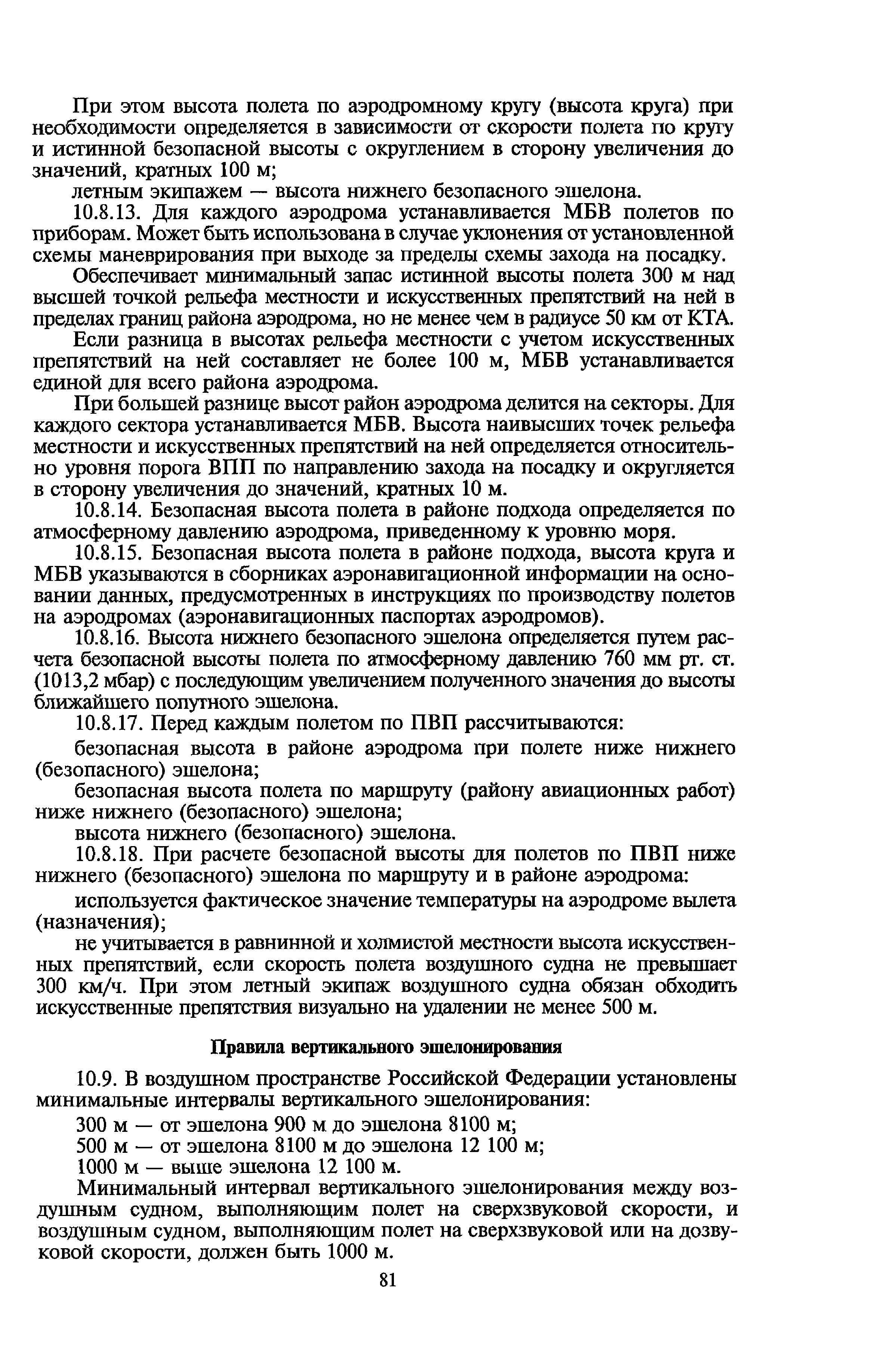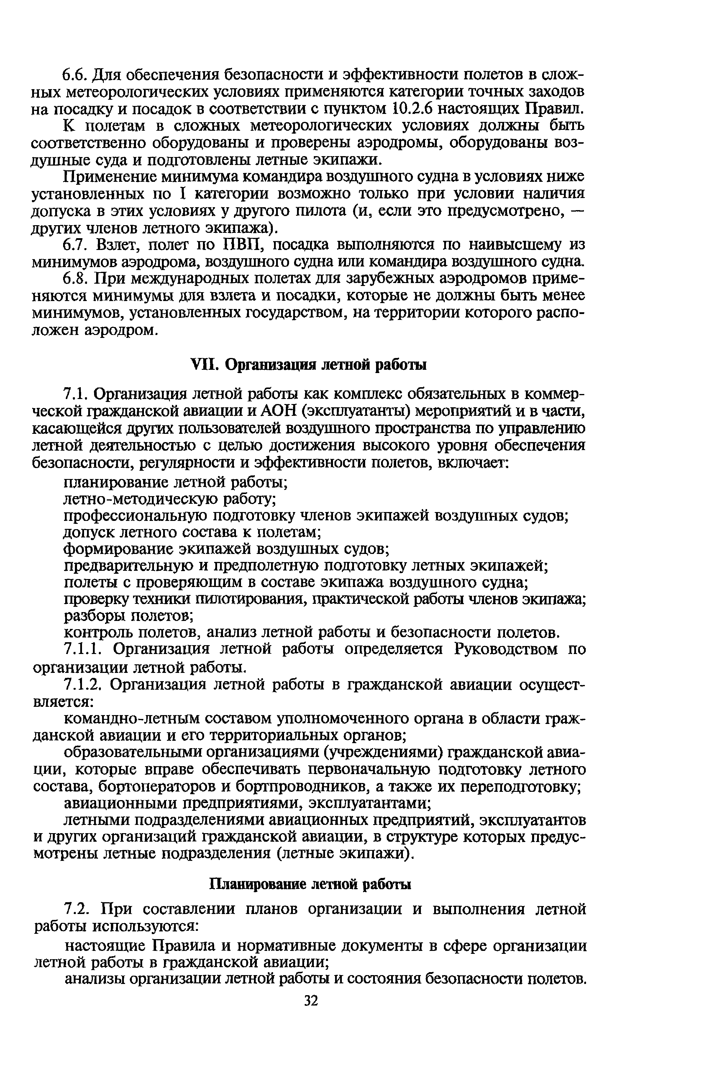 | Оглавление: | I. Общие положения II. Воздушные суда III. Экипаж воздушного судна IV. Аэродромы, аэропорты, вертодромы и посадочные площадки V. Классификация полетов в гражданской авиации VI. Минимумы Эксплуатационные минимумы аэродрома (вертодрома) Минимум командира воздушного судна Минимум вида авиационных работ VII. Организация летной работы Планирование летной работы Летно-методическая работа Профессиональная подготовка членов экипажей воздушных судов Допуск летного состава к полетам Формирование экипажей воздушных судов Предварительная и предполетная подготовка членов летных экипажей Полеты с проверяющими в составе экипажа воздушного судна Проверки техники пилотирования, практической работы членов экипажа Разборы полетов Контроль полетов, анализ летной работы и безопасности полетов VIII. Обеспечение полетов Аэронавигационное обслуживание полетов воздушных судов Навигационное (штурманское) обеспечение полетов Метеорологическое обеспечение полетов Инженерно-авиационное обеспечение Аэродромное обеспечение Авиатопливообеспечение Светотехническое обеспечение Радиотехническое обеспечение Орнитологическое обеспечение Организационное обеспечение перевозок, авиационных работ Организационное обеспечение полетов Обеспечение авиационной безопасности Авиационное медицинское обеспечение Аварийно-спасательное обеспечение IX. Воздушное пространство Российской Федерации. Организация и обслуживание (управление) воздушного движения в Российской Федерации Разрешительный и уведомительный порядок использования воздушного пространства Обслуживание (управление) воздушного движения X. Правила полетов Правила полетов по приборам Правила визуальных полетов, включая полеты по минимальным условиям ПВП Общие правила вылета, прилета воздушных судов и определение запасного аэродрома Особенности принятия решения на вылет и прилет по ППП Особенности принятия решения на вылет и прилет по ПВП Правила установки шкалы давления барометрического высотомера Правила определения и выдерживания безопасных высот полета Правила вертикального эшелонирования Правила продольного эшелонирования Правила бокового эшелонирования Правила изменения эшелона (высоты) полета и пересечения воздушной трассы, МВЛ и маршрута полета Правила полетов по воздушным трассам, МВЛ и установленным маршрутам Правила определения минимального количества топлива на полет и аэронавигационного запаса топлива Особенности полетов в воздушном пространстве приграничной полосы Российской Федерации и при пересечении государственной границы Российской Федерации Особенности производства полетов в районе аэродрома (аэроузла) и на контролируемых аэродромах Особенности в правилах выполнения особо важных и специальных рейсов (полетов) на вертолетах XI. Порядок выполнения полетов Буксировка, запуск, руление Взлет Набор высоты Выполнение полетов по воздушным трассам, МВЛ и маршрутам Снижение, заход на посадку и посадка Полеты на вертолетах Полеты на гидросамолетах Учебные и тренировочные полеты Полеты по перегонке воздушных судов, в том числе при групповых перелетах Испытательные, исследовательские и контрольные полеты (облеты) XII. Особенности организации и выполнения полетов в авиации общего назначения Общие правила выполнения полетов сверхлегк
