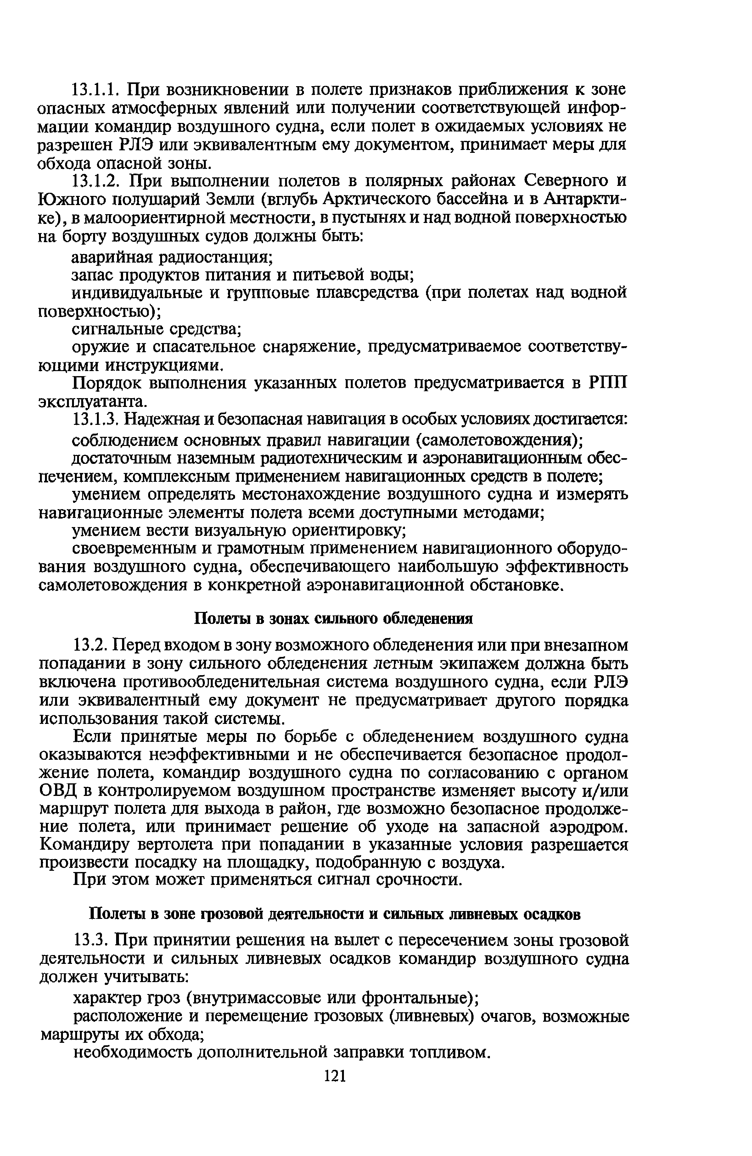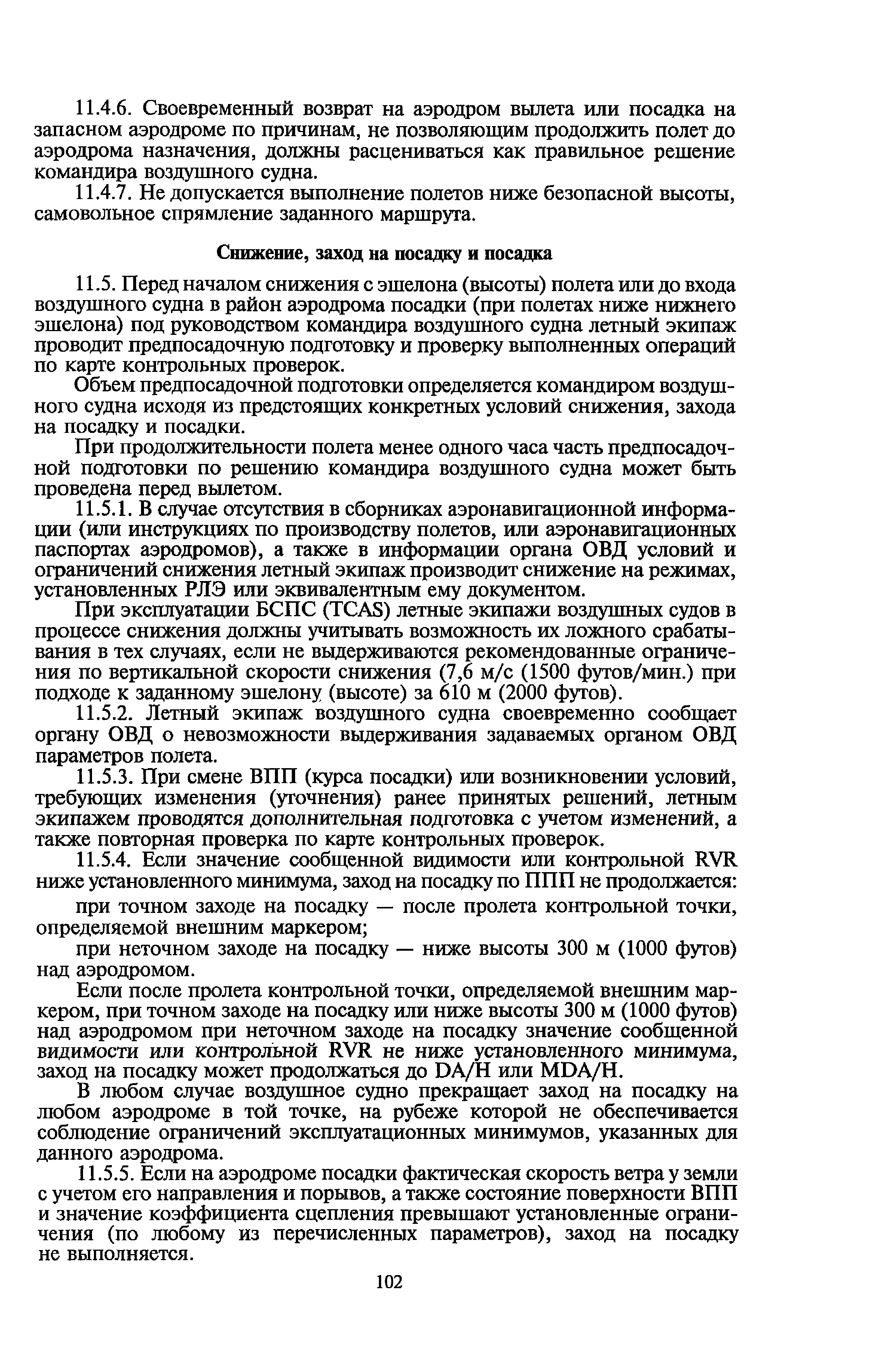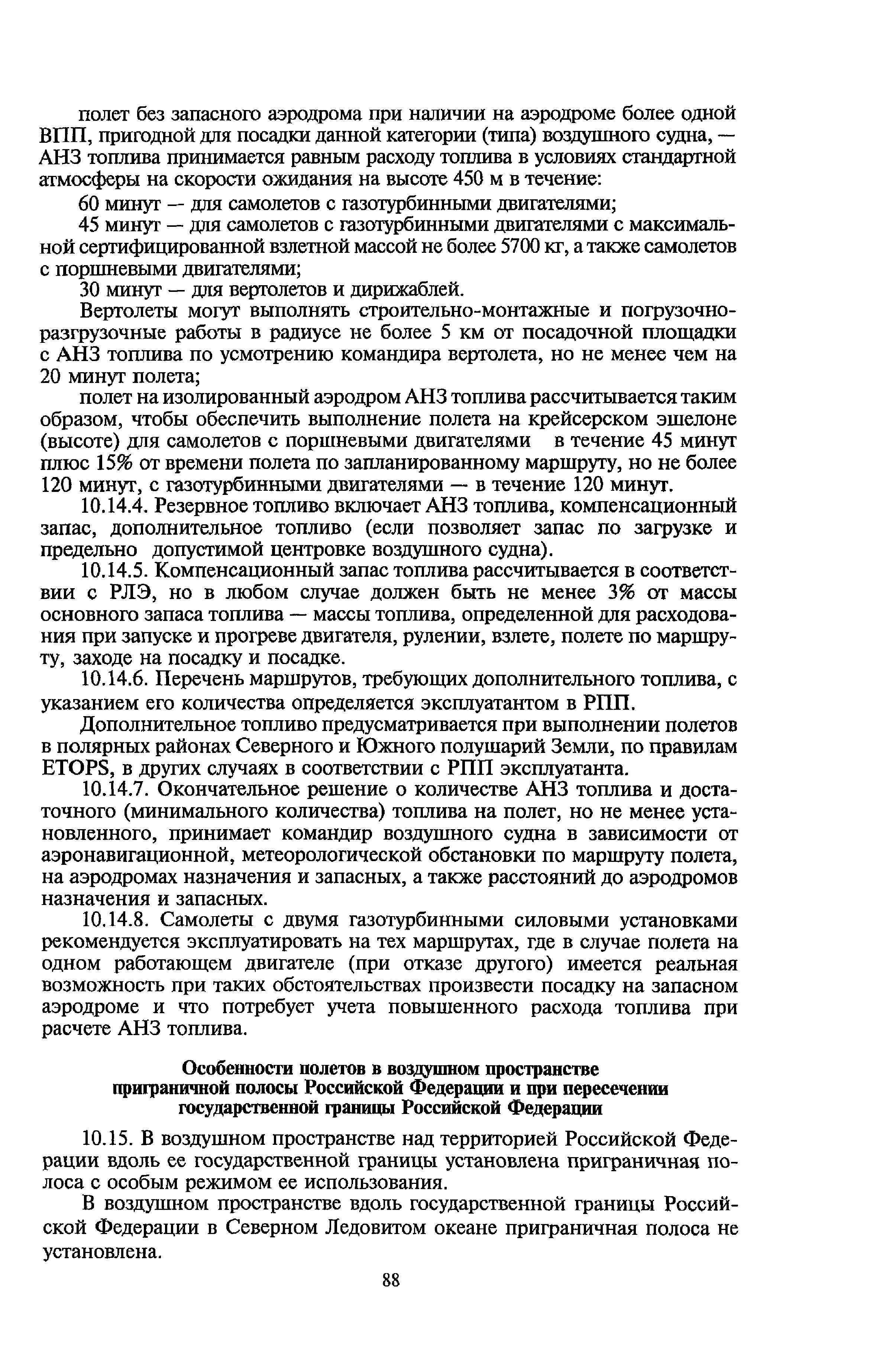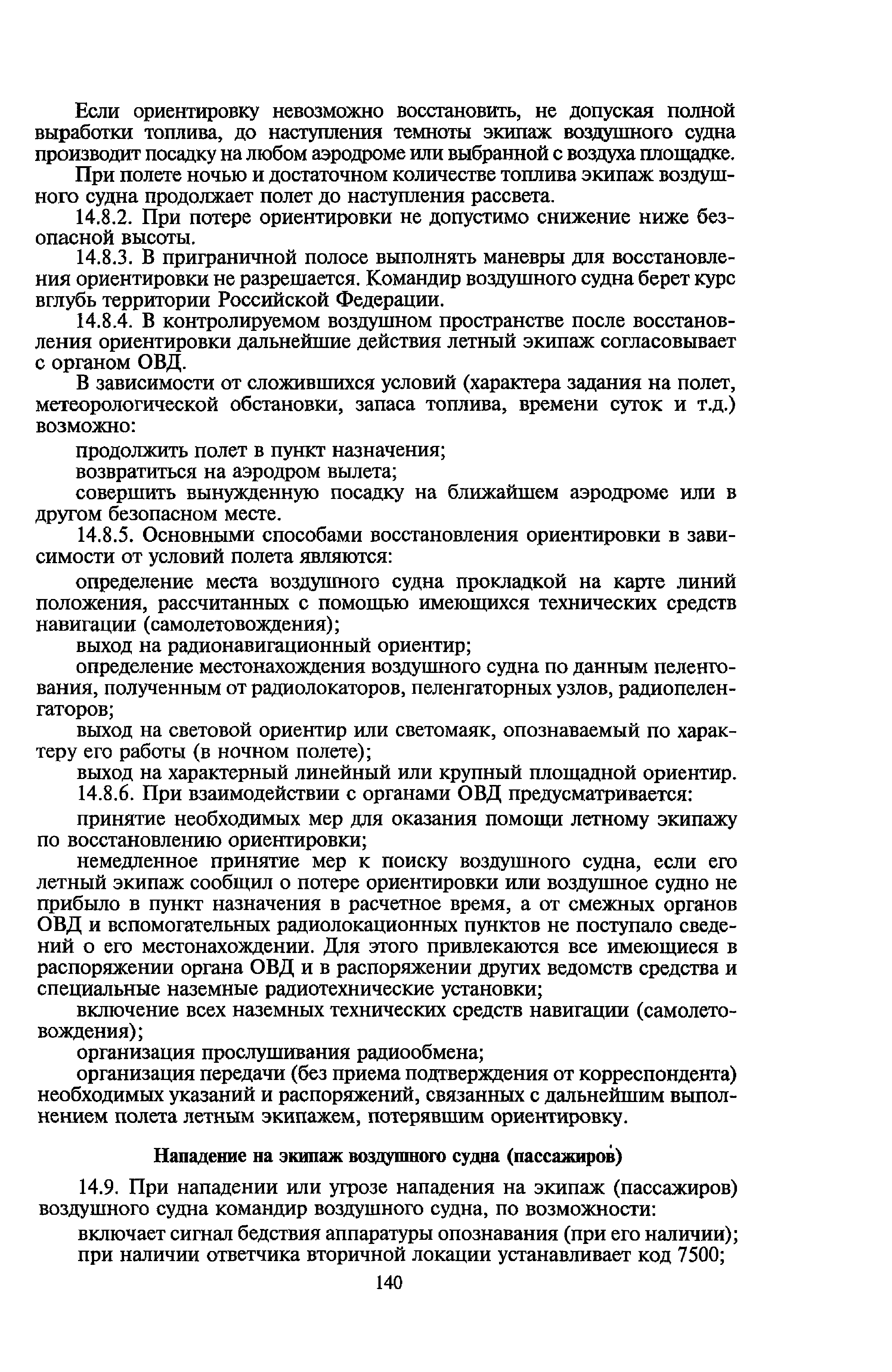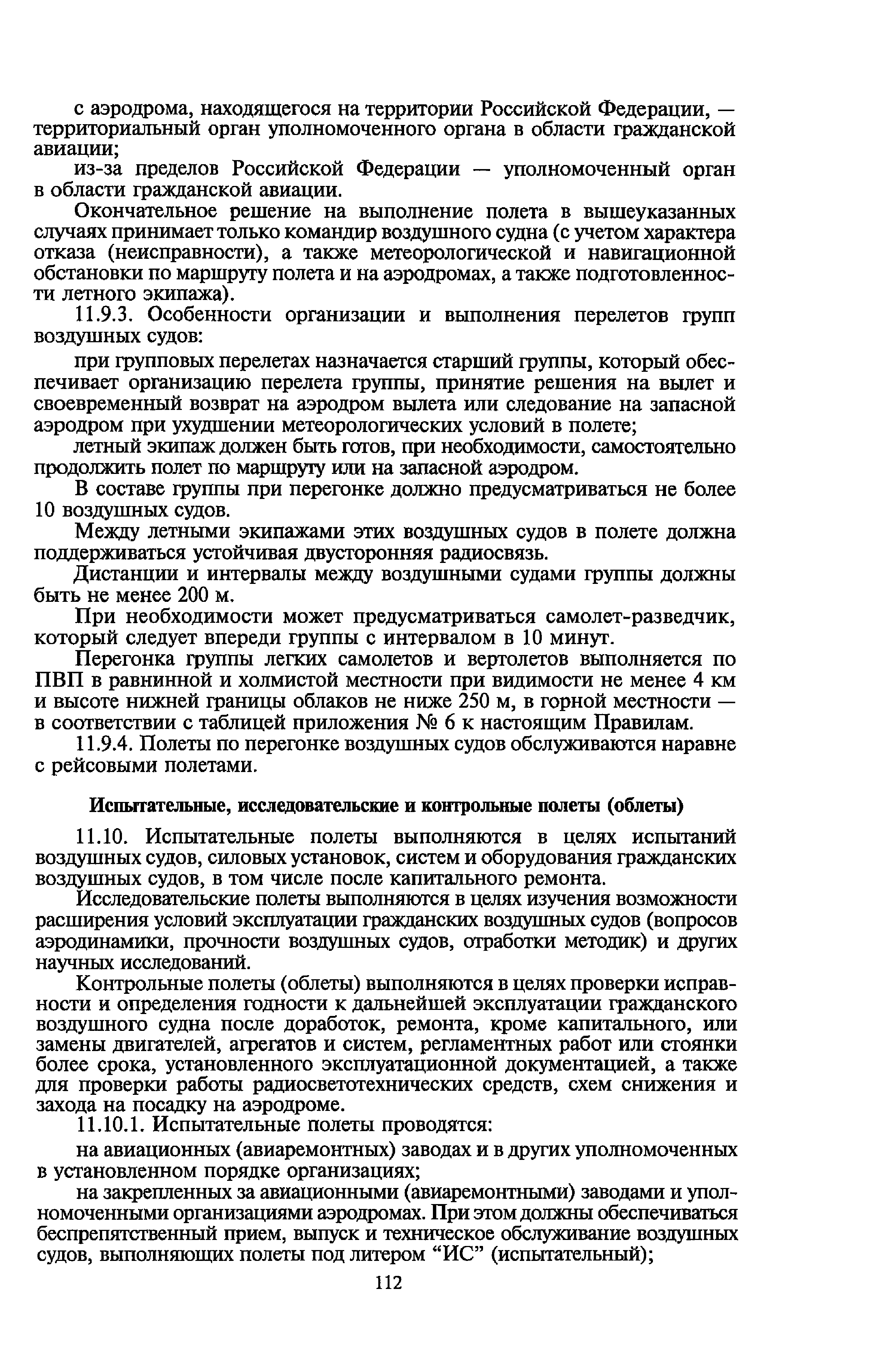 | Оглавление: | I. Общие положения II. Воздушные суда III. Экипаж воздушного судна IV. Аэродромы, аэропорты, вертодромы и посадочные площадки V. Классификация полетов в гражданской авиации VI. Минимумы Эксплуатационные минимумы аэродрома (вертодрома) Минимум командира воздушного судна Минимум вида авиационных работ VII. Организация летной работы Планирование летной работы Летно-методическая работа Профессиональная подготовка членов экипажей воздушных судов Допуск летного состава к полетам Формирование экипажей воздушных судов Предварительная и предполетная подготовка членов летных экипажей Полеты с проверяющими в составе экипажа воздушного судна Проверки техники пилотирования, практической работы членов экипажа Разборы полетов Контроль полетов, анализ летной работы и безопасности полетов VIII. Обеспечение полетов Аэронавигационное обслуживание полетов воздушных судов Навигационное (штурманское) обеспечение полетов Метеорологическое обеспечение полетов Инженерно-авиационное обеспечение Аэродромное обеспечение Авиатопливообеспечение Светотехническое обеспечение Радиотехническое обеспечение Орнитологическое обеспечение Организационное обеспечение перевозок, авиационных работ Организационное обеспечение полетов Обеспечение авиационной безопасности Авиационное медицинское обеспечение Аварийно-спасательное обеспечение IX. Воздушное пространство Российской Федерации. Организация и обслуживание (управление) воздушного движения в Российской Федерации Разрешительный и уведомительный порядок использования воздушного пространства Обслуживание (управление) воздушного движения X. Правила полетов Правила полетов по приборам Правила визуальных полетов, включая полеты по минимальным условиям ПВП Общие правила вылета, прилета воздушных судов и определение запасного аэродрома Особенности принятия решения на вылет и прилет по ППП Особенности принятия решения на вылет и прилет по ПВП Правила установки шкалы давления барометрического высотомера Правила определения и выдерживания безопасных высот полета Правила вертикального эшелонирования Правила продольного эшелонирования Правила бокового эшелонирования Правила изменения эшелона (высоты) полета и пересечения воздушной трассы, МВЛ и маршрута полета Правила полетов по воздушным трассам, МВЛ и установленным маршрутам Правила определения минимального количества топлива на полет и аэронавигационного запаса топлива Особенности полетов в воздушном пространстве приграничной полосы Российской Федерации и при пересечении государственной границы Российской Федерации Особенности производства полетов в районе аэродрома (аэроузла) и на контролируемых аэродромах Особенности в правилах выполнения особо важных и специальных рейсов (полетов) на вертолетах XI. Порядок выполнения полетов Буксировка, запуск, руление Взлет Набор высоты Выполнение полетов по воздушным трассам, МВЛ и маршрутам Снижение, заход на посадку и посадка Полеты на вертолетах Полеты на гидросамолетах Учебные и тренировочные полеты Полеты по перегонке воздушных судов, в том числе при групповых перелетах Испытательные, исследовательские и контрольные полеты (облеты) XII. Особенности организации и выполнения полетов в авиации общего назначения Общие правила выполнения полетов сверхлегк