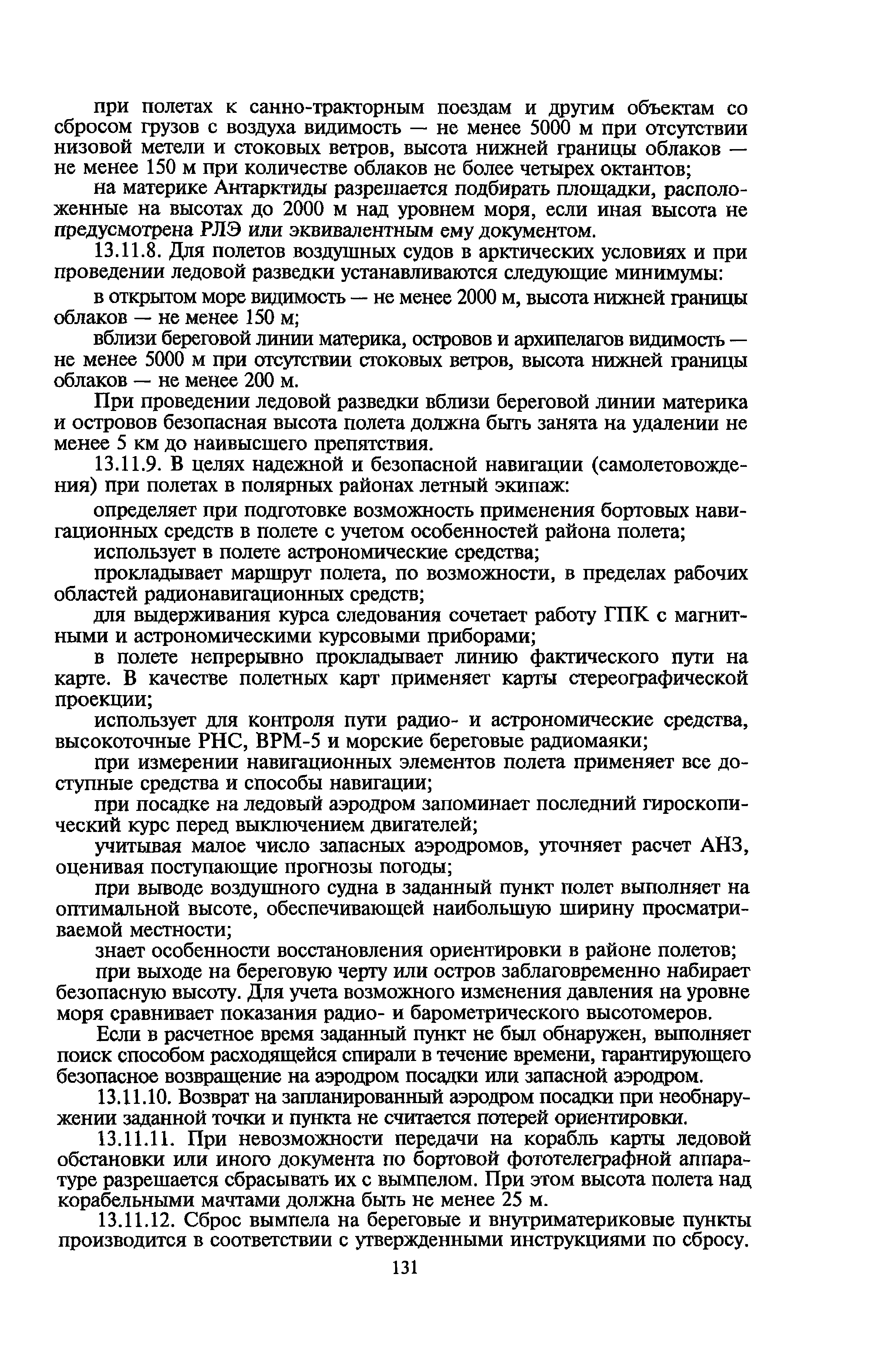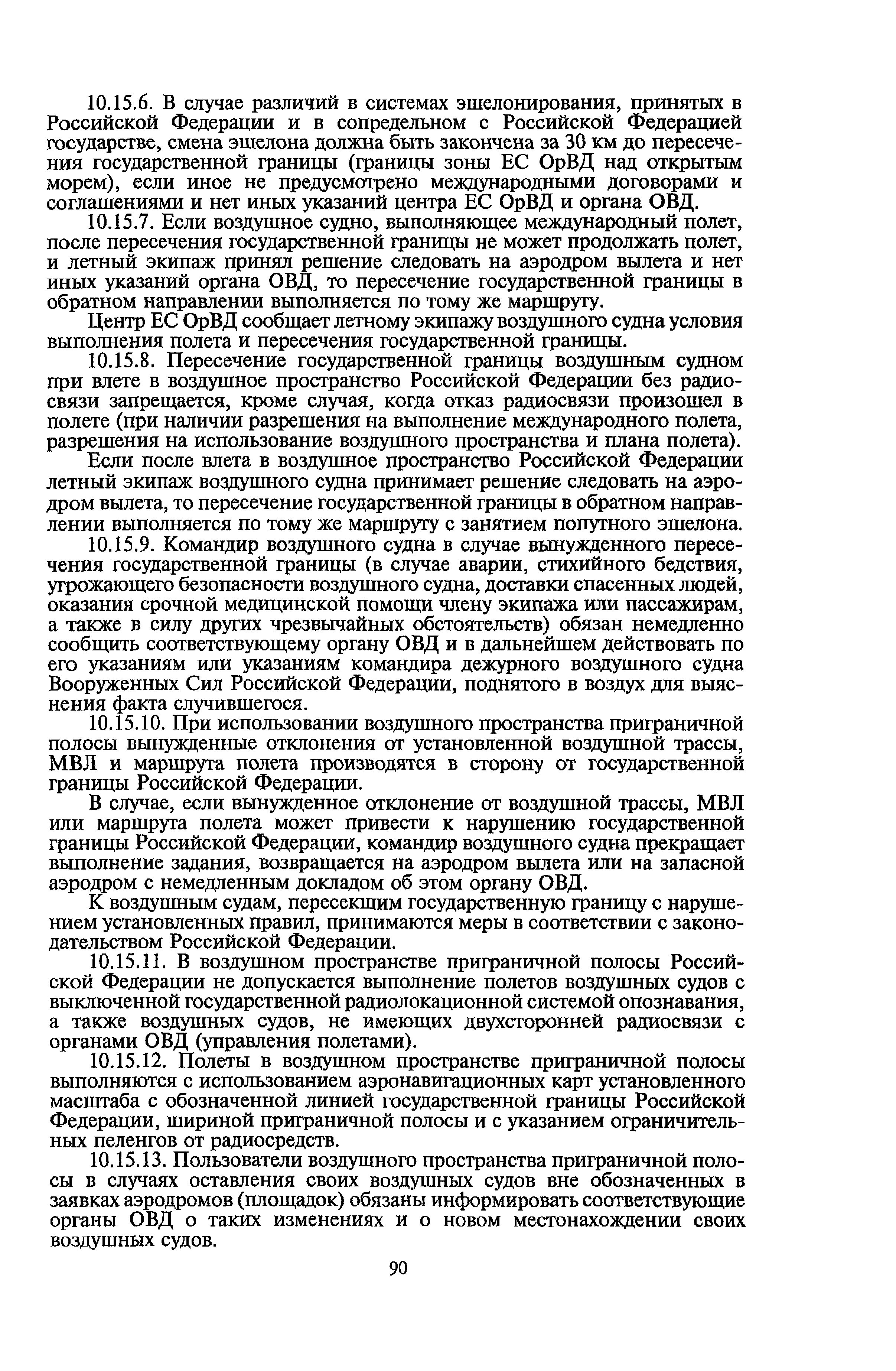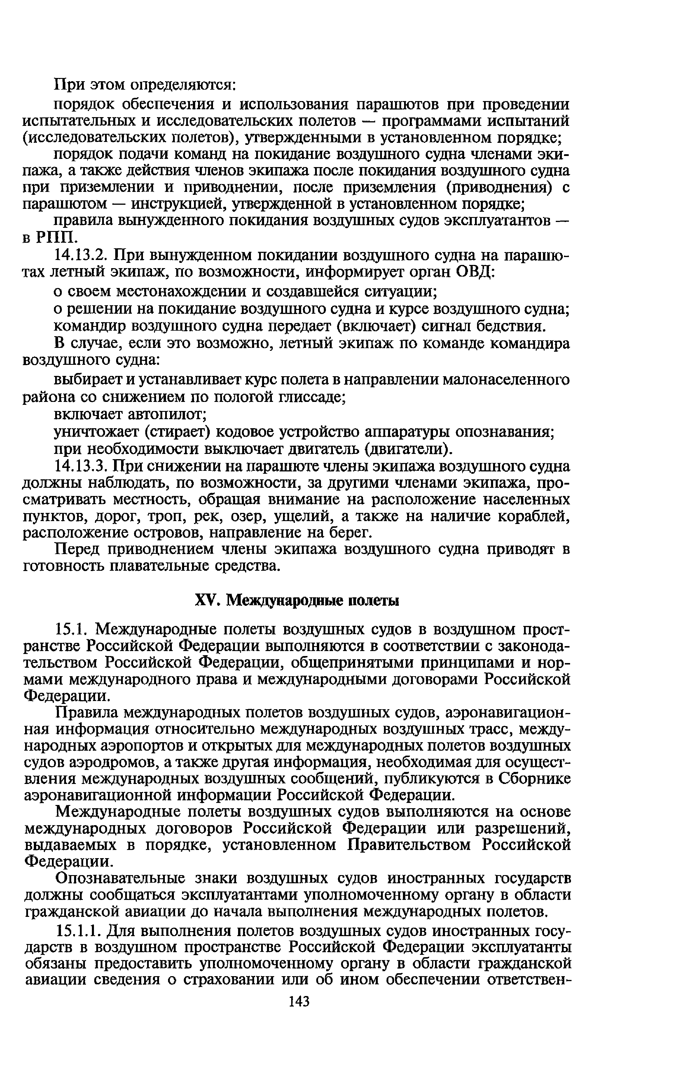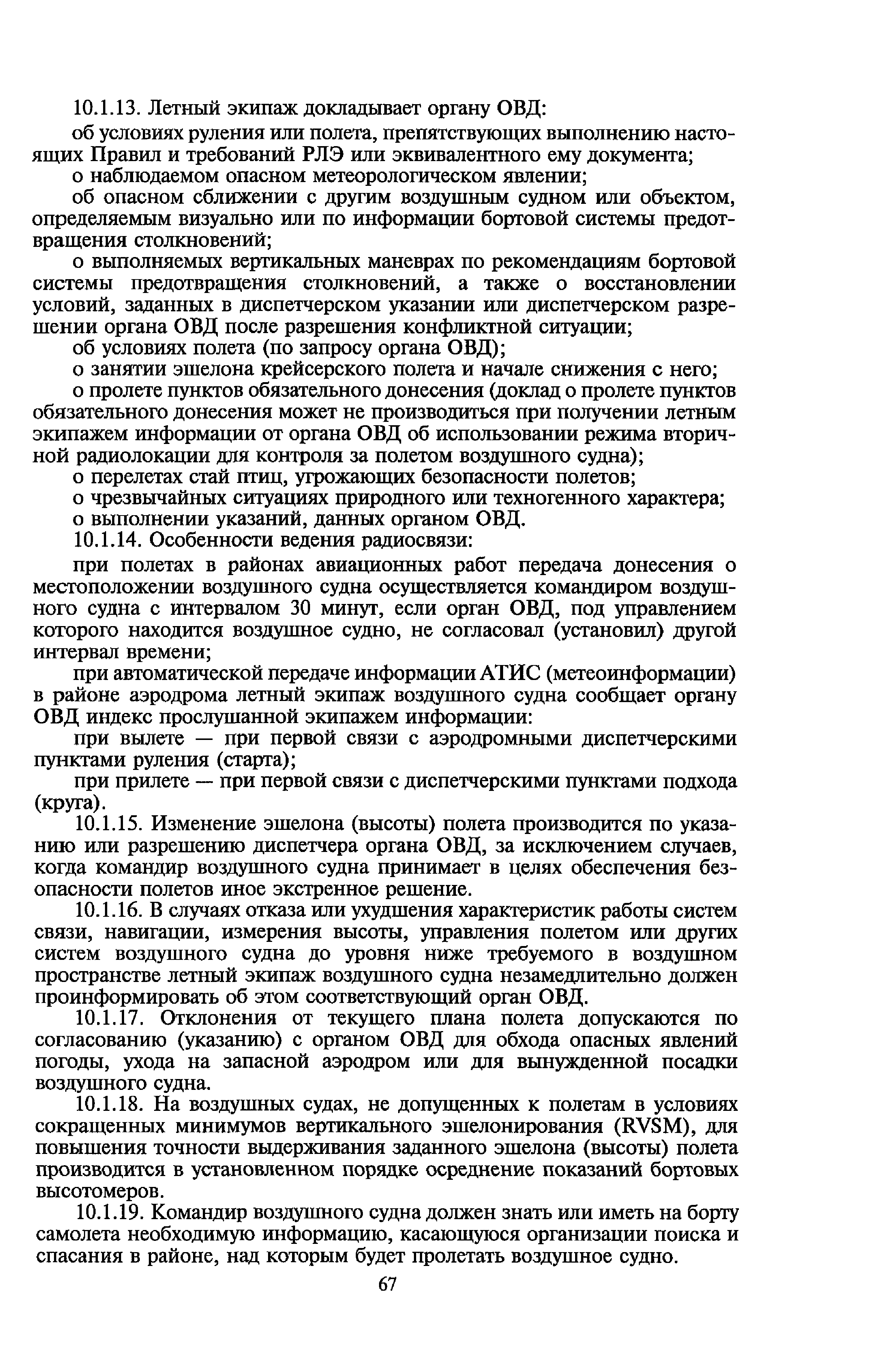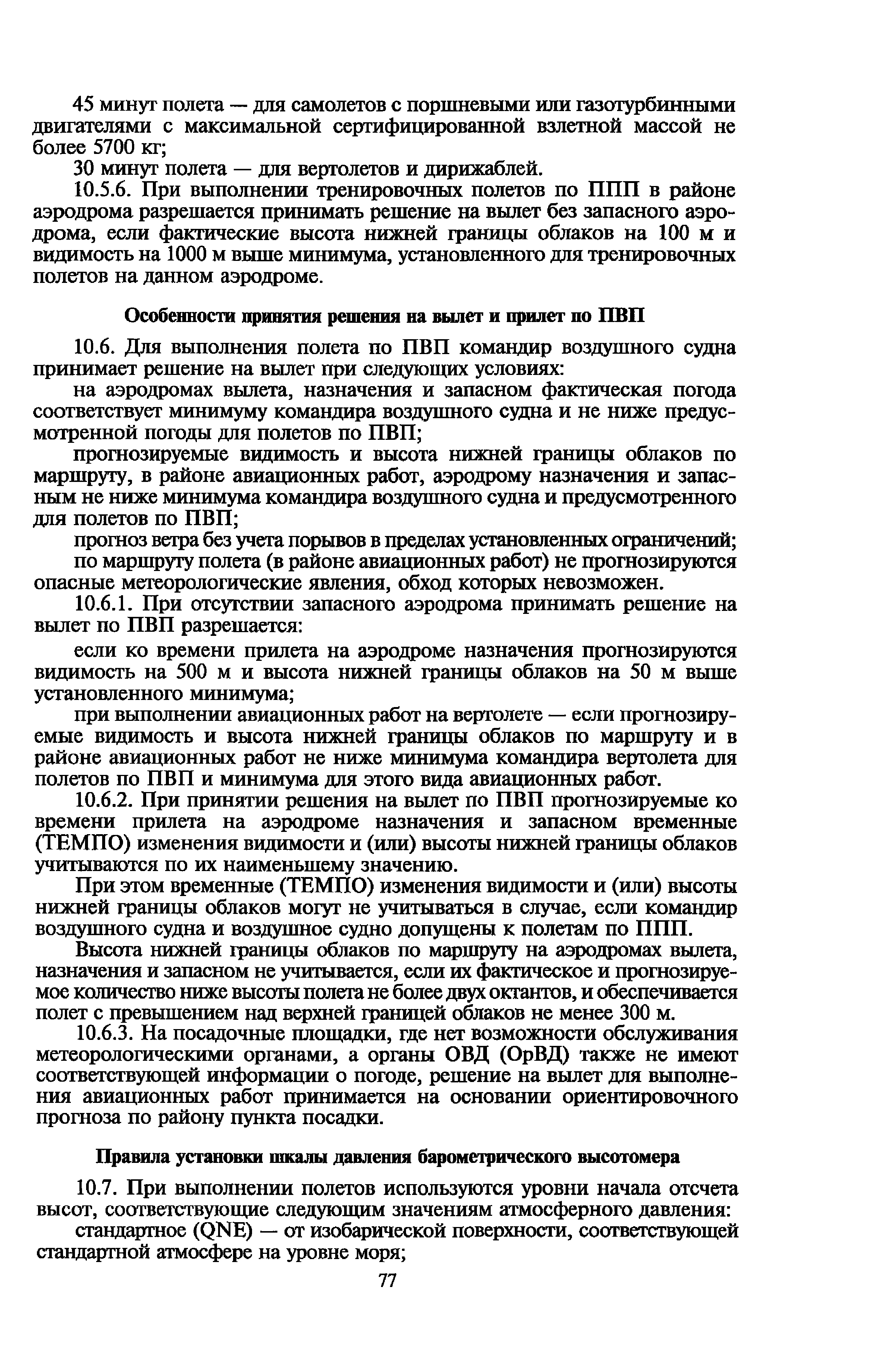 | Оглавление: | I. Общие положения II. Воздушные суда III. Экипаж воздушного судна IV. Аэродромы, аэропорты, вертодромы и посадочные площадки V. Классификация полетов в гражданской авиации VI. Минимумы Эксплуатационные минимумы аэродрома (вертодрома) Минимум командира воздушного судна Минимум вида авиационных работ VII. Организация летной работы Планирование летной работы Летно-методическая работа Профессиональная подготовка членов экипажей воздушных судов Допуск летного состава к полетам Формирование экипажей воздушных судов Предварительная и предполетная подготовка членов летных экипажей Полеты с проверяющими в составе экипажа воздушного судна Проверки техники пилотирования, практической работы членов экипажа Разборы полетов Контроль полетов, анализ летной работы и безопасности полетов VIII. Обеспечение полетов Аэронавигационное обслуживание полетов воздушных судов Навигационное (штурманское) обеспечение полетов Метеорологическое обеспечение полетов Инженерно-авиационное обеспечение Аэродромное обеспечение Авиатопливообеспечение Светотехническое обеспечение Радиотехническое обеспечение Орнитологическое обеспечение Организационное обеспечение перевозок, авиационных работ Организационное обеспечение полетов Обеспечение авиационной безопасности Авиационное медицинское обеспечение Аварийно-спасательное обеспечение IX. Воздушное пространство Российской Федерации. Организация и обслуживание (управление) воздушного движения в Российской Федерации Разрешительный и уведомительный порядок использования воздушного пространства Обслуживание (управление) воздушного движения X. Правила полетов Правила полетов по приборам Правила визуальных полетов, включая полеты по минимальным условиям ПВП Общие правила вылета, прилета воздушных судов и определение запасного аэродрома Особенности принятия решения на вылет и прилет по ППП Особенности принятия решения на вылет и прилет по ПВП Правила установки шкалы давления барометрического высотомера Правила определения и выдерживания безопасных высот полета Правила вертикального эшелонирования Правила продольного эшелонирования Правила бокового эшелонирования Правила изменения эшелона (высоты) полета и пересечения воздушной трассы, МВЛ и маршрута полета Правила полетов по воздушным трассам, МВЛ и установленным маршрутам Правила определения минимального количества топлива на полет и аэронавигационного запаса топлива Особенности полетов в воздушном пространстве приграничной полосы Российской Федерации и при пересечении государственной границы Российской Федерации Особенности производства полетов в районе аэродрома (аэроузла) и на контролируемых аэродромах Особенности в правилах выполнения особо важных и специальных рейсов (полетов) на вертолетах XI. Порядок выполнения полетов Буксировка, запуск, руление Взлет Набор высоты Выполнение полетов по воздушным трассам, МВЛ и маршрутам Снижение, заход на посадку и посадка Полеты на вертолетах Полеты на гидросамолетах Учебные и тренировочные полеты Полеты по перегонке воздушных судов, в том числе при групповых перелетах Испытательные, исследовательские и контрольные полеты (облеты) XII. Особенности организации и выполнения полетов в авиации общего назначения Общие правила выполнения полетов сверхлегк