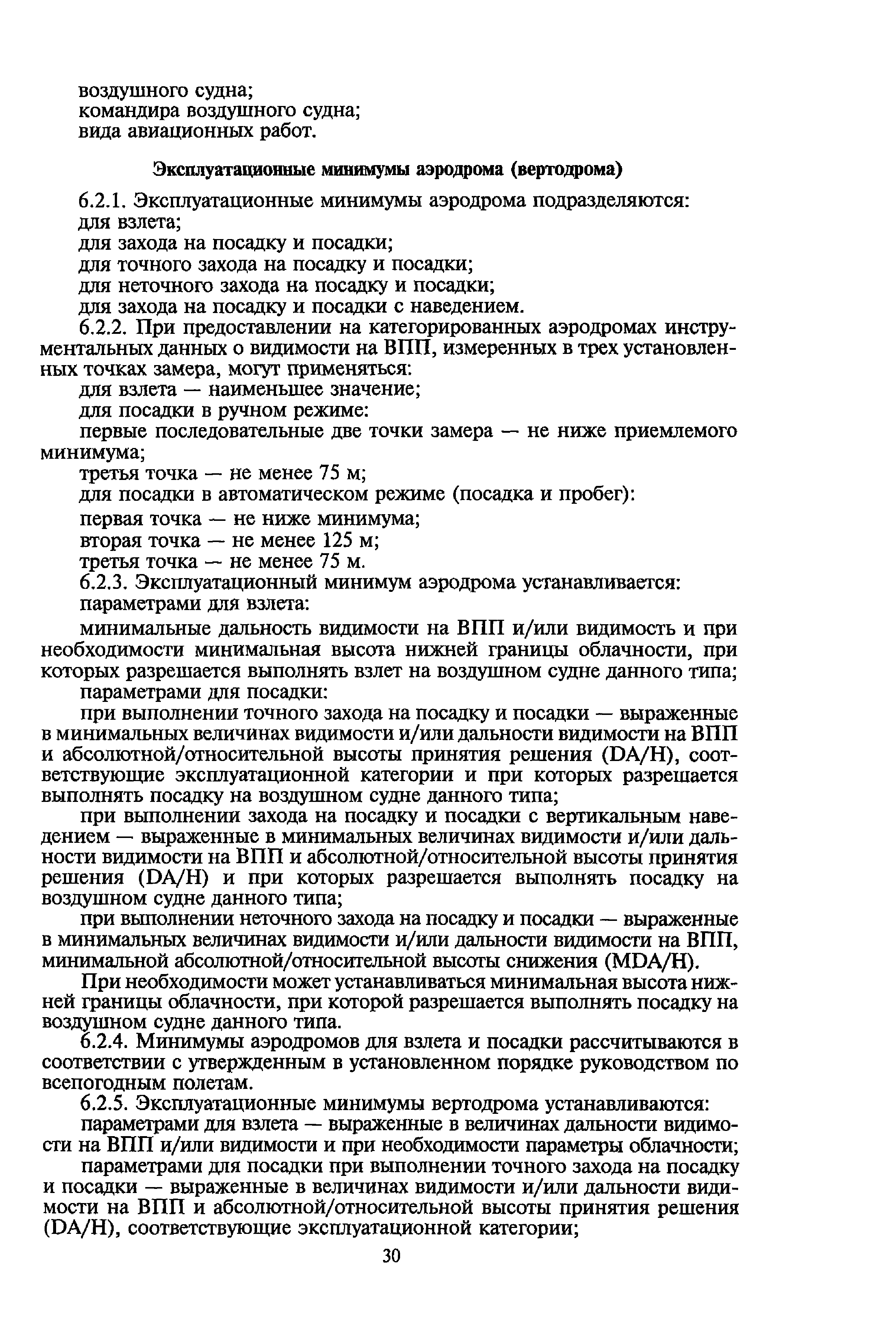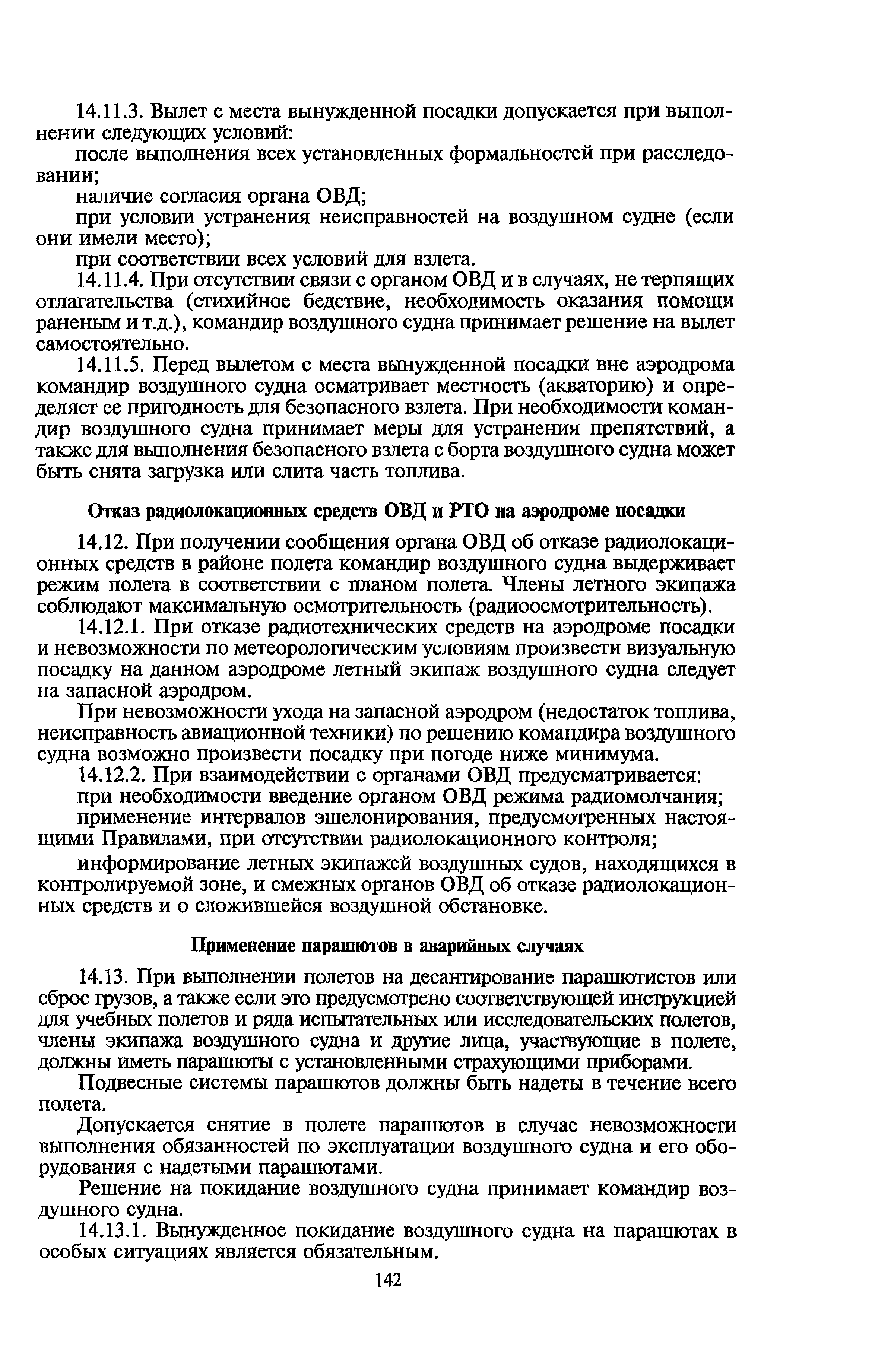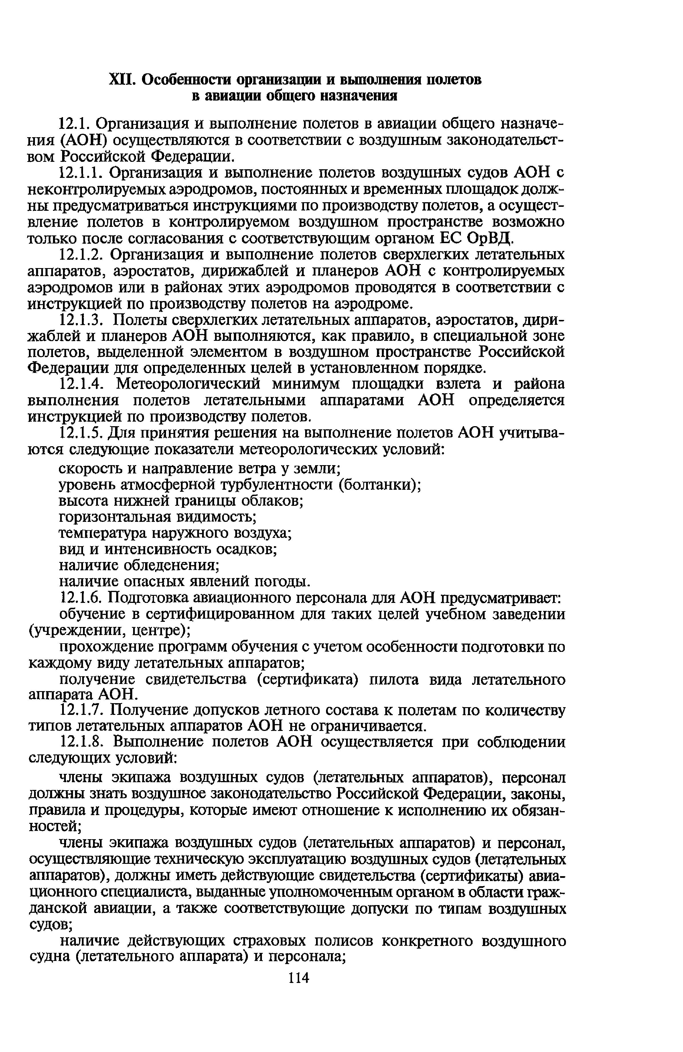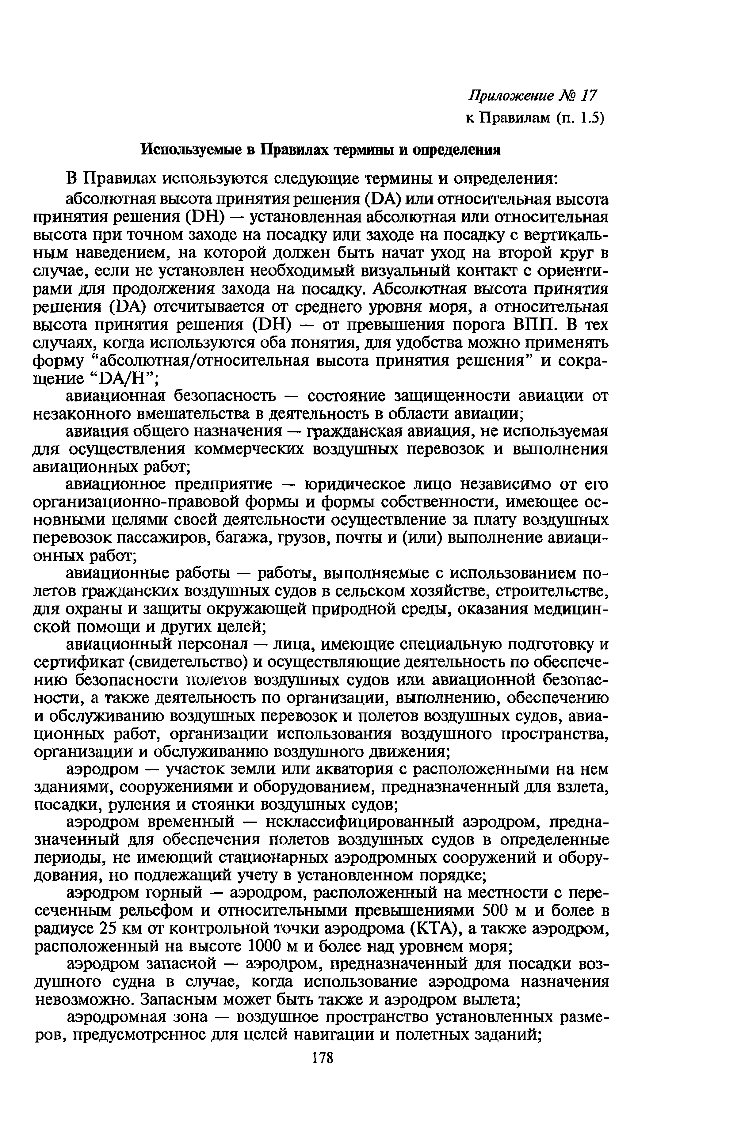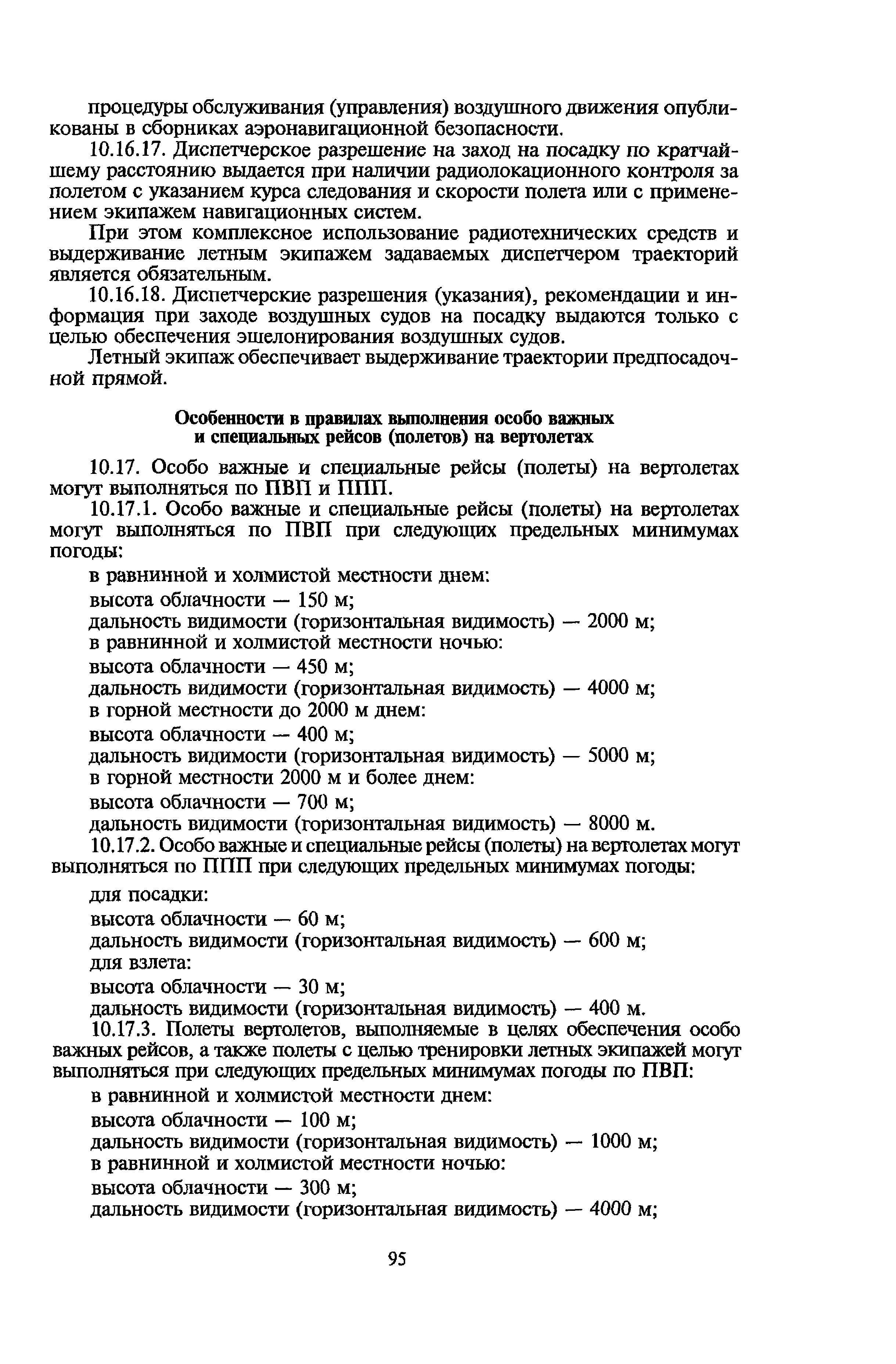 | Оглавление: | I. Общие положения II. Воздушные суда III. Экипаж воздушного судна IV. Аэродромы, аэропорты, вертодромы и посадочные площадки V. Классификация полетов в гражданской авиации VI. Минимумы Эксплуатационные минимумы аэродрома (вертодрома) Минимум командира воздушного судна Минимум вида авиационных работ VII. Организация летной работы Планирование летной работы Летно-методическая работа Профессиональная подготовка членов экипажей воздушных судов Допуск летного состава к полетам Формирование экипажей воздушных судов Предварительная и предполетная подготовка членов летных экипажей Полеты с проверяющими в составе экипажа воздушного судна Проверки техники пилотирования, практической работы членов экипажа Разборы полетов Контроль полетов, анализ летной работы и безопасности полетов VIII. Обеспечение полетов Аэронавигационное обслуживание полетов воздушных судов Навигационное (штурманское) обеспечение полетов Метеорологическое обеспечение полетов Инженерно-авиационное обеспечение Аэродромное обеспечение Авиатопливообеспечение Светотехническое обеспечение Радиотехническое обеспечение Орнитологическое обеспечение Организационное обеспечение перевозок, авиационных работ Организационное обеспечение полетов Обеспечение авиационной безопасности Авиационное медицинское обеспечение Аварийно-спасательное обеспечение IX. Воздушное пространство Российской Федерации. Организация и обслуживание (управление) воздушного движения в Российской Федерации Разрешительный и уведомительный порядок использования воздушного пространства Обслуживание (управление) воздушного движения X. Правила полетов Правила полетов по приборам Правила визуальных полетов, включая полеты по минимальным условиям ПВП Общие правила вылета, прилета воздушных судов и определение запасного аэродрома Особенности принятия решения на вылет и прилет по ППП Особенности принятия решения на вылет и прилет по ПВП Правила установки шкалы давления барометрического высотомера Правила определения и выдерживания безопасных высот полета Правила вертикального эшелонирования Правила продольного эшелонирования Правила бокового эшелонирования Правила изменения эшелона (высоты) полета и пересечения воздушной трассы, МВЛ и маршрута полета Правила полетов по воздушным трассам, МВЛ и установленным маршрутам Правила определения минимального количества топлива на полет и аэронавигационного запаса топлива Особенности полетов в воздушном пространстве приграничной полосы Российской Федерации и при пересечении государственной границы Российской Федерации Особенности производства полетов в районе аэродрома (аэроузла) и на контролируемых аэродромах Особенности в правилах выполнения особо важных и специальных рейсов (полетов) на вертолетах XI. Порядок выполнения полетов Буксировка, запуск, руление Взлет Набор высоты Выполнение полетов по воздушным трассам, МВЛ и маршрутам Снижение, заход на посадку и посадка Полеты на вертолетах Полеты на гидросамолетах Учебные и тренировочные полеты Полеты по перегонке воздушных судов, в том числе при групповых перелетах Испытательные, исследовательские и контрольные полеты (облеты) XII. Особенности организации и выполнения полетов в авиации общего назначения Общие правила выполнения полетов сверхлегк