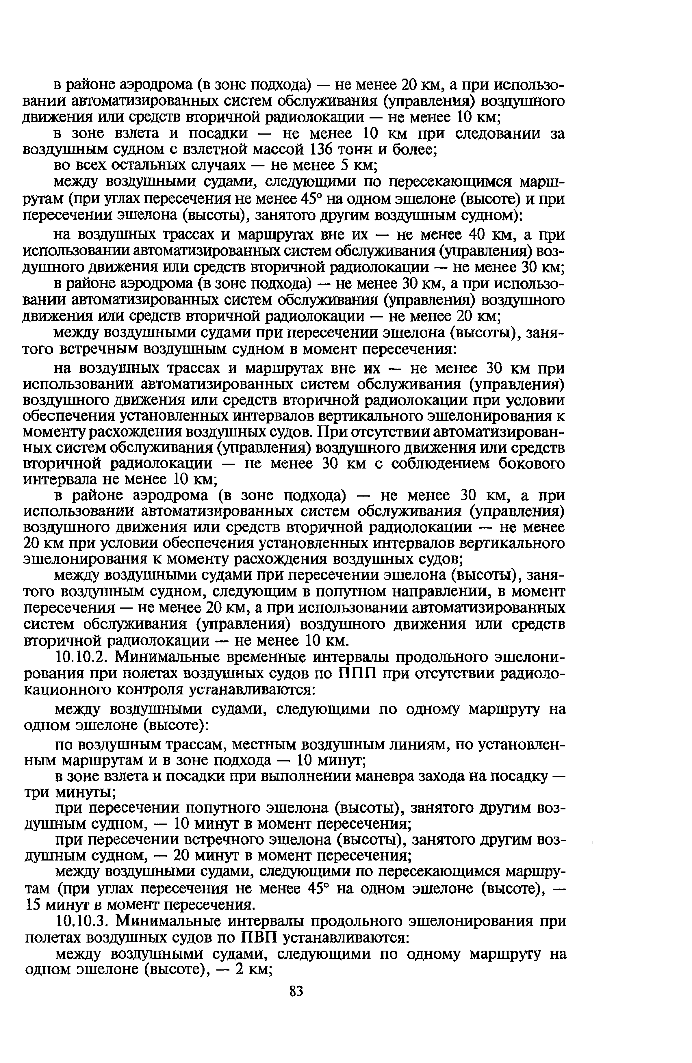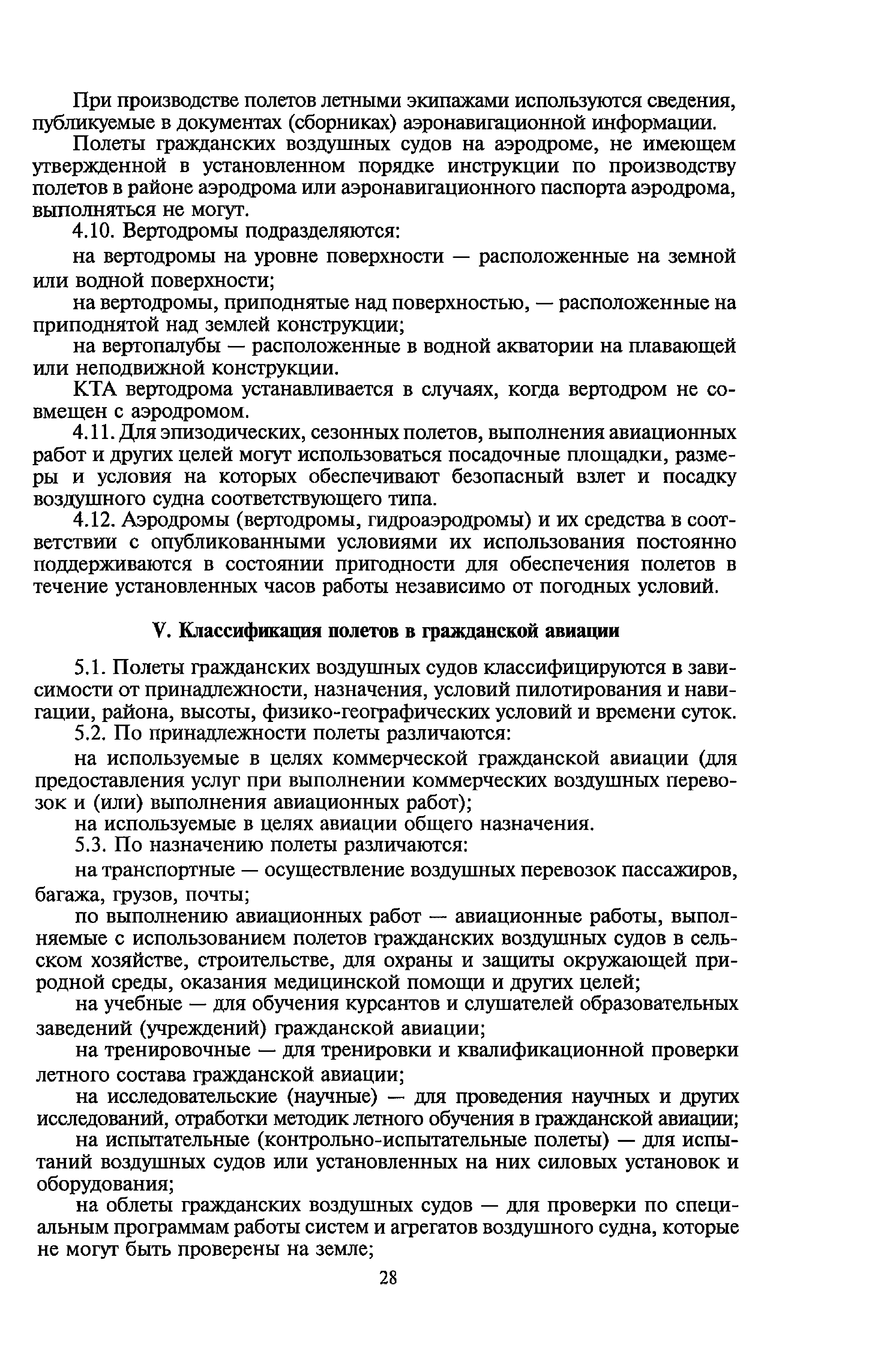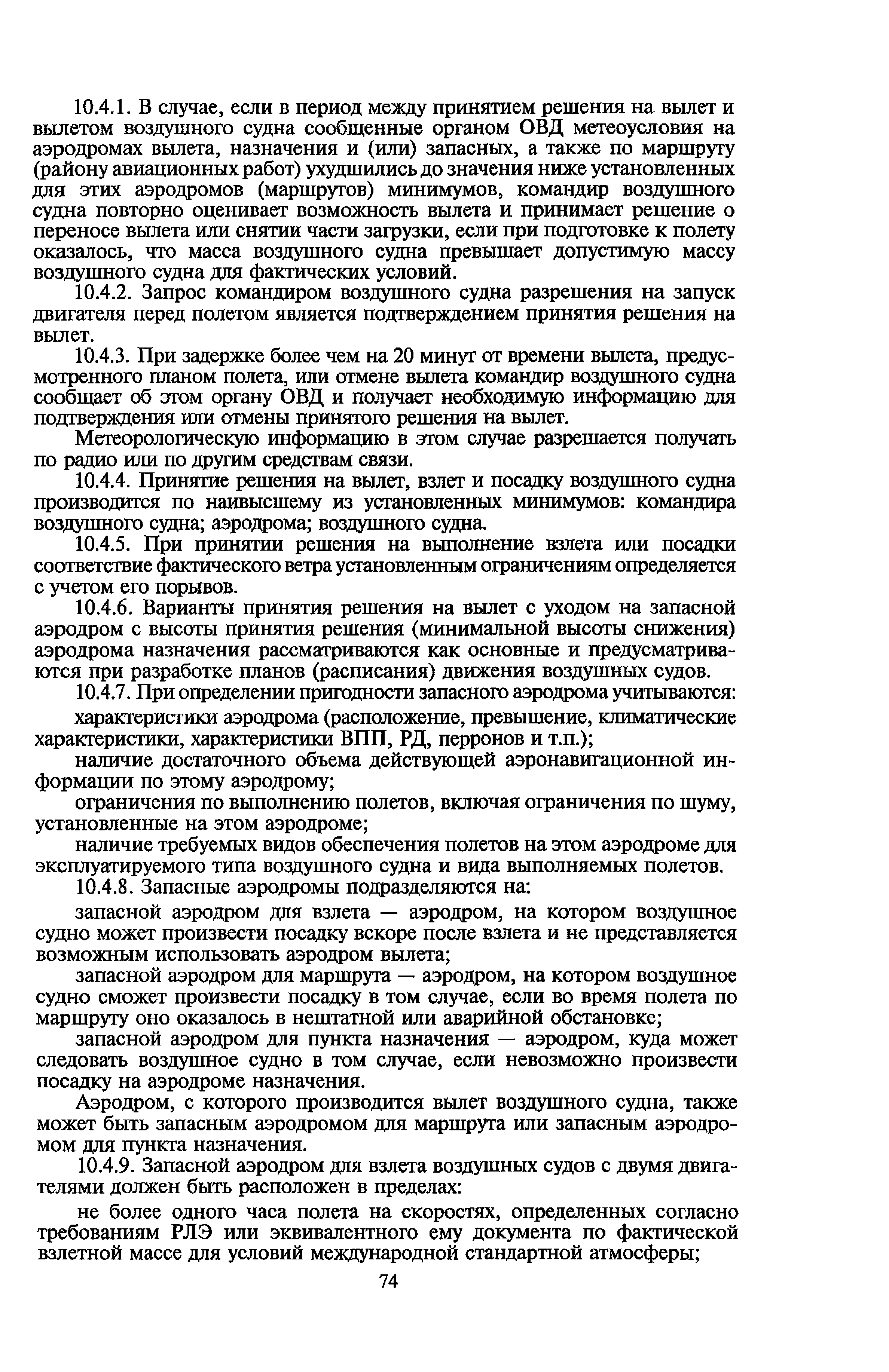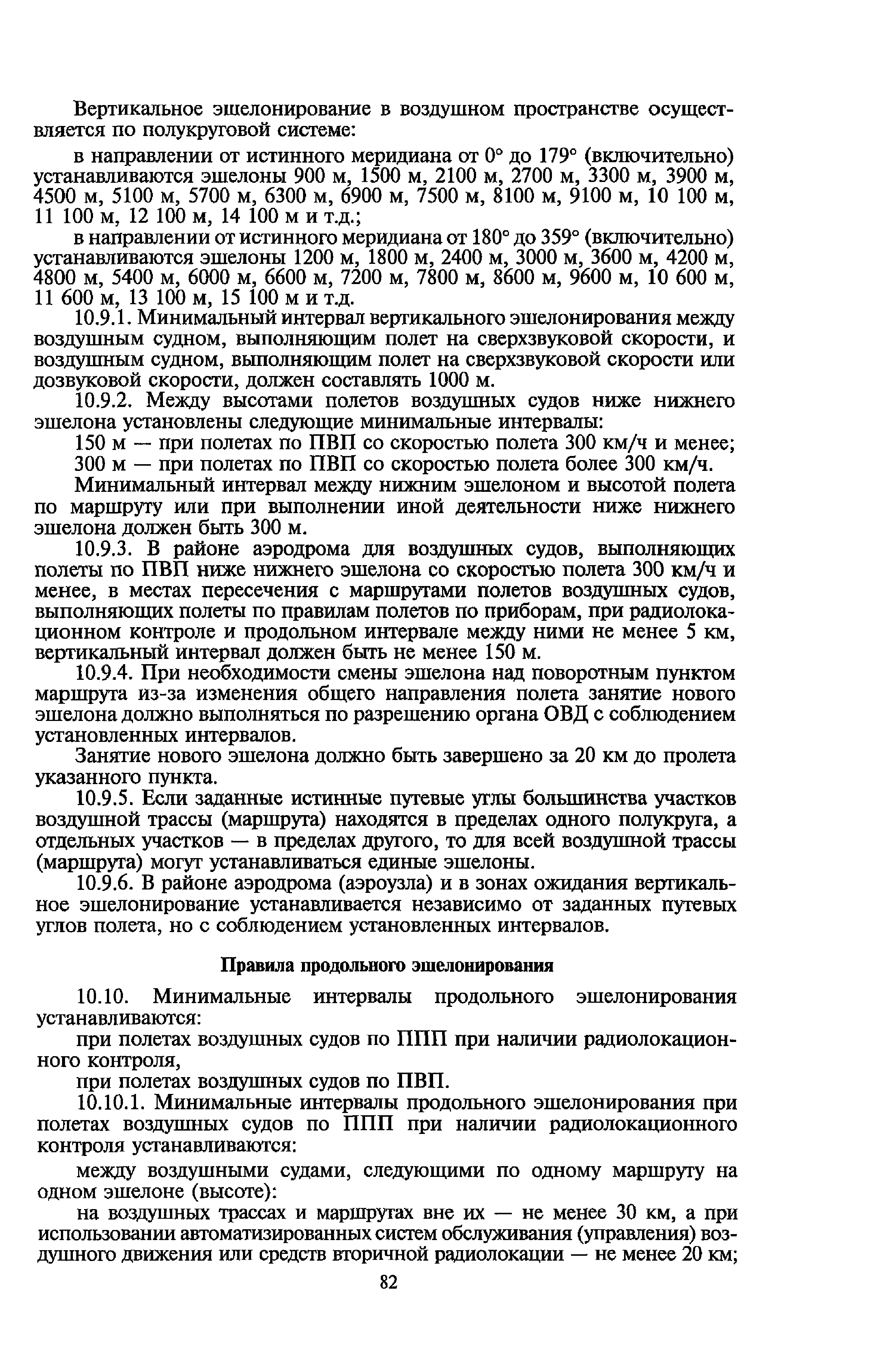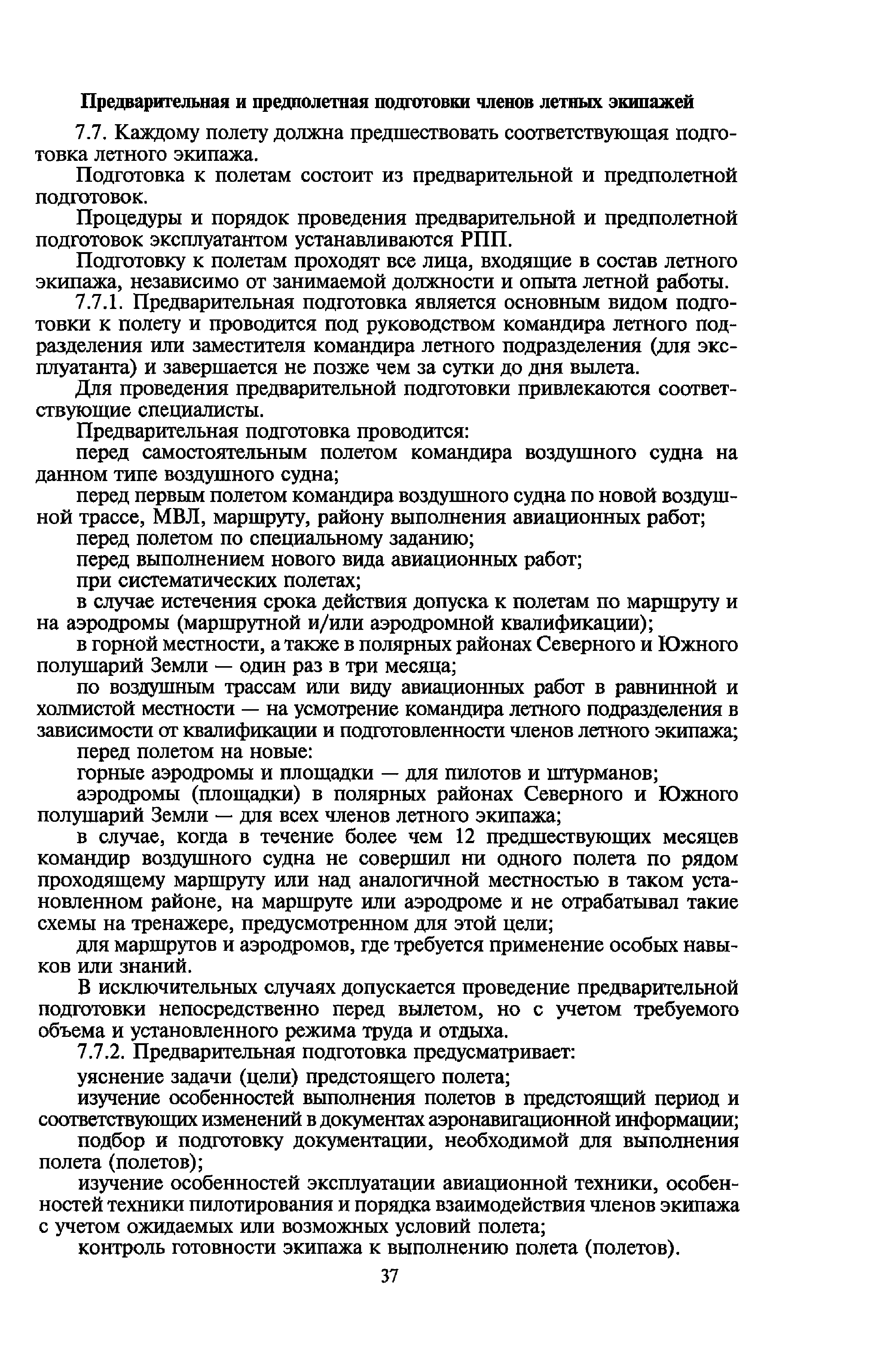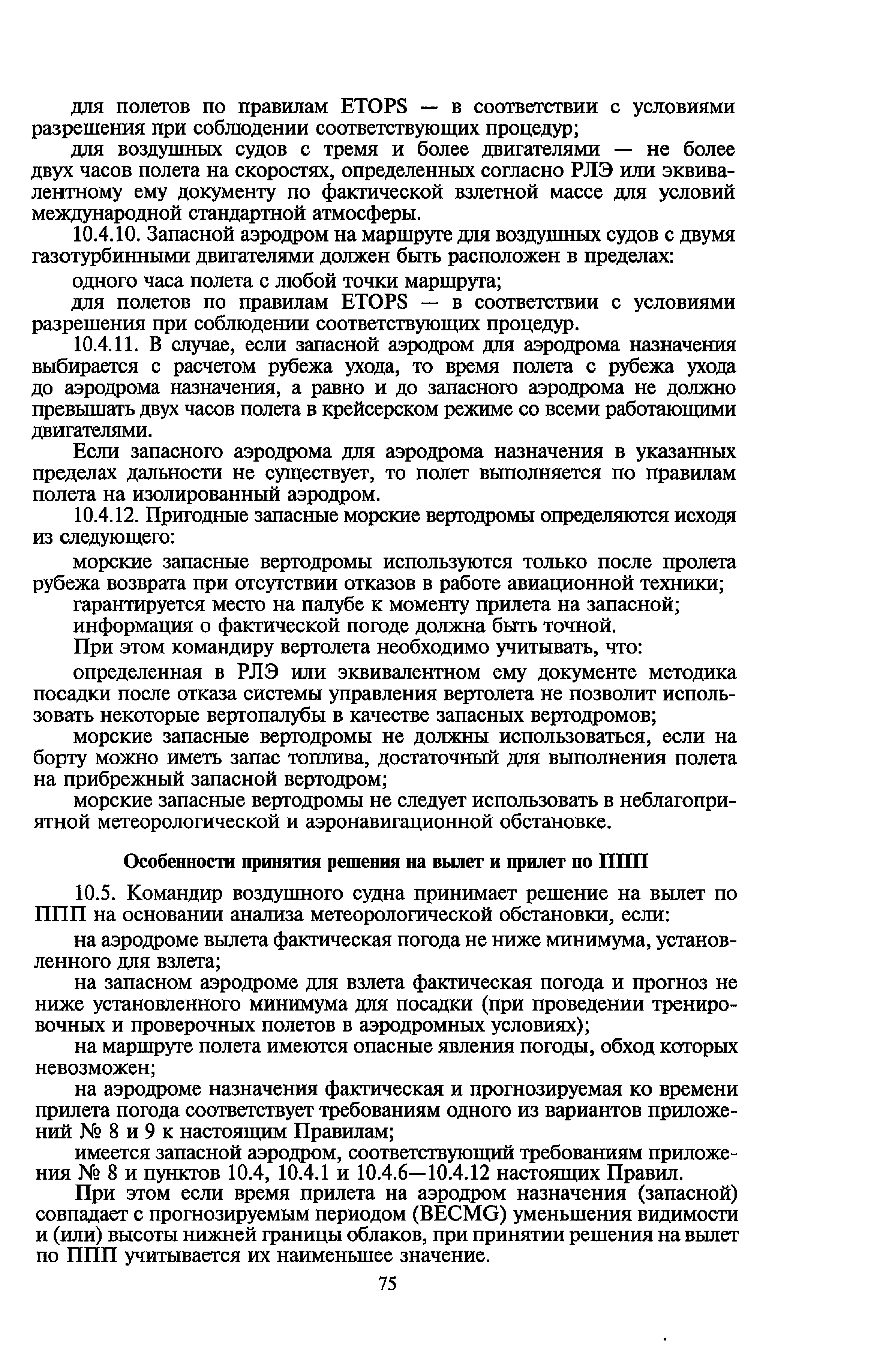| Оглавление: | I. Общие положения II. Воздушные суда III. Экипаж воздушного судна IV. Аэродромы, аэропорты, вертодромы и посадочные площадки V. Классификация полетов в гражданской авиации VI. Минимумы Эксплуатационные минимумы аэродрома (вертодрома) Минимум командира воздушного судна Минимум вида авиационных работ VII. Организация летной работы Планирование летной работы Летно-методическая работа Профессиональная подготовка членов экипажей воздушных судов Допуск летного состава к полетам Формирование экипажей воздушных судов Предварительная и предполетная подготовка членов летных экипажей Полеты с проверяющими в составе экипажа воздушного судна Проверки техники пилотирования, практической работы членов экипажа Разборы полетов Контроль полетов, анализ летной работы и безопасности полетов VIII. Обеспечение полетов Аэронавигационное обслуживание полетов воздушных судов Навигационное (штурманское) обеспечение полетов Метеорологическое обеспечение полетов Инженерно-авиационное обеспечение Аэродромное обеспечение Авиатопливообеспечение Светотехническое обеспечение Радиотехническое обеспечение Орнитологическое обеспечение Организационное обеспечение перевозок, авиационных работ Организационное обеспечение полетов Обеспечение авиационной безопасности Авиационное медицинское обеспечение Аварийно-спасательное обеспечение IX. Воздушное пространство Российской Федерации. Организация и обслуживание (управление) воздушного движения в Российской Федерации Разрешительный и уведомительный порядок использования воздушного пространства Обслуживание (управление) воздушного движения X. Правила полетов Правила полетов по приборам Правила визуальных полетов, включая полеты по минимальным условиям ПВП Общие правила вылета, прилета воздушных судов и определение запасного аэродрома Особенности принятия решения на вылет и прилет по ППП Особенности принятия решения на вылет и прилет по ПВП Правила установки шкалы давления барометрического высотомера Правила определения и выдерживания безопасных высот полета Правила вертикального эшелонирования Правила продольного эшелонирования Правила бокового эшелонирования Правила изменения эшелона (высоты) полета и пересечения воздушной трассы, МВЛ и маршрута полета Правила полетов по воздушным трассам, МВЛ и установленным маршрутам Правила определения минимального количества топлива на полет и аэронавигационного запаса топлива Особенности полетов в воздушном пространстве приграничной полосы Российской Федерации и при пересечении государственной границы Российской Федерации Особенности производства полетов в районе аэродрома (аэроузла) и на контролируемых аэродромах Особенности в правилах выполнения особо важных и специальных рейсов (полетов) на вертолетах XI. Порядок выполнения полетов Буксировка, запуск, руление Взлет Набор высоты Выполнение полетов по воздушным трассам, МВЛ и маршрутам Снижение, заход на посадку и посадка Полеты на вертолетах Полеты на гидросамолетах Учебные и тренировочные полеты Полеты по перегонке воздушных судов, в том числе при групповых перелетах Испытательные, исследовательские и контрольные полеты (облеты) XII. Особенности организации и выполнения полетов в авиации общего назначения Общие правила выполнения полетов сверхлегк