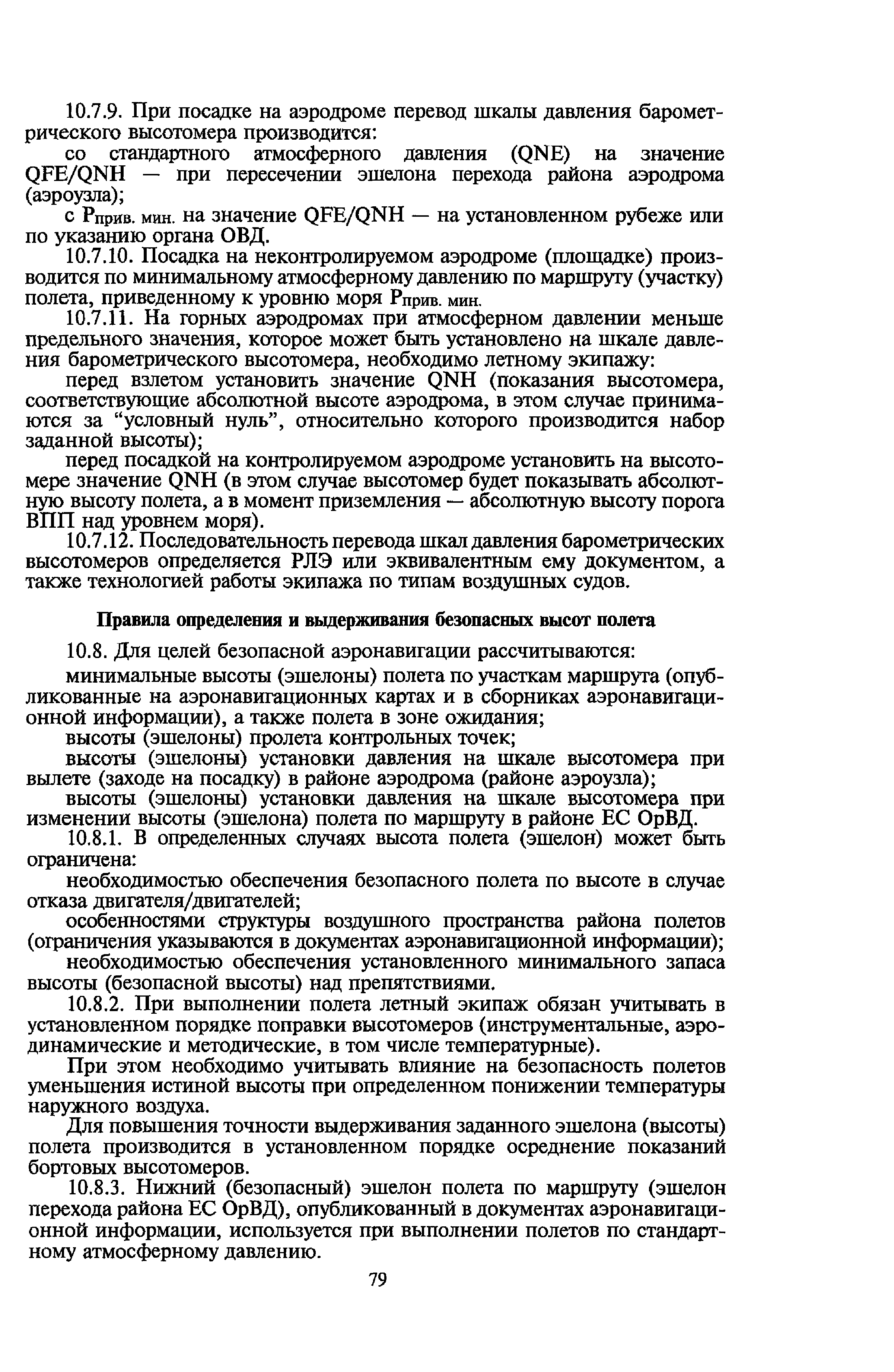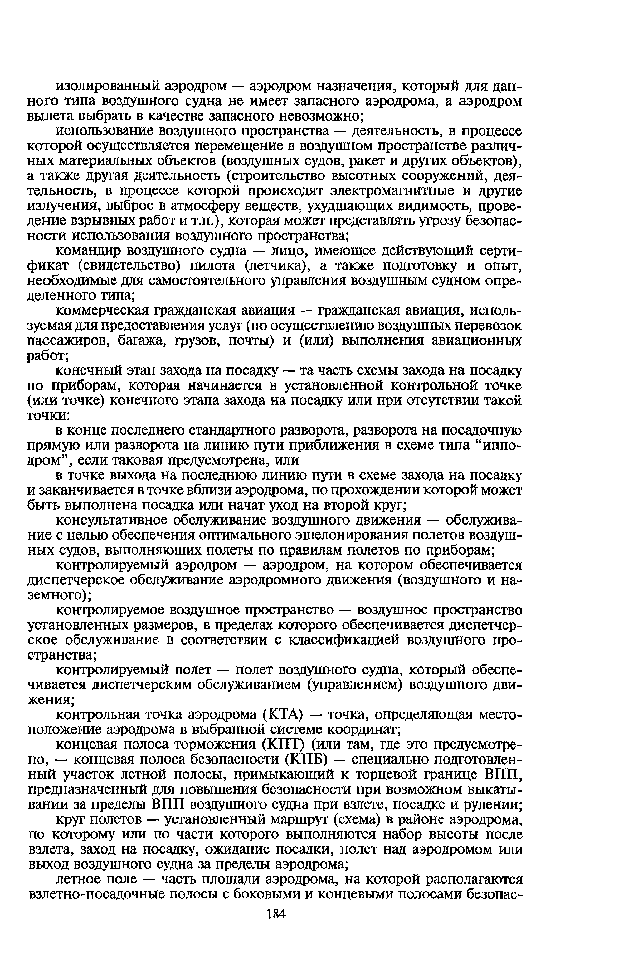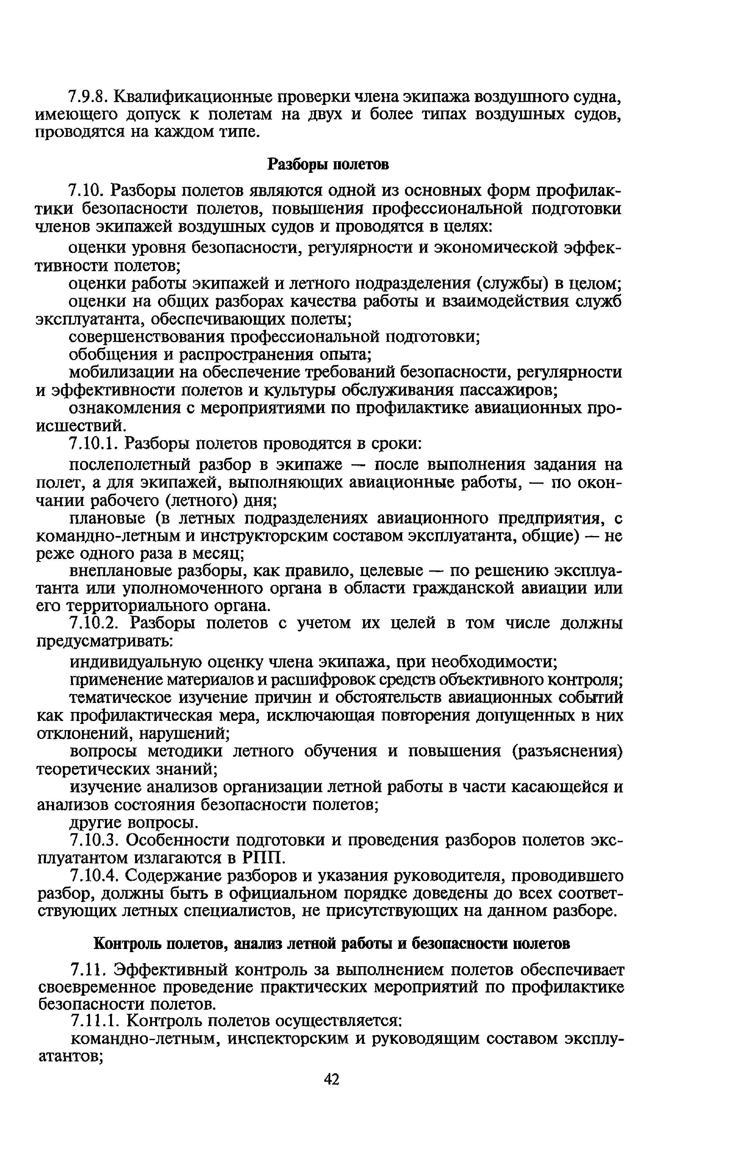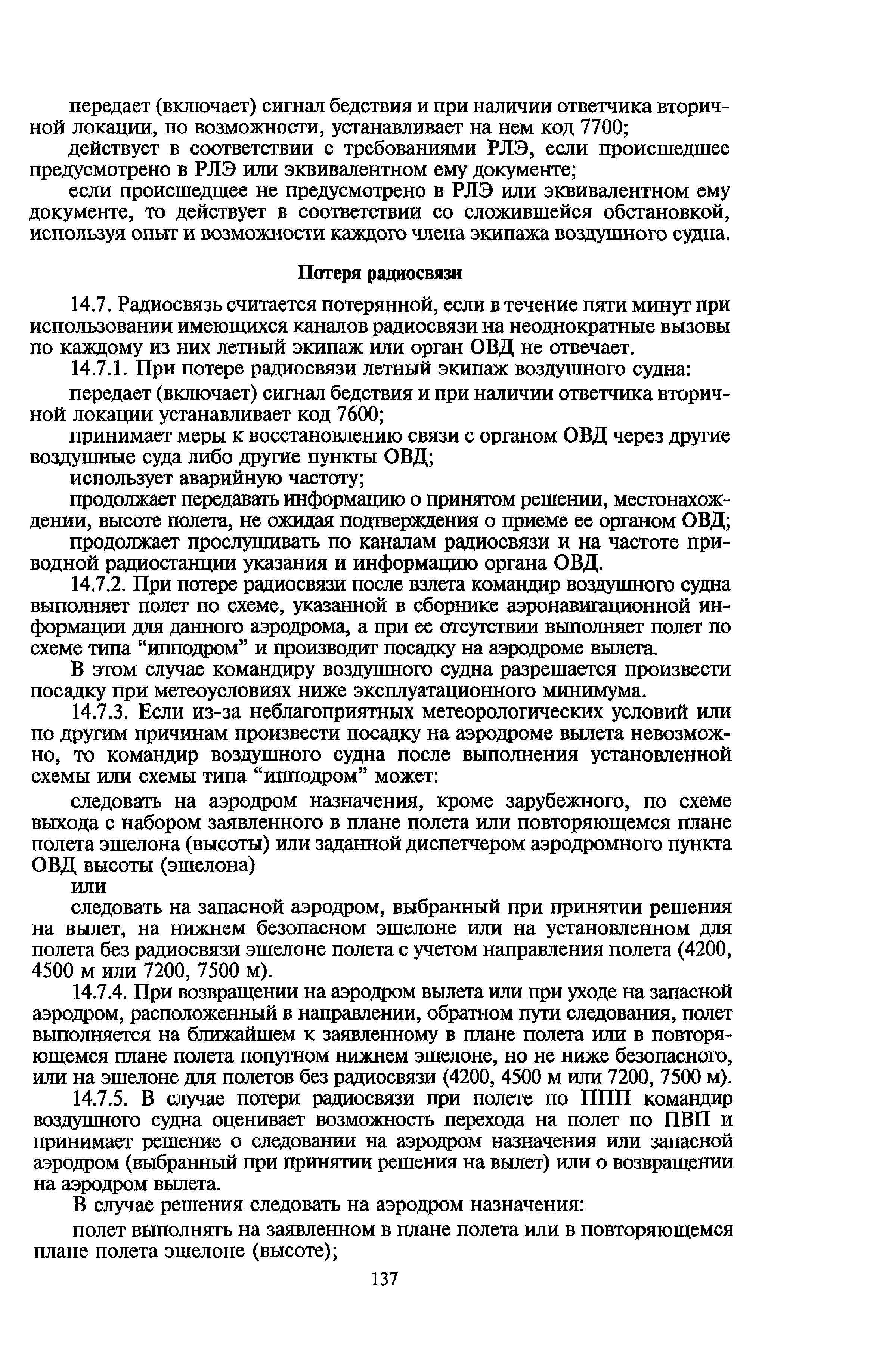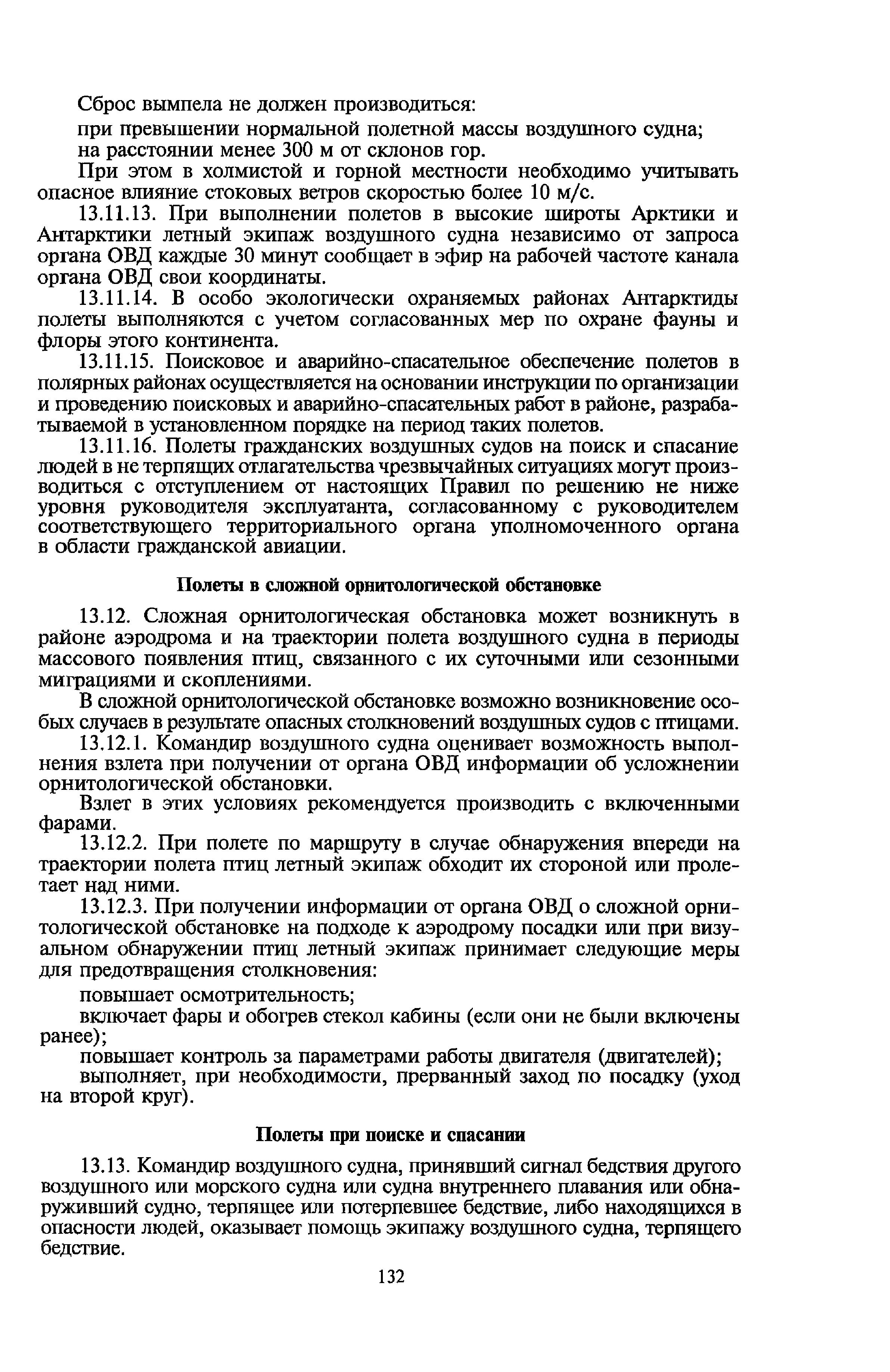 | Оглавление: | I. Общие положения II. Воздушные суда III. Экипаж воздушного судна IV. Аэродромы, аэропорты, вертодромы и посадочные площадки V. Классификация полетов в гражданской авиации VI. Минимумы Эксплуатационные минимумы аэродрома (вертодрома) Минимум командира воздушного судна Минимум вида авиационных работ VII. Организация летной работы Планирование летной работы Летно-методическая работа Профессиональная подготовка членов экипажей воздушных судов Допуск летного состава к полетам Формирование экипажей воздушных судов Предварительная и предполетная подготовка членов летных экипажей Полеты с проверяющими в составе экипажа воздушного судна Проверки техники пилотирования, практической работы членов экипажа Разборы полетов Контроль полетов, анализ летной работы и безопасности полетов VIII. Обеспечение полетов Аэронавигационное обслуживание полетов воздушных судов Навигационное (штурманское) обеспечение полетов Метеорологическое обеспечение полетов Инженерно-авиационное обеспечение Аэродромное обеспечение Авиатопливообеспечение Светотехническое обеспечение Радиотехническое обеспечение Орнитологическое обеспечение Организационное обеспечение перевозок, авиационных работ Организационное обеспечение полетов Обеспечение авиационной безопасности Авиационное медицинское обеспечение Аварийно-спасательное обеспечение IX. Воздушное пространство Российской Федерации. Организация и обслуживание (управление) воздушного движения в Российской Федерации Разрешительный и уведомительный порядок использования воздушного пространства Обслуживание (управление) воздушного движения X. Правила полетов Правила полетов по приборам Правила визуальных полетов, включая полеты по минимальным условиям ПВП Общие правила вылета, прилета воздушных судов и определение запасного аэродрома Особенности принятия решения на вылет и прилет по ППП Особенности принятия решения на вылет и прилет по ПВП Правила установки шкалы давления барометрического высотомера Правила определения и выдерживания безопасных высот полета Правила вертикального эшелонирования Правила продольного эшелонирования Правила бокового эшелонирования Правила изменения эшелона (высоты) полета и пересечения воздушной трассы, МВЛ и маршрута полета Правила полетов по воздушным трассам, МВЛ и установленным маршрутам Правила определения минимального количества топлива на полет и аэронавигационного запаса топлива Особенности полетов в воздушном пространстве приграничной полосы Российской Федерации и при пересечении государственной границы Российской Федерации Особенности производства полетов в районе аэродрома (аэроузла) и на контролируемых аэродромах Особенности в правилах выполнения особо важных и специальных рейсов (полетов) на вертолетах XI. Порядок выполнения полетов Буксировка, запуск, руление Взлет Набор высоты Выполнение полетов по воздушным трассам, МВЛ и маршрутам Снижение, заход на посадку и посадка Полеты на вертолетах Полеты на гидросамолетах Учебные и тренировочные полеты Полеты по перегонке воздушных судов, в том числе при групповых перелетах Испытательные, исследовательские и контрольные полеты (облеты) XII. Особенности организации и выполнения полетов в авиации общего назначения Общие правила выполнения полетов сверхлегк