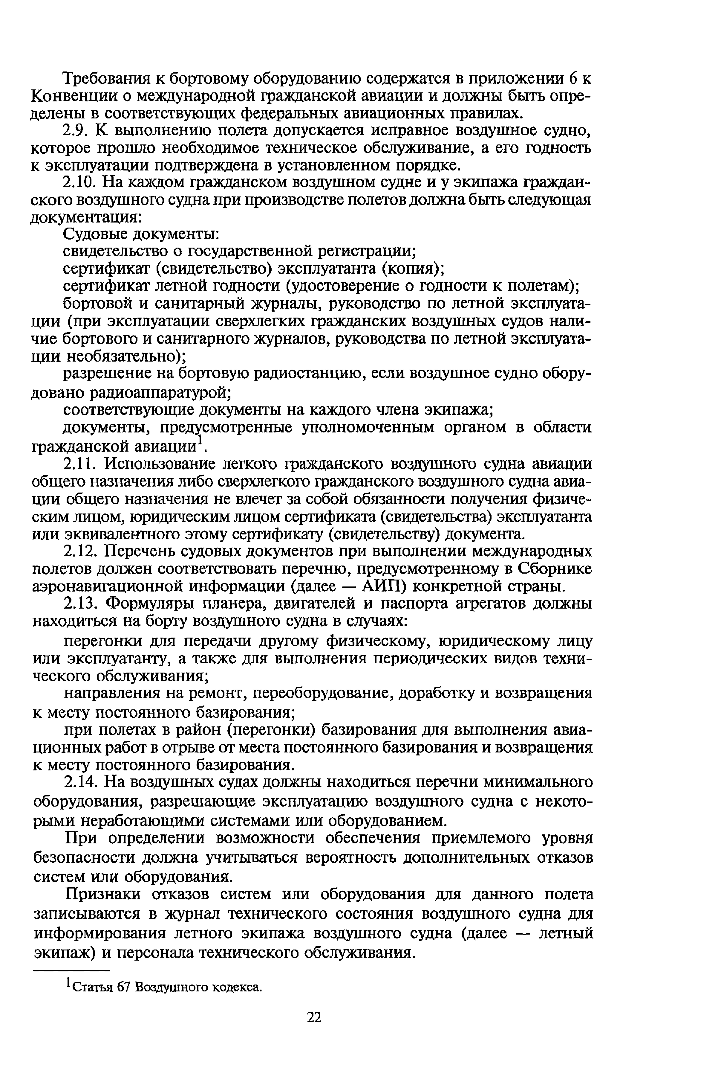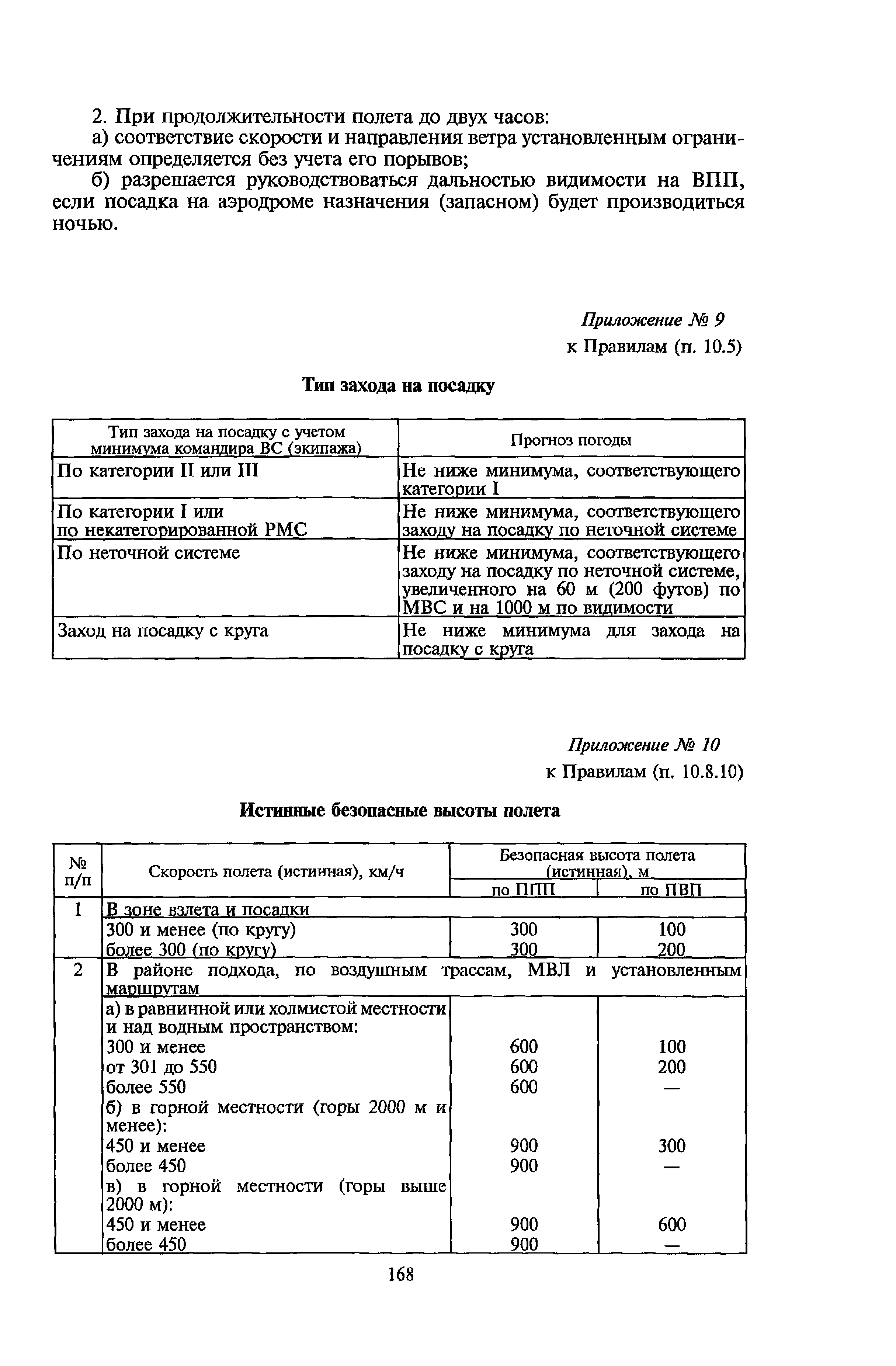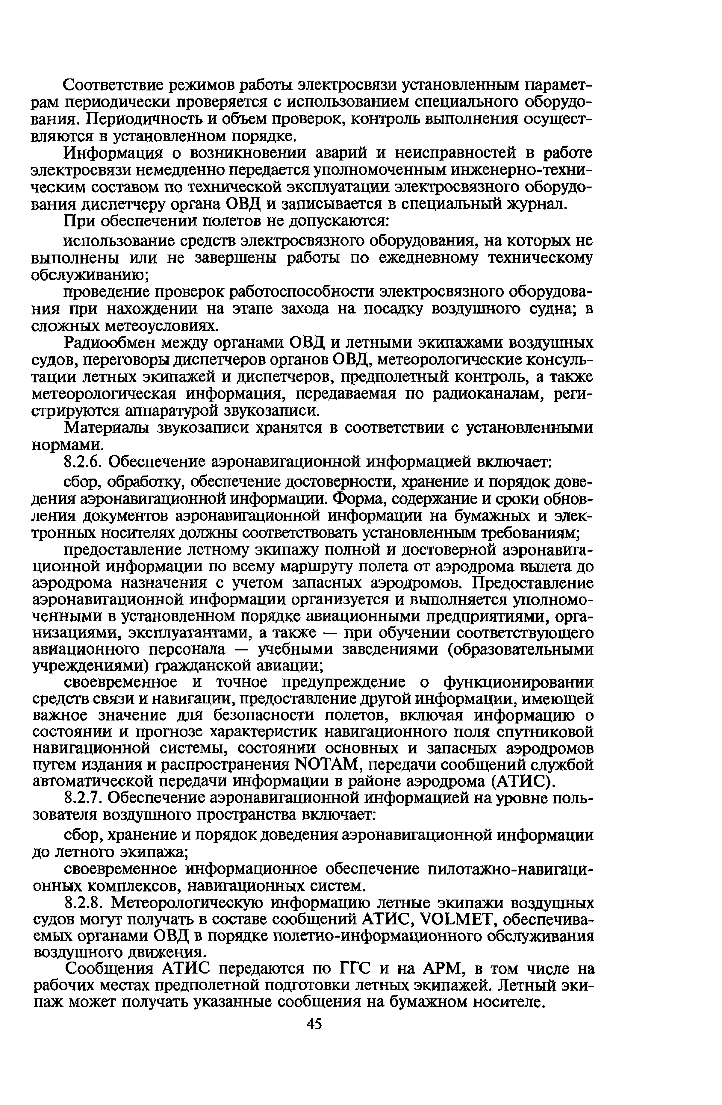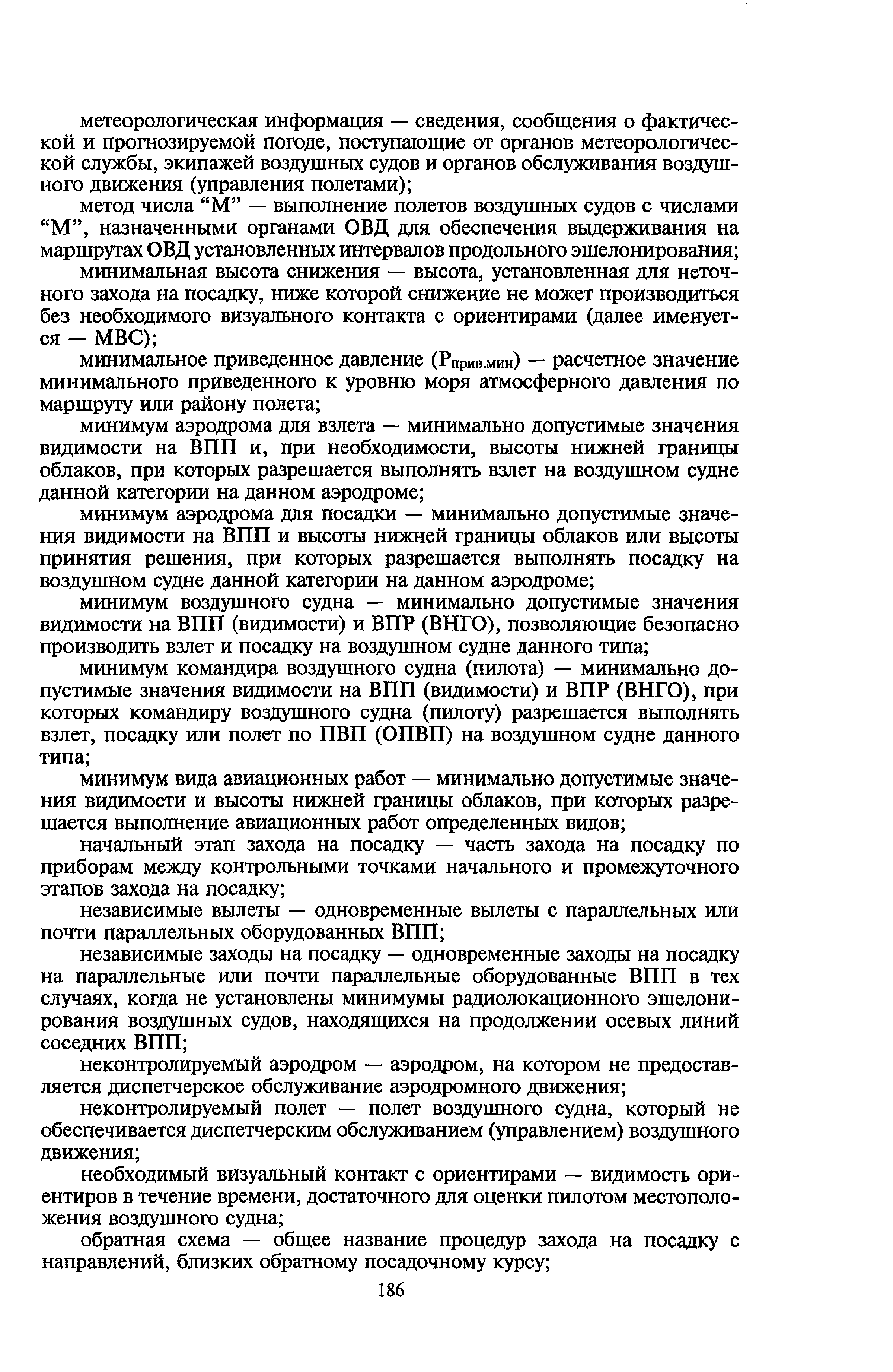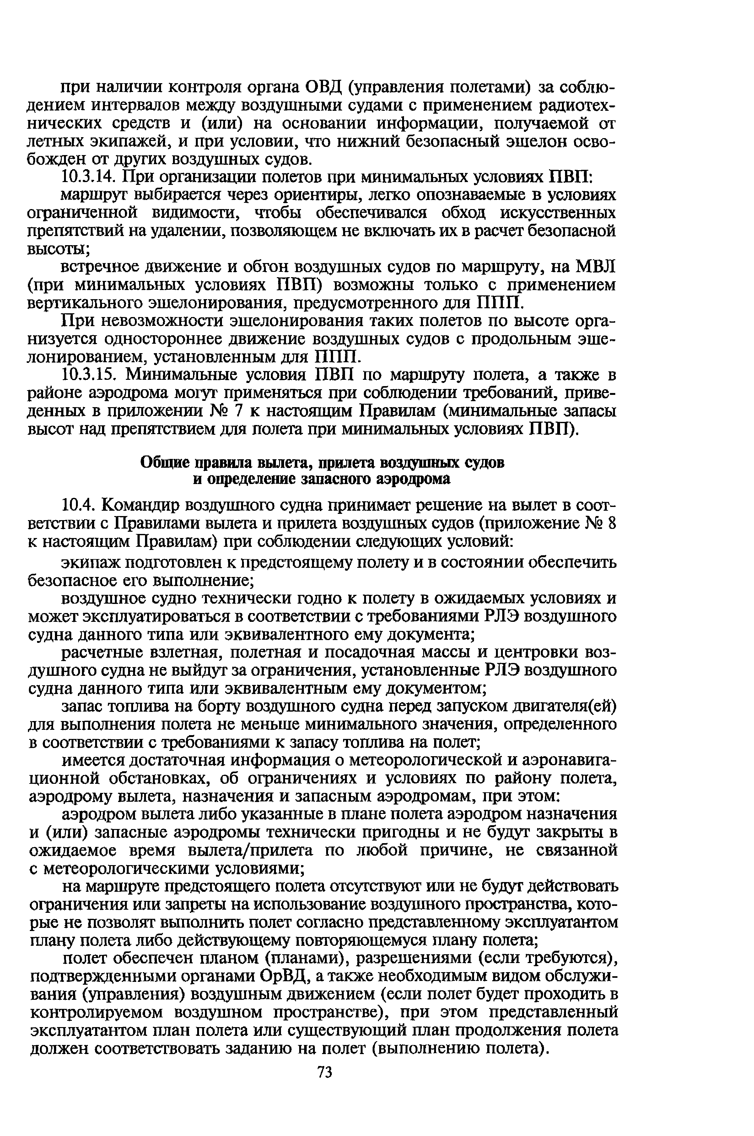 | Оглавление: | I. Общие положения II. Воздушные суда III. Экипаж воздушного судна IV. Аэродромы, аэропорты, вертодромы и посадочные площадки V. Классификация полетов в гражданской авиации VI. Минимумы Эксплуатационные минимумы аэродрома (вертодрома) Минимум командира воздушного судна Минимум вида авиационных работ VII. Организация летной работы Планирование летной работы Летно-методическая работа Профессиональная подготовка членов экипажей воздушных судов Допуск летного состава к полетам Формирование экипажей воздушных судов Предварительная и предполетная подготовка членов летных экипажей Полеты с проверяющими в составе экипажа воздушного судна Проверки техники пилотирования, практической работы членов экипажа Разборы полетов Контроль полетов, анализ летной работы и безопасности полетов VIII. Обеспечение полетов Аэронавигационное обслуживание полетов воздушных судов Навигационное (штурманское) обеспечение полетов Метеорологическое обеспечение полетов Инженерно-авиационное обеспечение Аэродромное обеспечение Авиатопливообеспечение Светотехническое обеспечение Радиотехническое обеспечение Орнитологическое обеспечение Организационное обеспечение перевозок, авиационных работ Организационное обеспечение полетов Обеспечение авиационной безопасности Авиационное медицинское обеспечение Аварийно-спасательное обеспечение IX. Воздушное пространство Российской Федерации. Организация и обслуживание (управление) воздушного движения в Российской Федерации Разрешительный и уведомительный порядок использования воздушного пространства Обслуживание (управление) воздушного движения X. Правила полетов Правила полетов по приборам Правила визуальных полетов, включая полеты по минимальным условиям ПВП Общие правила вылета, прилета воздушных судов и определение запасного аэродрома Особенности принятия решения на вылет и прилет по ППП Особенности принятия решения на вылет и прилет по ПВП Правила установки шкалы давления барометрического высотомера Правила определения и выдерживания безопасных высот полета Правила вертикального эшелонирования Правила продольного эшелонирования Правила бокового эшелонирования Правила изменения эшелона (высоты) полета и пересечения воздушной трассы, МВЛ и маршрута полета Правила полетов по воздушным трассам, МВЛ и установленным маршрутам Правила определения минимального количества топлива на полет и аэронавигационного запаса топлива Особенности полетов в воздушном пространстве приграничной полосы Российской Федерации и при пересечении государственной границы Российской Федерации Особенности производства полетов в районе аэродрома (аэроузла) и на контролируемых аэродромах Особенности в правилах выполнения особо важных и специальных рейсов (полетов) на вертолетах XI. Порядок выполнения полетов Буксировка, запуск, руление Взлет Набор высоты Выполнение полетов по воздушным трассам, МВЛ и маршрутам Снижение, заход на посадку и посадка Полеты на вертолетах Полеты на гидросамолетах Учебные и тренировочные полеты Полеты по перегонке воздушных судов, в том числе при групповых перелетах Испытательные, исследовательские и контрольные полеты (облеты) XII. Особенности организации и выполнения полетов в авиации общего назначения Общие правила выполнения полетов сверхлегк
