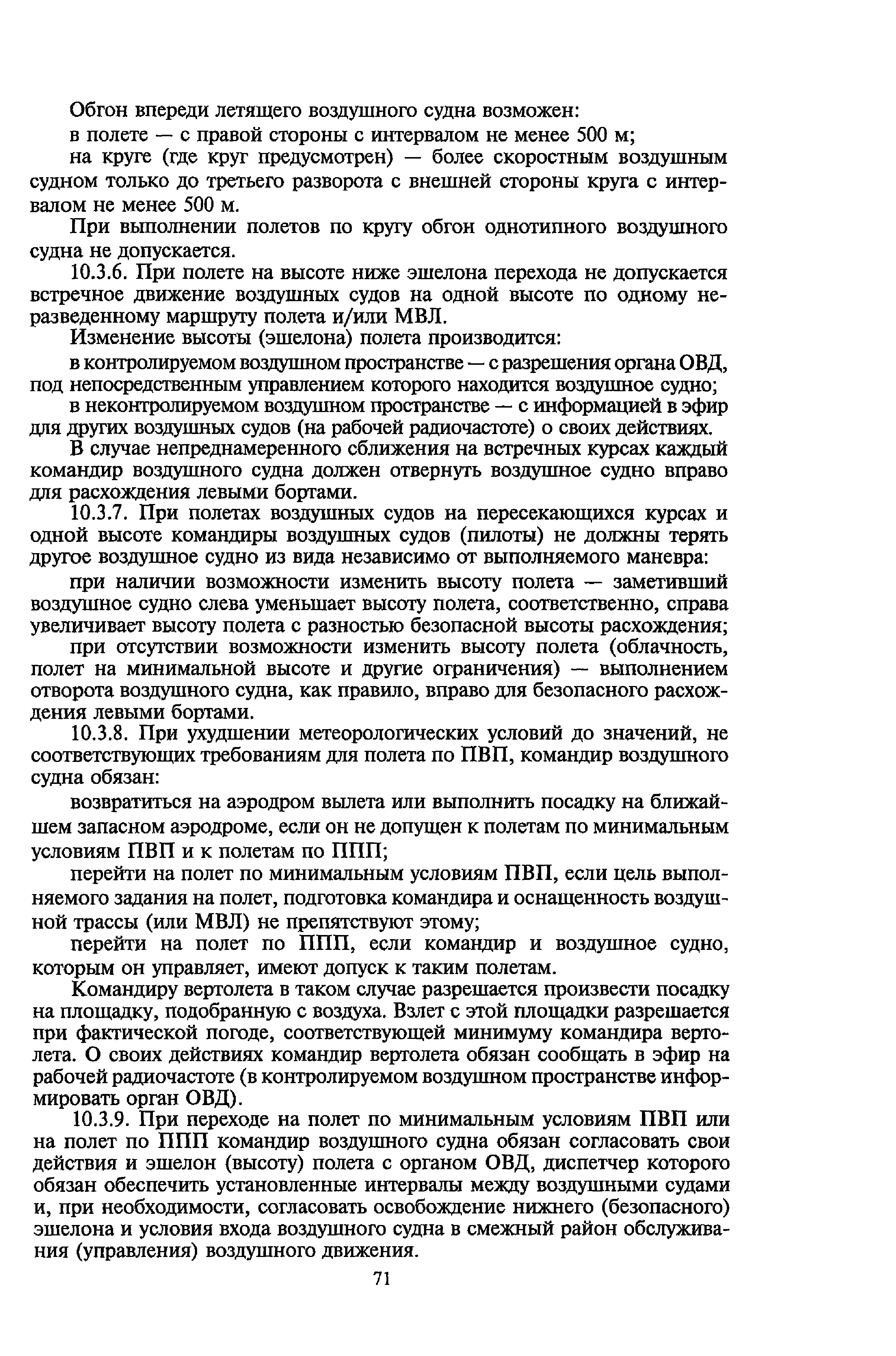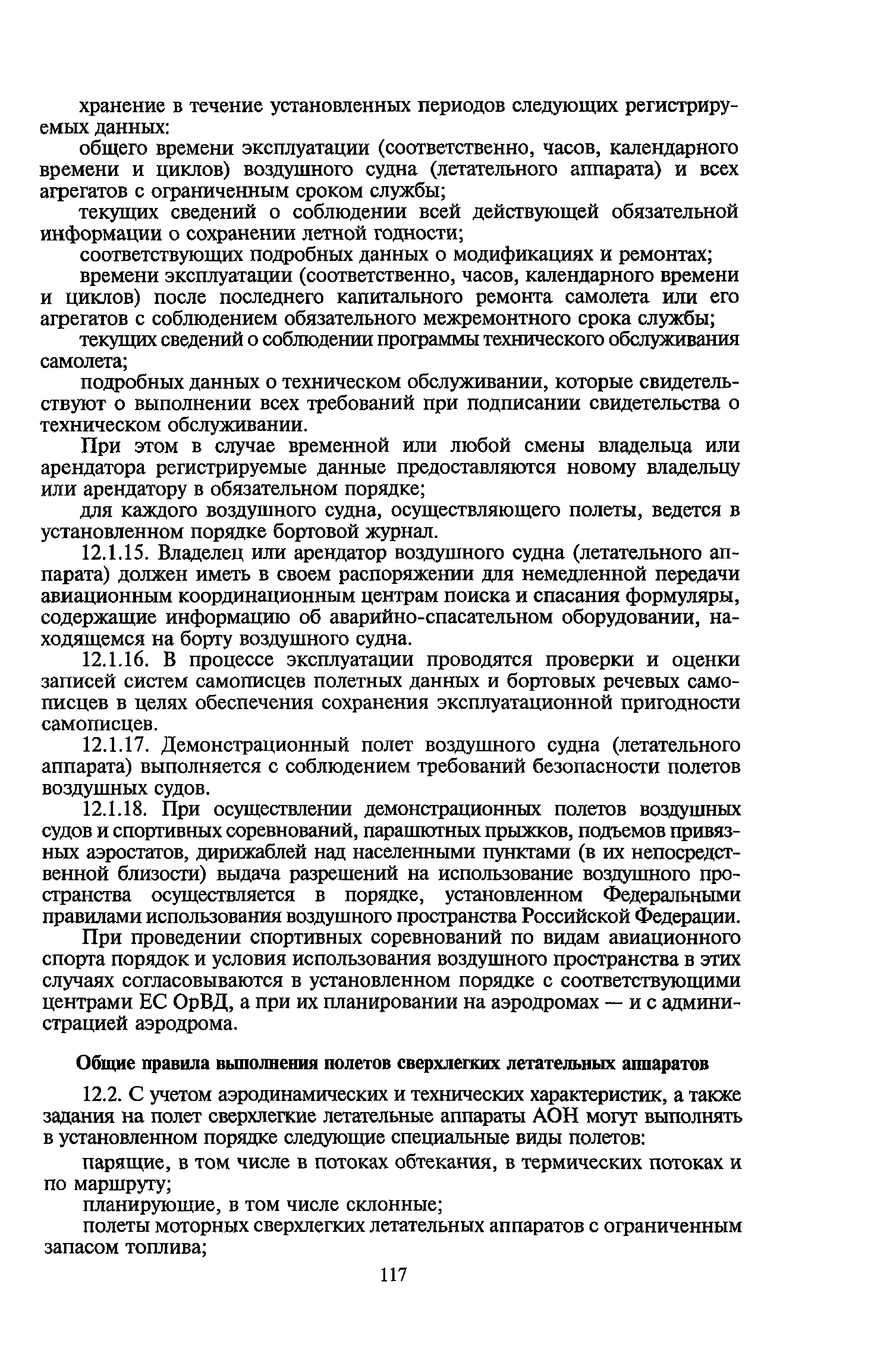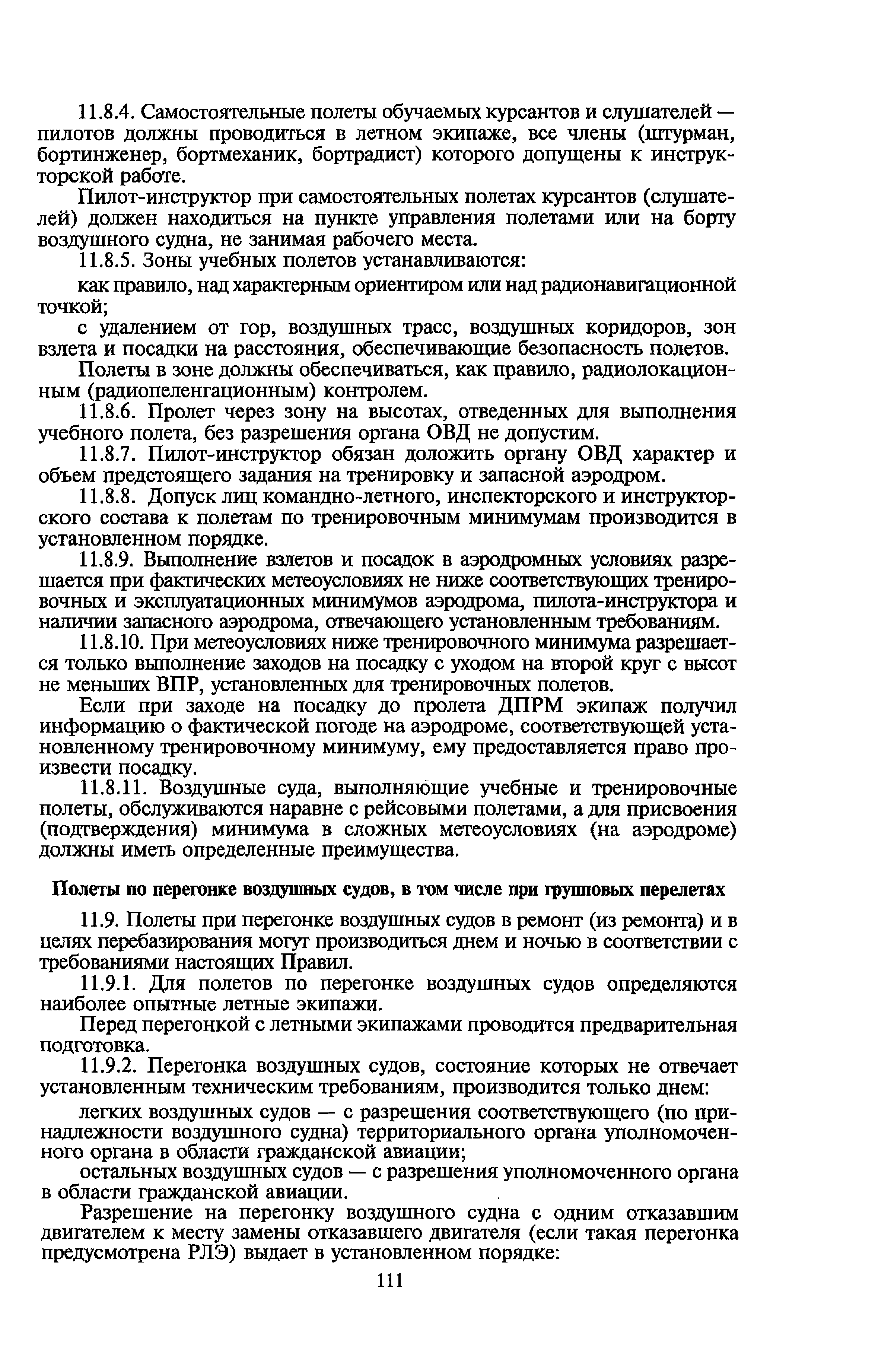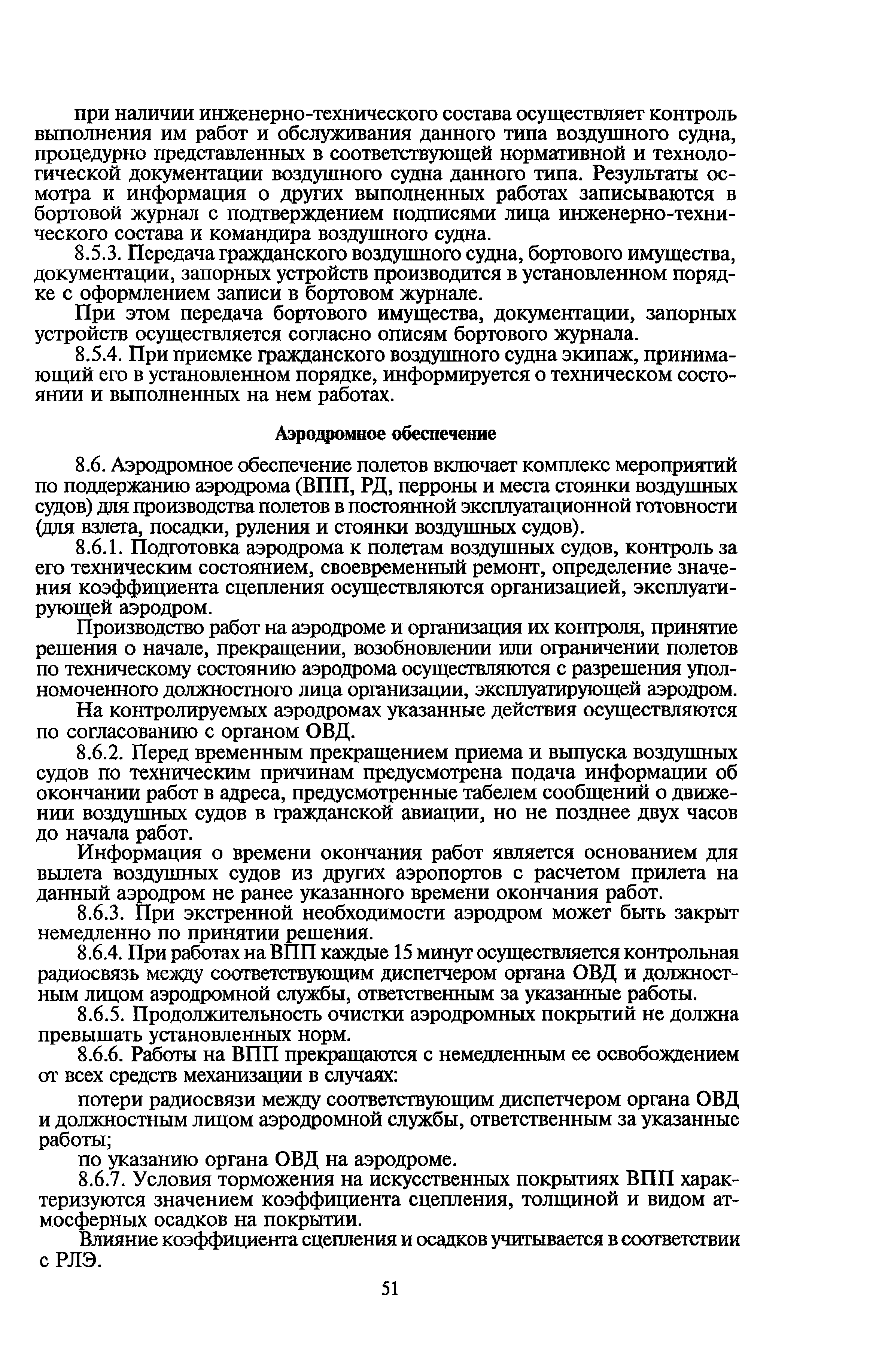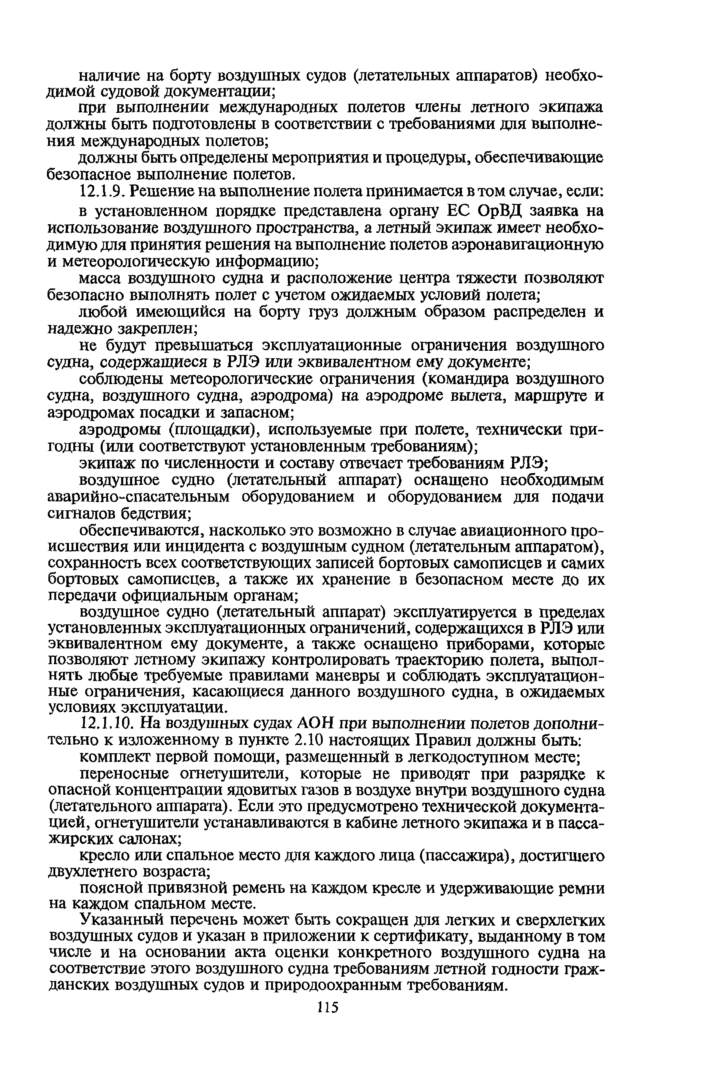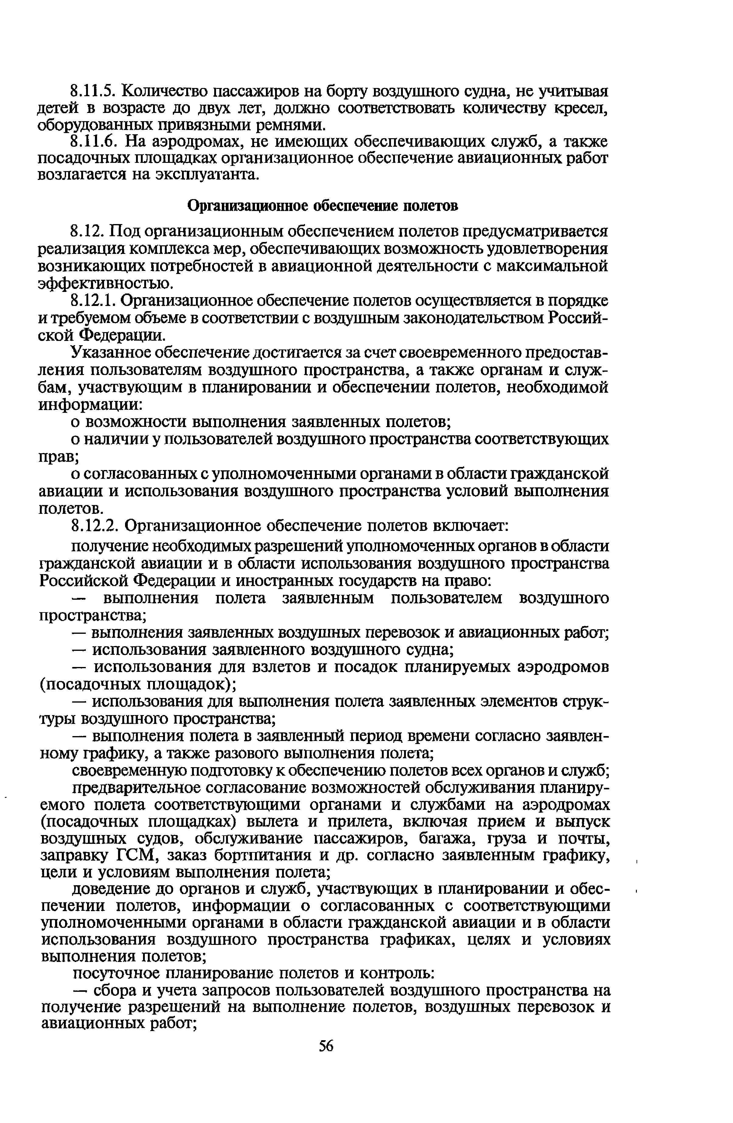 | Оглавление: | I. Общие положения II. Воздушные суда III. Экипаж воздушного судна IV. Аэродромы, аэропорты, вертодромы и посадочные площадки V. Классификация полетов в гражданской авиации VI. Минимумы Эксплуатационные минимумы аэродрома (вертодрома) Минимум командира воздушного судна Минимум вида авиационных работ VII. Организация летной работы Планирование летной работы Летно-методическая работа Профессиональная подготовка членов экипажей воздушных судов Допуск летного состава к полетам Формирование экипажей воздушных судов Предварительная и предполетная подготовка членов летных экипажей Полеты с проверяющими в составе экипажа воздушного судна Проверки техники пилотирования, практической работы членов экипажа Разборы полетов Контроль полетов, анализ летной работы и безопасности полетов VIII. Обеспечение полетов Аэронавигационное обслуживание полетов воздушных судов Навигационное (штурманское) обеспечение полетов Метеорологическое обеспечение полетов Инженерно-авиационное обеспечение Аэродромное обеспечение Авиатопливообеспечение Светотехническое обеспечение Радиотехническое обеспечение Орнитологическое обеспечение Организационное обеспечение перевозок, авиационных работ Организационное обеспечение полетов Обеспечение авиационной безопасности Авиационное медицинское обеспечение Аварийно-спасательное обеспечение IX. Воздушное пространство Российской Федерации. Организация и обслуживание (управление) воздушного движения в Российской Федерации Разрешительный и уведомительный порядок использования воздушного пространства Обслуживание (управление) воздушного движения X. Правила полетов Правила полетов по приборам Правила визуальных полетов, включая полеты по минимальным условиям ПВП Общие правила вылета, прилета воздушных судов и определение запасного аэродрома Особенности принятия решения на вылет и прилет по ППП Особенности принятия решения на вылет и прилет по ПВП Правила установки шкалы давления барометрического высотомера Правила определения и выдерживания безопасных высот полета Правила вертикального эшелонирования Правила продольного эшелонирования Правила бокового эшелонирования Правила изменения эшелона (высоты) полета и пересечения воздушной трассы, МВЛ и маршрута полета Правила полетов по воздушным трассам, МВЛ и установленным маршрутам Правила определения минимального количества топлива на полет и аэронавигационного запаса топлива Особенности полетов в воздушном пространстве приграничной полосы Российской Федерации и при пересечении государственной границы Российской Федерации Особенности производства полетов в районе аэродрома (аэроузла) и на контролируемых аэродромах Особенности в правилах выполнения особо важных и специальных рейсов (полетов) на вертолетах XI. Порядок выполнения полетов Буксировка, запуск, руление Взлет Набор высоты Выполнение полетов по воздушным трассам, МВЛ и маршрутам Снижение, заход на посадку и посадка Полеты на вертолетах Полеты на гидросамолетах Учебные и тренировочные полеты Полеты по перегонке воздушных судов, в том числе при групповых перелетах Испытательные, исследовательские и контрольные полеты (облеты) XII. Особенности организации и выполнения полетов в авиации общего назначения Общие правила выполнения полетов сверхлегк