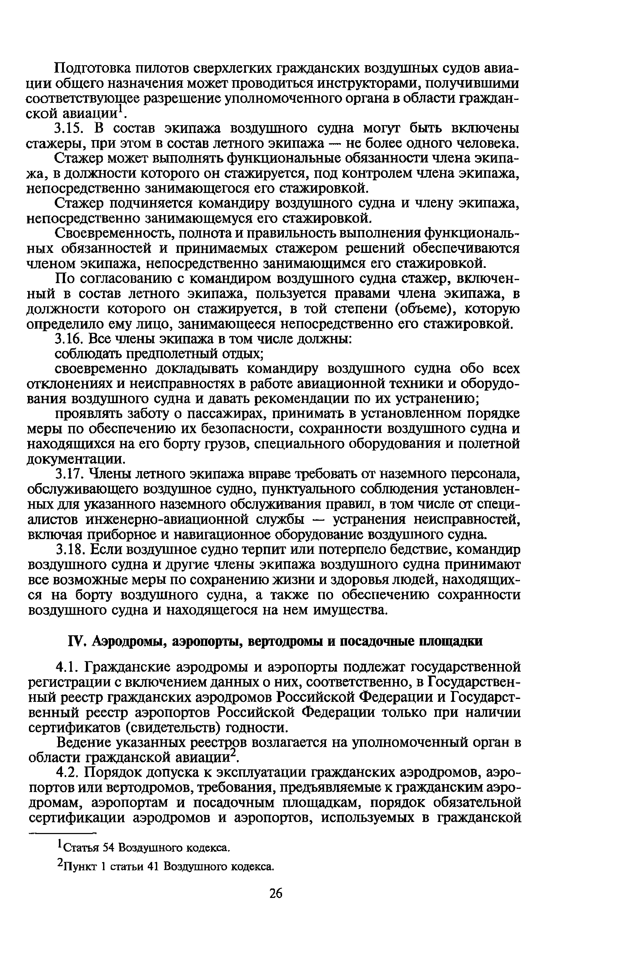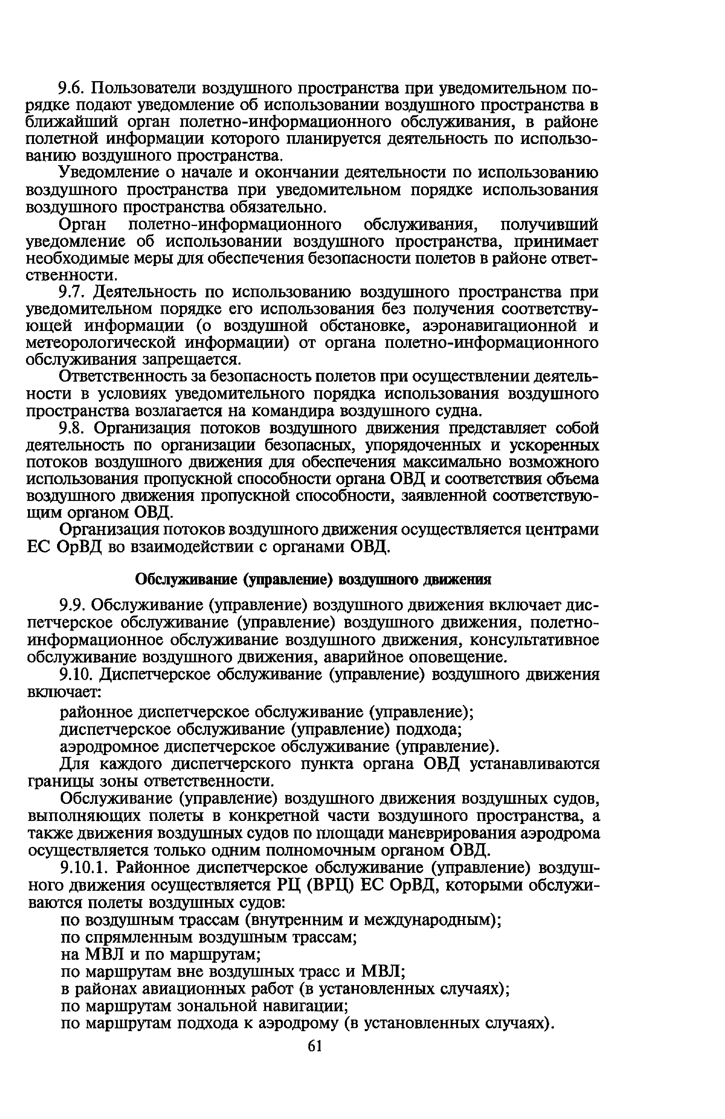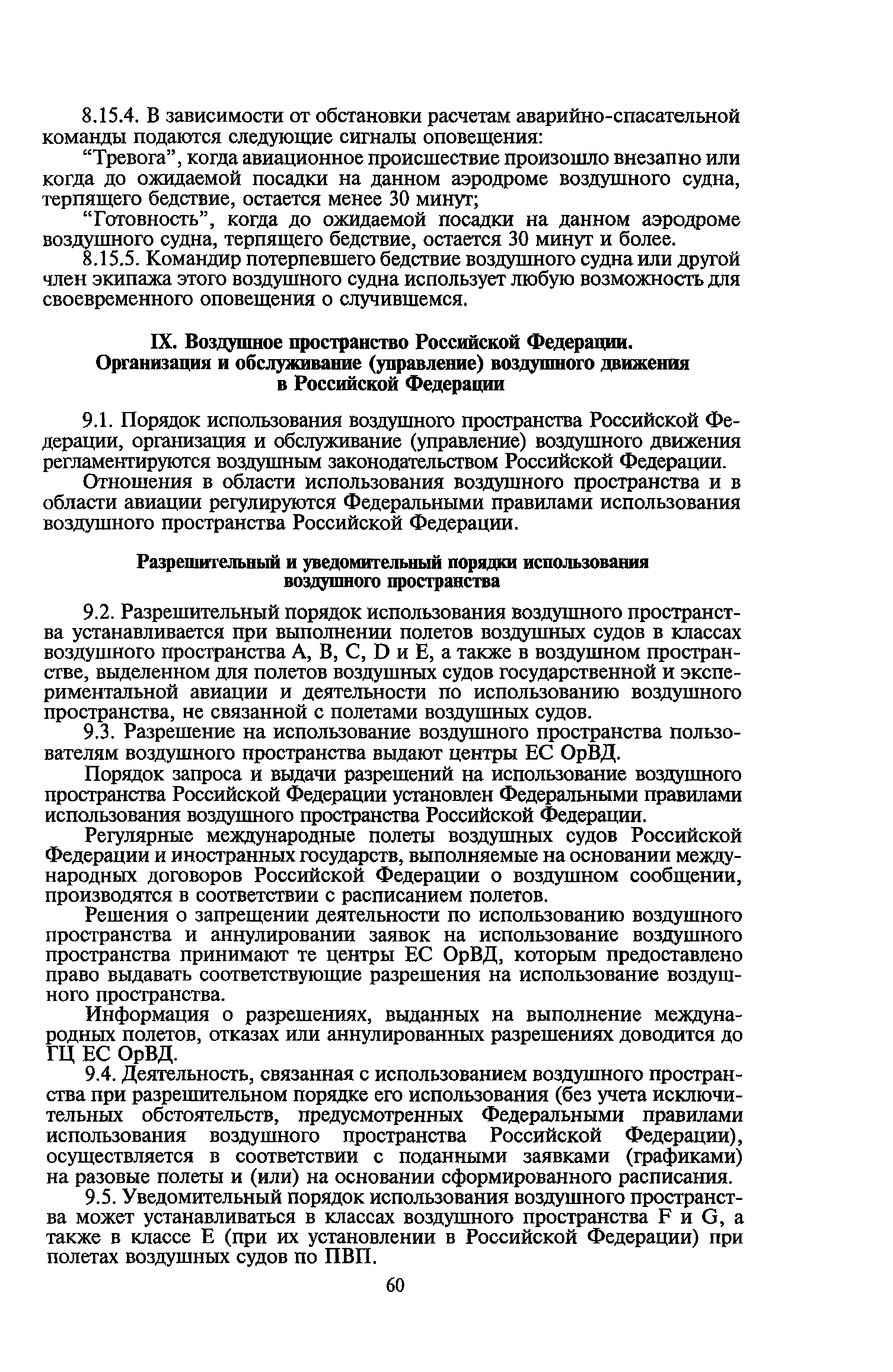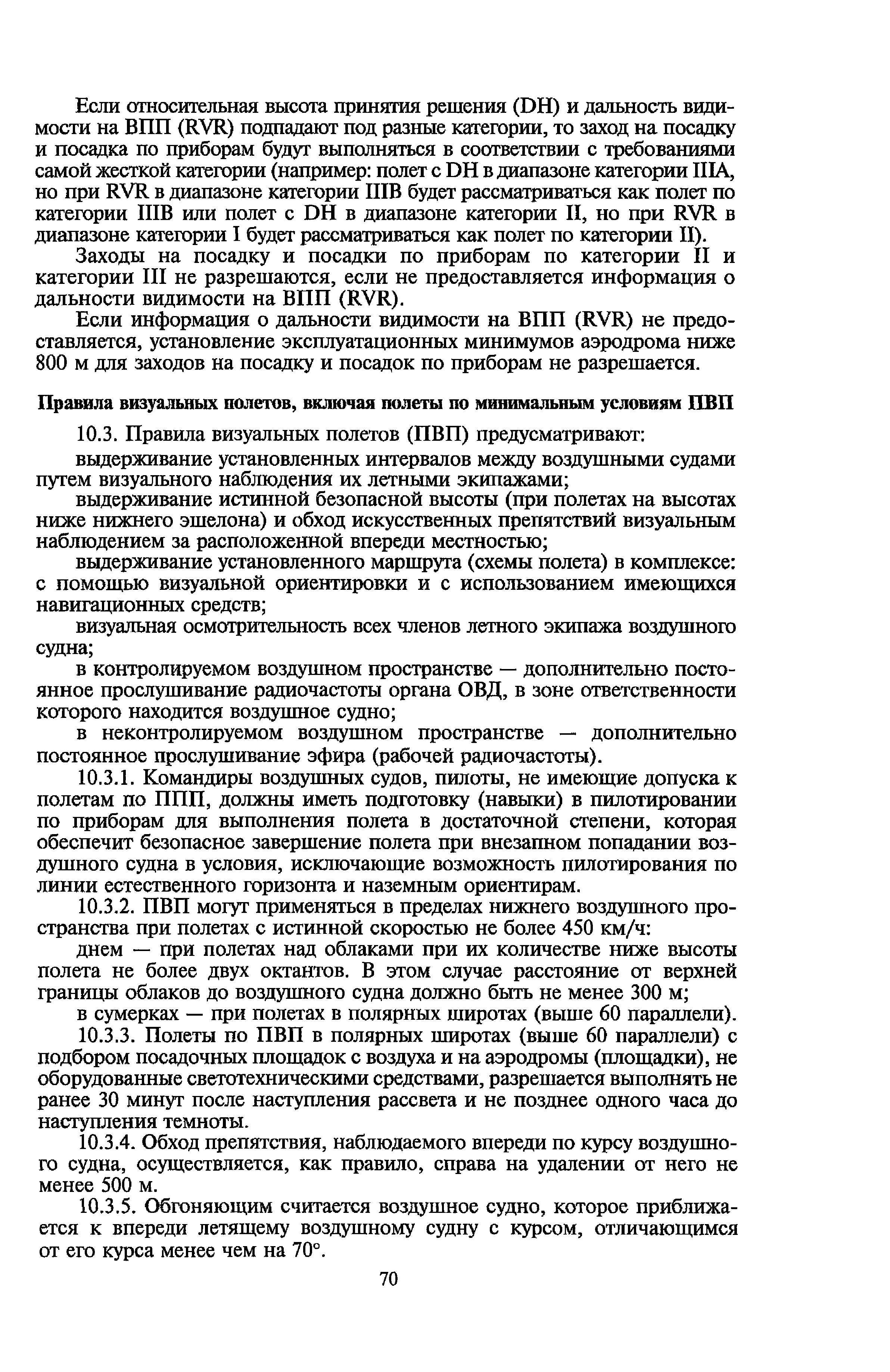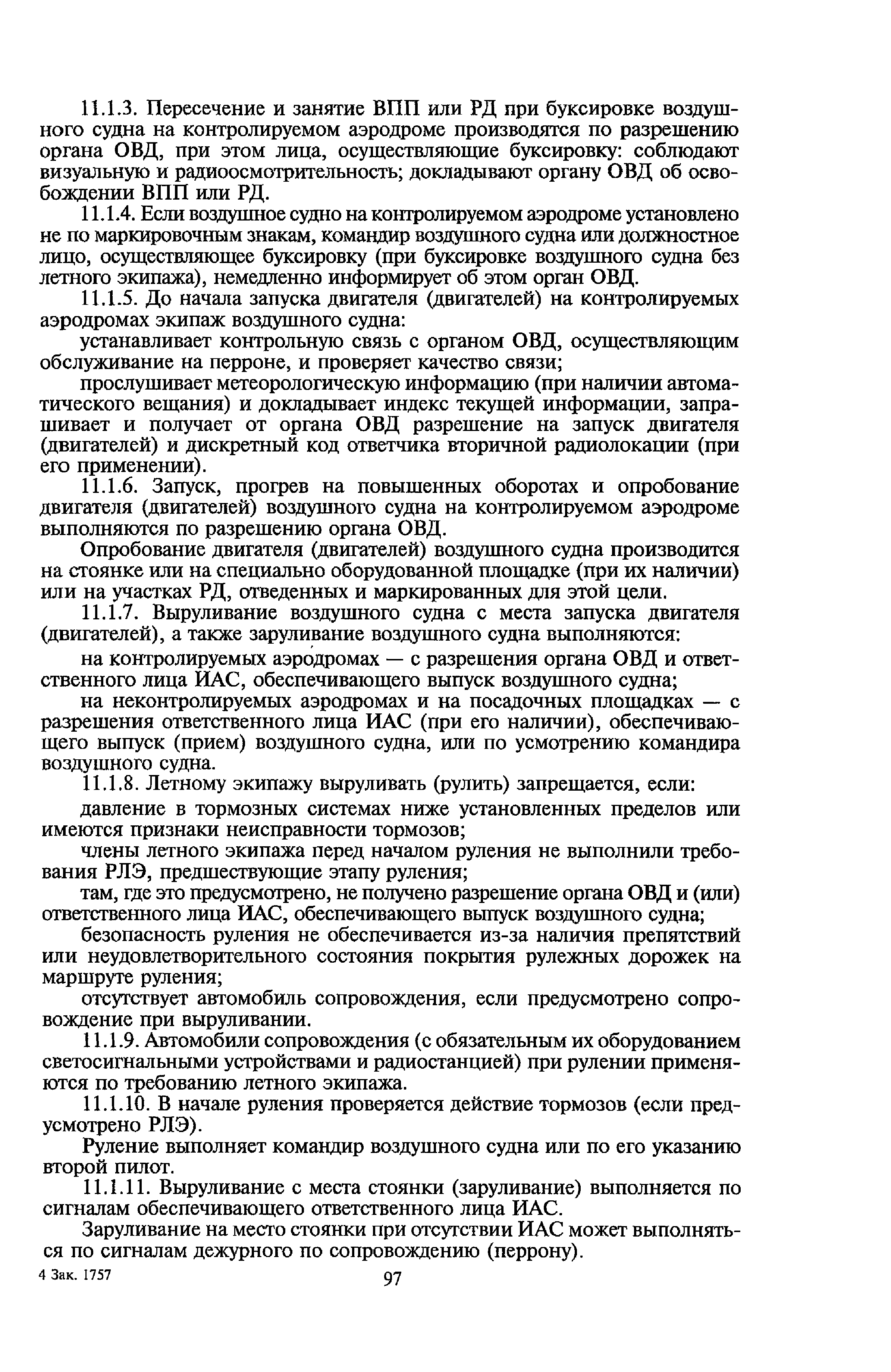 | Оглавление: | I. Общие положения II. Воздушные суда III. Экипаж воздушного судна IV. Аэродромы, аэропорты, вертодромы и посадочные площадки V. Классификация полетов в гражданской авиации VI. Минимумы Эксплуатационные минимумы аэродрома (вертодрома) Минимум командира воздушного судна Минимум вида авиационных работ VII. Организация летной работы Планирование летной работы Летно-методическая работа Профессиональная подготовка членов экипажей воздушных судов Допуск летного состава к полетам Формирование экипажей воздушных судов Предварительная и предполетная подготовка членов летных экипажей Полеты с проверяющими в составе экипажа воздушного судна Проверки техники пилотирования, практической работы членов экипажа Разборы полетов Контроль полетов, анализ летной работы и безопасности полетов VIII. Обеспечение полетов Аэронавигационное обслуживание полетов воздушных судов Навигационное (штурманское) обеспечение полетов Метеорологическое обеспечение полетов Инженерно-авиационное обеспечение Аэродромное обеспечение Авиатопливообеспечение Светотехническое обеспечение Радиотехническое обеспечение Орнитологическое обеспечение Организационное обеспечение перевозок, авиационных работ Организационное обеспечение полетов Обеспечение авиационной безопасности Авиационное медицинское обеспечение Аварийно-спасательное обеспечение IX. Воздушное пространство Российской Федерации. Организация и обслуживание (управление) воздушного движения в Российской Федерации Разрешительный и уведомительный порядок использования воздушного пространства Обслуживание (управление) воздушного движения X. Правила полетов Правила полетов по приборам Правила визуальных полетов, включая полеты по минимальным условиям ПВП Общие правила вылета, прилета воздушных судов и определение запасного аэродрома Особенности принятия решения на вылет и прилет по ППП Особенности принятия решения на вылет и прилет по ПВП Правила установки шкалы давления барометрического высотомера Правила определения и выдерживания безопасных высот полета Правила вертикального эшелонирования Правила продольного эшелонирования Правила бокового эшелонирования Правила изменения эшелона (высоты) полета и пересечения воздушной трассы, МВЛ и маршрута полета Правила полетов по воздушным трассам, МВЛ и установленным маршрутам Правила определения минимального количества топлива на полет и аэронавигационного запаса топлива Особенности полетов в воздушном пространстве приграничной полосы Российской Федерации и при пересечении государственной границы Российской Федерации Особенности производства полетов в районе аэродрома (аэроузла) и на контролируемых аэродромах Особенности в правилах выполнения особо важных и специальных рейсов (полетов) на вертолетах XI. Порядок выполнения полетов Буксировка, запуск, руление Взлет Набор высоты Выполнение полетов по воздушным трассам, МВЛ и маршрутам Снижение, заход на посадку и посадка Полеты на вертолетах Полеты на гидросамолетах Учебные и тренировочные полеты Полеты по перегонке воздушных судов, в том числе при групповых перелетах Испытательные, исследовательские и контрольные полеты (облеты) XII. Особенности организации и выполнения полетов в авиации общего назначения Общие правила выполнения полетов сверхлегк