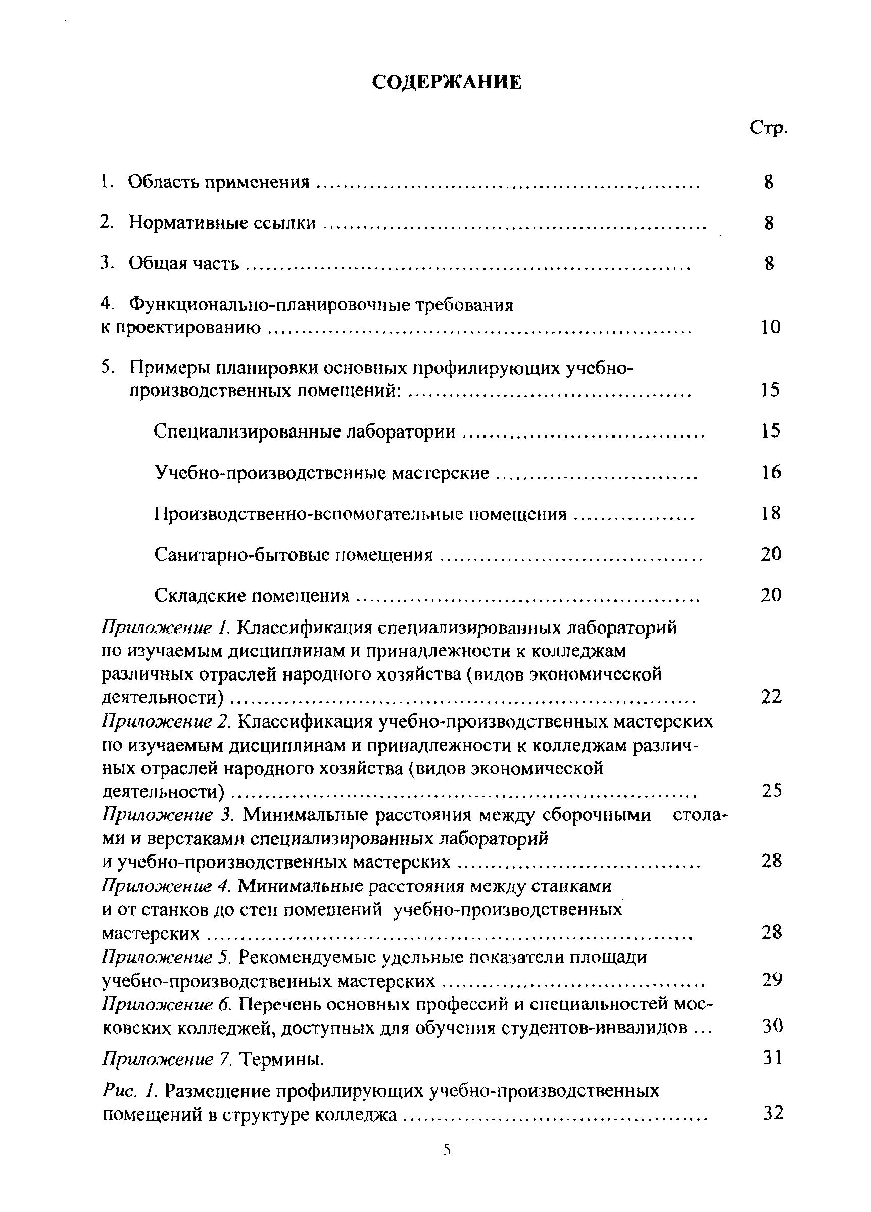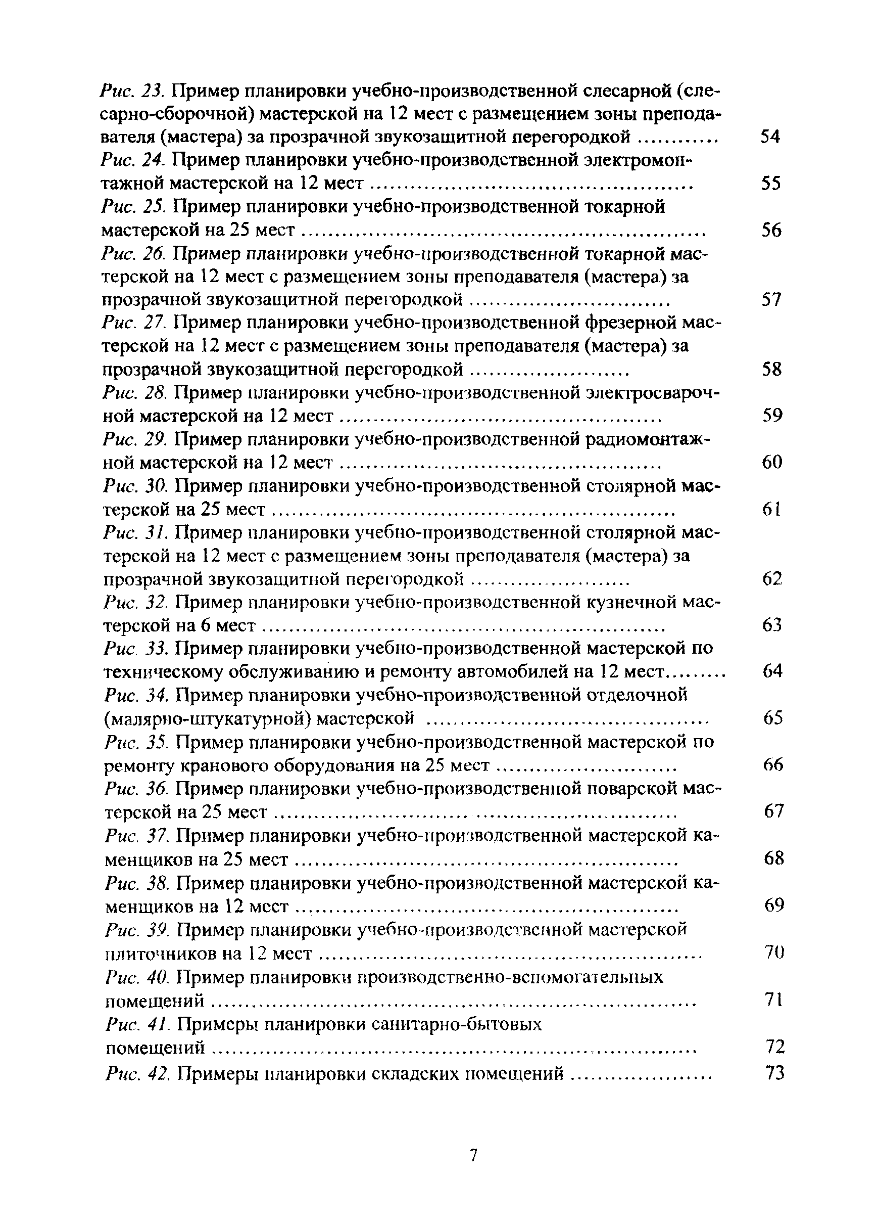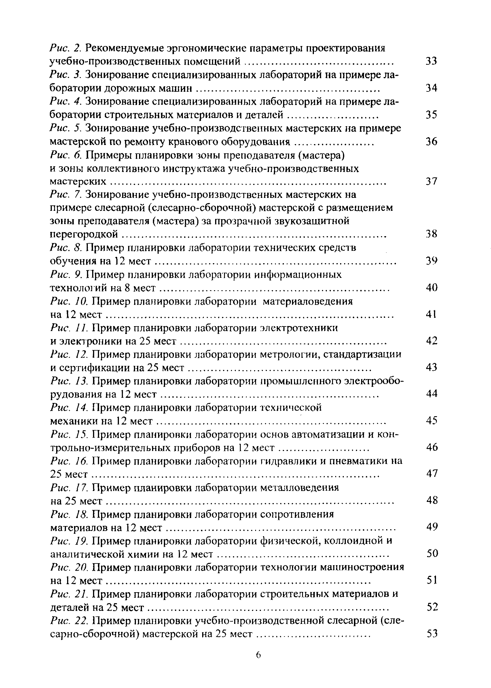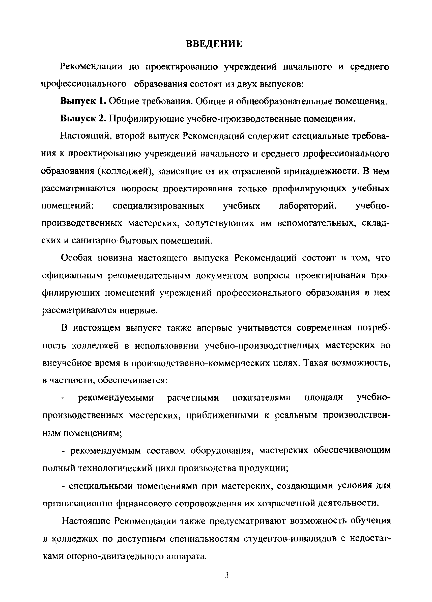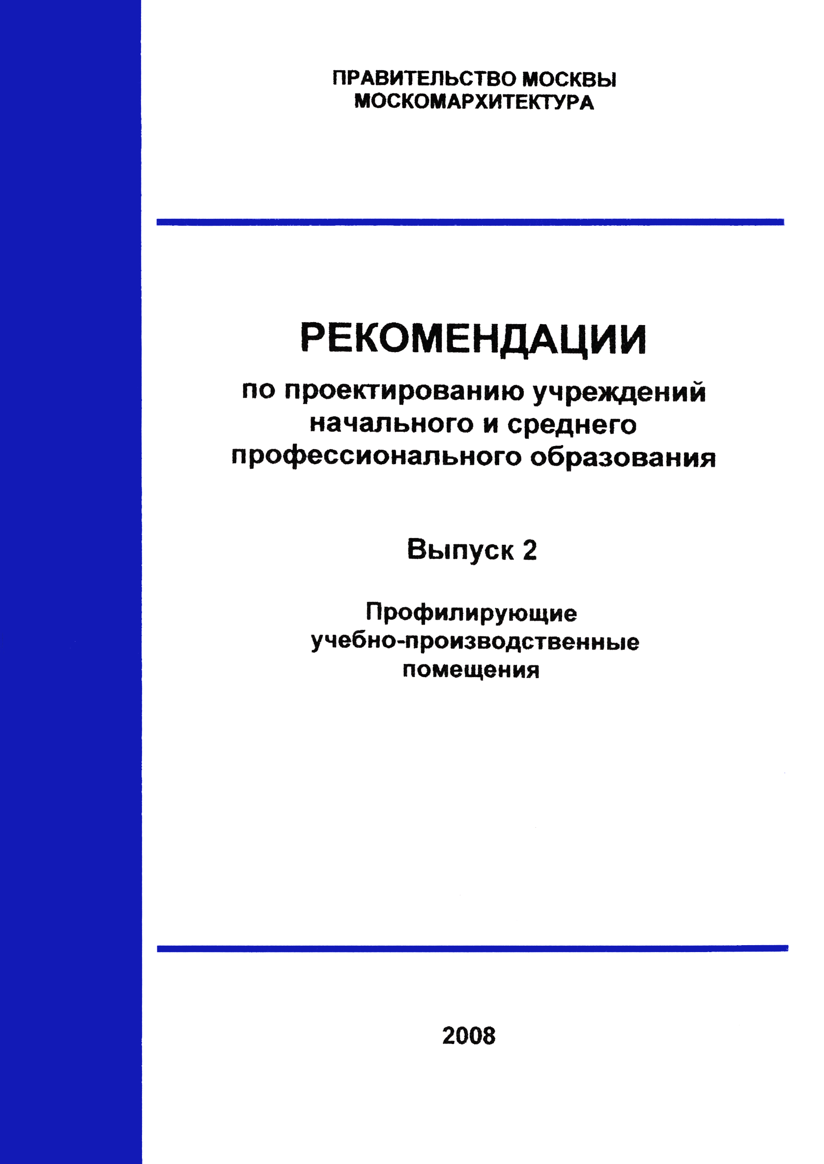 | Оглавление: | 1. Область применения 2. Нормативные ссылки 3. Общая часть 4. Функционально-планировочные требования к проектированию 5. Примеры планировки основных профилирующих учебно-производственных помещений Приложения |