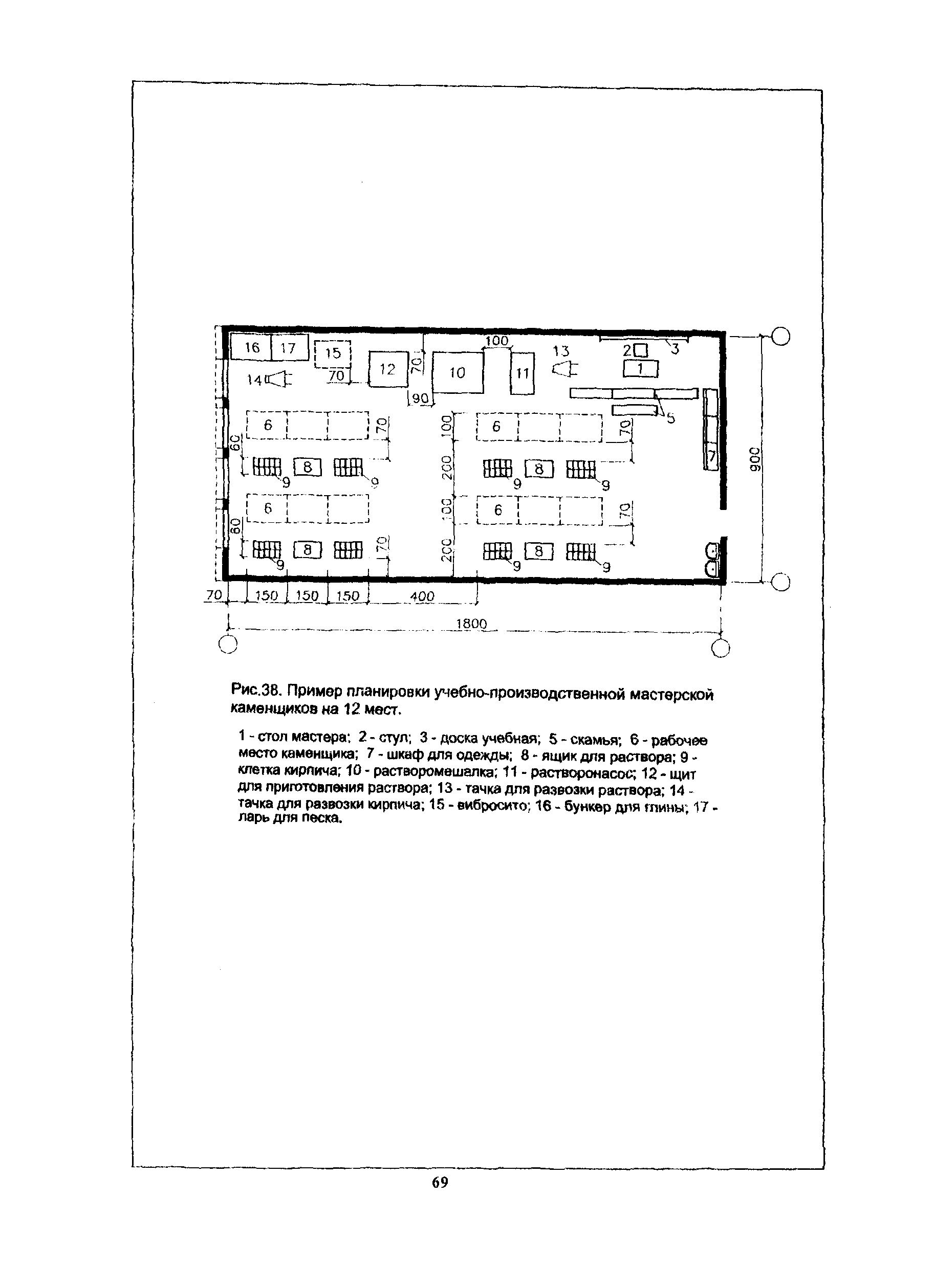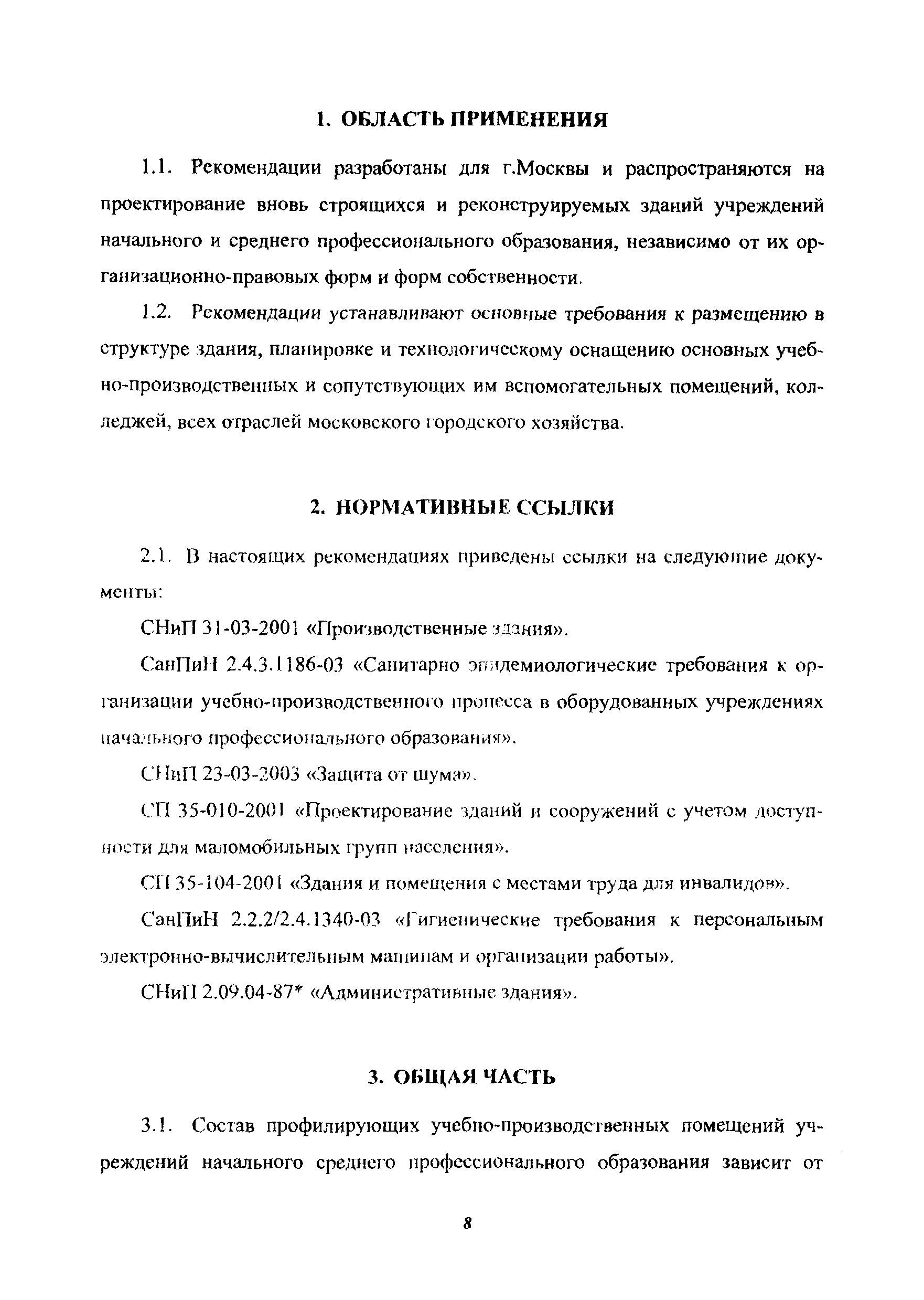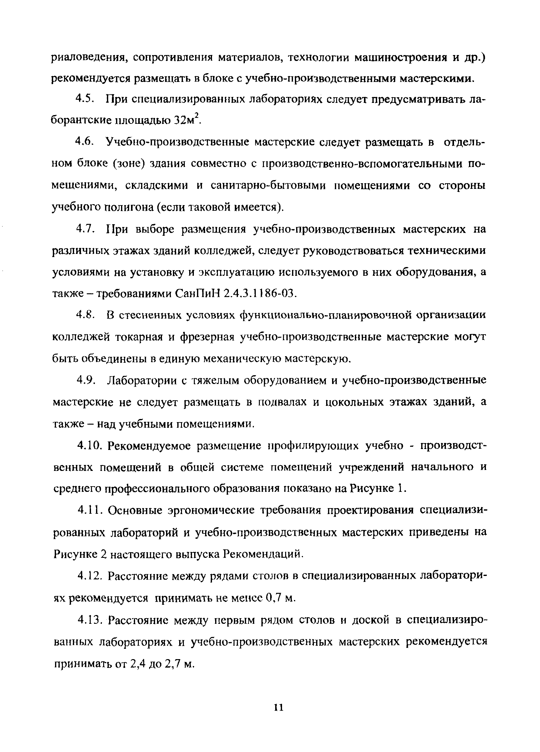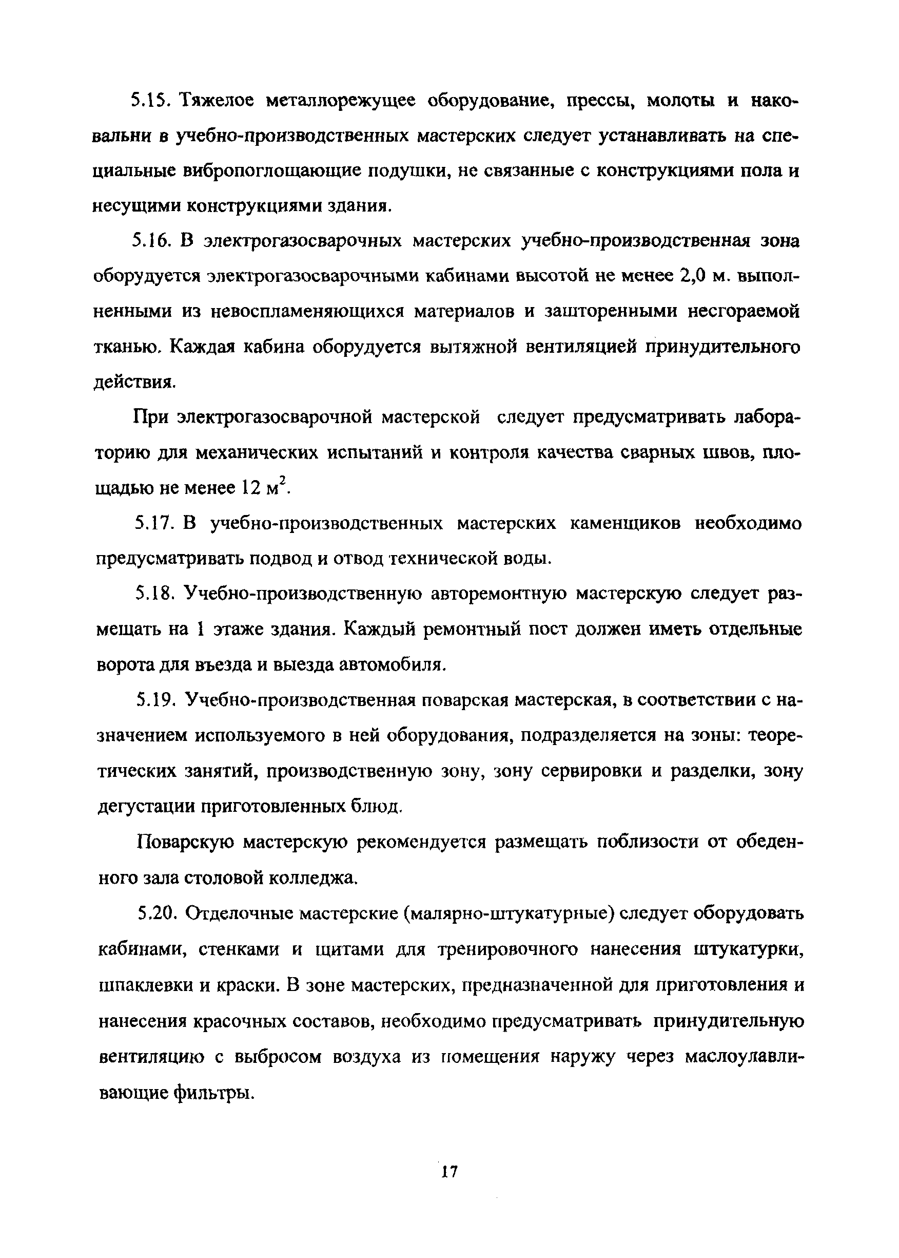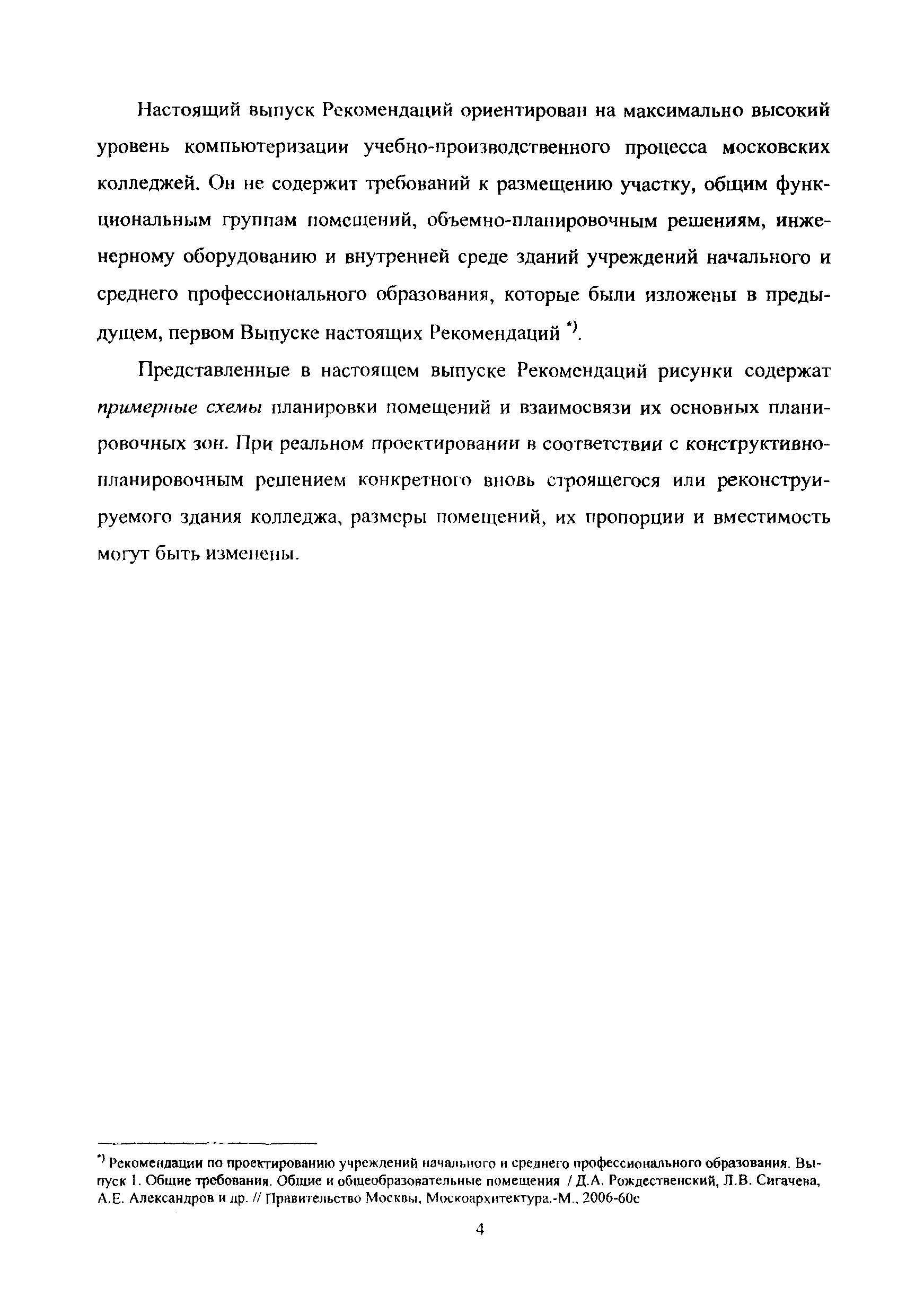 | Оглавление: | 1. Область применения 2. Нормативные ссылки 3. Общая часть 4. Функционально-планировочные требования к проектированию 5. Примеры планировки основных профилирующих учебно-производственных помещений Приложения |