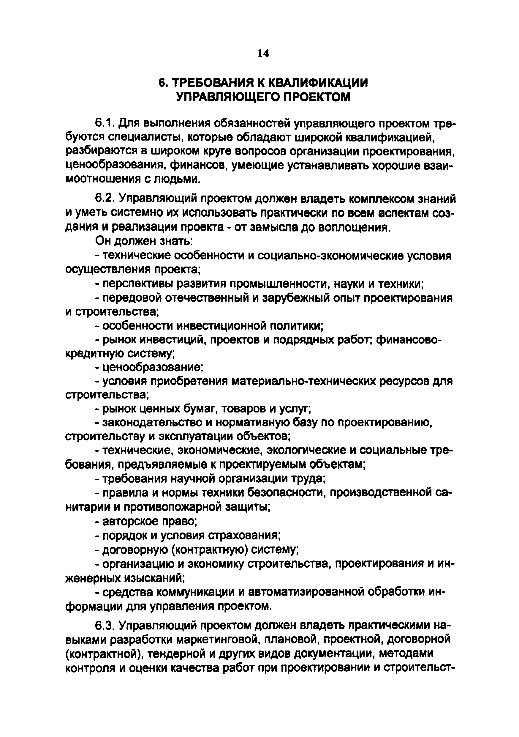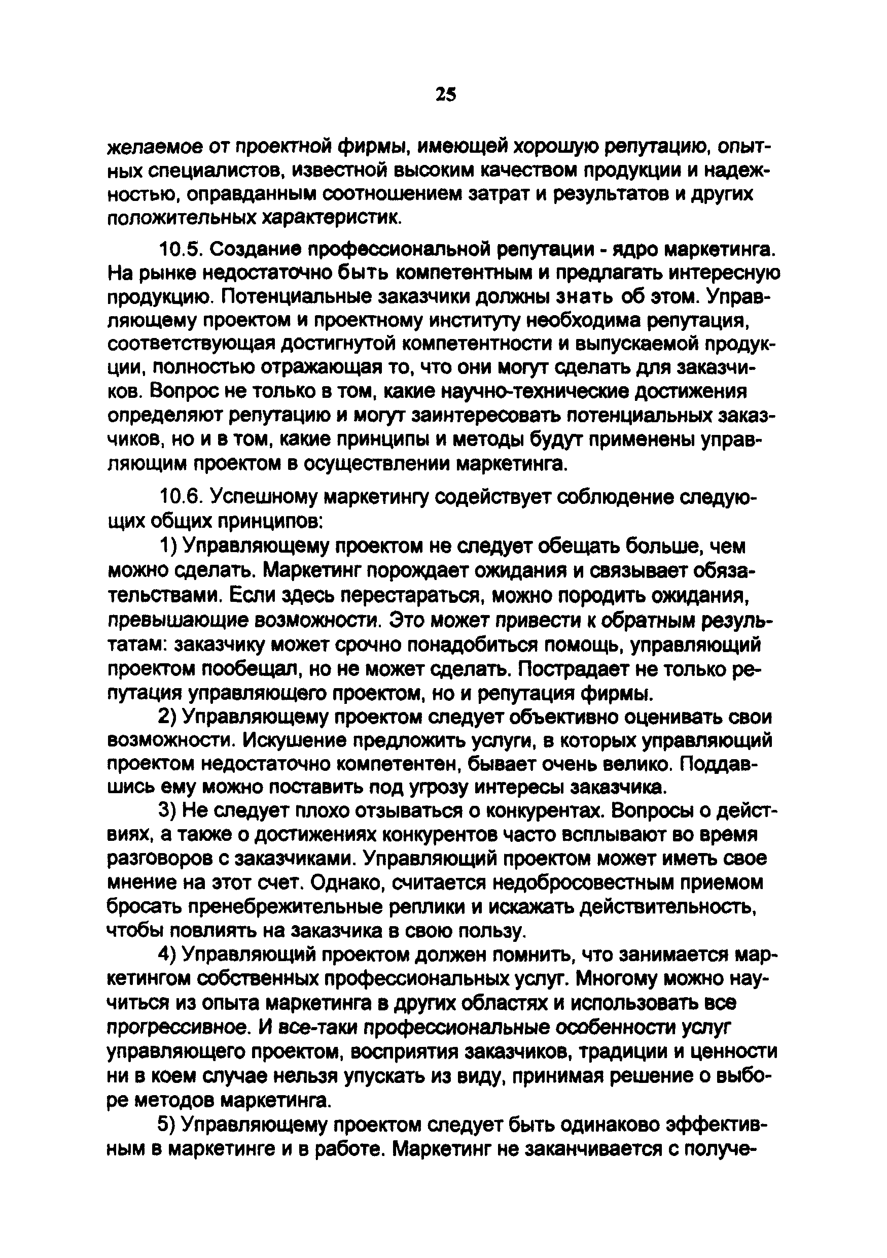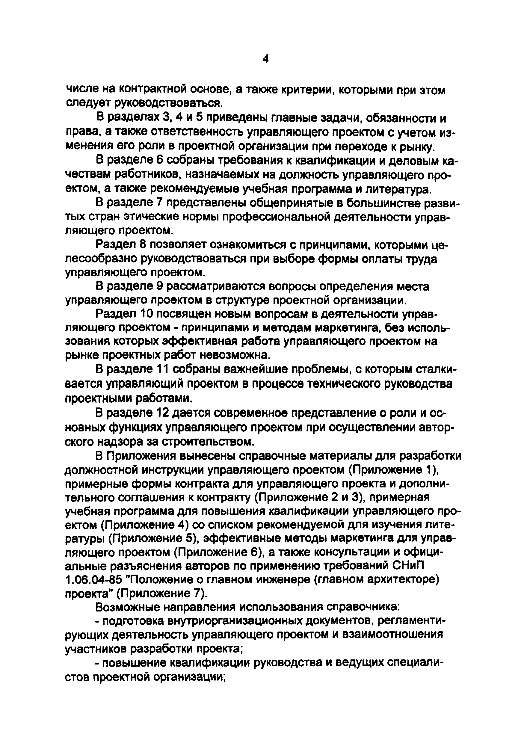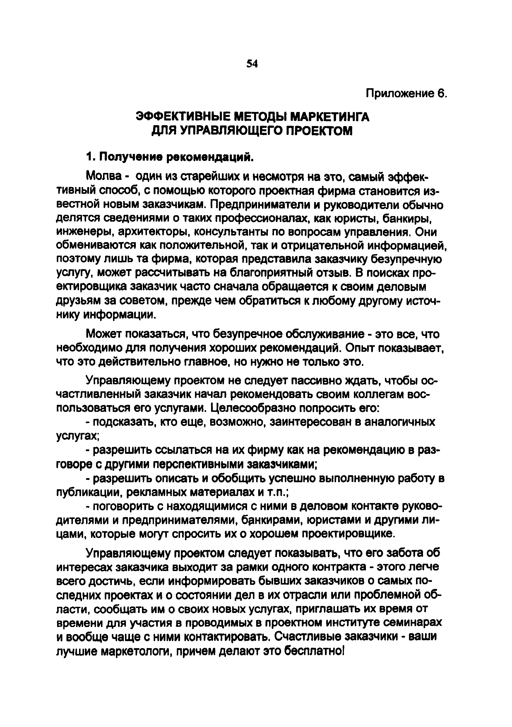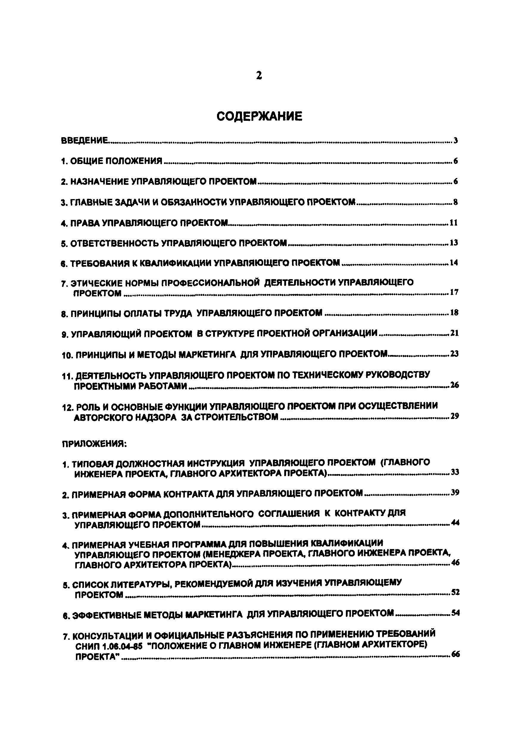 | Оглавление: | Введение 1. Общие положения 2. Назначение управляющего проектом 3. Главные задачи и обязанности управляющего проектом 4. Права управляющего проектом 5. Ответственность управляющего проектом 6. Требования к квалификации управляющего проектом 7. Этические нормы профессиональной деятельности управляющего проектом 8. Принципы оплаты труда управляющего проектом 9. Управляющий проектом в структуре проектной организации 10. Принципы и методы маркетинга для управляющего проектом 11. Деятельность управляющего проектом по техническому руководству проектными работами 12. Роль и основные функции управляющего проектом при осуществлении авторского надзора за строительством Приложения |