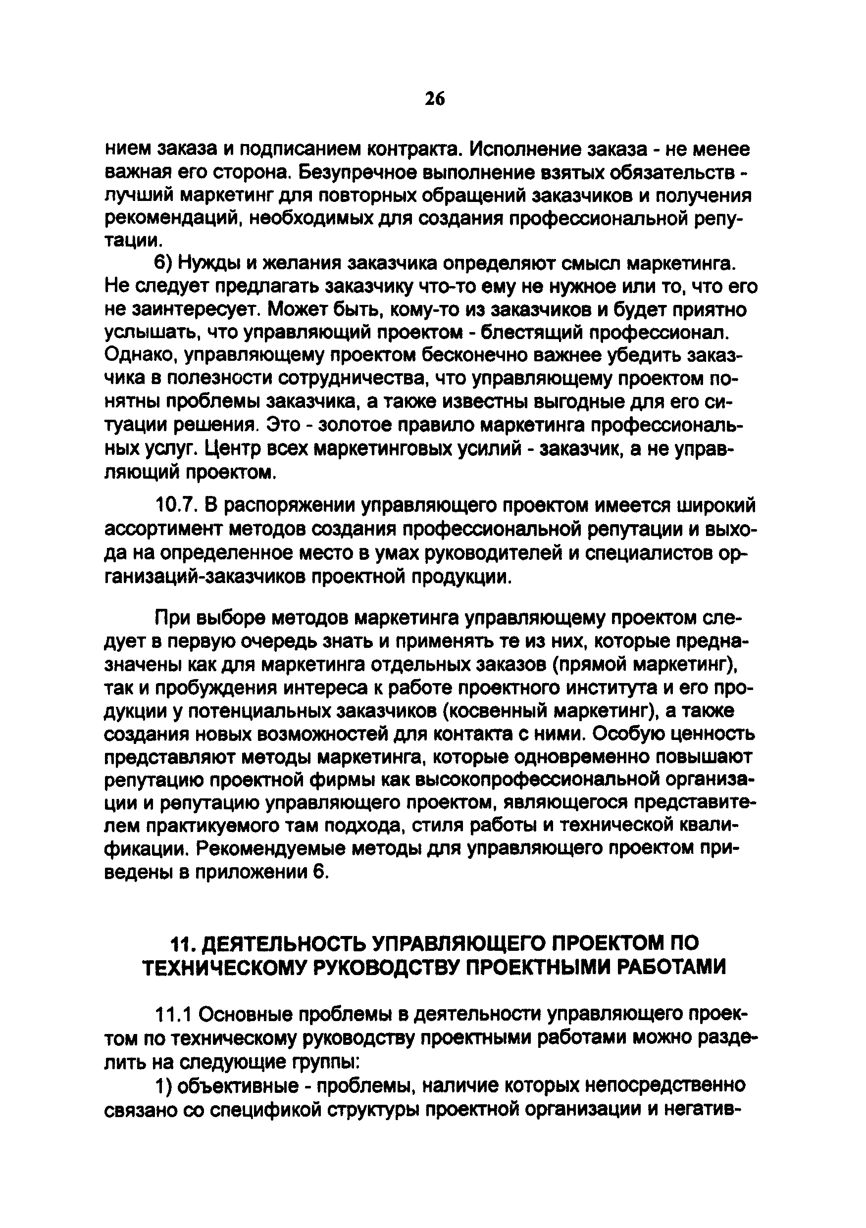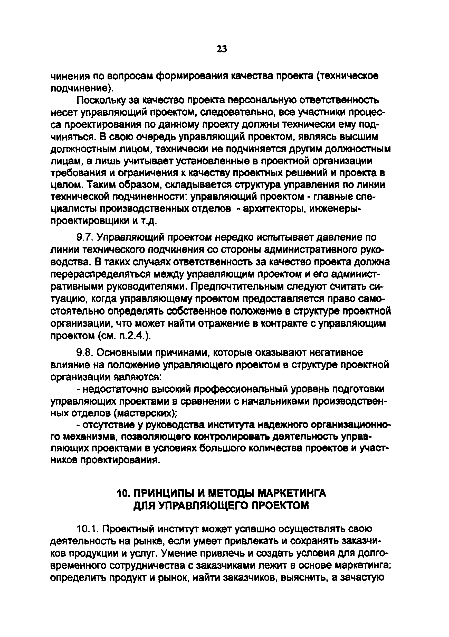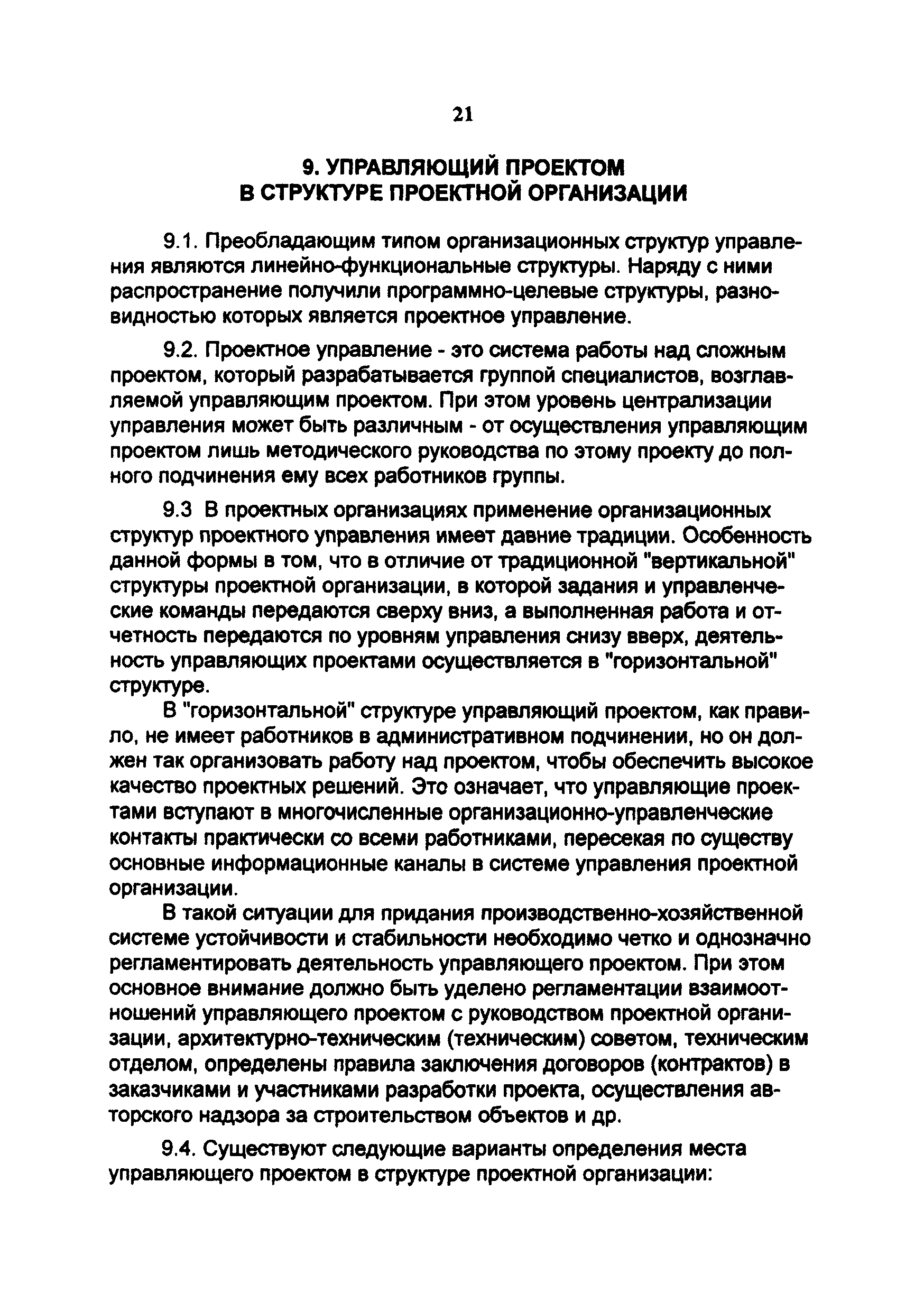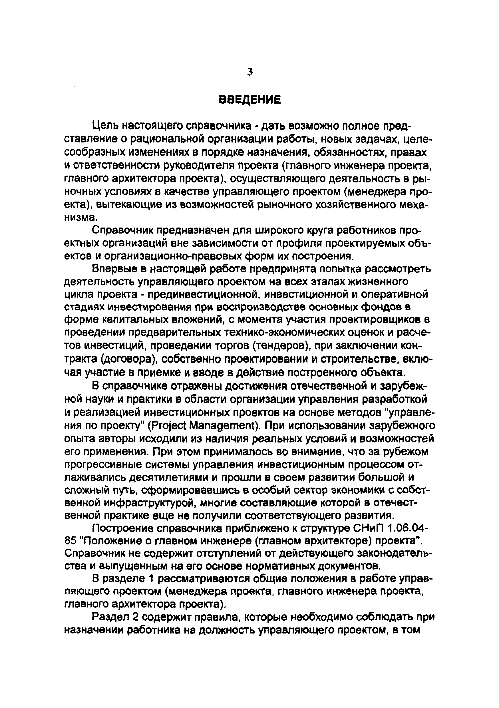| Оглавление: | Введение 1. Общие положения 2. Назначение управляющего проектом 3. Главные задачи и обязанности управляющего проектом 4. Права управляющего проектом 5. Ответственность управляющего проектом 6. Требования к квалификации управляющего проектом 7. Этические нормы профессиональной деятельности управляющего проектом 8. Принципы оплаты труда управляющего проектом 9. Управляющий проектом в структуре проектной организации 10. Принципы и методы маркетинга для управляющего проектом 11. Деятельность управляющего проектом по техническому руководству проектными работами 12. Роль и основные функции управляющего проектом при осуществлении авторского надзора за строительством Приложения |