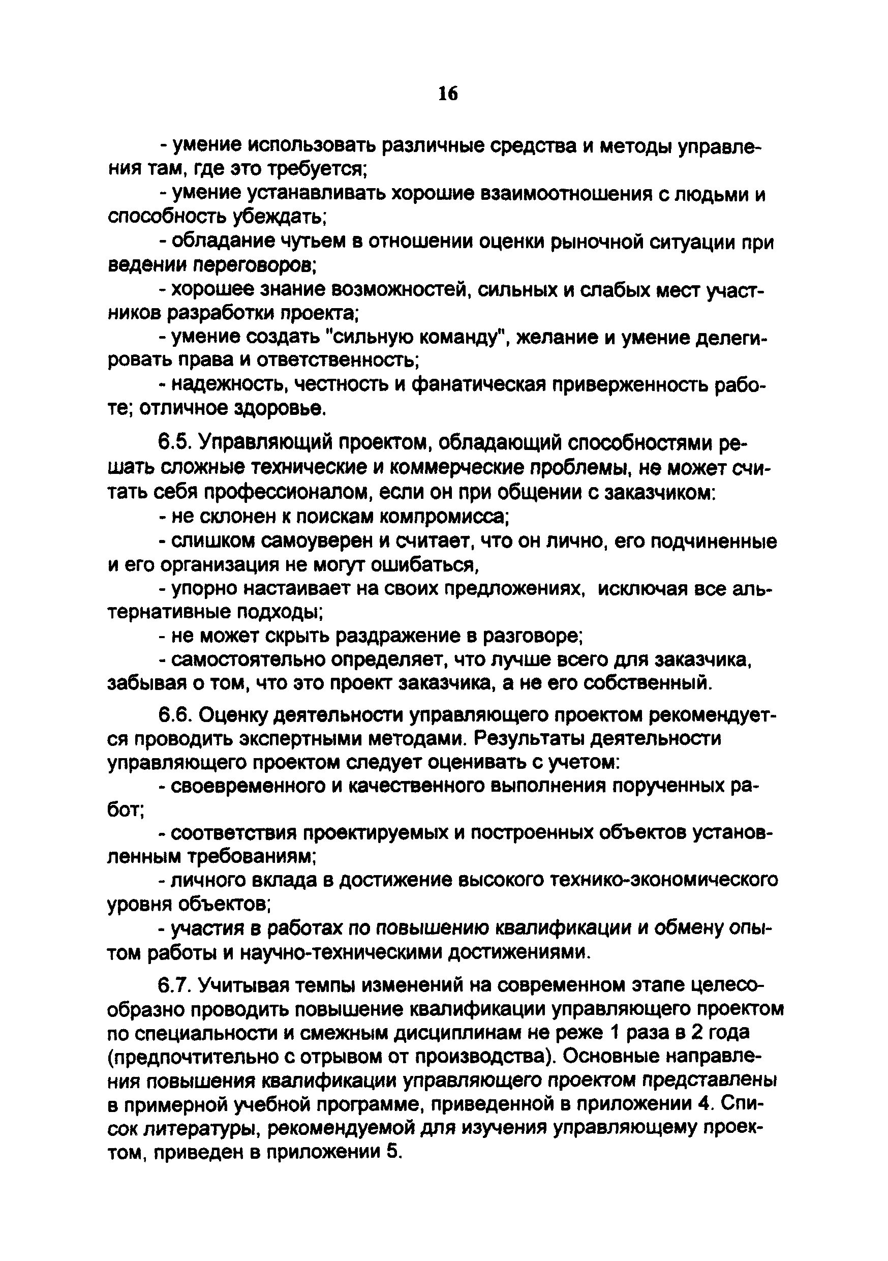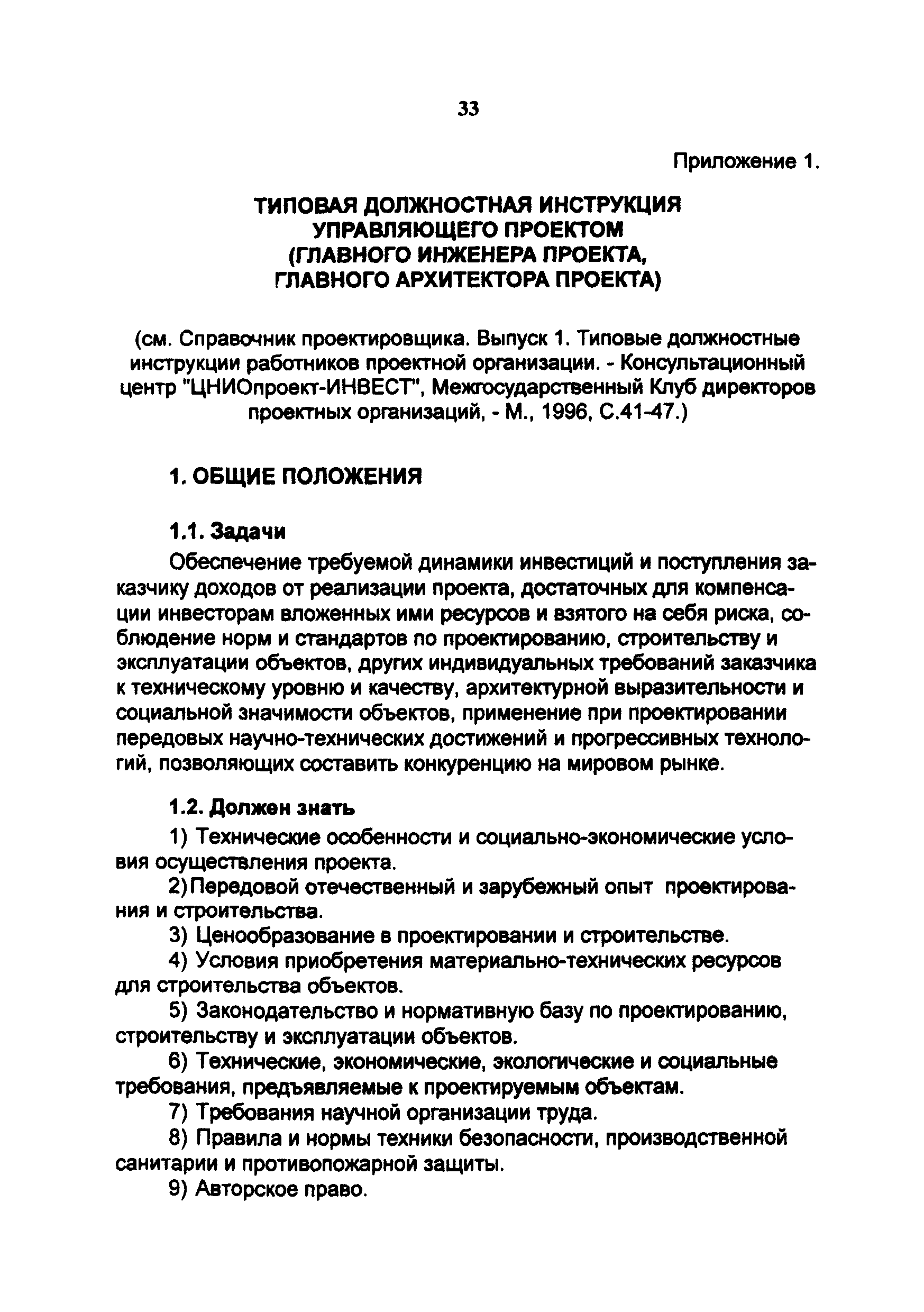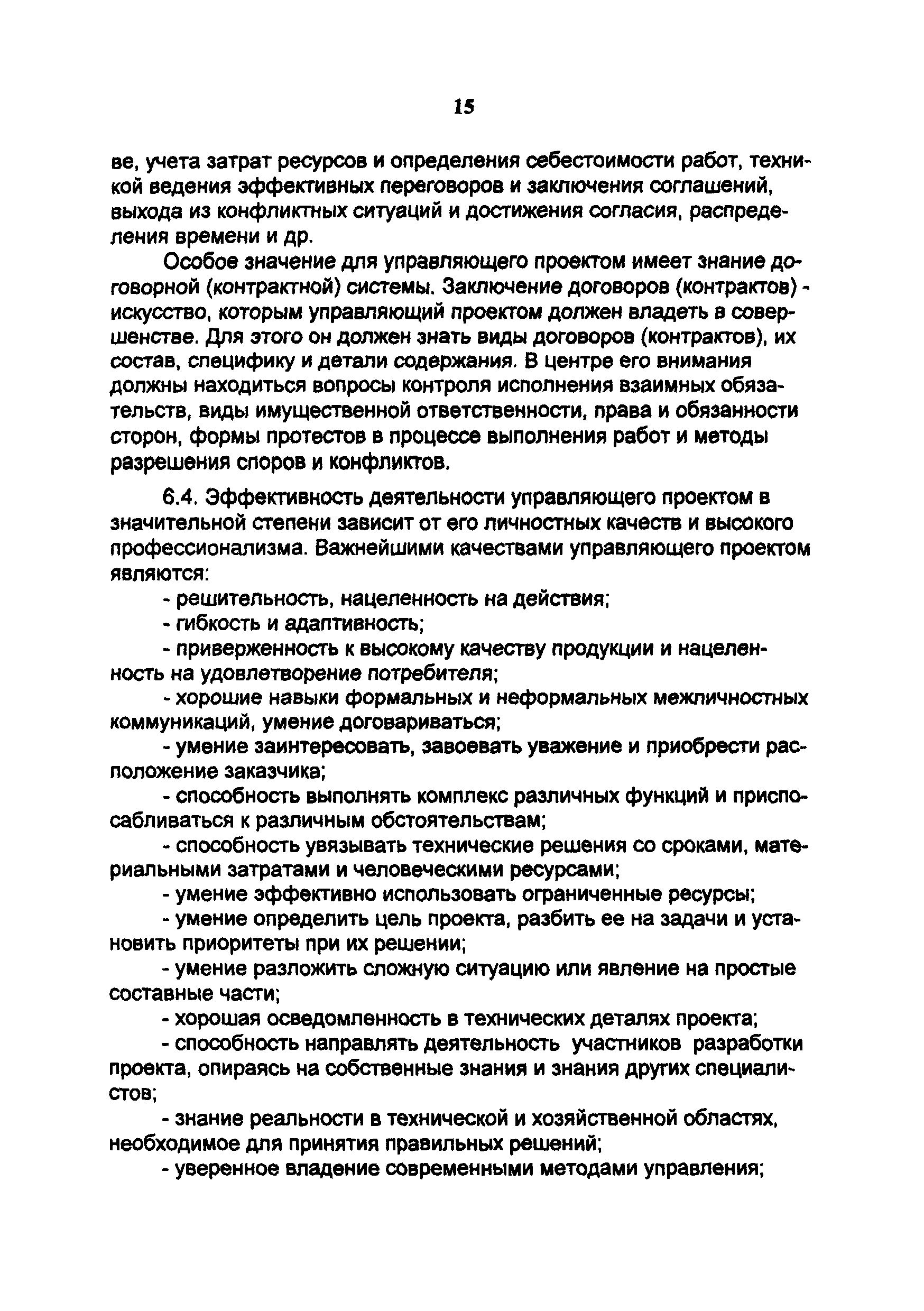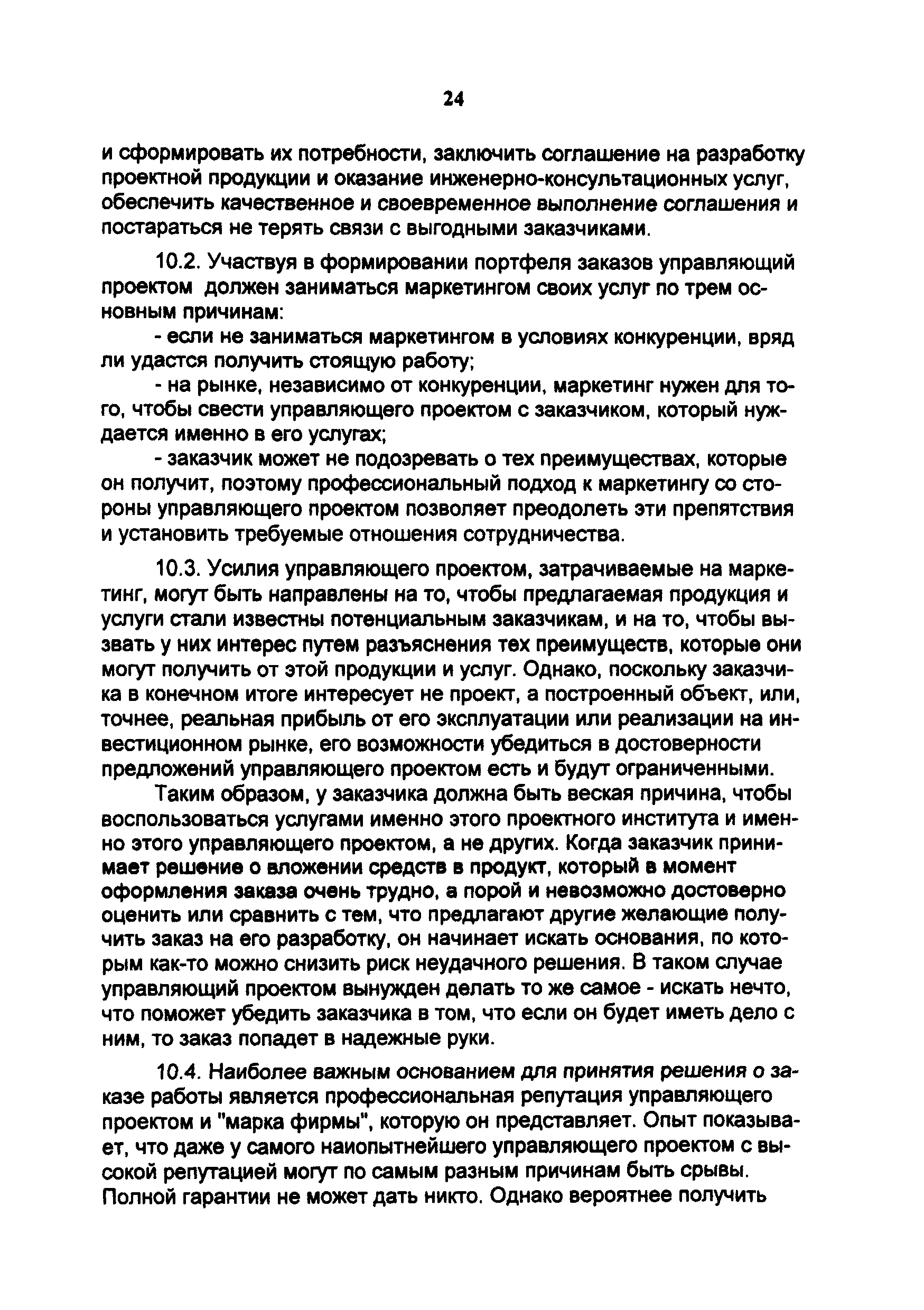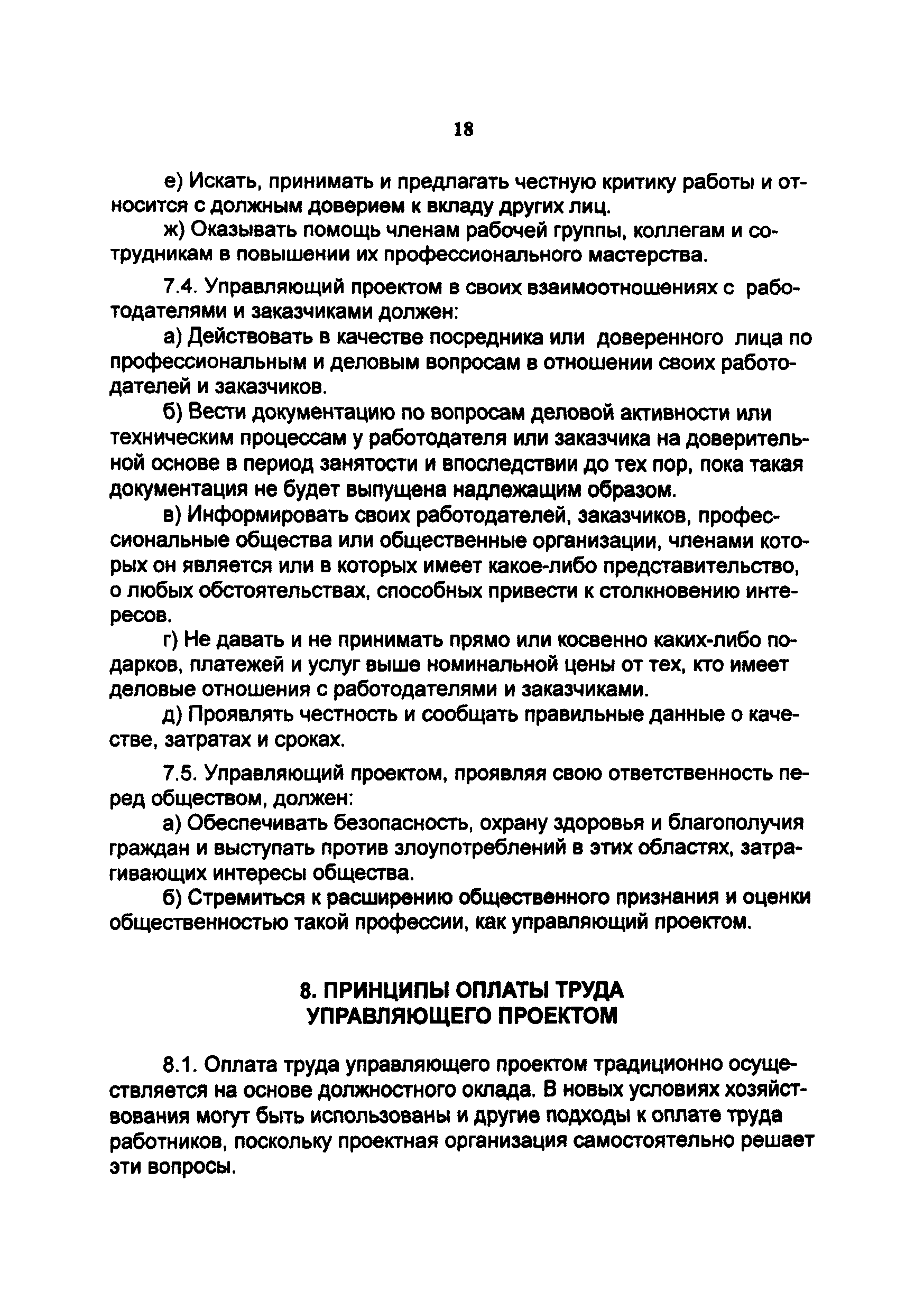 | Оглавление: | Введение 1. Общие положения 2. Назначение управляющего проектом 3. Главные задачи и обязанности управляющего проектом 4. Права управляющего проектом 5. Ответственность управляющего проектом 6. Требования к квалификации управляющего проектом 7. Этические нормы профессиональной деятельности управляющего проектом 8. Принципы оплаты труда управляющего проектом 9. Управляющий проектом в структуре проектной организации 10. Принципы и методы маркетинга для управляющего проектом 11. Деятельность управляющего проектом по техническому руководству проектными работами 12. Роль и основные функции управляющего проектом при осуществлении авторского надзора за строительством Приложения |