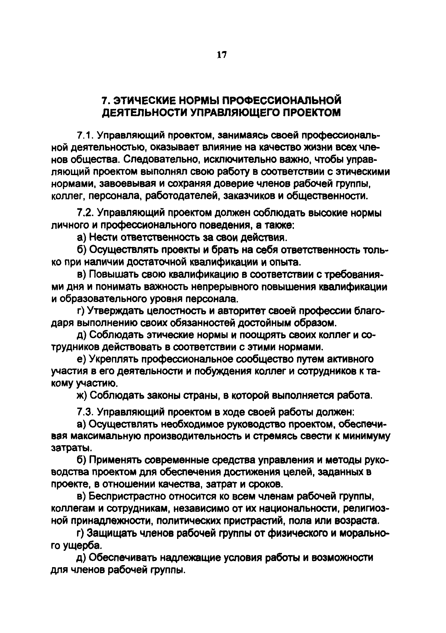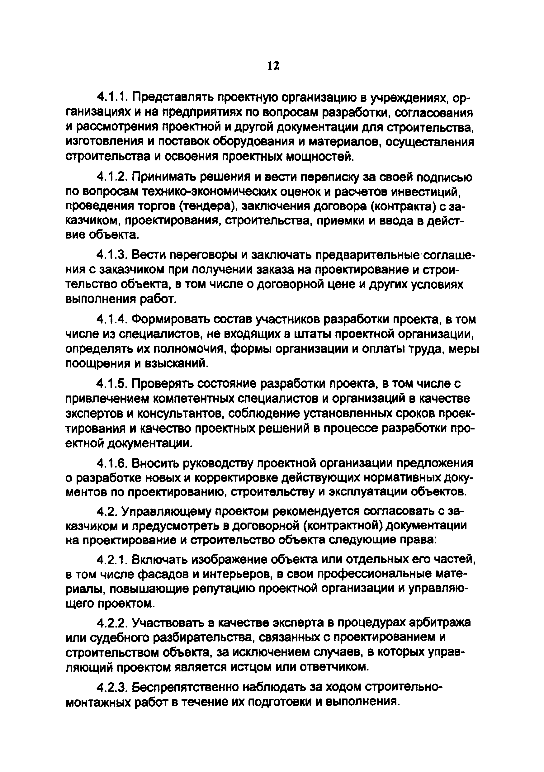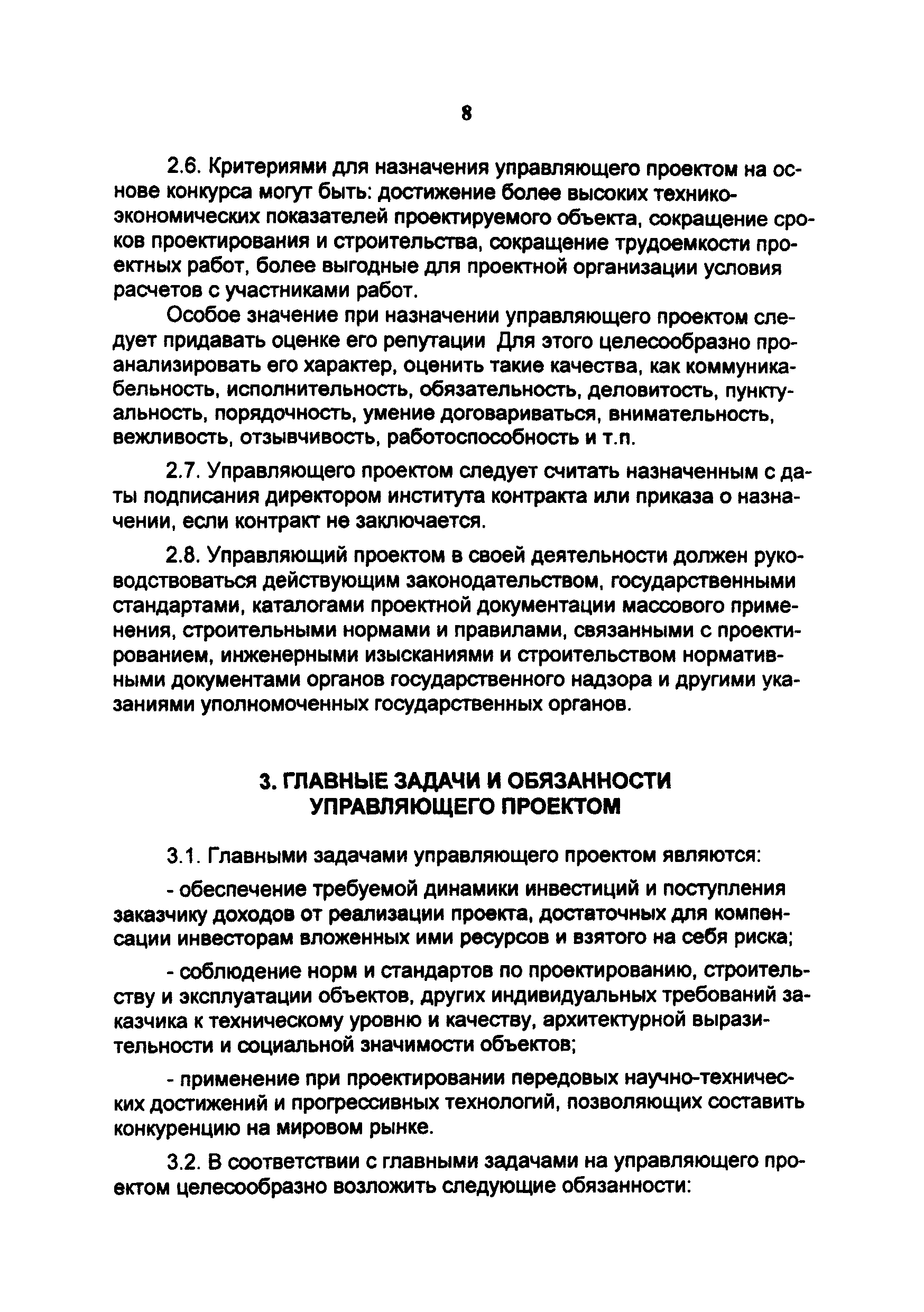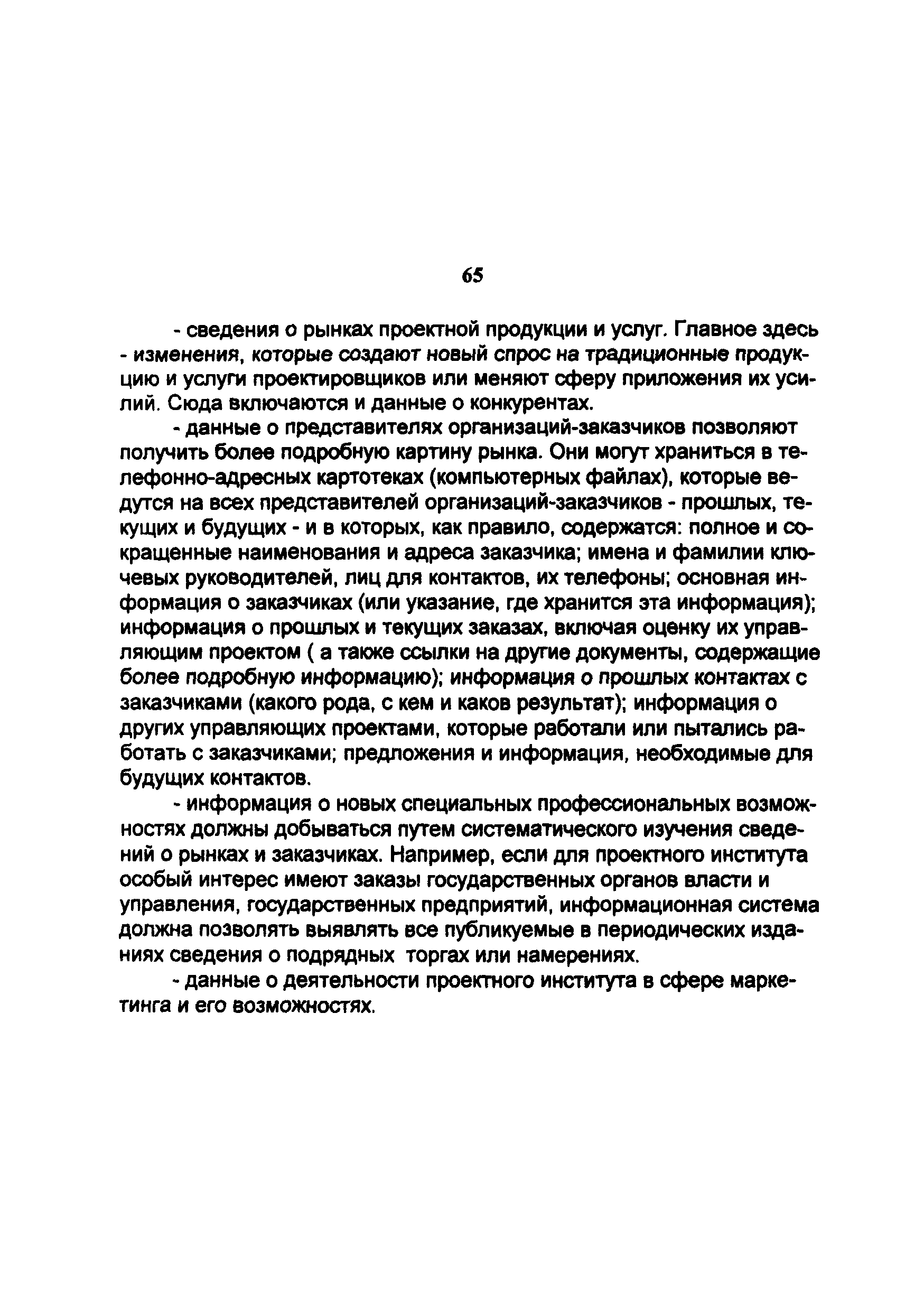 | Оглавление: | Введение 1. Общие положения 2. Назначение управляющего проектом 3. Главные задачи и обязанности управляющего проектом 4. Права управляющего проектом 5. Ответственность управляющего проектом 6. Требования к квалификации управляющего проектом 7. Этические нормы профессиональной деятельности управляющего проектом 8. Принципы оплаты труда управляющего проектом 9. Управляющий проектом в структуре проектной организации 10. Принципы и методы маркетинга для управляющего проектом 11. Деятельность управляющего проектом по техническому руководству проектными работами 12. Роль и основные функции управляющего проектом при осуществлении авторского надзора за строительством Приложения |