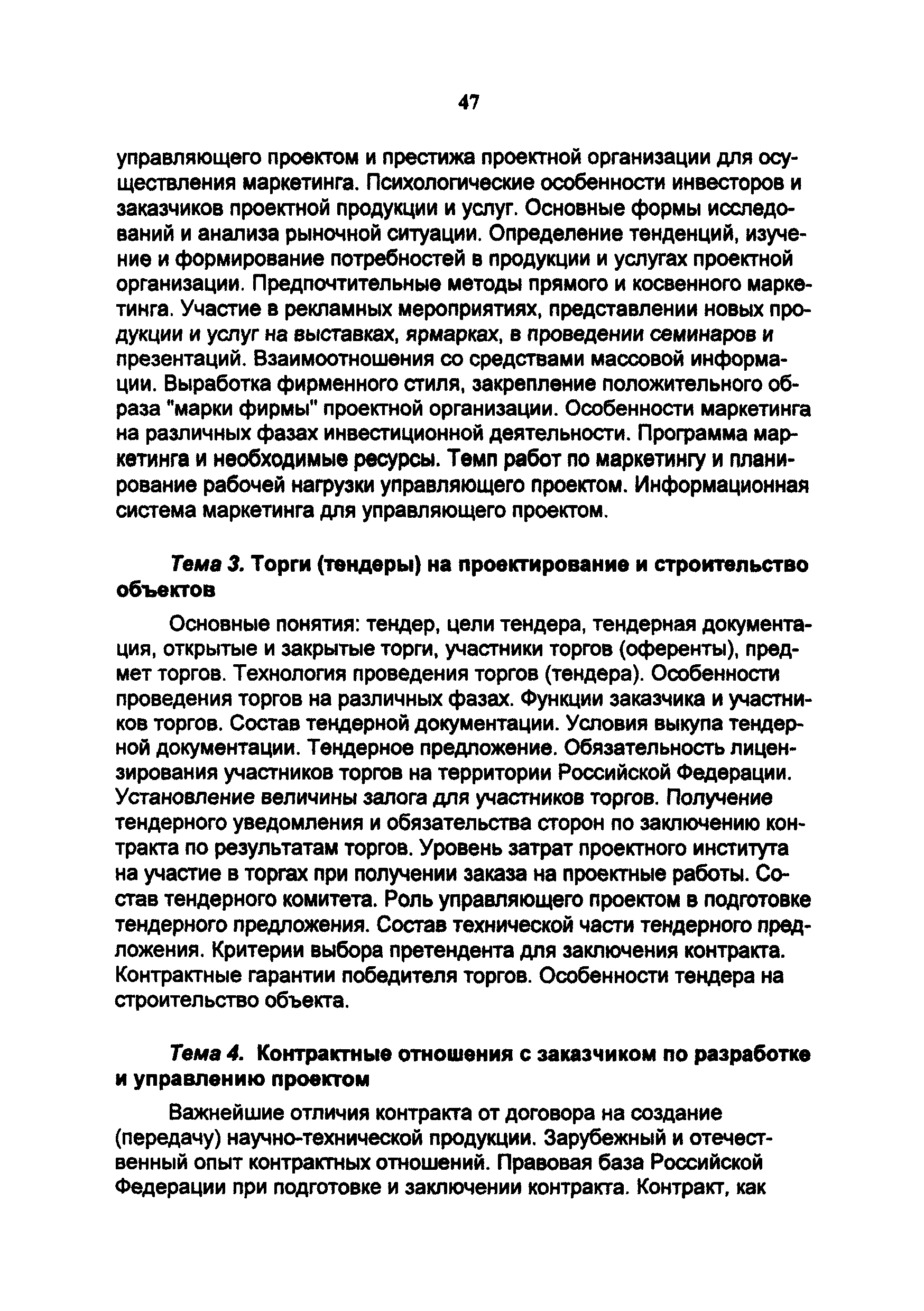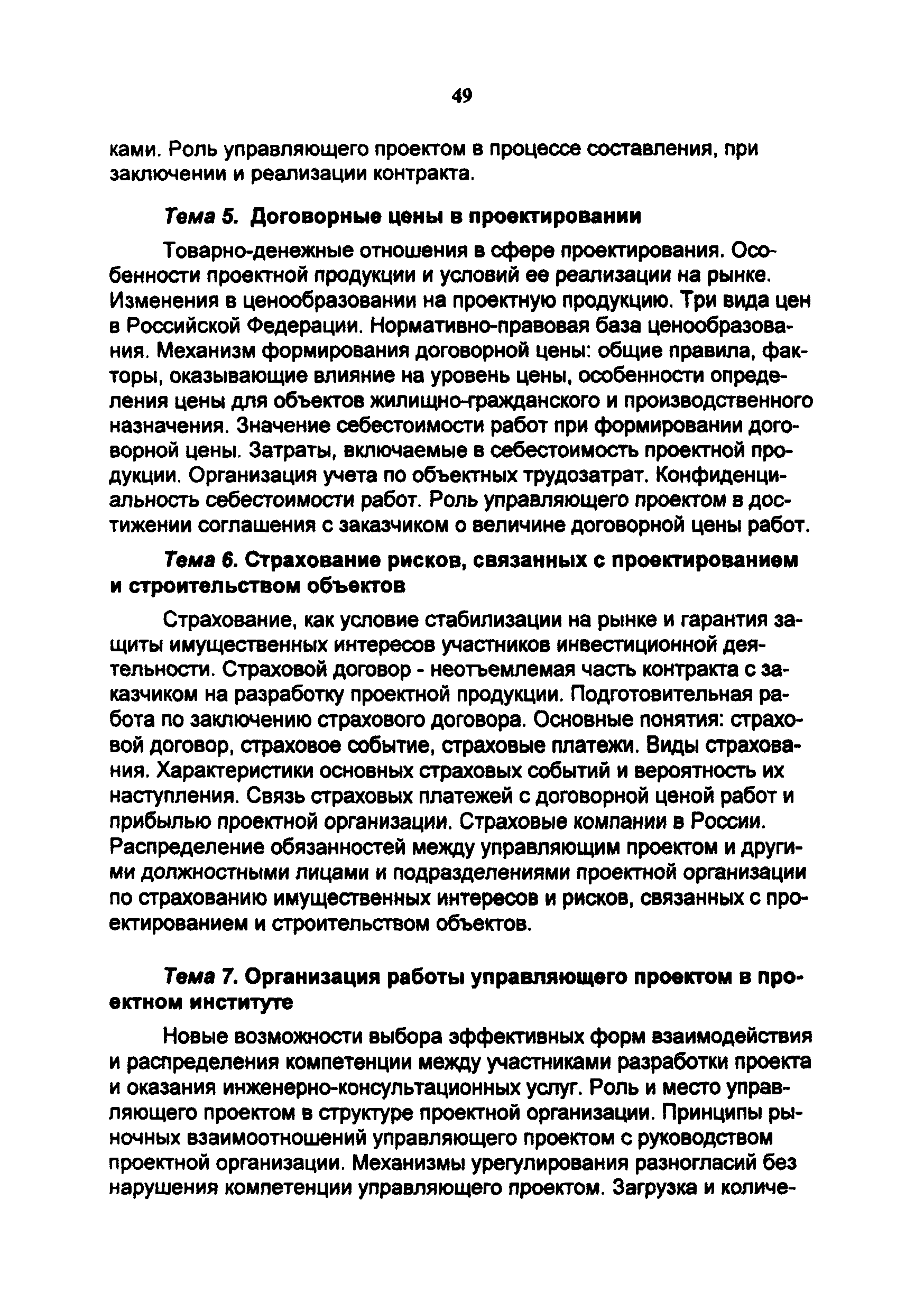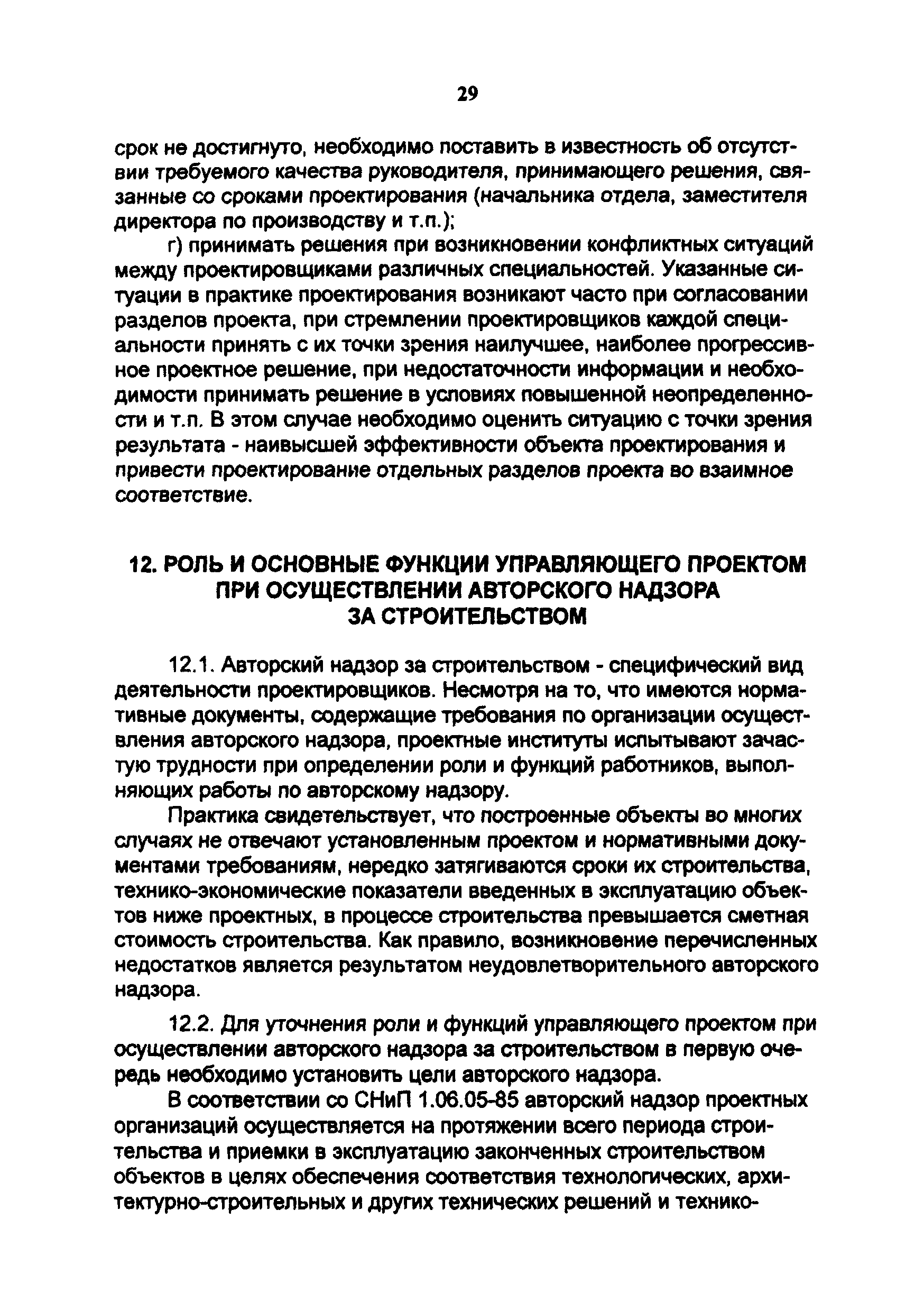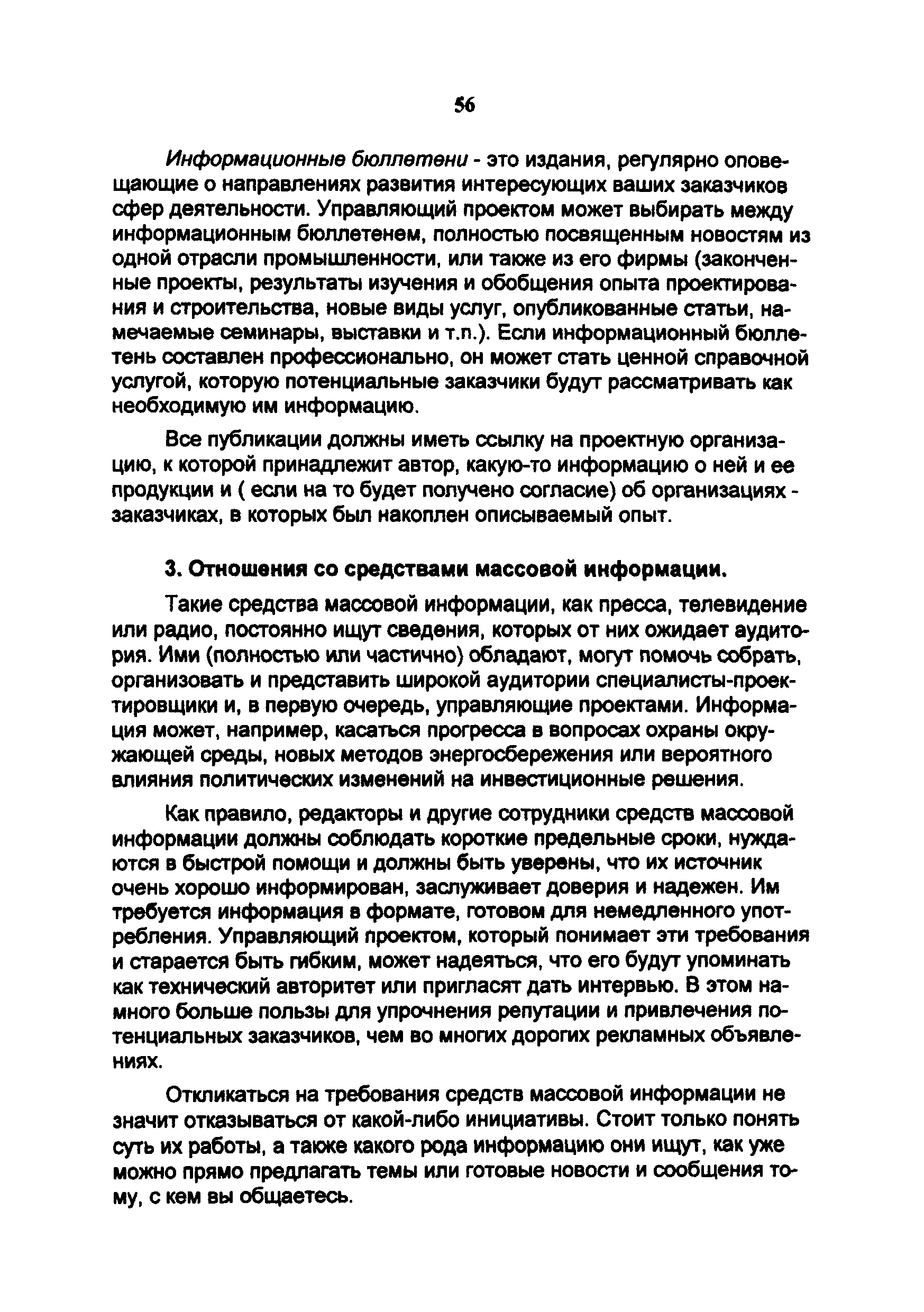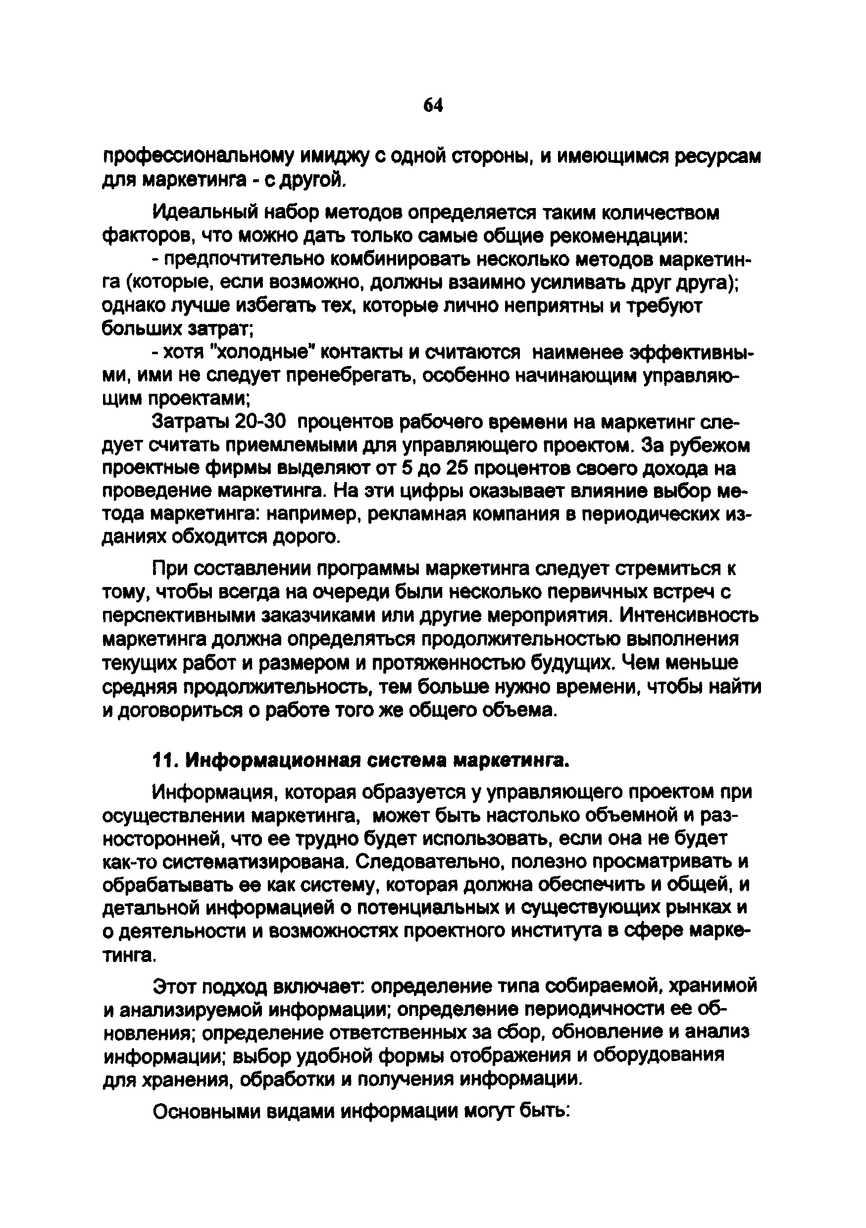 | Оглавление: | Введение 1. Общие положения 2. Назначение управляющего проектом 3. Главные задачи и обязанности управляющего проектом 4. Права управляющего проектом 5. Ответственность управляющего проектом 6. Требования к квалификации управляющего проектом 7. Этические нормы профессиональной деятельности управляющего проектом 8. Принципы оплаты труда управляющего проектом 9. Управляющий проектом в структуре проектной организации 10. Принципы и методы маркетинга для управляющего проектом 11. Деятельность управляющего проектом по техническому руководству проектными работами 12. Роль и основные функции управляющего проектом при осуществлении авторского надзора за строительством Приложения |