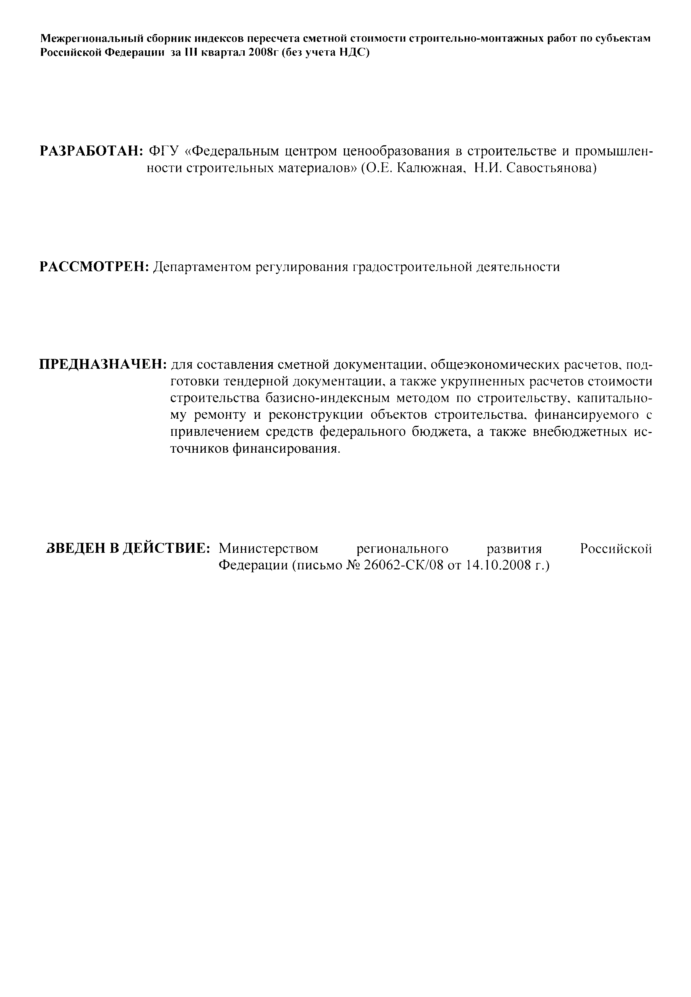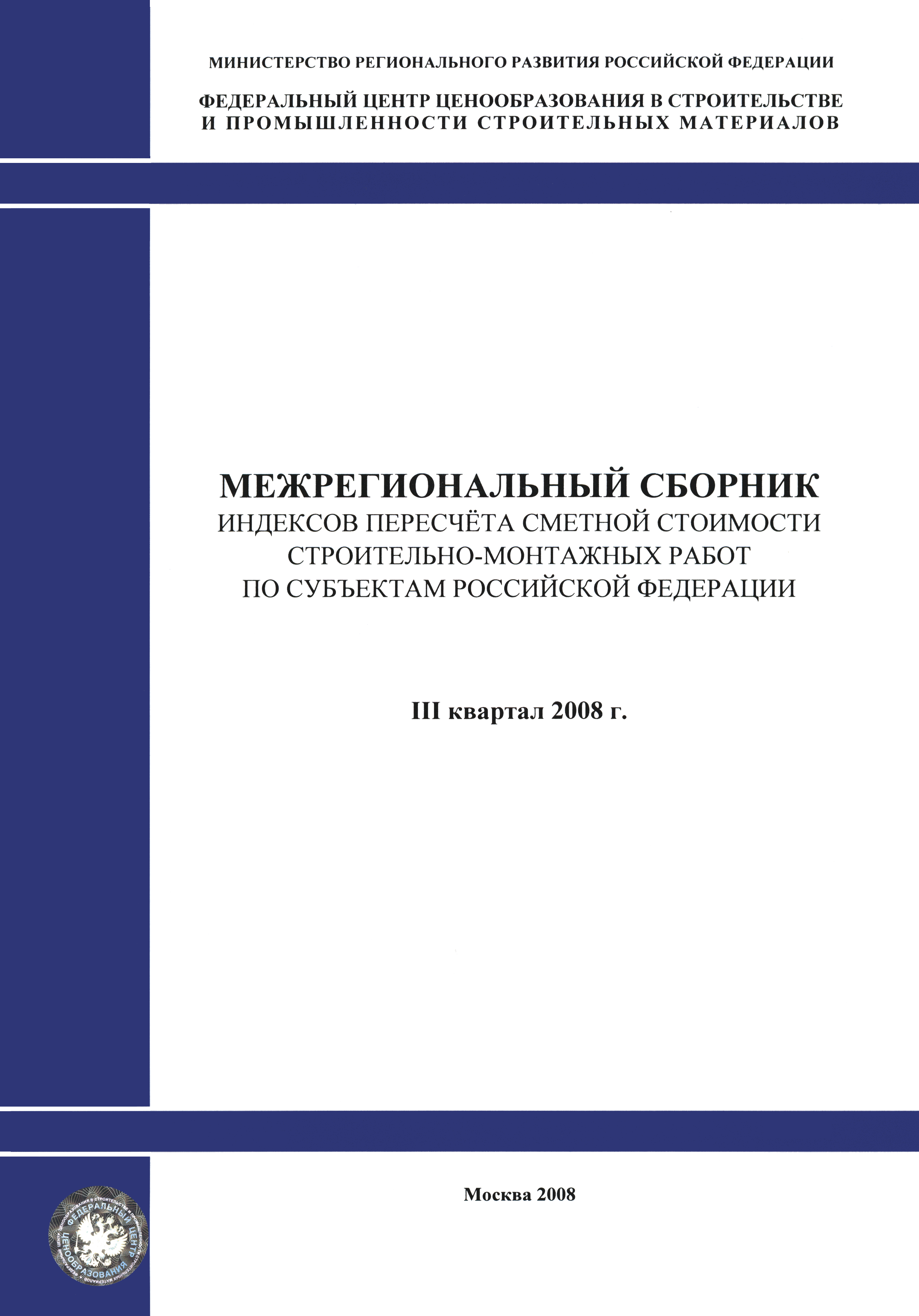 Скачать Межрегиональный сборник индексов пересчета сметной стоимости строительно-монтажных работ по субъектам Российской Федерации на III квартал 2008 г.Дата актуализации: 01.01.2021