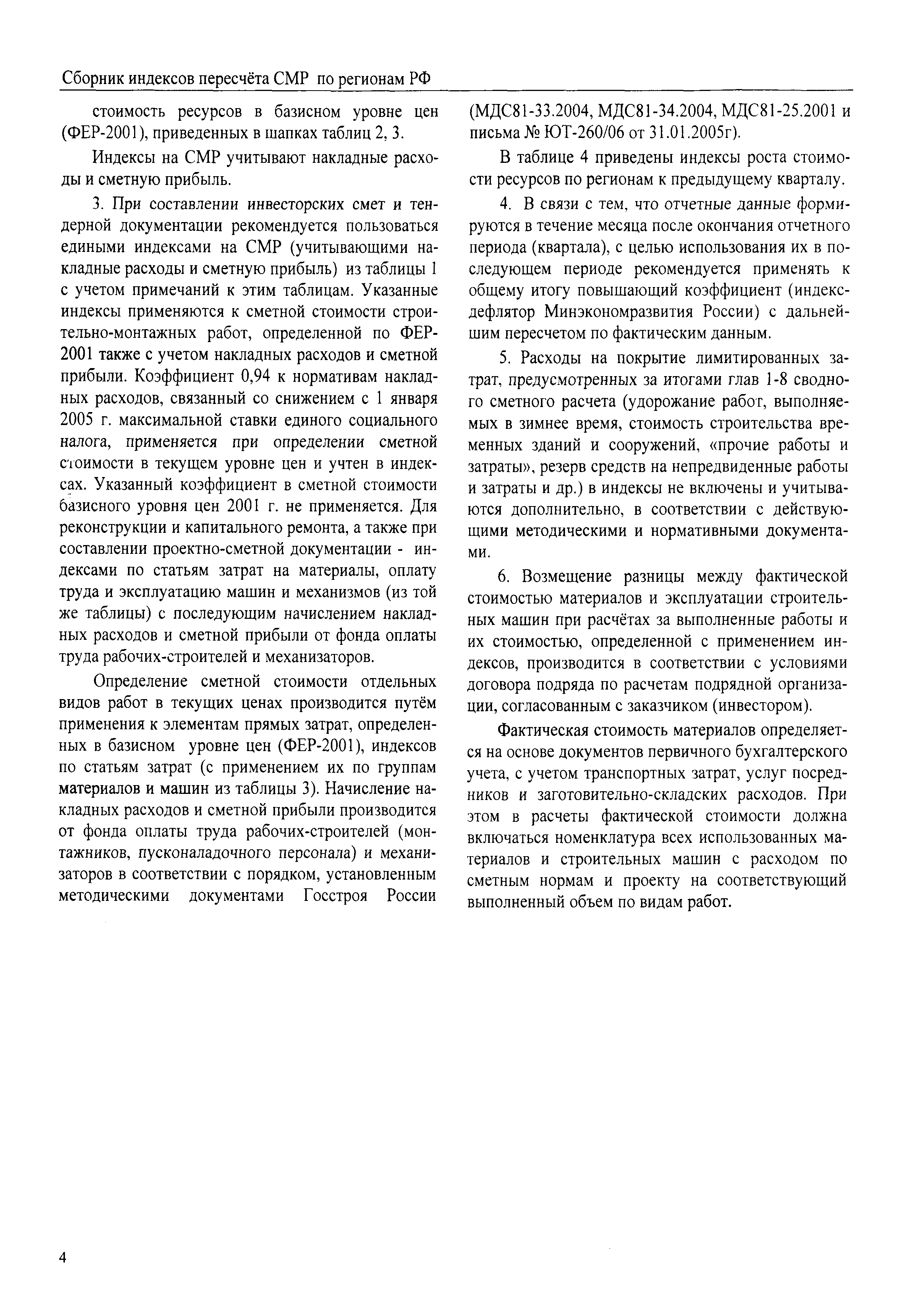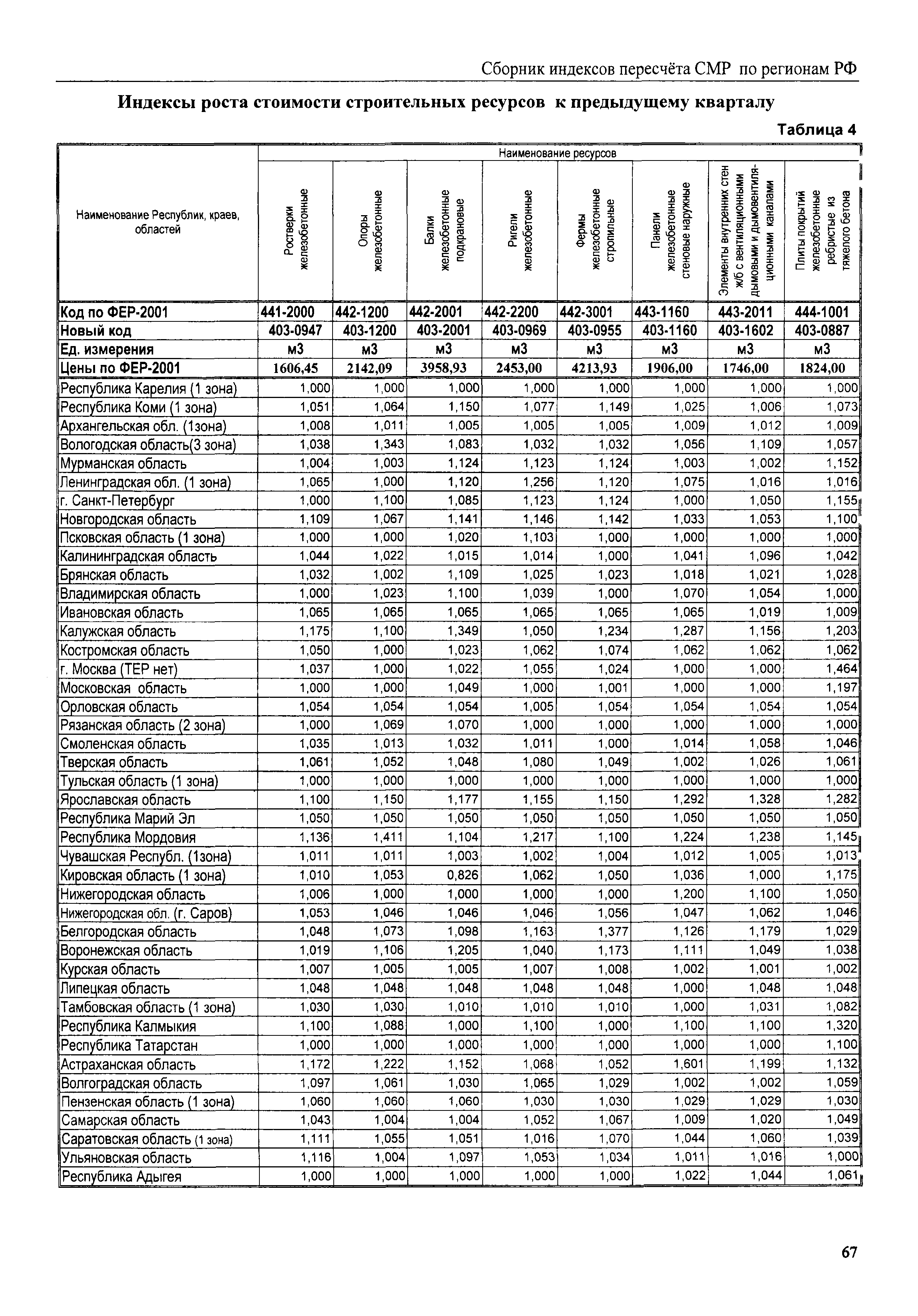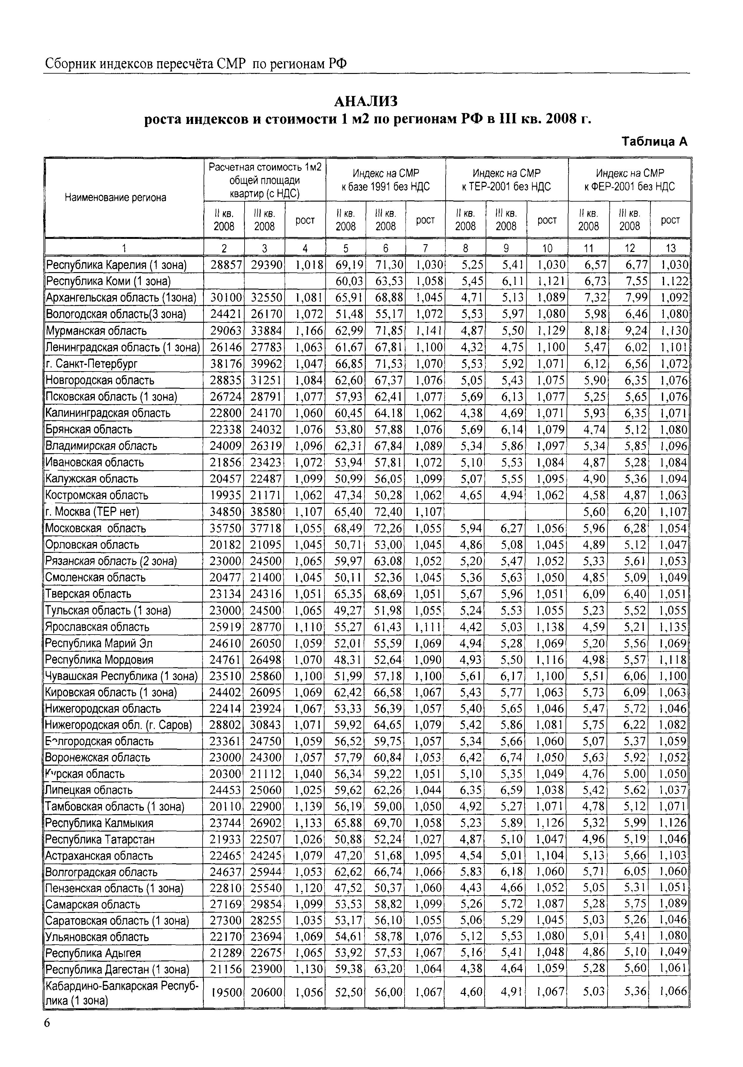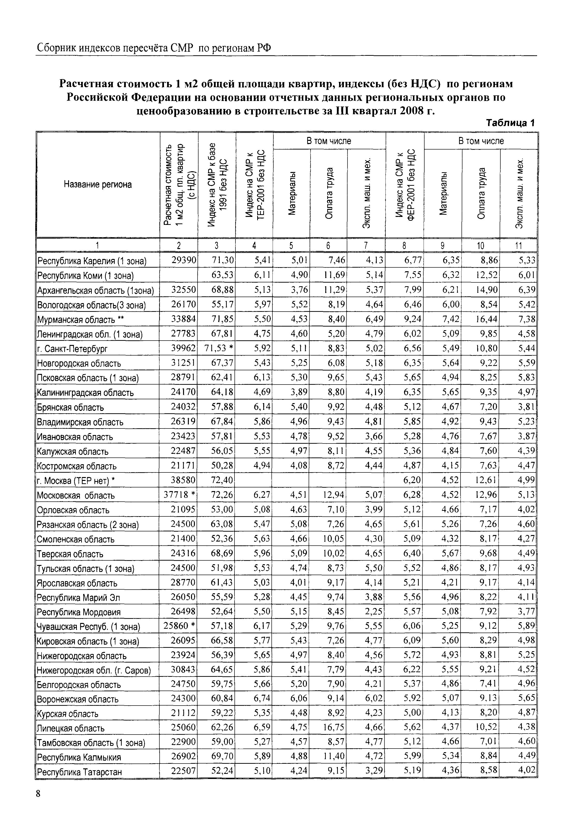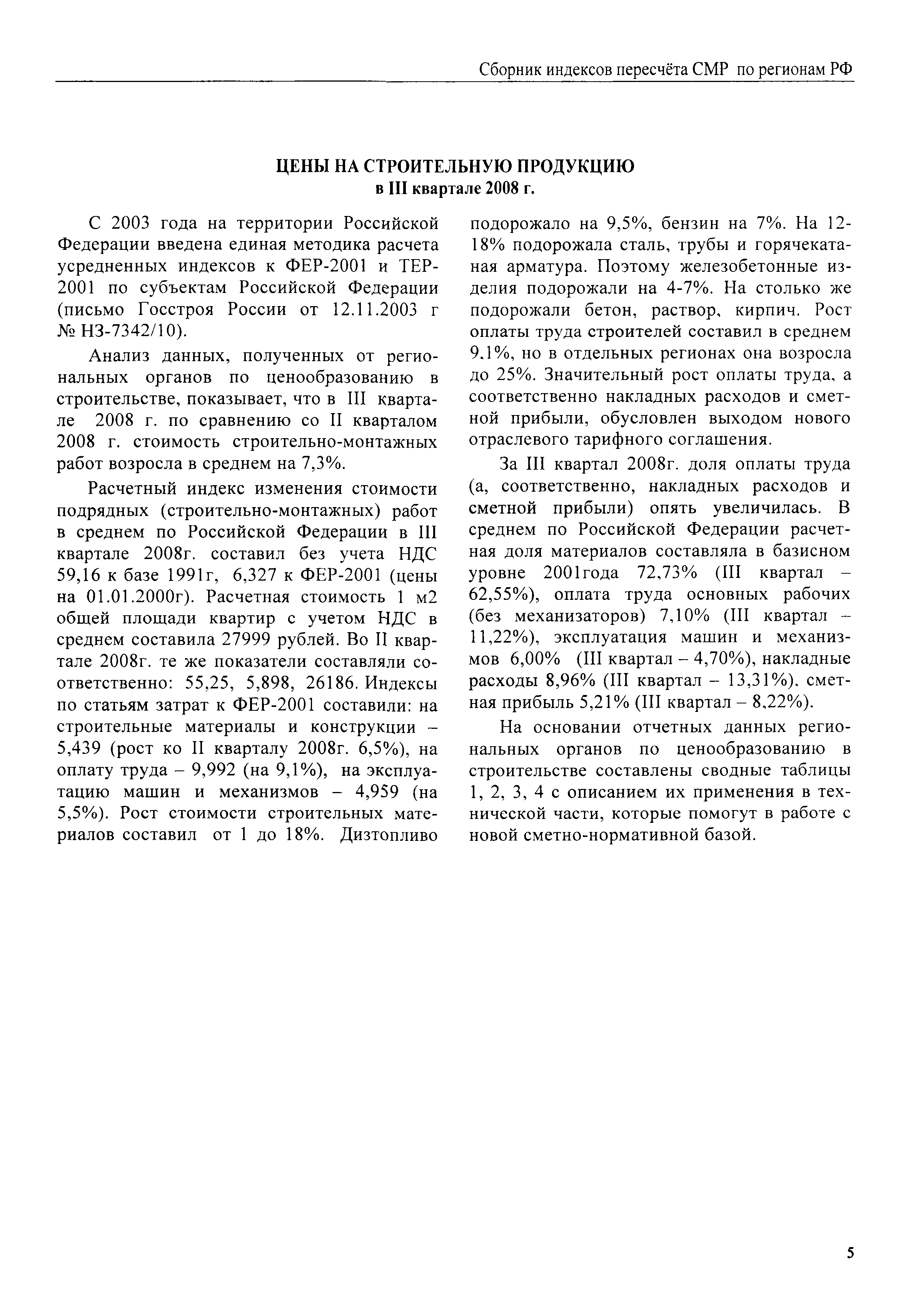 Межрегиональный сборник индексов пересчета сметной стоимости строительно-монтажных работ по субъектам Российской Федерации на III квартал 2008 г.| Статус: | не действует | | Название рус.: | Межрегиональный сборник индексов пересчета сметной стоимости строительно-монтажных работ по субъектам Российской Федерации на III квартал 2008 г. | | Дата добавления в базу: | 01.09.2013 | | Дата актуализации: | 01.09.2013 | | Область применения: | В сборнике приведены сводные таблицы текущих (III квартал 2008 г.) региональных цен на основные ресурсы, применяемые в строительстве, региональные индексы пересчета базисной стоимости строительно-монтажных работ, определяемой с использованием сборников новой сметно-нормативной базы (ФЕР-2001, ТЕР-2001), в территориальный текущий уровень. Индексы разработаны по единой методике, на основании отчетных данных региональных органов по ценообразованию в строительстве о стоимости строительных ресурсов, применяемых в регионе. | | Оглавление: | Общая часть Техническая часть (к таблицам 1, 2, 3, 4) Цены на строительную продукцию в III квартале 2008 г. Анализ роста индексов и стоимости 1 м2 по субъектам Российской Федерации в III квартале 2008 г. – таблица А Расчетная стоимость 1 м2 общей площади квартир и индексы изменения стоимости строительства по субъектам Российской Федерации за III квартал 2008 г. – Таблица 1 Сметная стоимость строительных ресурсов (без НДС) в руб. - Таблица 2 Индексы на отдельные виды ресурсов (к заложенным в ФЕР-2001) - Таблица 3 Индексы роста стоимости строительных ресурсов к предыдущему кварталу - Таблица 4 Региональные индексы к ФЕР-2001 и ТЕР-2001 по основным видам объектов строительства - Таблица 5 Региональные индексы изменения стоимости строительно-монтажных работ по отдельным видам объектов строительства Индексы на технологическое оборудование за III квартал 2008 г. Индексы на прочие работы и затраты за III квартал 2008 г. |