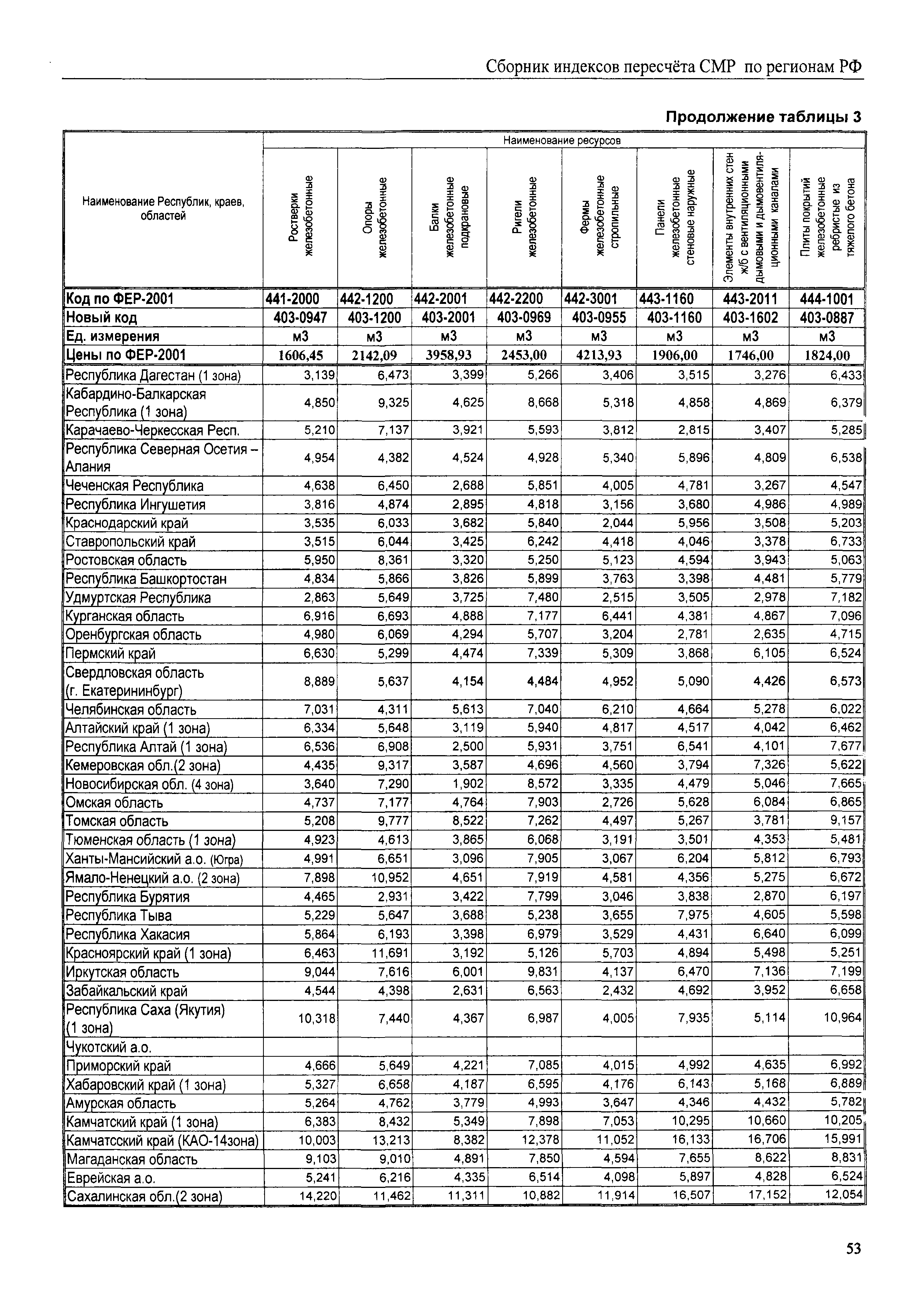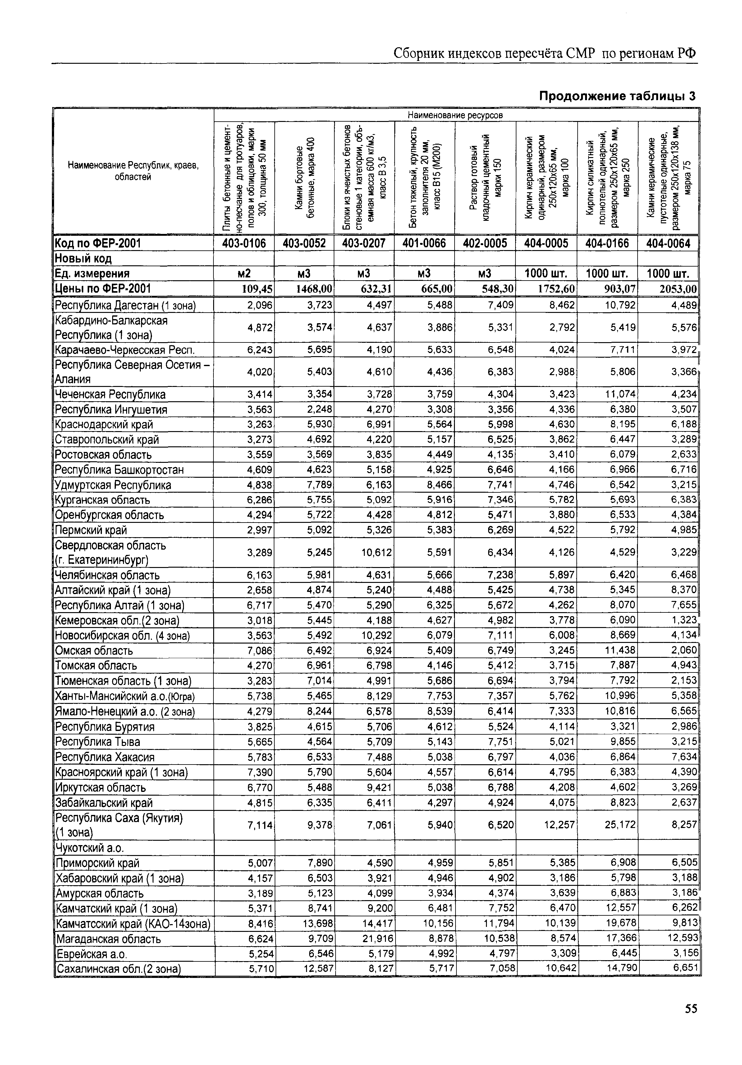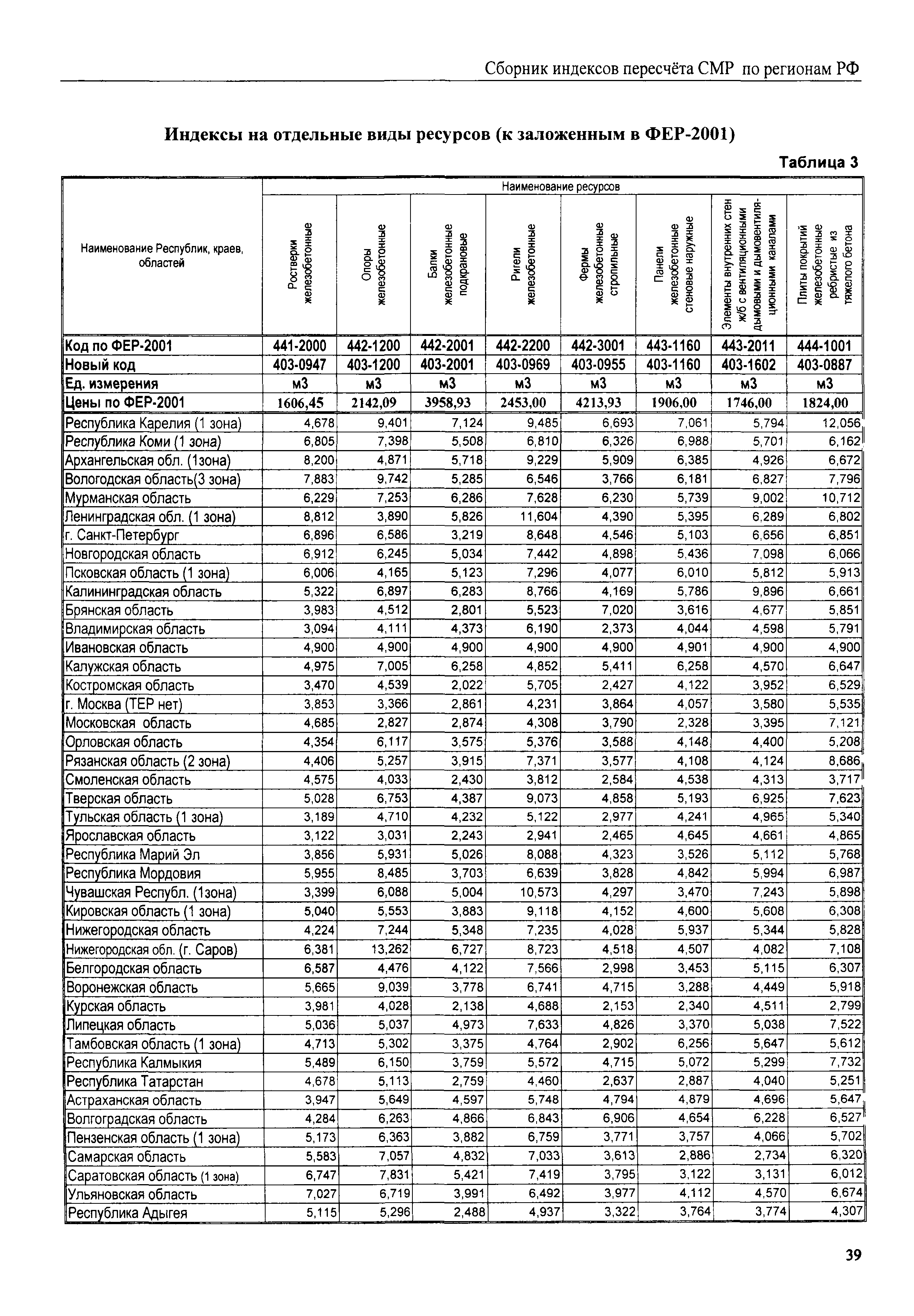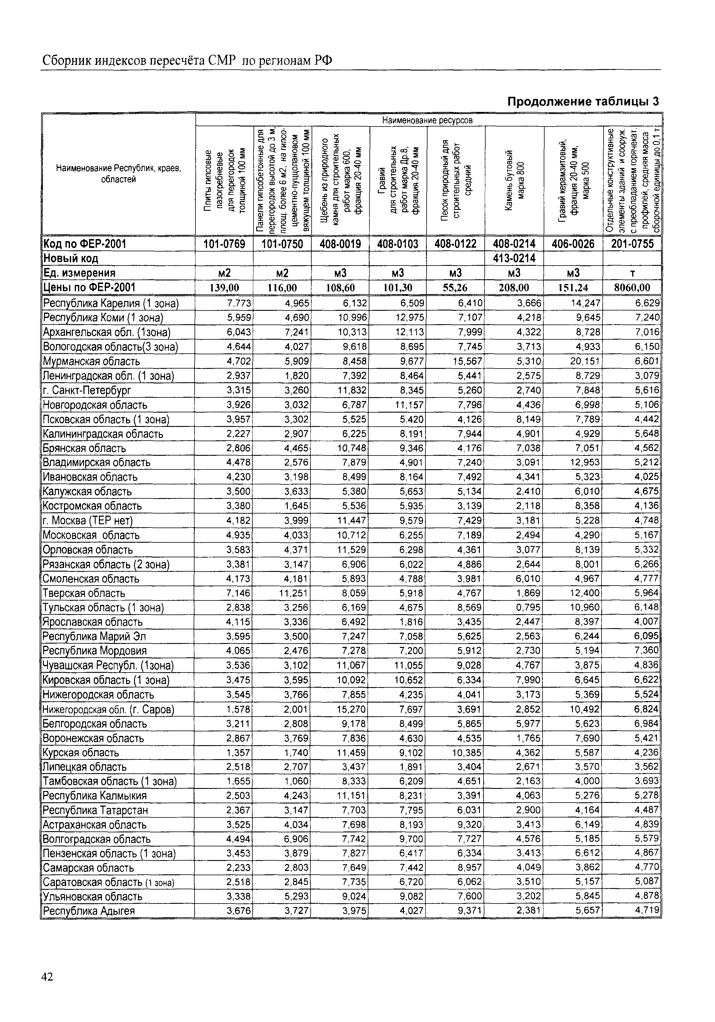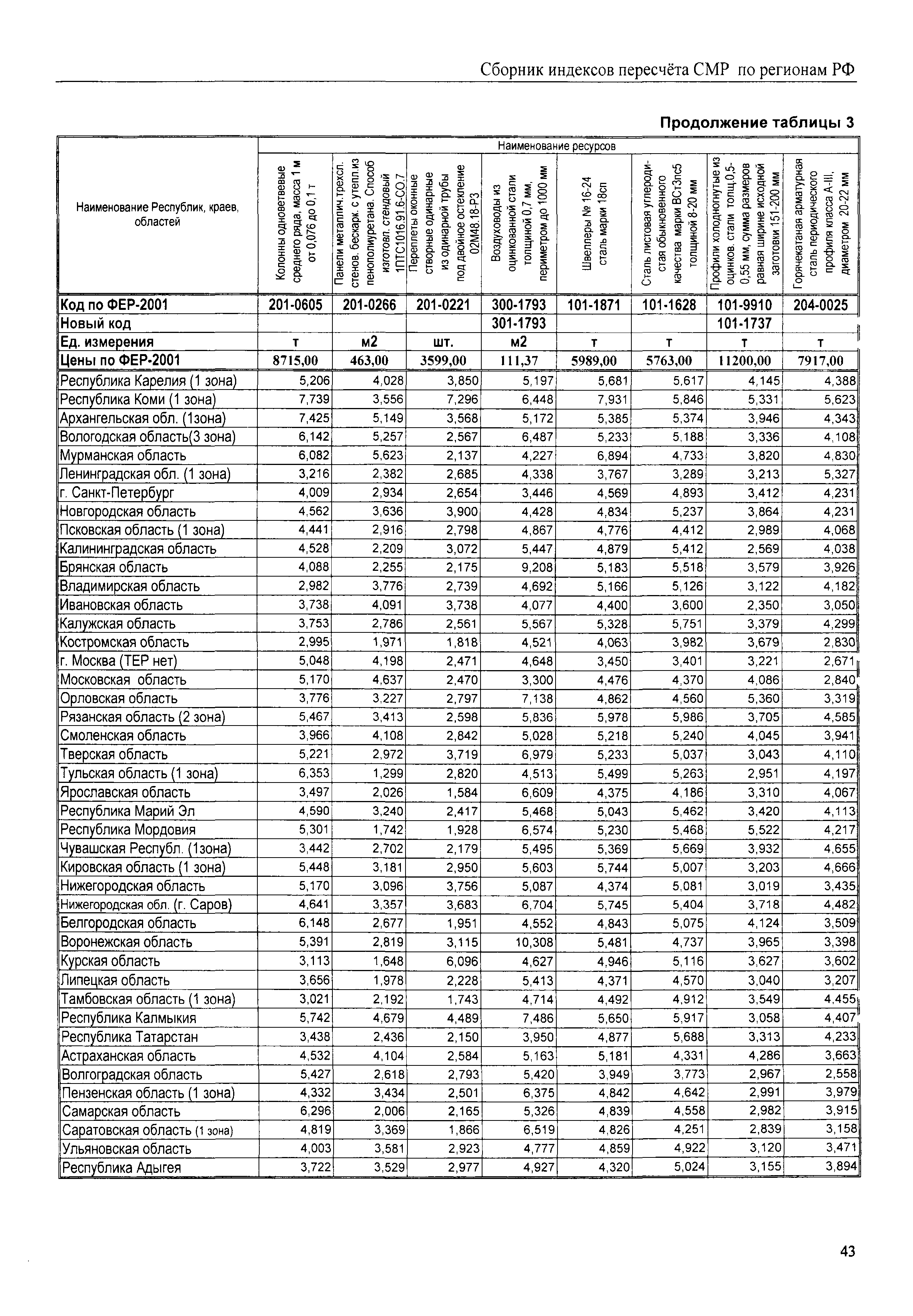 Межрегиональный сборник индексов пересчета сметной стоимости строительно-монтажных работ по субъектам Российской Федерации на III квартал 2008 г.| Статус: | не действует | | Название рус.: | Межрегиональный сборник индексов пересчета сметной стоимости строительно-монтажных работ по субъектам Российской Федерации на III квартал 2008 г. | | Дата добавления в базу: | 01.09.2013 | | Дата актуализации: | 01.09.2013 | | Область применения: | В сборнике приведены сводные таблицы текущих (III квартал 2008 г.) региональных цен на основные ресурсы, применяемые в строительстве, региональные индексы пересчета базисной стоимости строительно-монтажных работ, определяемой с использованием сборников новой сметно-нормативной базы (ФЕР-2001, ТЕР-2001), в территориальный текущий уровень. Индексы разработаны по единой методике, на основании отчетных данных региональных органов по ценообразованию в строительстве о стоимости строительных ресурсов, применяемых в регионе. | | Оглавление: | Общая часть Техническая часть (к таблицам 1, 2, 3, 4) Цены на строительную продукцию в III квартале 2008 г. Анализ роста индексов и стоимости 1 м2 по субъектам Российской Федерации в III квартале 2008 г. – таблица А Расчетная стоимость 1 м2 общей площади квартир и индексы изменения стоимости строительства по субъектам Российской Федерации за III квартал 2008 г. – Таблица 1 Сметная стоимость строительных ресурсов (без НДС) в руб. - Таблица 2 Индексы на отдельные виды ресурсов (к заложенным в ФЕР-2001) - Таблица 3 Индексы роста стоимости строительных ресурсов к предыдущему кварталу - Таблица 4 Региональные индексы к ФЕР-2001 и ТЕР-2001 по основным видам объектов строительства - Таблица 5 Региональные индексы изменения стоимости строительно-монтажных работ по отдельным видам объектов строительства Индексы на технологическое оборудование за III квартал 2008 г. Индексы на прочие работы и затраты за III квартал 2008 г. |