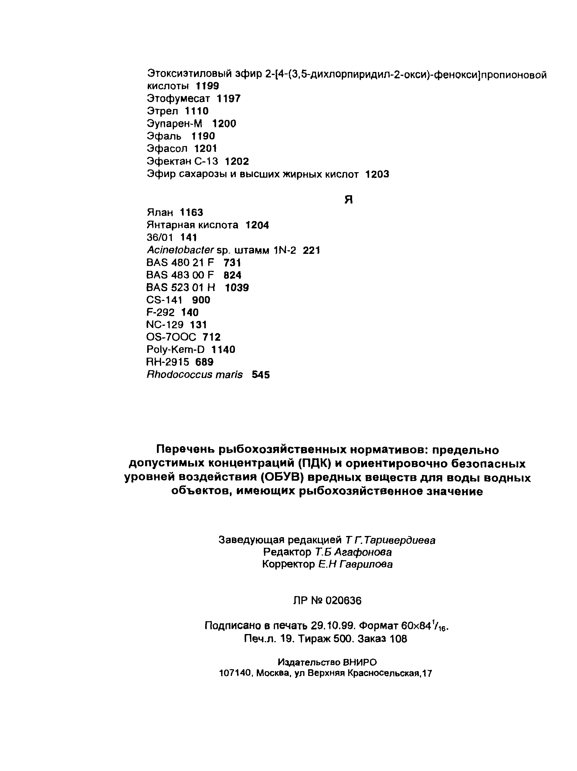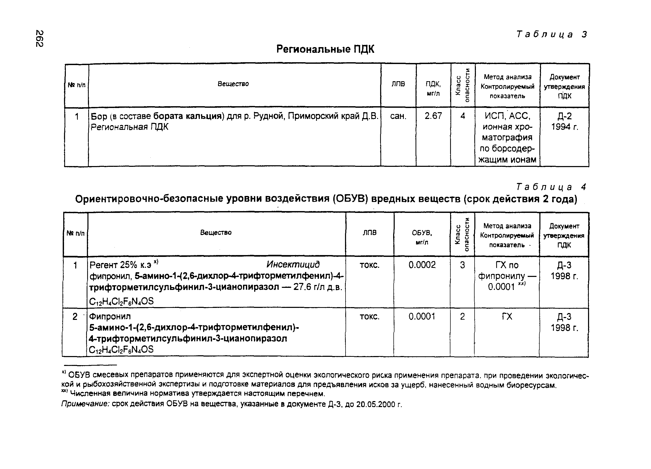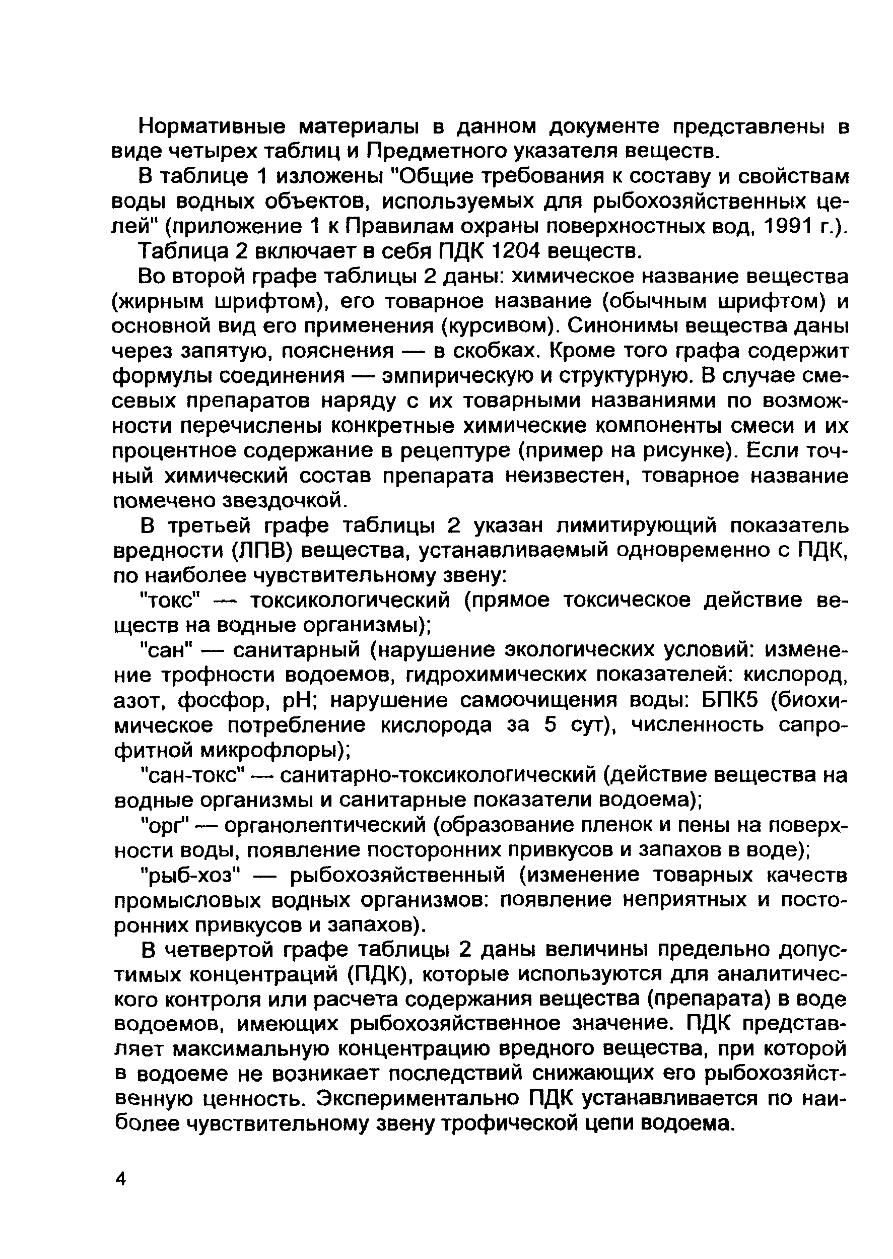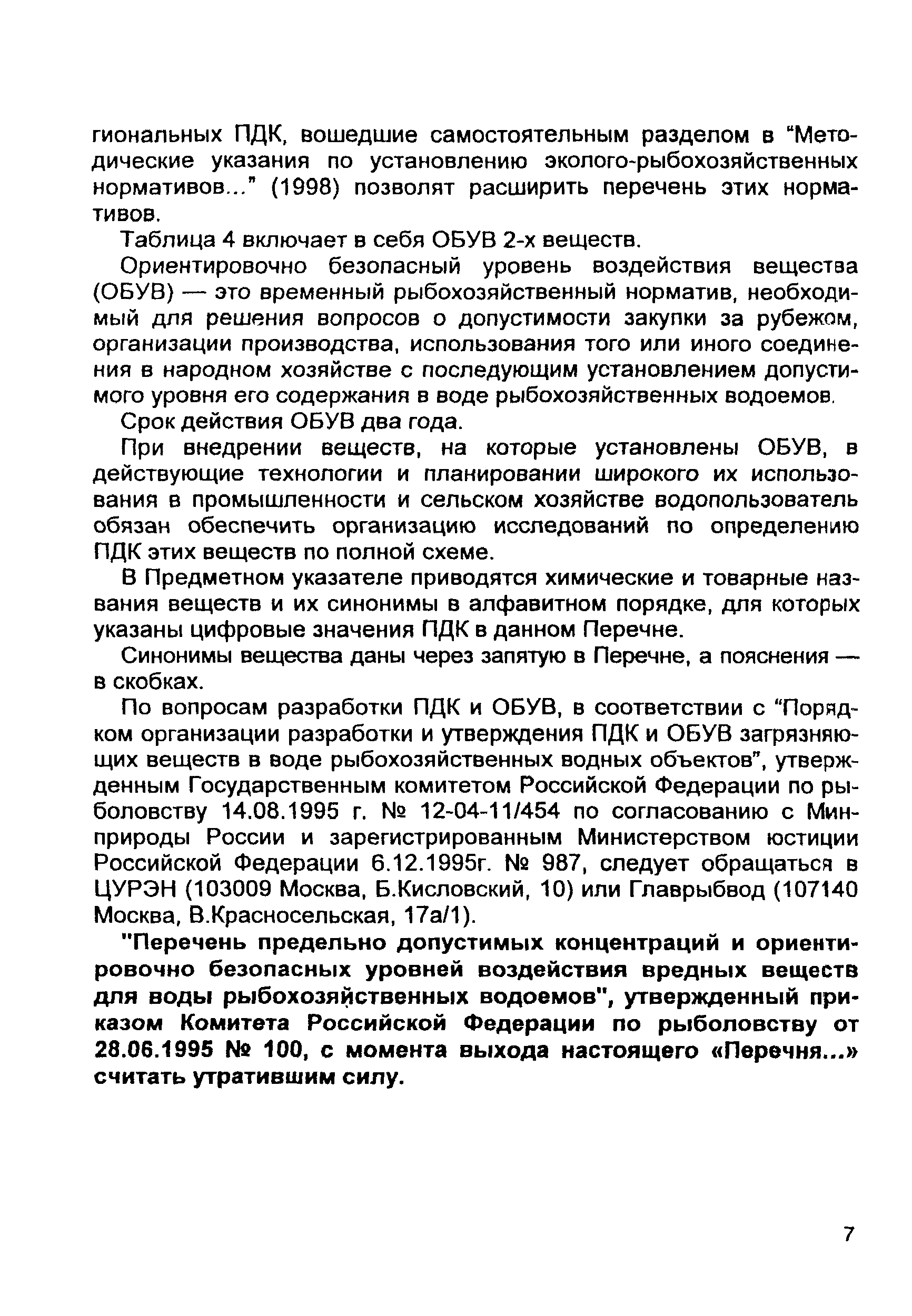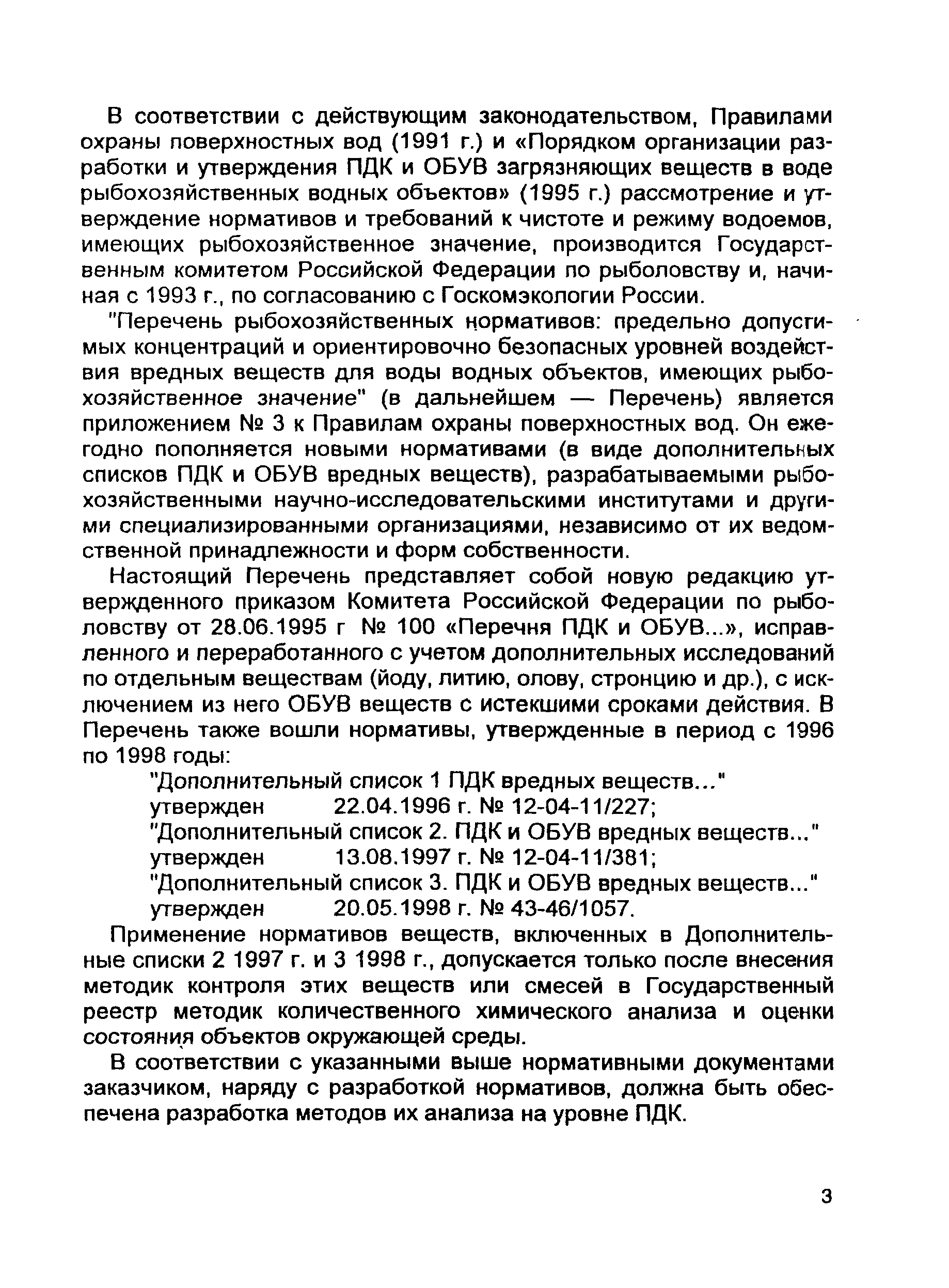 | Оглавление: | Приказ Госкомрыбооловства от 28 апреля 1999 г. № 96 "О рыбохозяйственных нормативах" Общие требования к составу и свойствам воды водных объектов, используемых для рыбохозяйственных целей Перечень предельно допустимых концентраций и ориентировочно безопасных уровней воздействия вредных веществ для воды рыбохозяйственных водоемов Региональные ПДК Ориентировочно-безопасные уровни воздействия (ОБУВ) вредных веществ |