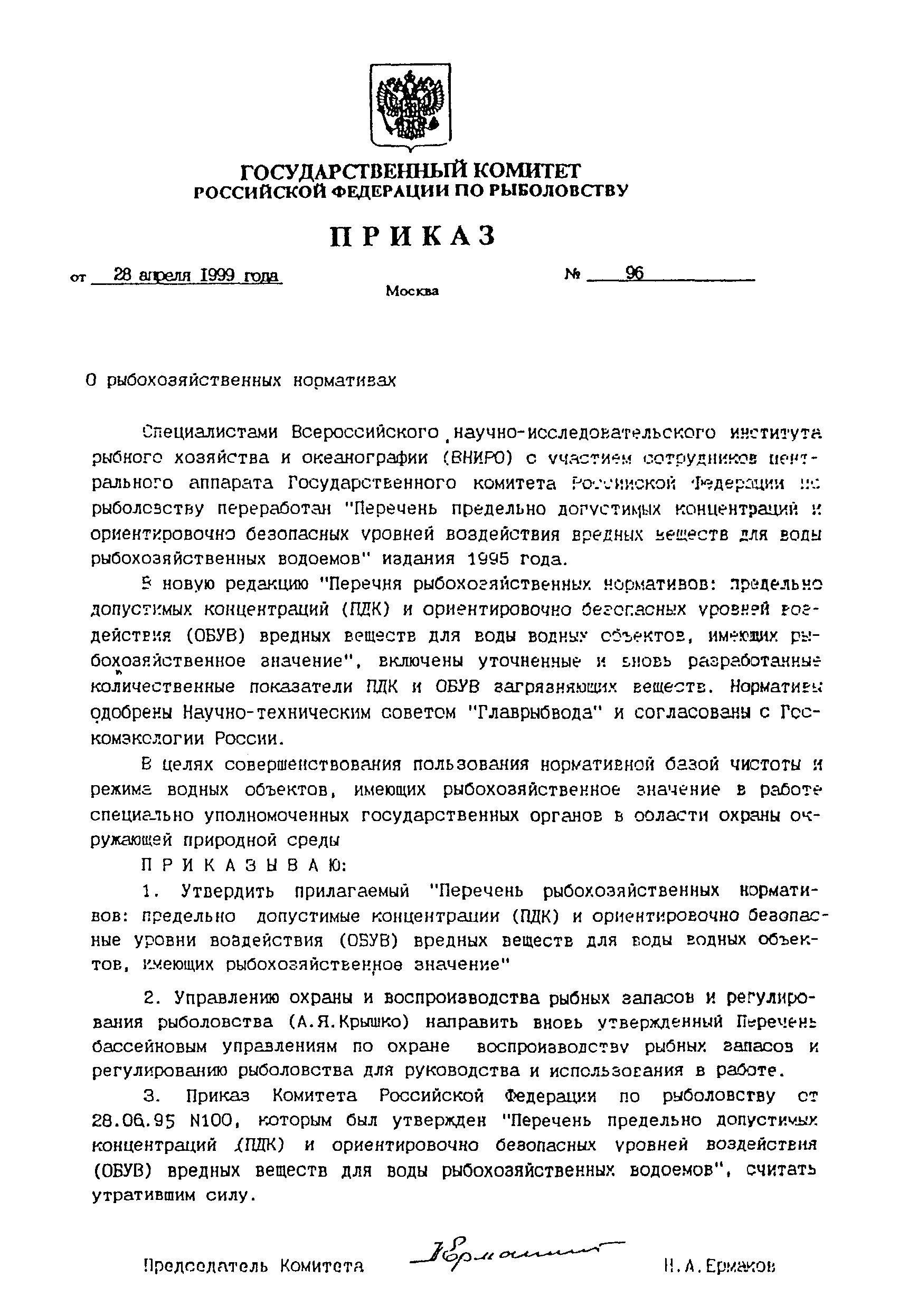 | Утверждён: | 28.04.1999 Государственный комитет Российской Федерации по рыболовству (96)