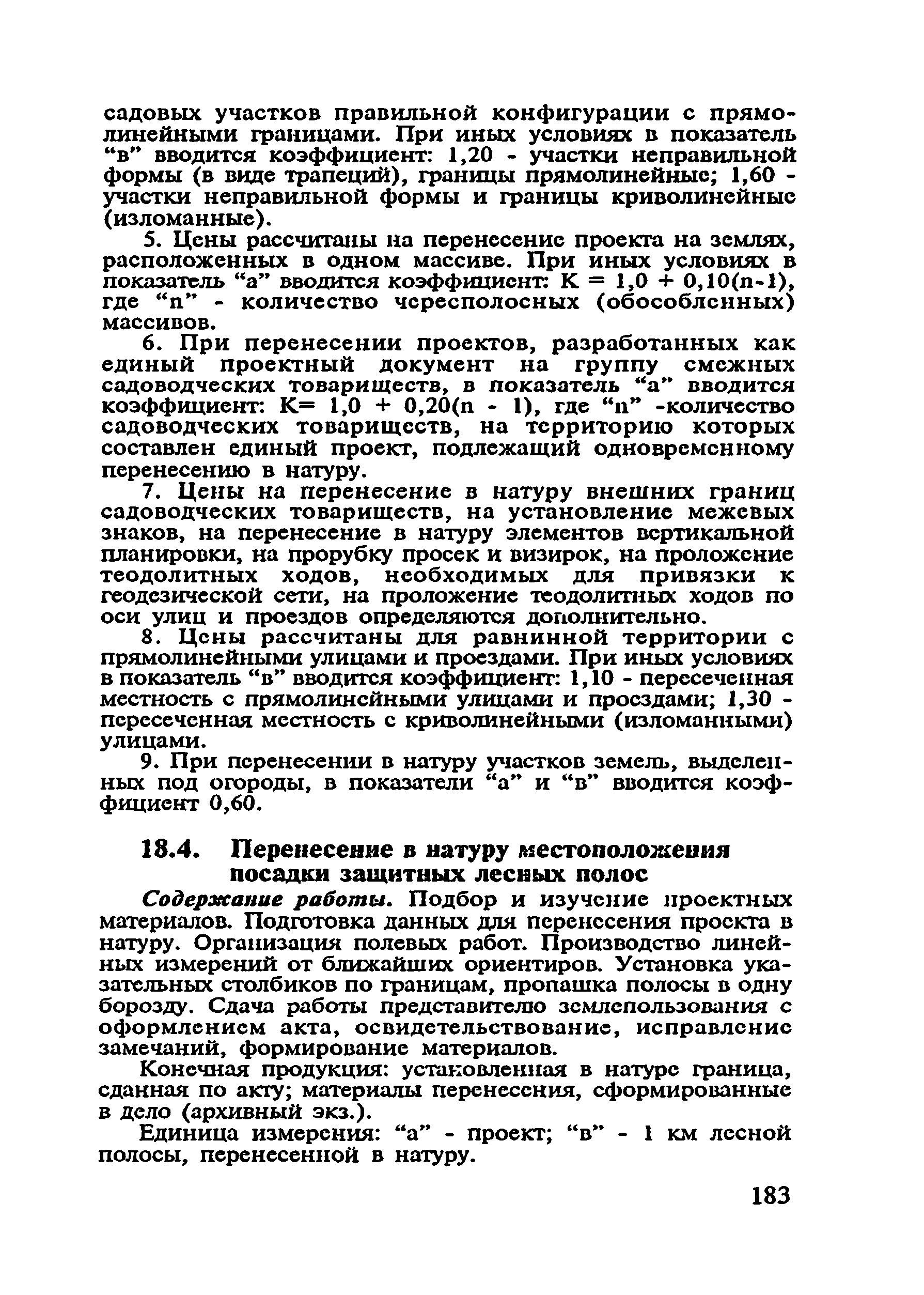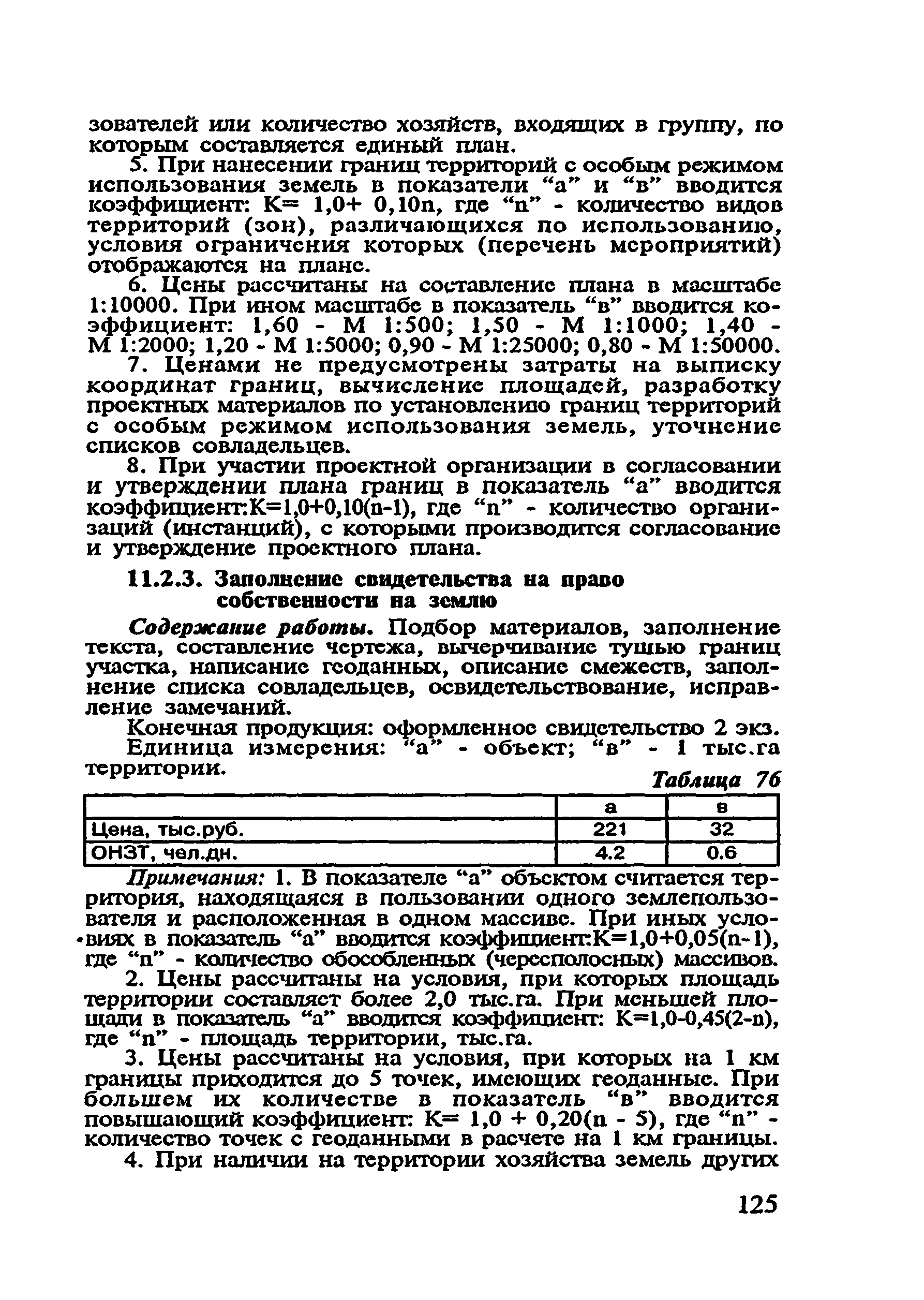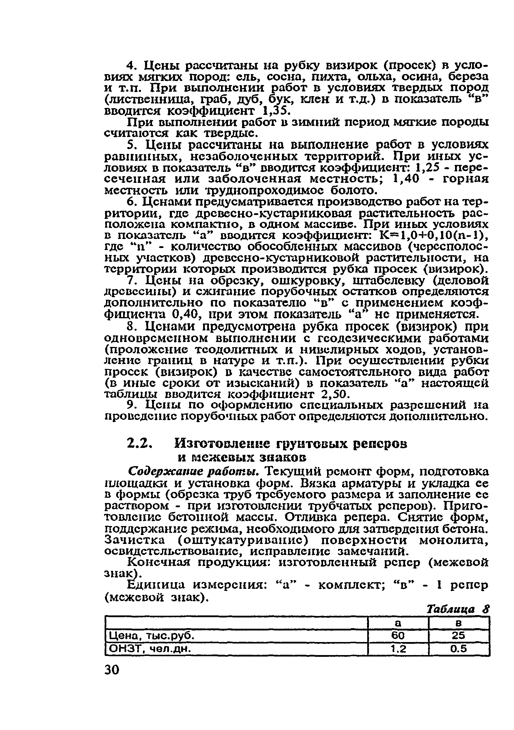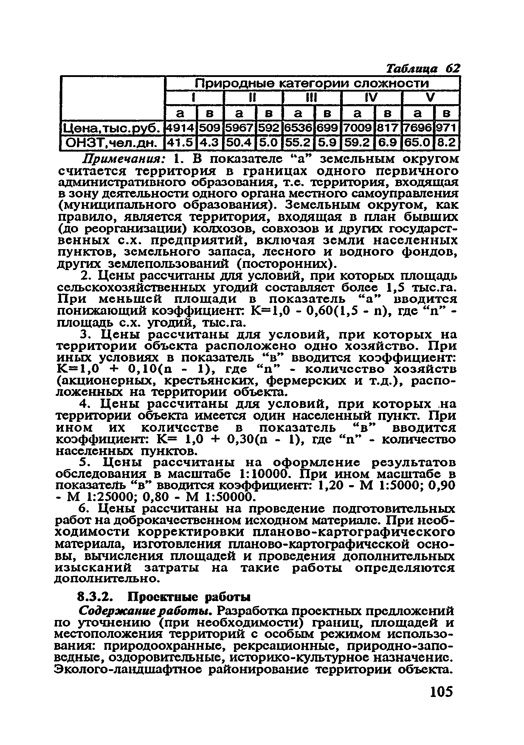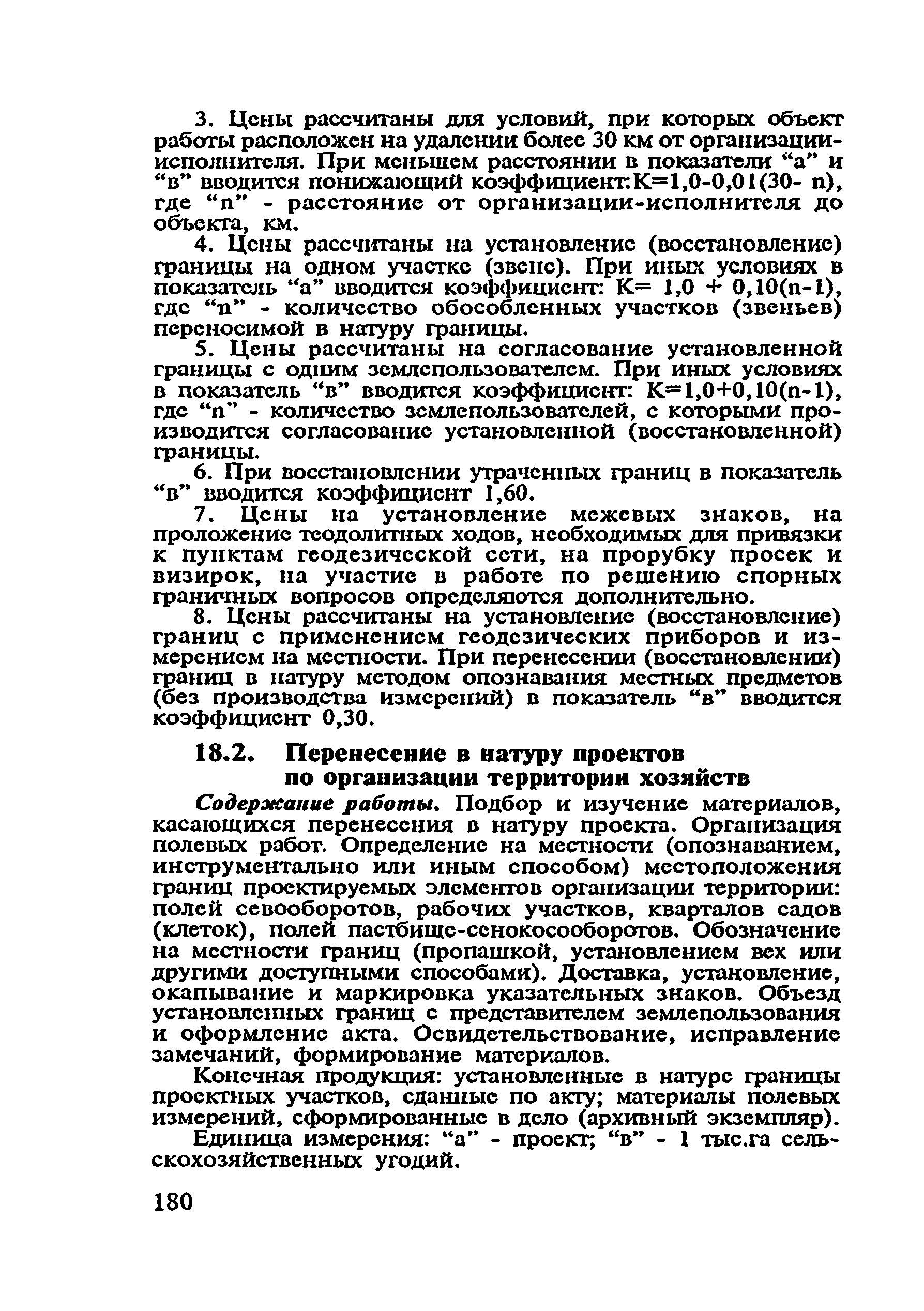 Сборник цен и общественно необходимых затрат труда (ОНЗТ) на изготовление проектной и изыскательской продукции землеустройства, земельного кадастра и мониторинга земель| Статус: | действует | | Название рус.: | Сборник цен и общественно необходимых затрат труда (ОНЗТ) на изготовление проектной и изыскательской продукции землеустройства, земельного кадастра и мониторинга земель | | Дата добавления в базу: | 01.09.2013 | | Дата актуализации: | 01.01.2021 | | Дата введения: | 01.01.1996 | | Область применения: | Сборник предназначен для установления нормативных затрат труда (ОНЗТ) и определения сметной стоимости работ при заключении договоров на изготовление проектной и изыскательской продукции землеустройства, земельного кадастра и мониторинга земель | | Оглавление: | Общие указания Часть I. Изыскания Глава 1. Топографо-геодезические изыскания Глава 2. Работы, сопутствующие геодезическим изысканиям Глава 3. Почвенно-мелиоративные изыскания Глава 4. Геоботанические и зоотехнические изыскания Часть II. Вычисление площадей, изготовление материалов для графического учета земель Глава 5. Вычисление площадей, изготовление материалов для графического учета земель Глава 6. Составление тематических карт и очерков по району, области (краю, республике) Часть III. Проектные работы по охране и использованию земель Глава 7. Схемы (прогнозы) по охране земельных ресурсов и окружающей среды Глава 8. Схемы по использованию земельных ресурсов Глава 9. Земельно-оценочные работы Часть IV. Межхозяйственное землеустройство Глава 10. Проектные работы по созданию новых хозяйств и перераспределению земель Глава 11. Землеустроительные работы по оформлению документов на право пользования землей Часть V. Проектные работы по организации территории хозяйств и разработке мероприятий по улучшению использования земель Глава 12. Разработка проектов по организации территории хозяйств Глава 13. Разработка мероприятий по улучшению земель и хозяйственной деятельности Глава 14. Землеустройство оленеводческих хозяйств и охотничьих угодий Часть VI. Разработка рабочих проектов Глава 15. Разработка рабочих проектов по защите почв от эрозии Глава 16. Разработка рабочих проектов по мелиорации земель Глава 17. Разработка рабочих проектов по строительству объектов хозяйственного назначения Часть VII. Землеустроительные работы по осуществлению проектных разработок Глава 18. Перенесение проектов землеустройства в натуру Глава 19. Контроль за освоением проектов и использованием земель Часть VIII. Чертежные работы, размножение и оформление материалов, разные работы Глава 20. Чертежные работы Глава 21. Картографические и множительные работы Глава 22. Оформительские работы Глава 23. Разные работы Часть IX. Аэрофотогеодезические работы Глава 24. Создание сельскохозяйственных планов и карт Глава 25. Создание топографических планов сельскохозяйственного назначения Глава 26. Создание планов сельских населенных пунктов Глава 27. Работы, сопутствующие аэрофотогеодезическим изысканиям Часть X. Отдельные виды проектной и изыскательской продукции, прочие работы Глава 28. Лабораторные анализы растительных образцов, другие виды проектно-изыскательских работ Глава 29. Разработка норм времени, затрат труда (ОНЗТ) и цен на изготовление проектной и изыскательской продукции Приложения | | Разработан: | Научно-методическ