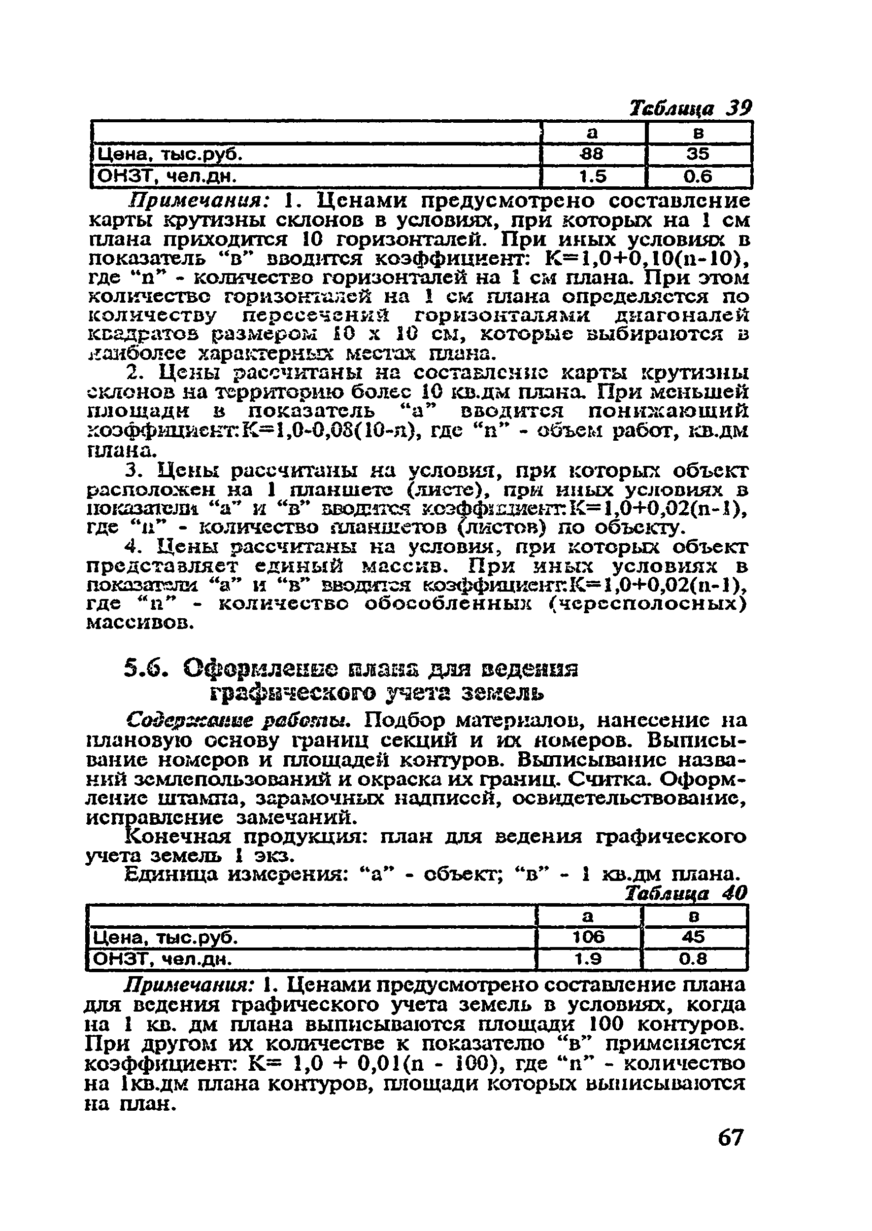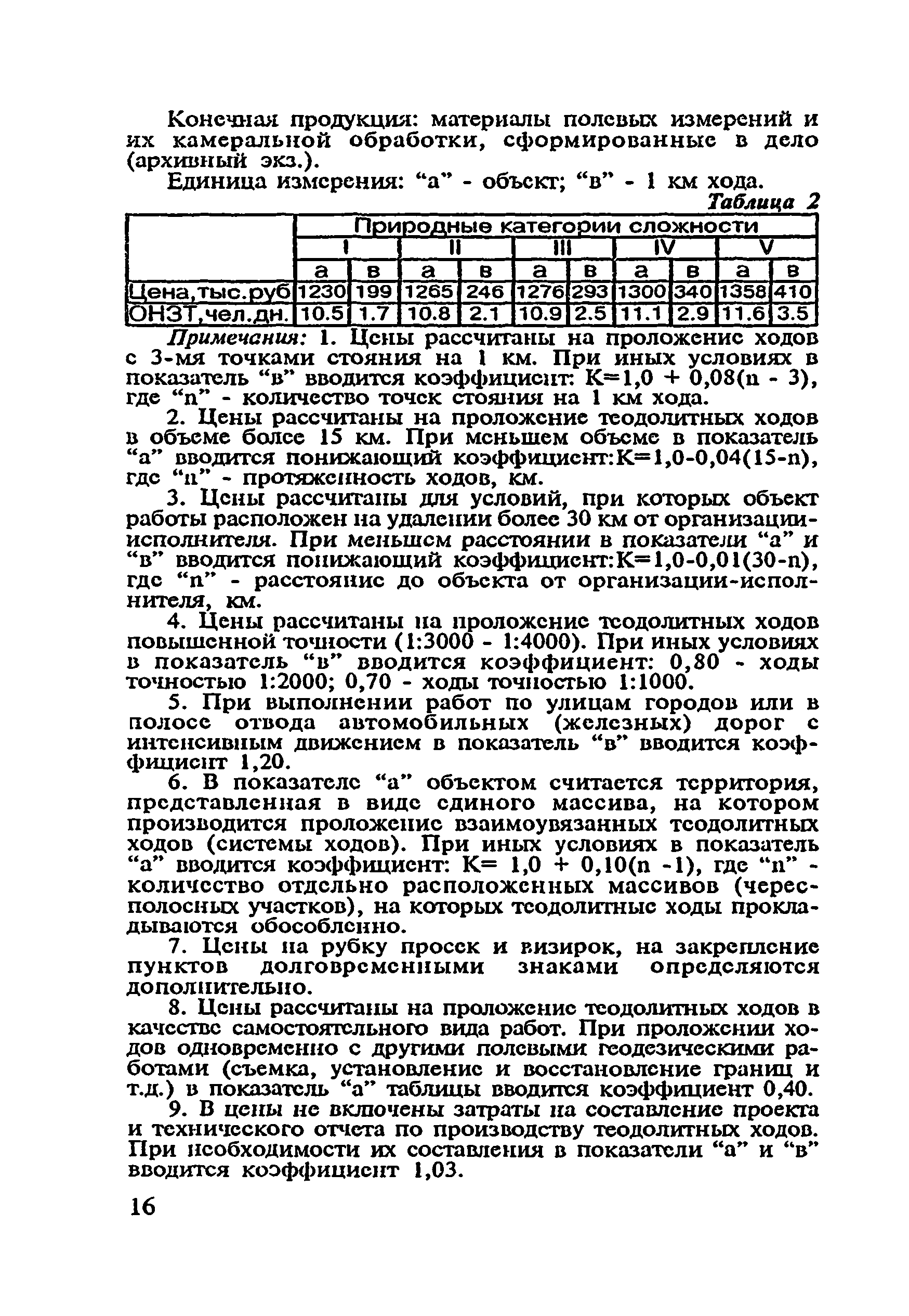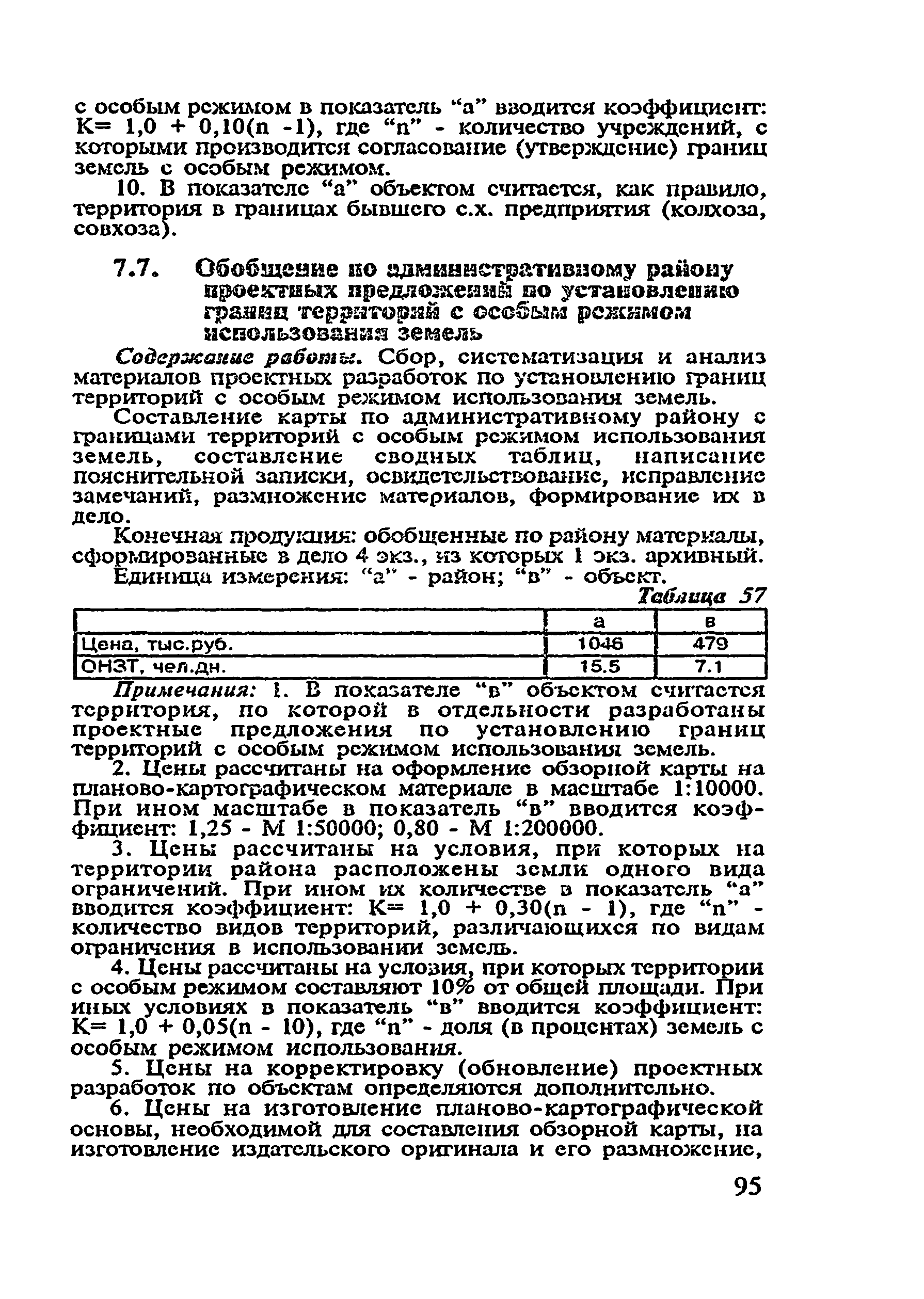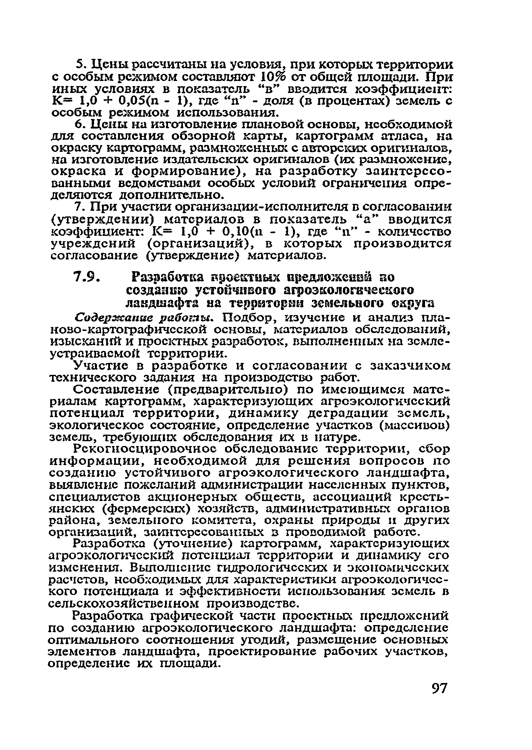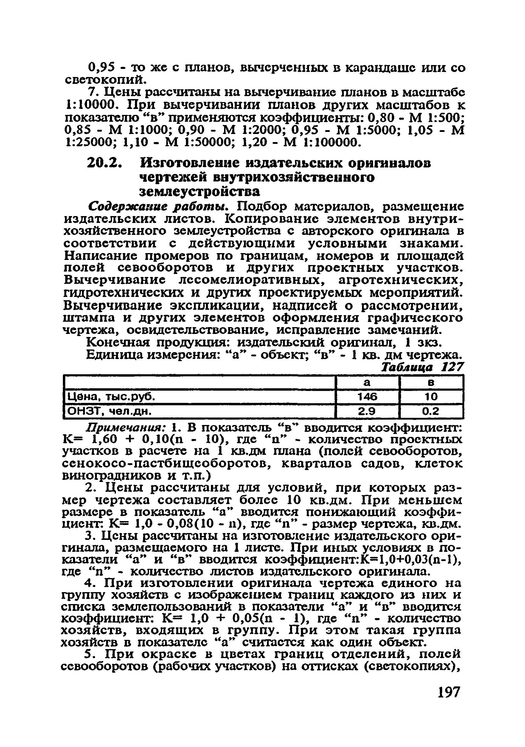 Сборник цен и общественно необходимых затрат труда (ОНЗТ) на изготовление проектной и изыскательской продукции землеустройства, земельного кадастра и мониторинга земель| Статус: | действует | | Название рус.: | Сборник цен и общественно необходимых затрат труда (ОНЗТ) на изготовление проектной и изыскательской продукции землеустройства, земельного кадастра и мониторинга земель | | Дата добавления в базу: | 01.09.2013 | | Дата актуализации: | 01.01.2021 | | Дата введения: | 01.01.1996 | | Область применения: | Сборник предназначен для установления нормативных затрат труда (ОНЗТ) и определения сметной стоимости работ при заключении договоров на изготовление проектной и изыскательской продукции землеустройства, земельного кадастра и мониторинга земель | | Оглавление: | Общие указания Часть I. Изыскания Глава 1. Топографо-геодезические изыскания Глава 2. Работы, сопутствующие геодезическим изысканиям Глава 3. Почвенно-мелиоративные изыскания Глава 4. Геоботанические и зоотехнические изыскания Часть II. Вычисление площадей, изготовление материалов для графического учета земель Глава 5. Вычисление площадей, изготовление материалов для графического учета земель Глава 6. Составление тематических карт и очерков по району, области (краю, республике) Часть III. Проектные работы по охране и использованию земель Глава 7. Схемы (прогнозы) по охране земельных ресурсов и окружающей среды Глава 8. Схемы по использованию земельных ресурсов Глава 9. Земельно-оценочные работы Часть IV. Межхозяйственное землеустройство Глава 10. Проектные работы по созданию новых хозяйств и перераспределению земель Глава 11. Землеустроительные работы по оформлению документов на право пользования землей Часть V. Проектные работы по организации территории хозяйств и разработке мероприятий по улучшению использования земель Глава 12. Разработка проектов по организации территории хозяйств Глава 13. Разработка мероприятий по улучшению земель и хозяйственной деятельности Глава 14. Землеустройство оленеводческих хозяйств и охотничьих угодий Часть VI. Разработка рабочих проектов Глава 15. Разработка рабочих проектов по защите почв от эрозии Глава 16. Разработка рабочих проектов по мелиорации земель Глава 17. Разработка рабочих проектов по строительству объектов хозяйственного назначения Часть VII. Землеустроительные работы по осуществлению проектных разработок Глава 18. Перенесение проектов землеустройства в натуру Глава 19. Контроль за освоением проектов и использованием земель Часть VIII. Чертежные работы, размножение и оформление материалов, разные работы Глава 20. Чертежные работы Глава 21. Картографические и множительные работы Глава 22. Оформительские работы Глава 23. Разные работы Часть IX. Аэрофотогеодезические работы Глава 24. Создание сельскохозяйственных планов и карт Глава 25. Создание топографических планов сельскохозяйственного назначения Глава 26. Создание планов сельских населенных пунктов Глава 27. Работы, сопутствующие аэрофотогеодезическим изысканиям Часть X. Отдельные виды проектной и изыскательской продукции, прочие работы Глава 28. Лабораторные анализы растительных образцов, другие виды проектно-изыскательских работ Глава 29. Разработка норм времени, затрат труда (ОНЗТ) и цен на изготовление проектной и изыскательской продукции Приложения | | Разработан: | Научно-методическ