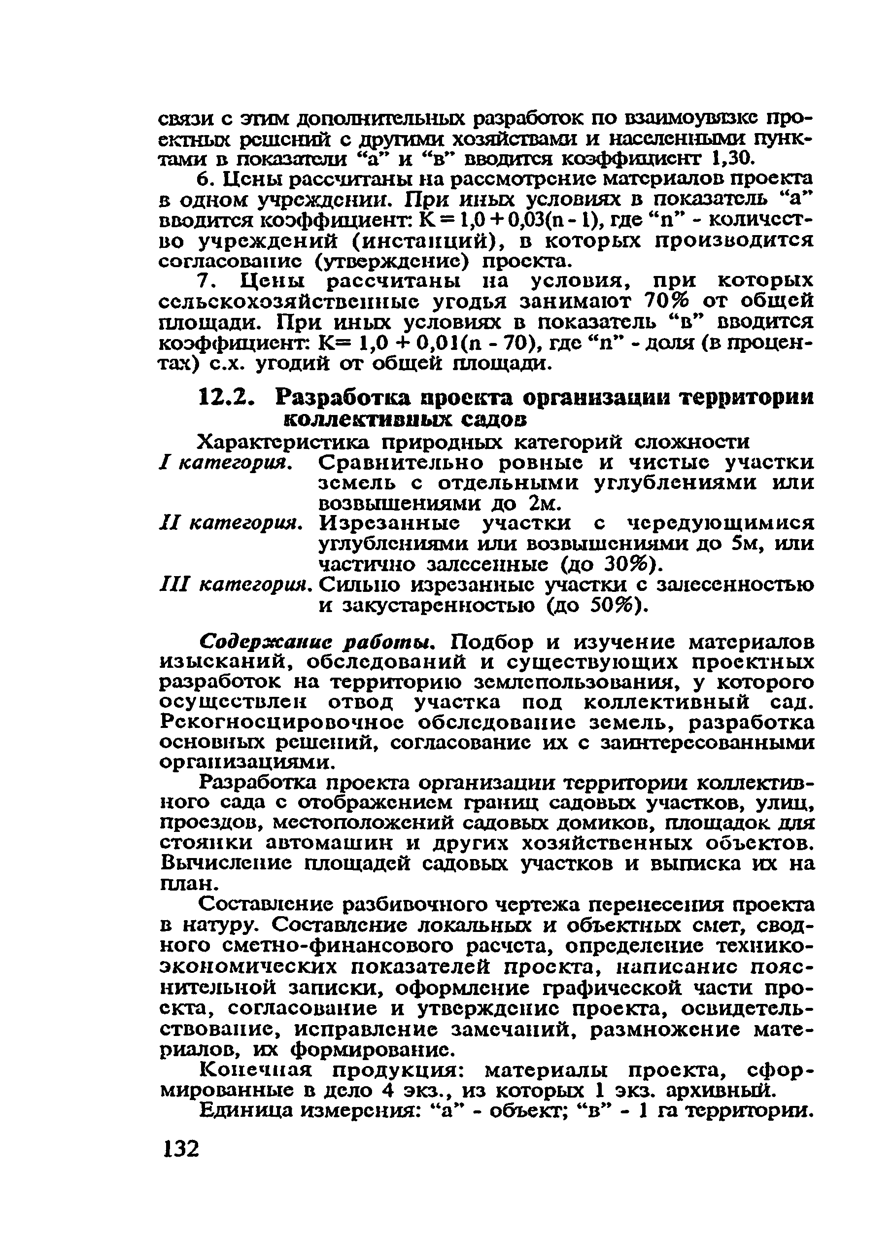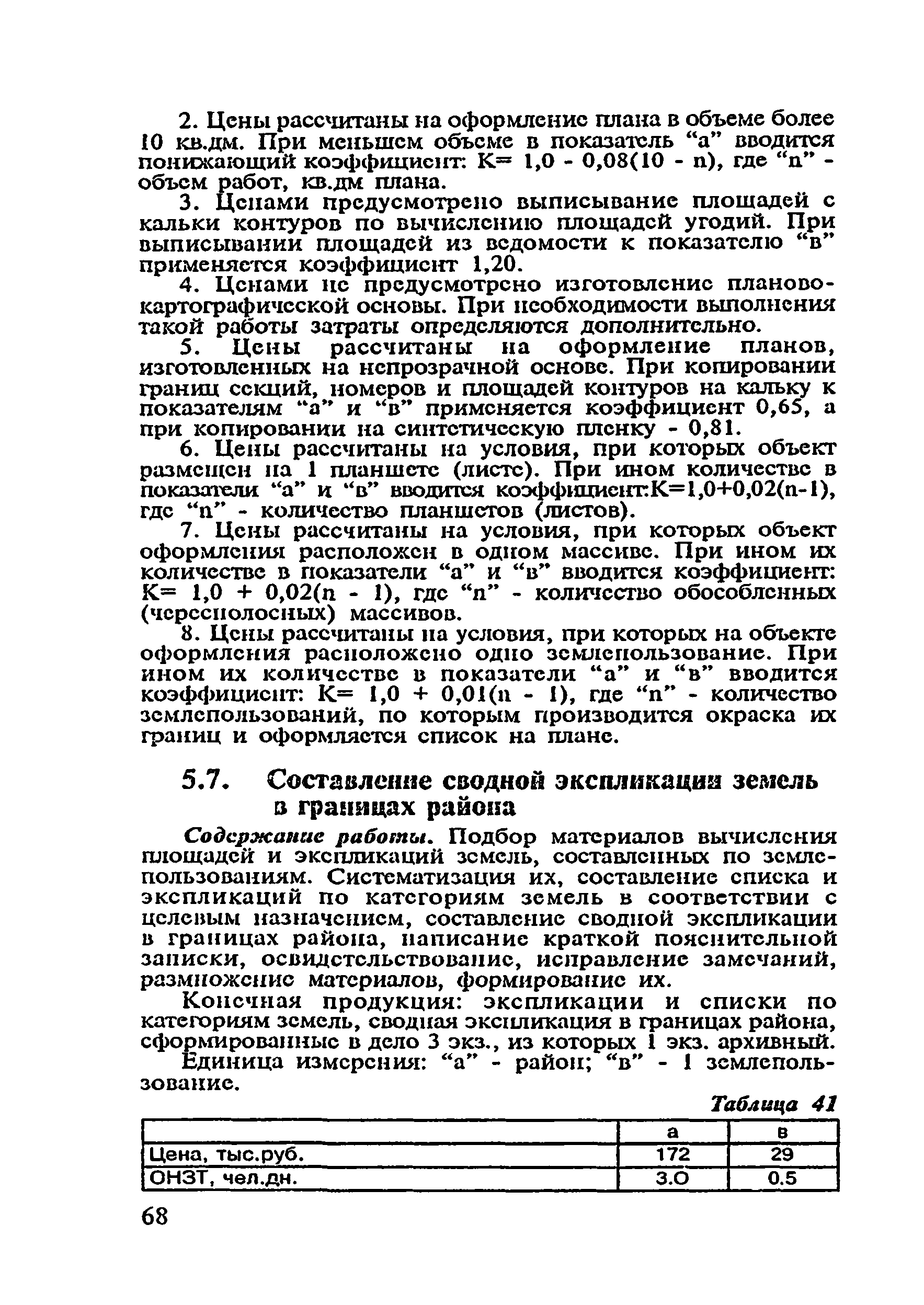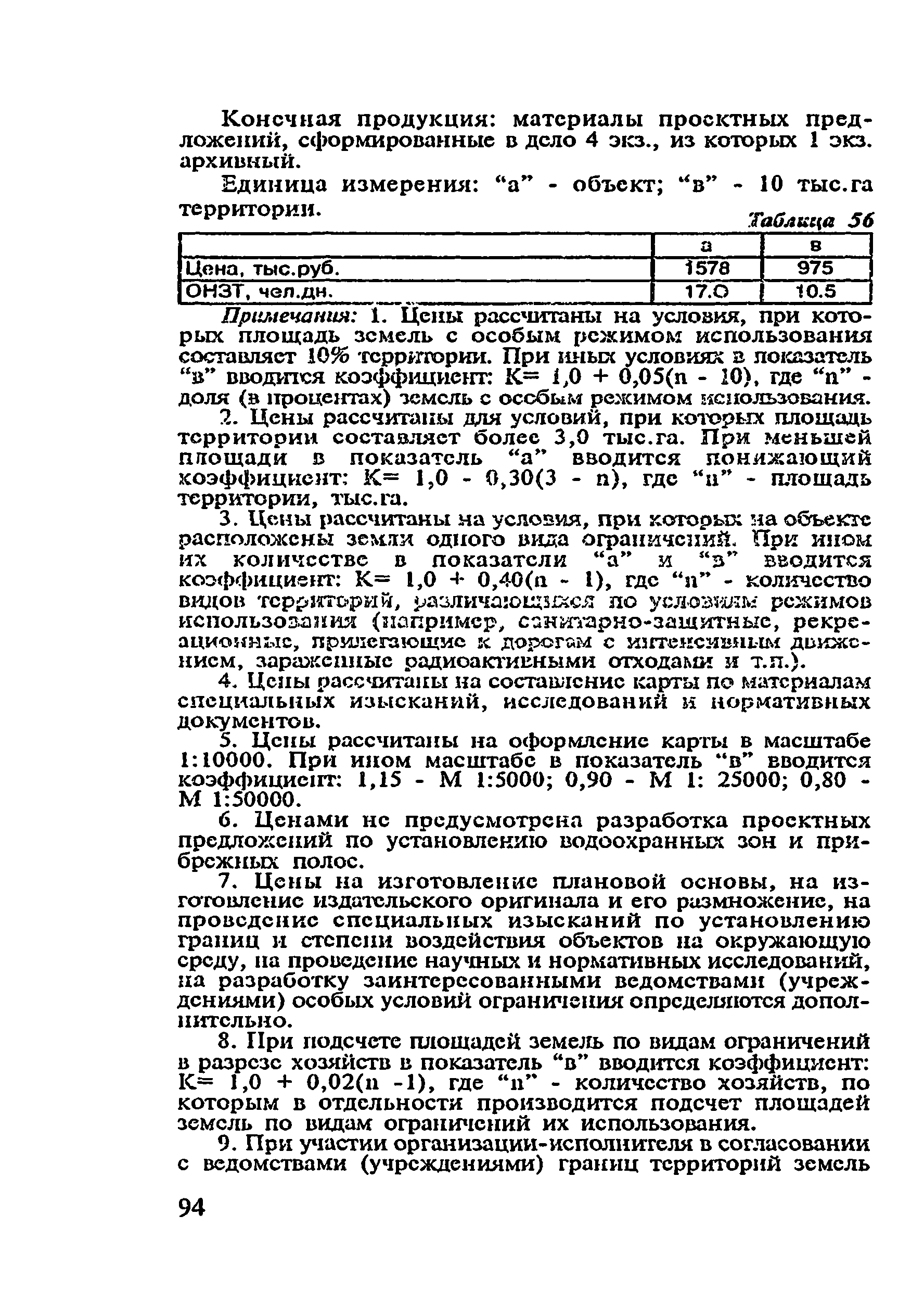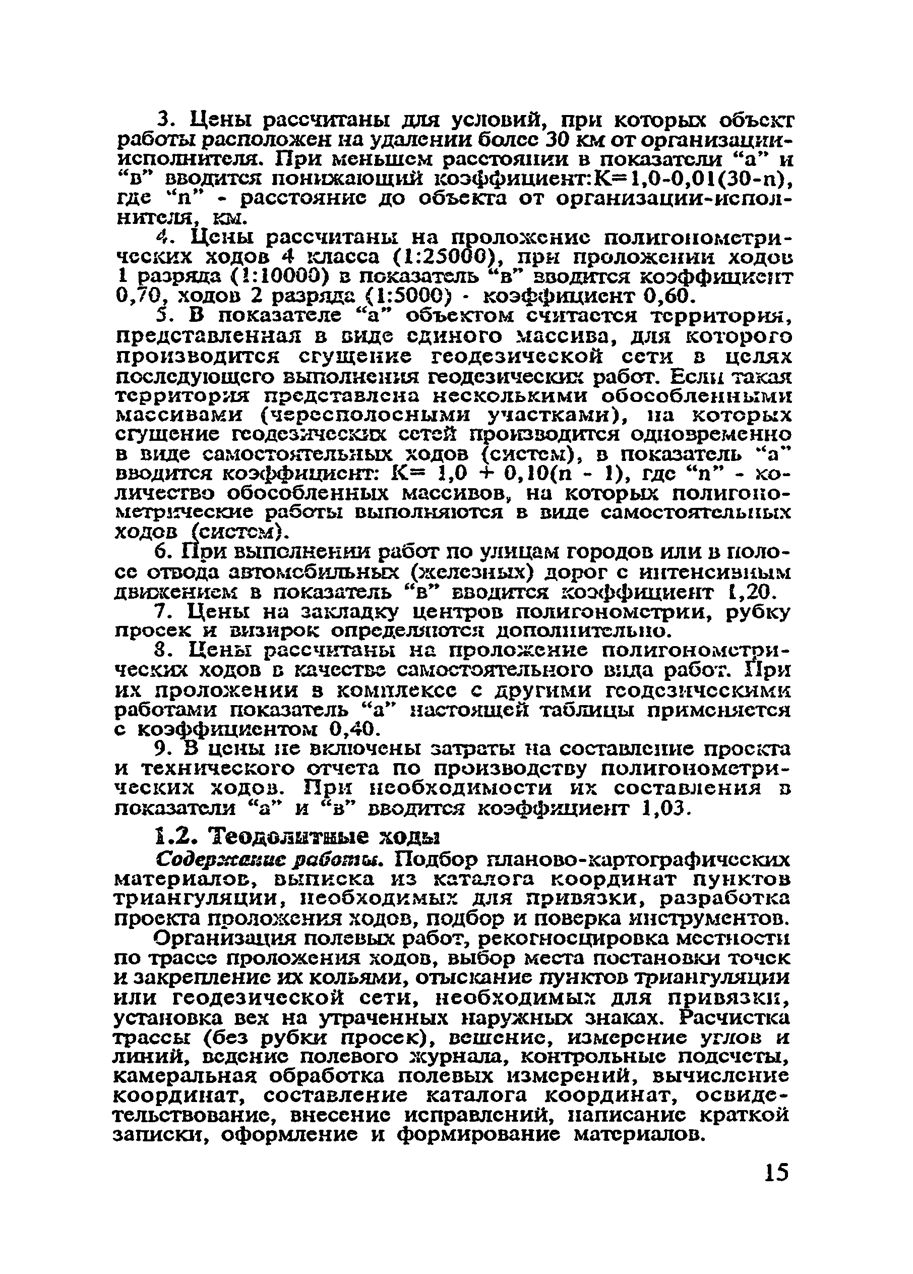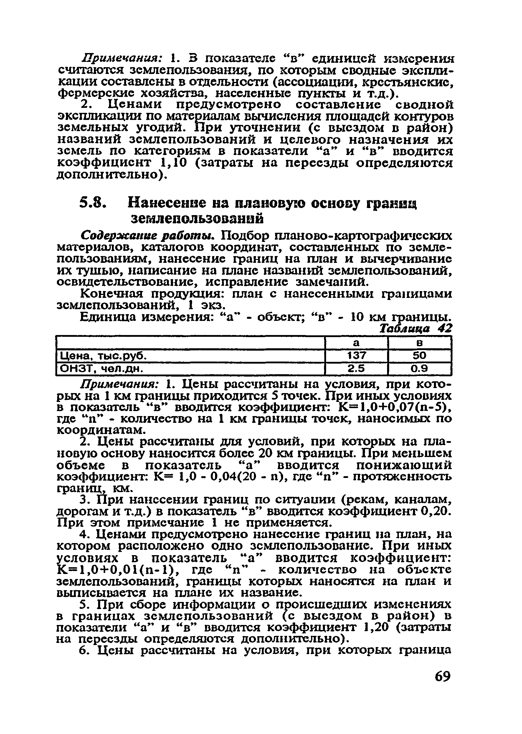 Сборник цен и общественно необходимых затрат труда (ОНЗТ) на изготовление проектной и изыскательской продукции землеустройства, земельного кадастра и мониторинга земель| Статус: | действует | | Название рус.: | Сборник цен и общественно необходимых затрат труда (ОНЗТ) на изготовление проектной и изыскательской продукции землеустройства, земельного кадастра и мониторинга земель | | Дата добавления в базу: | 01.09.2013 | | Дата актуализации: | 01.01.2021 | | Дата введения: | 01.01.1996 | | Область применения: | Сборник предназначен для установления нормативных затрат труда (ОНЗТ) и определения сметной стоимости работ при заключении договоров на изготовление проектной и изыскательской продукции землеустройства, земельного кадастра и мониторинга земель | | Оглавление: | Общие указания Часть I. Изыскания Глава 1. Топографо-геодезические изыскания Глава 2. Работы, сопутствующие геодезическим изысканиям Глава 3. Почвенно-мелиоративные изыскания Глава 4. Геоботанические и зоотехнические изыскания Часть II. Вычисление площадей, изготовление материалов для графического учета земель Глава 5. Вычисление площадей, изготовление материалов для графического учета земель Глава 6. Составление тематических карт и очерков по району, области (краю, республике) Часть III. Проектные работы по охране и использованию земель Глава 7. Схемы (прогнозы) по охране земельных ресурсов и окружающей среды Глава 8. Схемы по использованию земельных ресурсов Глава 9. Земельно-оценочные работы Часть IV. Межхозяйственное землеустройство Глава 10. Проектные работы по созданию новых хозяйств и перераспределению земель Глава 11. Землеустроительные работы по оформлению документов на право пользования землей Часть V. Проектные работы по организации территории хозяйств и разработке мероприятий по улучшению использования земель Глава 12. Разработка проектов по организации территории хозяйств Глава 13. Разработка мероприятий по улучшению земель и хозяйственной деятельности Глава 14. Землеустройство оленеводческих хозяйств и охотничьих угодий Часть VI. Разработка рабочих проектов Глава 15. Разработка рабочих проектов по защите почв от эрозии Глава 16. Разработка рабочих проектов по мелиорации земель Глава 17. Разработка рабочих проектов по строительству объектов хозяйственного назначения Часть VII. Землеустроительные работы по осуществлению проектных разработок Глава 18. Перенесение проектов землеустройства в натуру Глава 19. Контроль за освоением проектов и использованием земель Часть VIII. Чертежные работы, размножение и оформление материалов, разные работы Глава 20. Чертежные работы Глава 21. Картографические и множительные работы Глава 22. Оформительские работы Глава 23. Разные работы Часть IX. Аэрофотогеодезические работы Глава 24. Создание сельскохозяйственных планов и карт Глава 25. Создание топографических планов сельскохозяйственного назначения Глава 26. Создание планов сельских населенных пунктов Глава 27. Работы, сопутствующие аэрофотогеодезическим изысканиям Часть X. Отдельные виды проектной и изыскательской продукции, прочие работы Глава 28. Лабораторные анализы растительных образцов, другие виды проектно-изыскательских работ Глава 29. Разработка норм времени, затрат труда (ОНЗТ) и цен на изготовление проектной и изыскательской продукции Приложения | | Разработан: | Научно-методическ