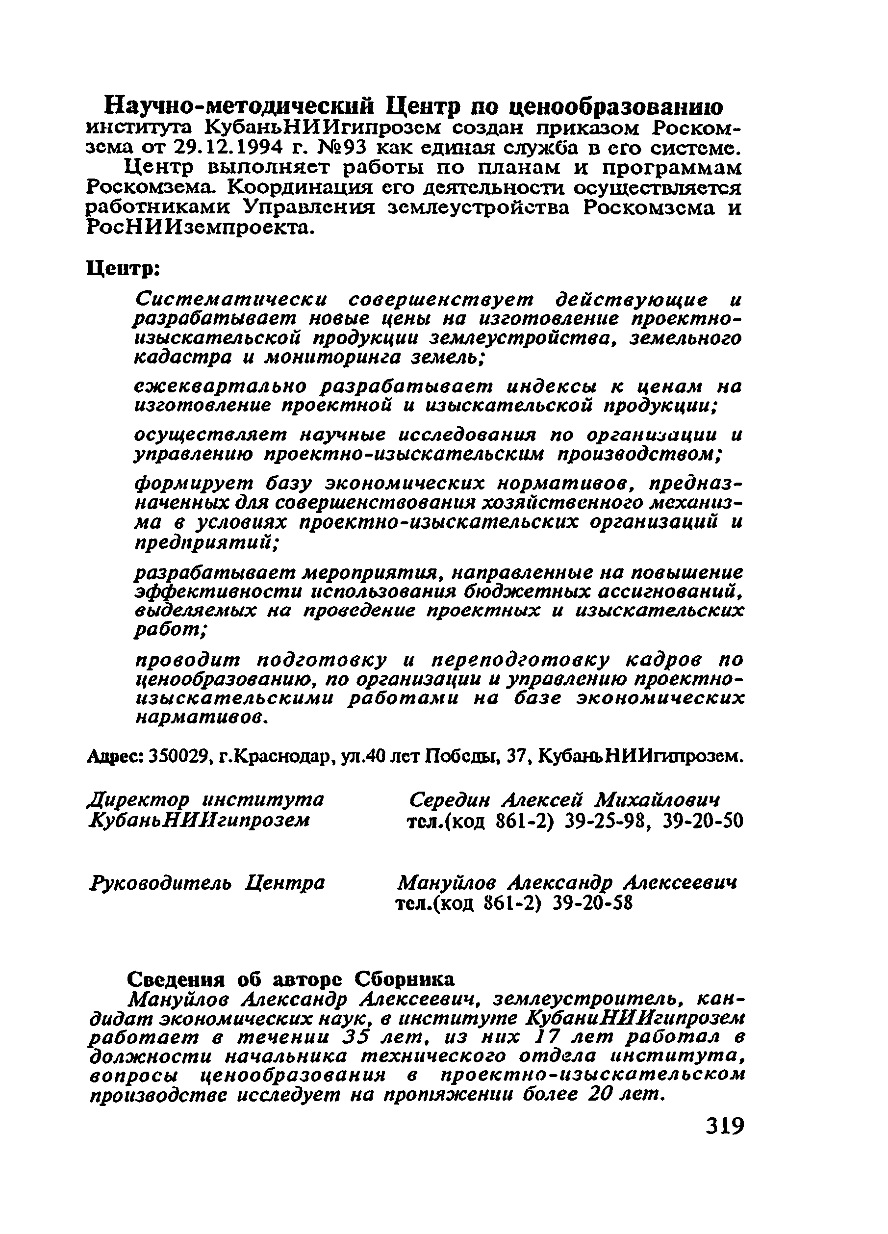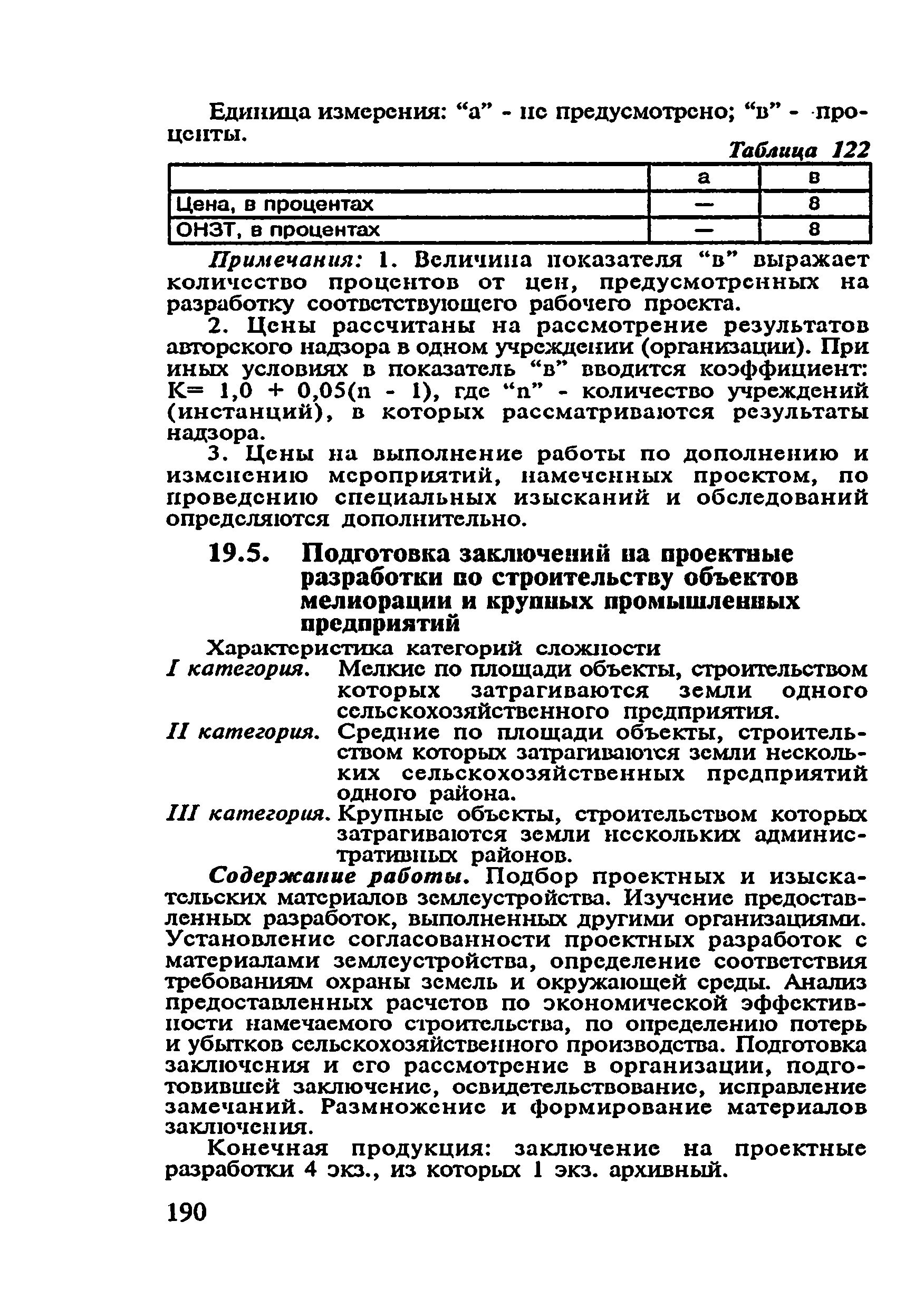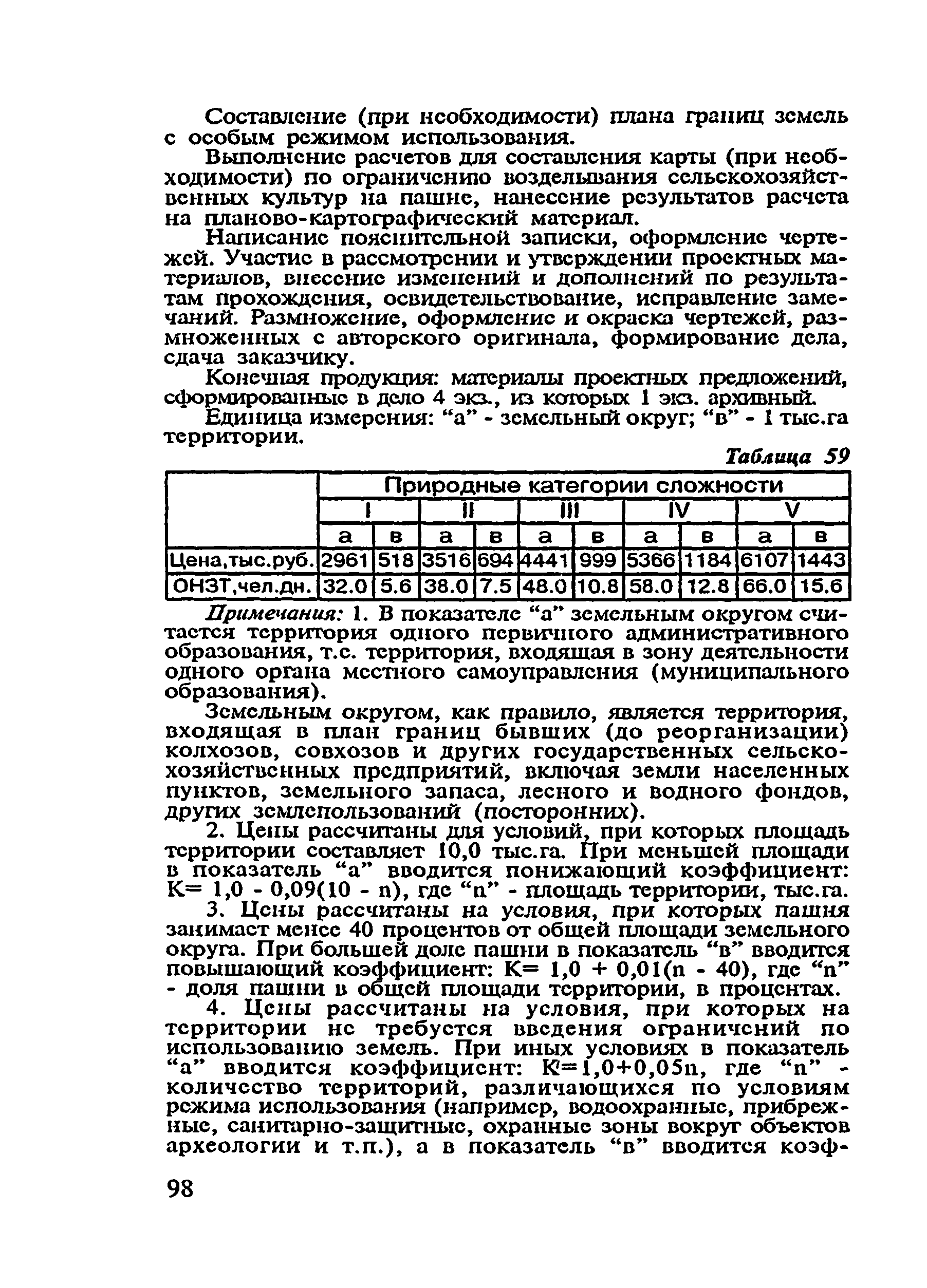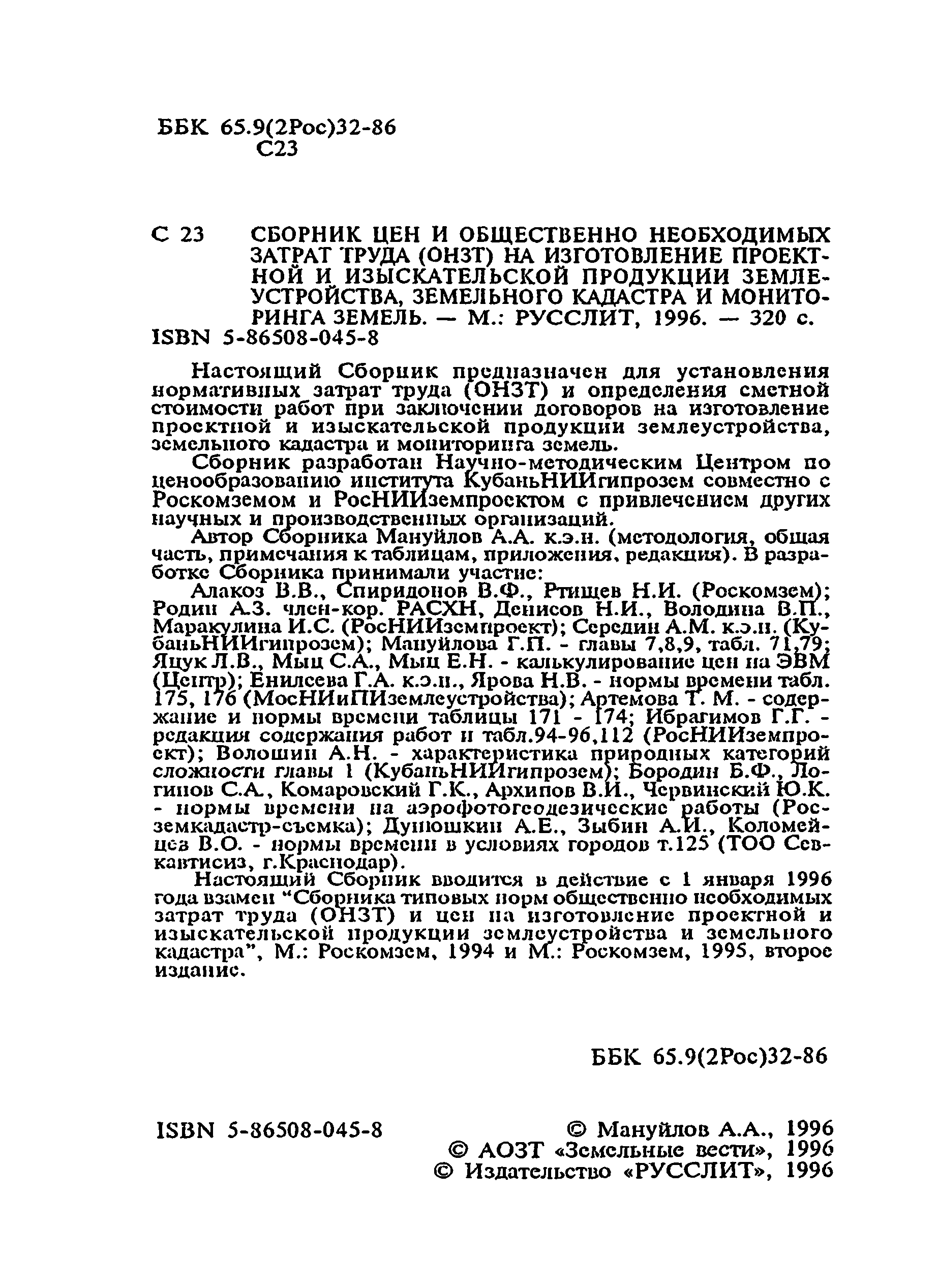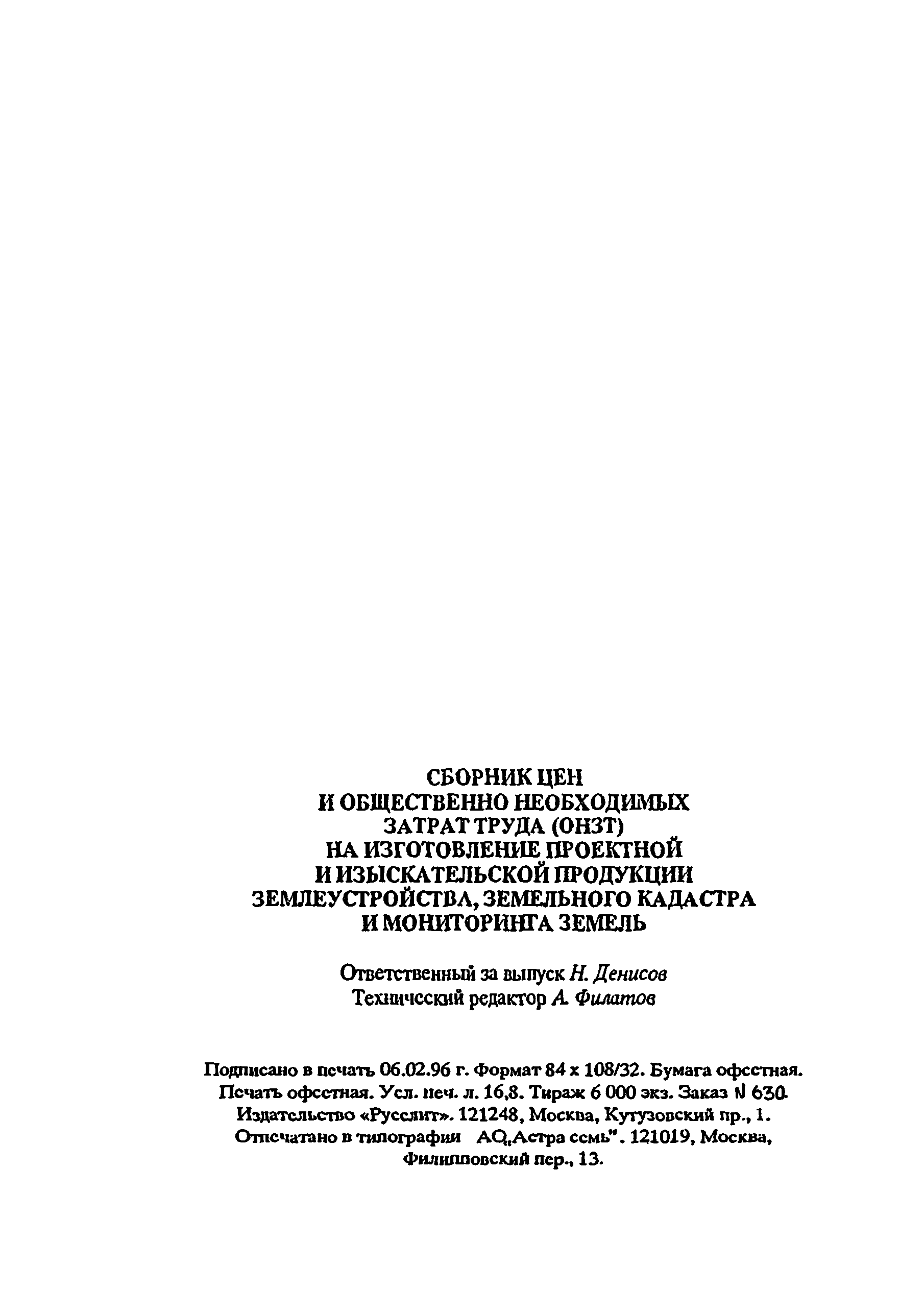 | | Заменяет собой: | - «Сборник типовых норм общественно необходимых затрат труда (ОНЗТ) и цен на изготовление проектной и изыскательской продукции землеустройства и земельного кадастра» (М., 1994 и М.:Роскомзем, 1995, второе издание)