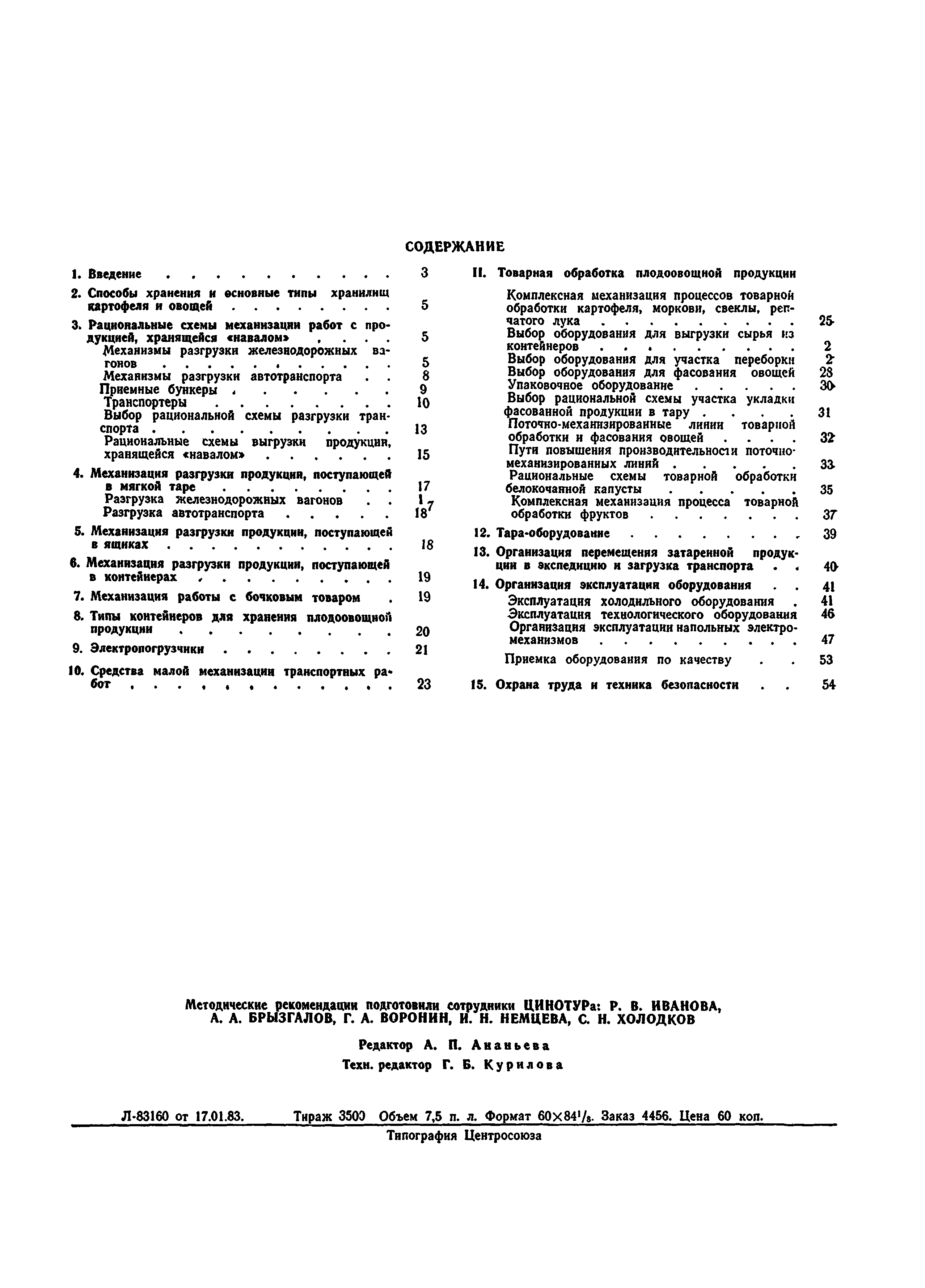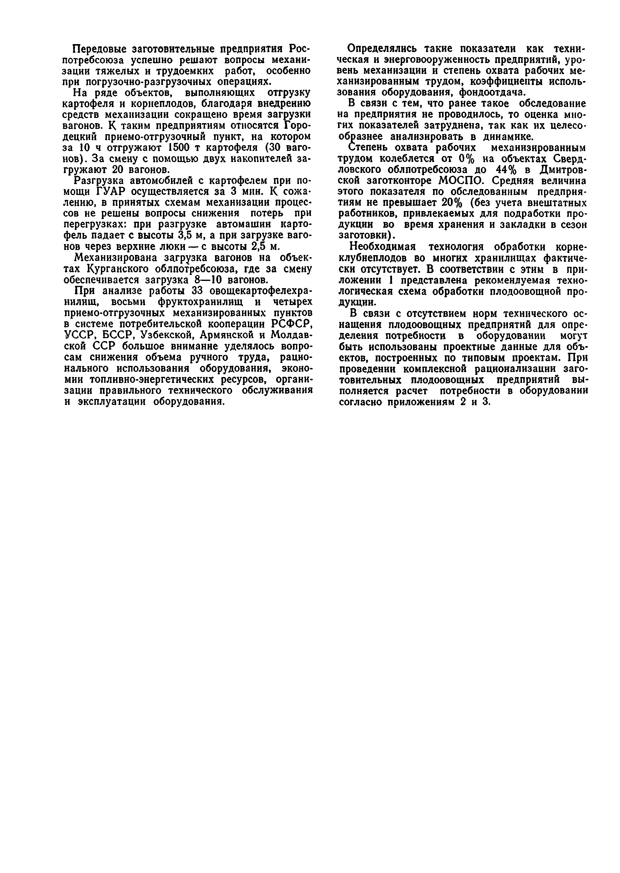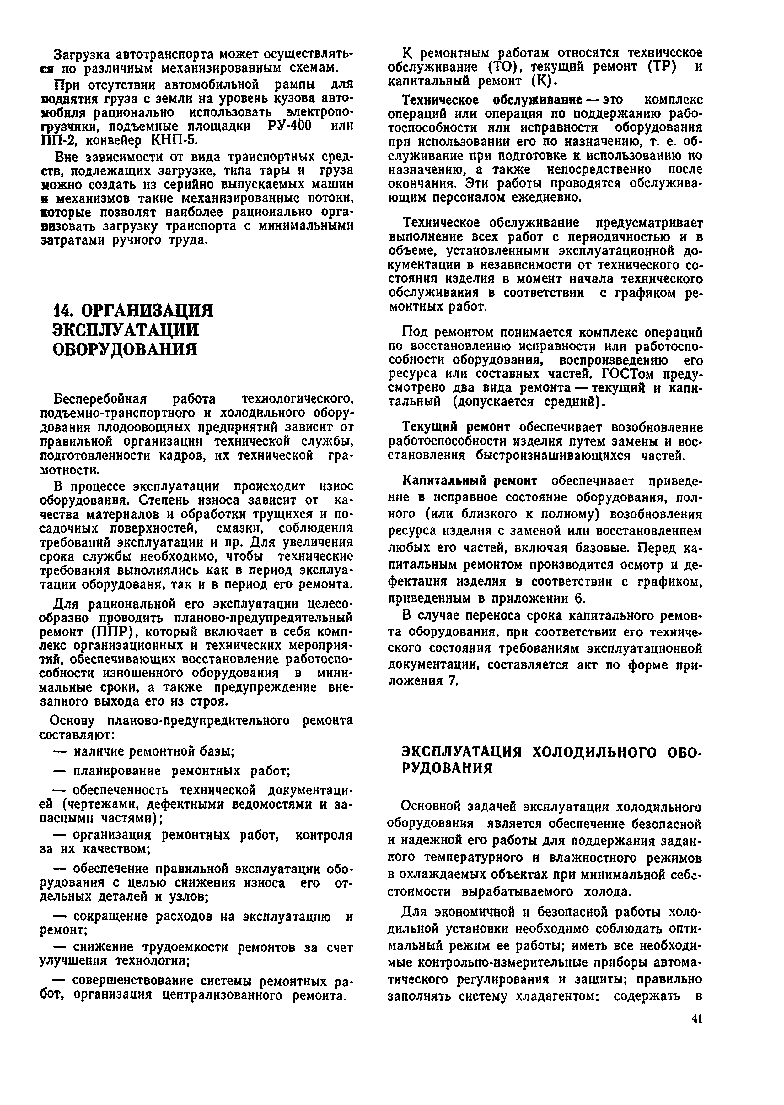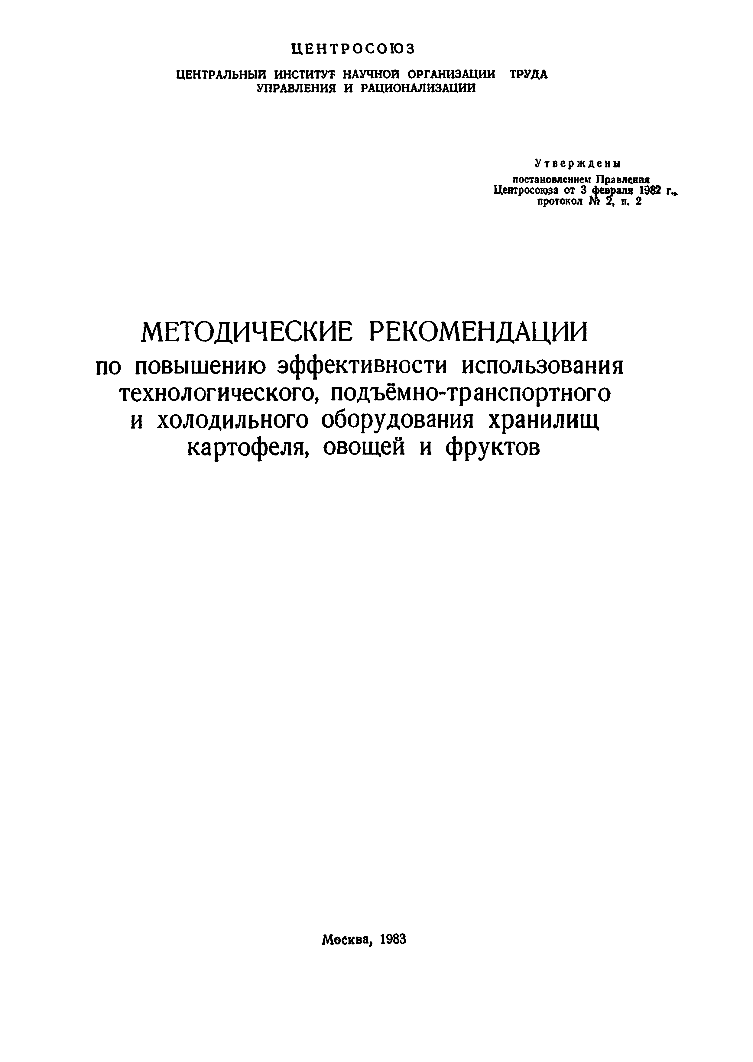 Методические рекомендации по повышению эффективности использования технологического, подъемно-транспортного и холодильного оборудования хранилищ картофеля, овощей и фруктов| Статус: | действует | | Название рус.: | Методические рекомендации по повышению эффективности использования технологического, подъемно-транспортного и холодильного оборудования хранилищ картофеля, овощей и фруктов | | Дата добавления в базу: | 01.09.2013 | | Дата актуализации: | 01.01.2021 | | Дата введения: | 03.02.1982 | | Оглавление: | 1. Введение 2. Способы хранения и основные типы хранилищ картофеля и овощей 3. Рациональные схемы механизации работ с продукцией, хранящейся "навалом" 4. Механизация разгрузки продукции, поступающей в мягкой таре 5. Механизация разгрузки продукции, поступающей в ящиках 6. Механизация разгрузки продукции, поступающей в контейнерах 7. Механизация работы с бочковым товаром 8. Типы контейнеров для хранения плодоовощной продукции 9. Электропогрузчики 10. Средства малой механизации транспортных работ 11. Товарная обработка плодоовощной продукции 12. Тара-оборудование 13. Организация перемещения затаренной продукции в экспедицию и загрузка транспорта 14. Организация эксплуатации оборудования 15. Охрана труда и техника безопасности | | Утверждён: | 03.02.1982 Центросоюз (Tsentrosoyuz 2, п.2)