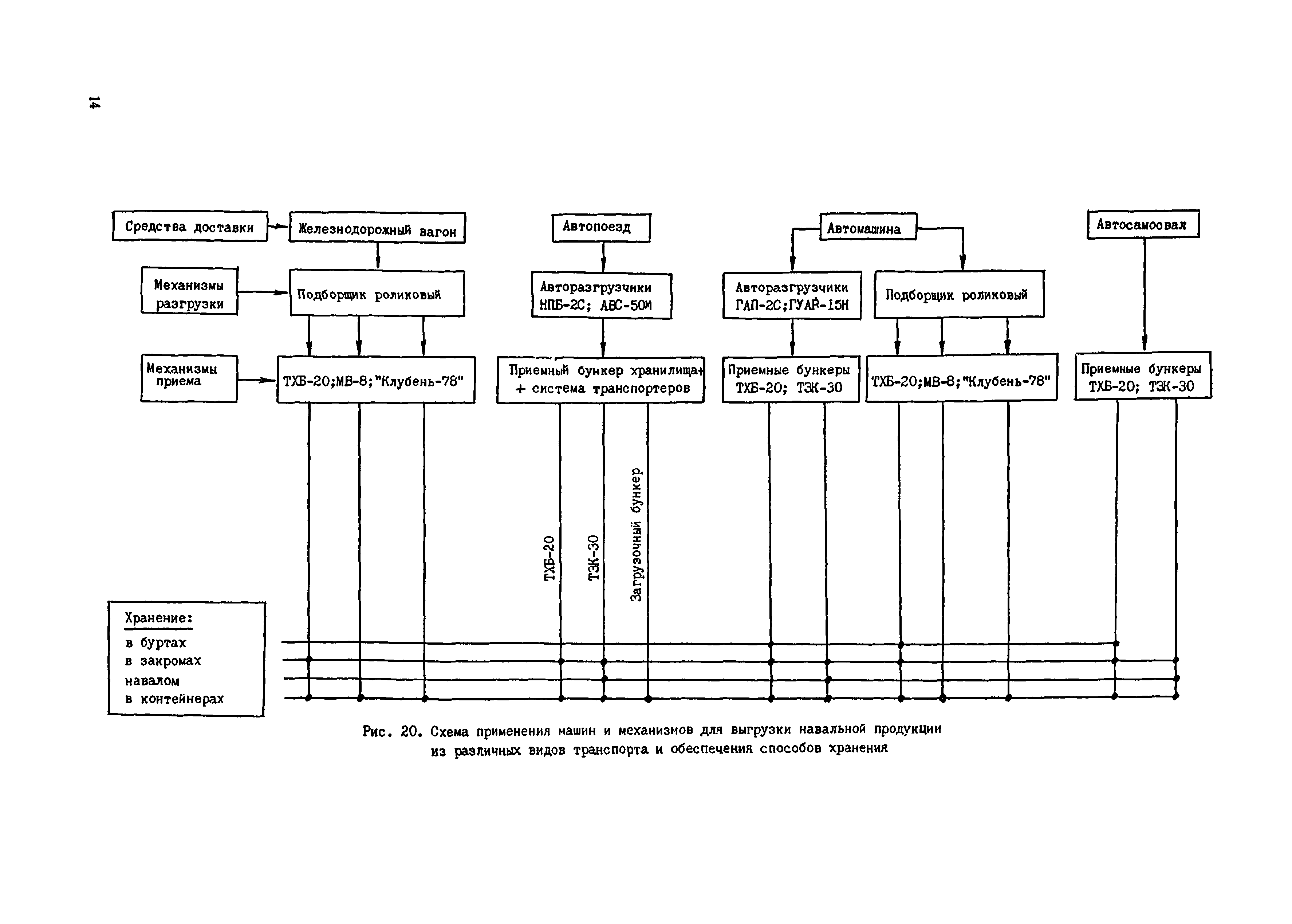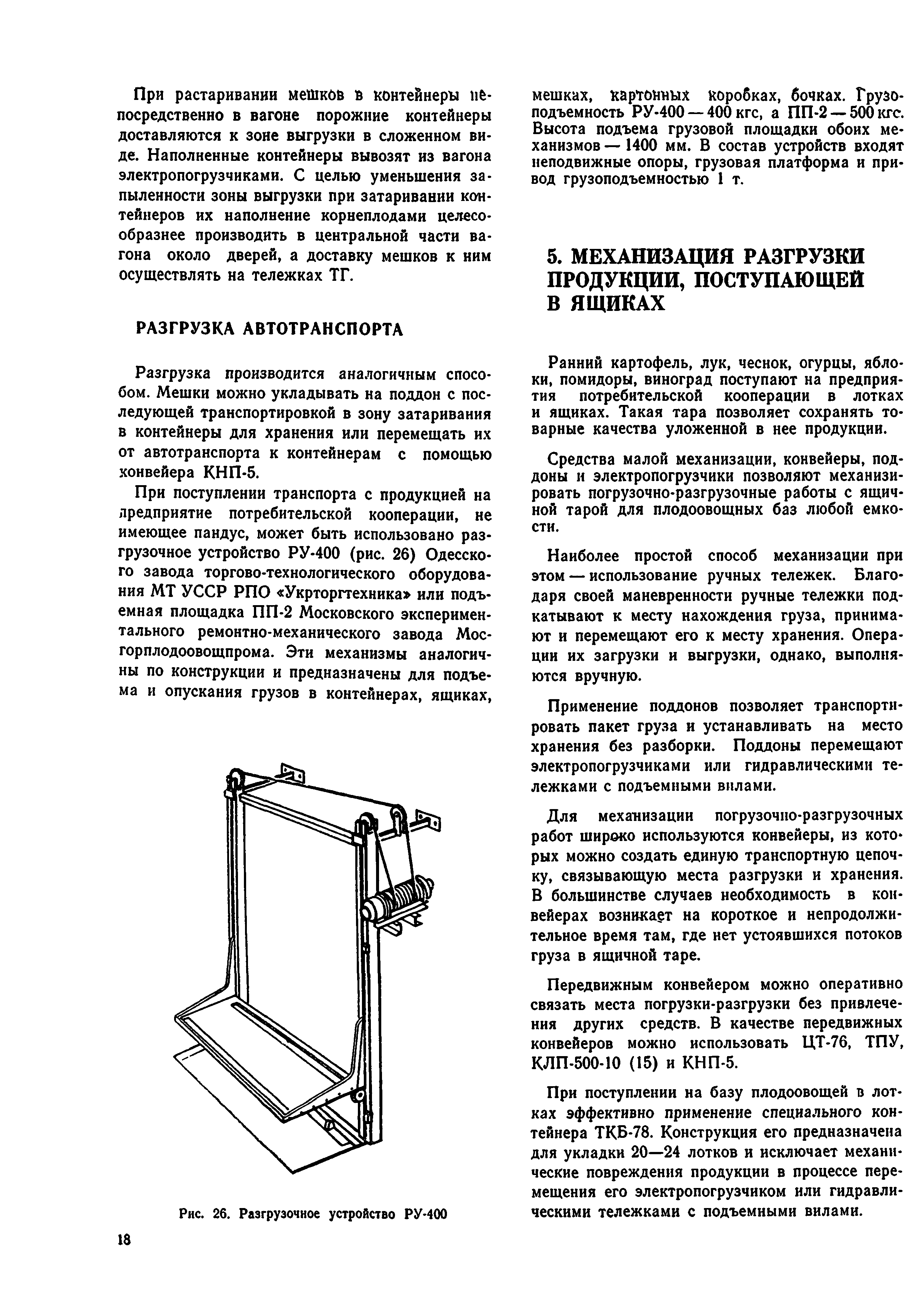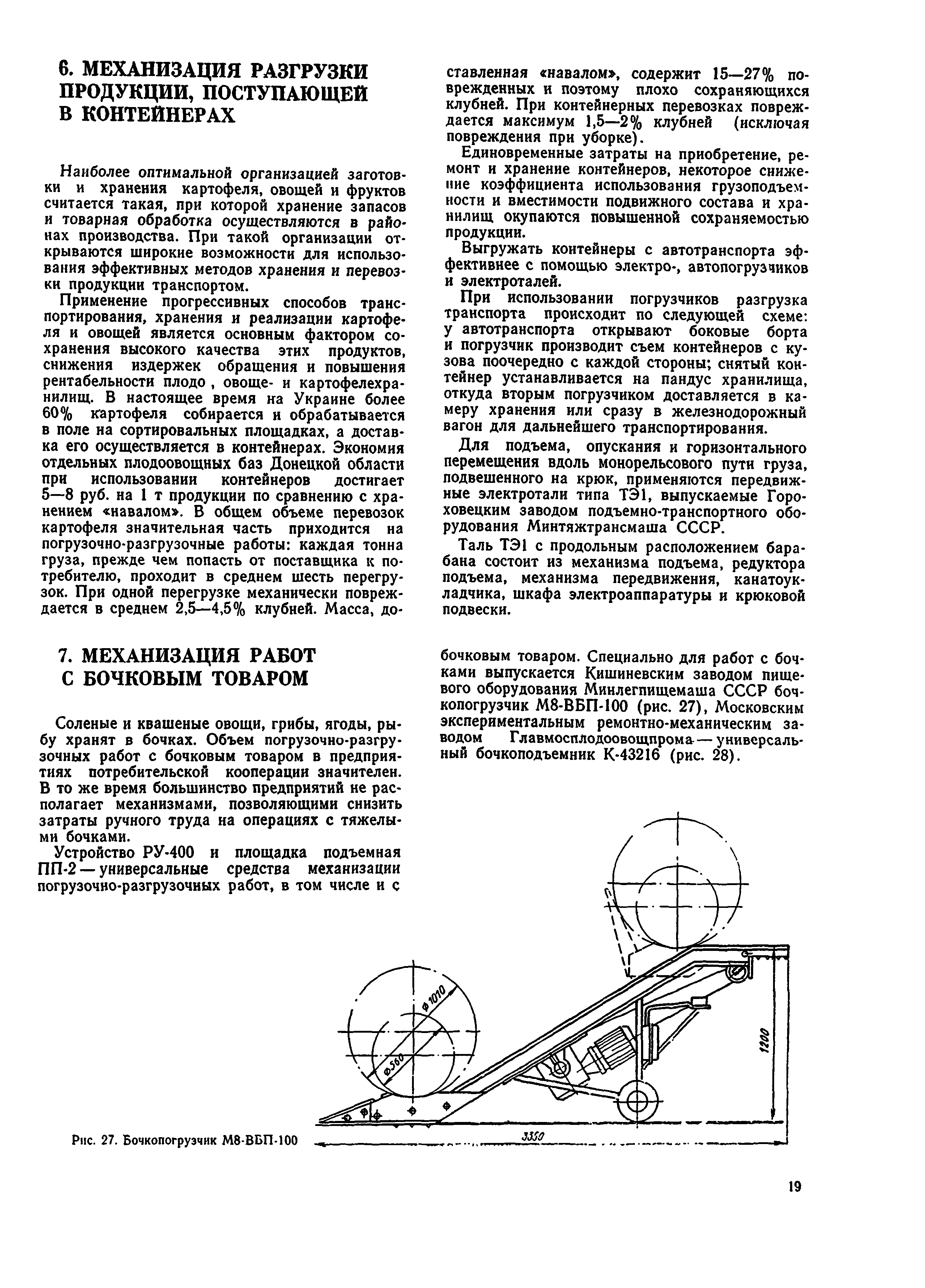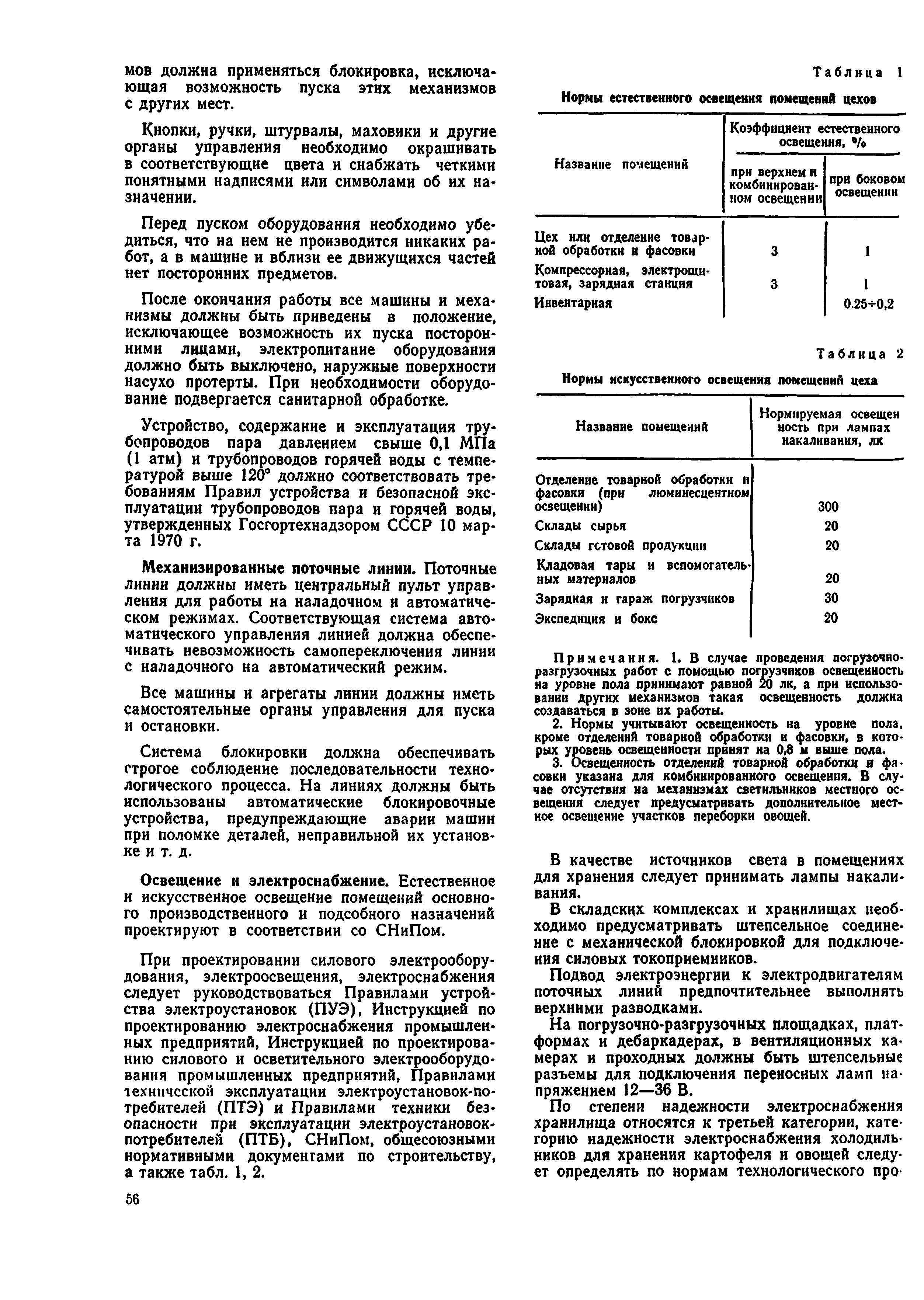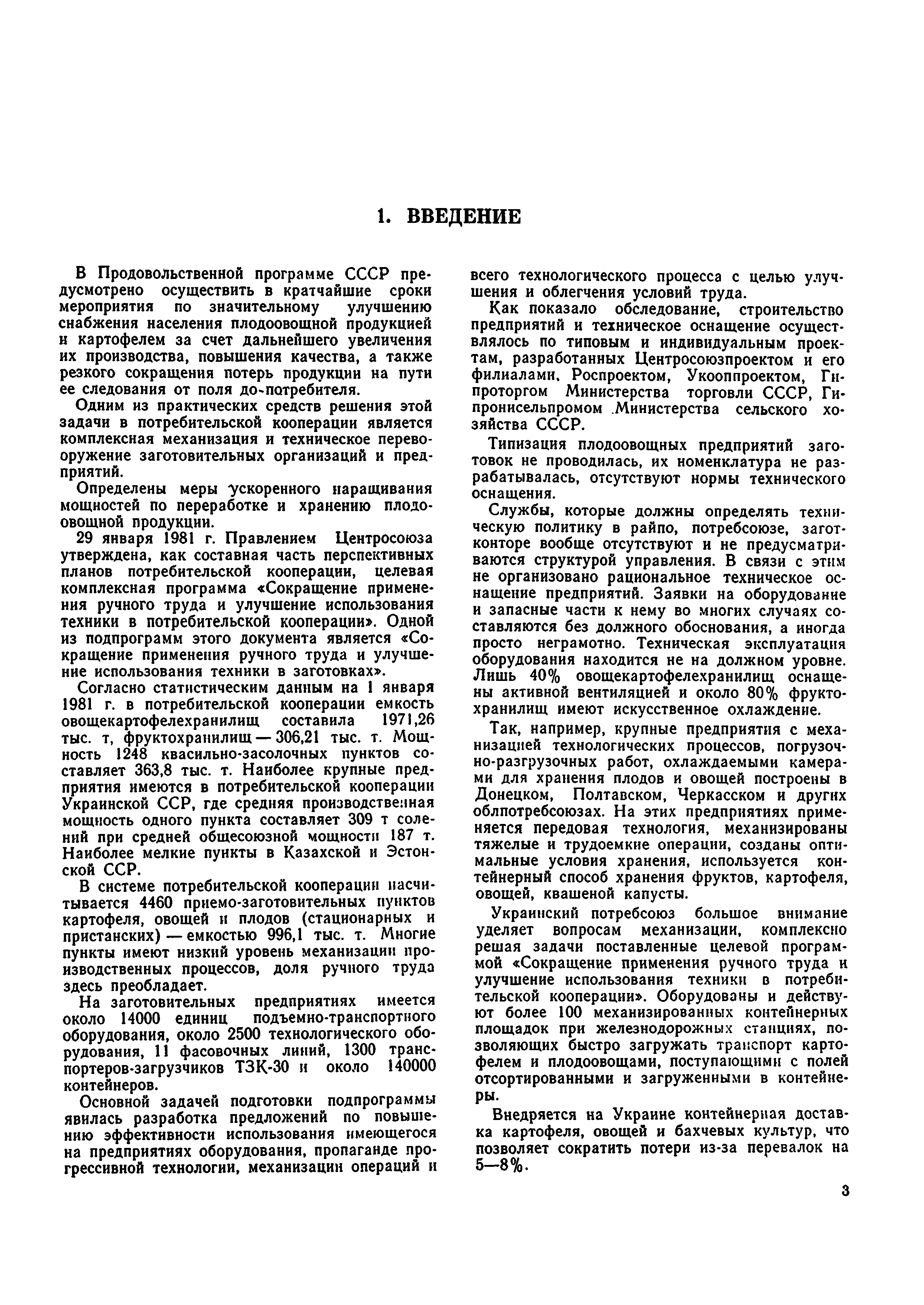 Методические рекомендации по повышению эффективности использования технологического, подъемно-транспортного и холодильного оборудования хранилищ картофеля, овощей и фруктов| Статус: | действует | | Название рус.: | Методические рекомендации по повышению эффективности использования технологического, подъемно-транспортного и холодильного оборудования хранилищ картофеля, овощей и фруктов | | Дата добавления в базу: | 01.09.2013 | | Дата актуализации: | 01.01.2021 | | Дата введения: | 03.02.1982 | | Оглавление: | 1. Введение 2. Способы хранения и основные типы хранилищ картофеля и овощей 3. Рациональные схемы механизации работ с продукцией, хранящейся "навалом" 4. Механизация разгрузки продукции, поступающей в мягкой таре 5. Механизация разгрузки продукции, поступающей в ящиках 6. Механизация разгрузки продукции, поступающей в контейнерах 7. Механизация работы с бочковым товаром 8. Типы контейнеров для хранения плодоовощной продукции 9. Электропогрузчики 10. Средства малой механизации транспортных работ 11. Товарная обработка плодоовощной продукции 12. Тара-оборудование 13. Организация перемещения затаренной продукции в экспедицию и загрузка транспорта 14. Организация эксплуатации оборудования 15. Охрана труда и техника безопасности | | Утверждён: | 03.02.1982 Центросоюз (Tsentrosoyuz 2, п.2)